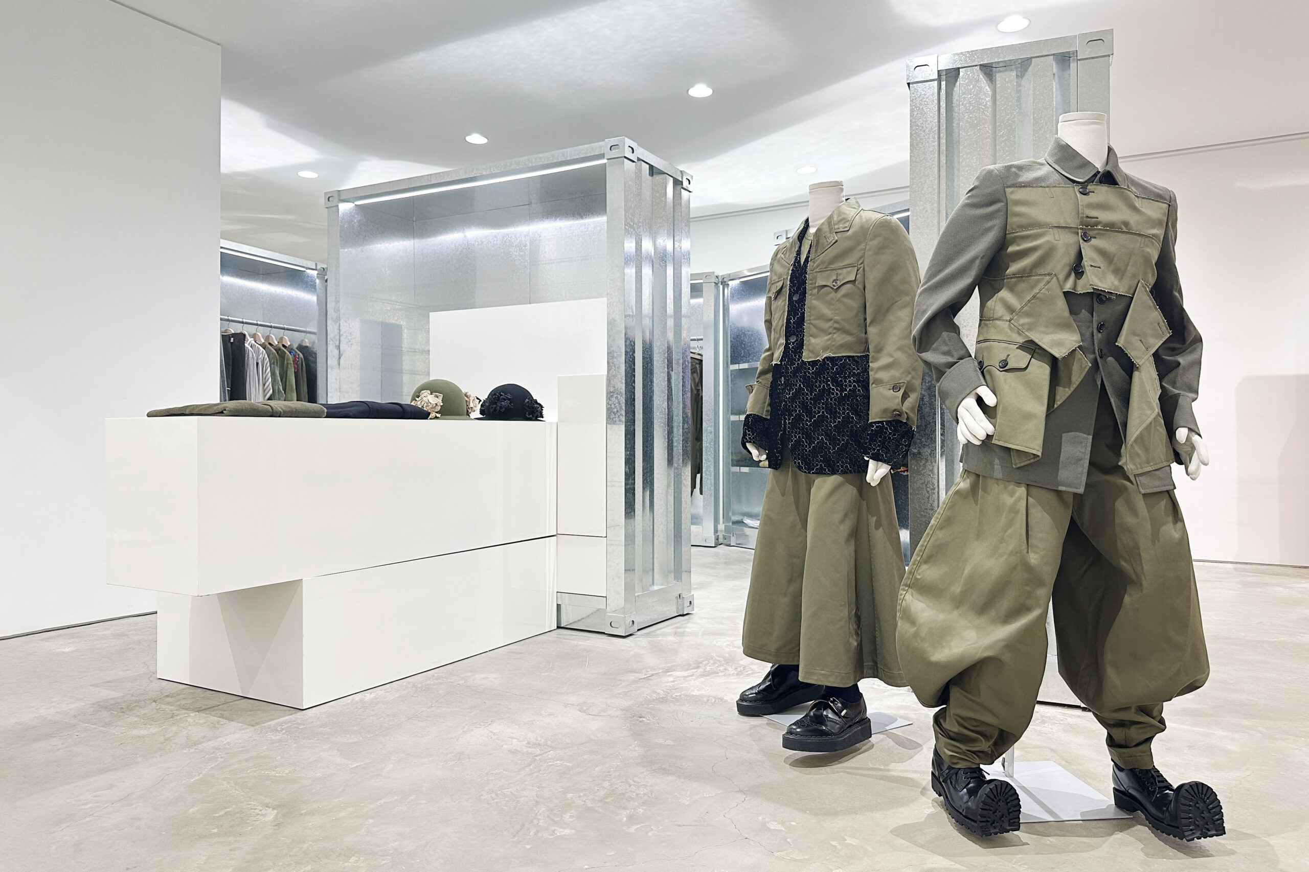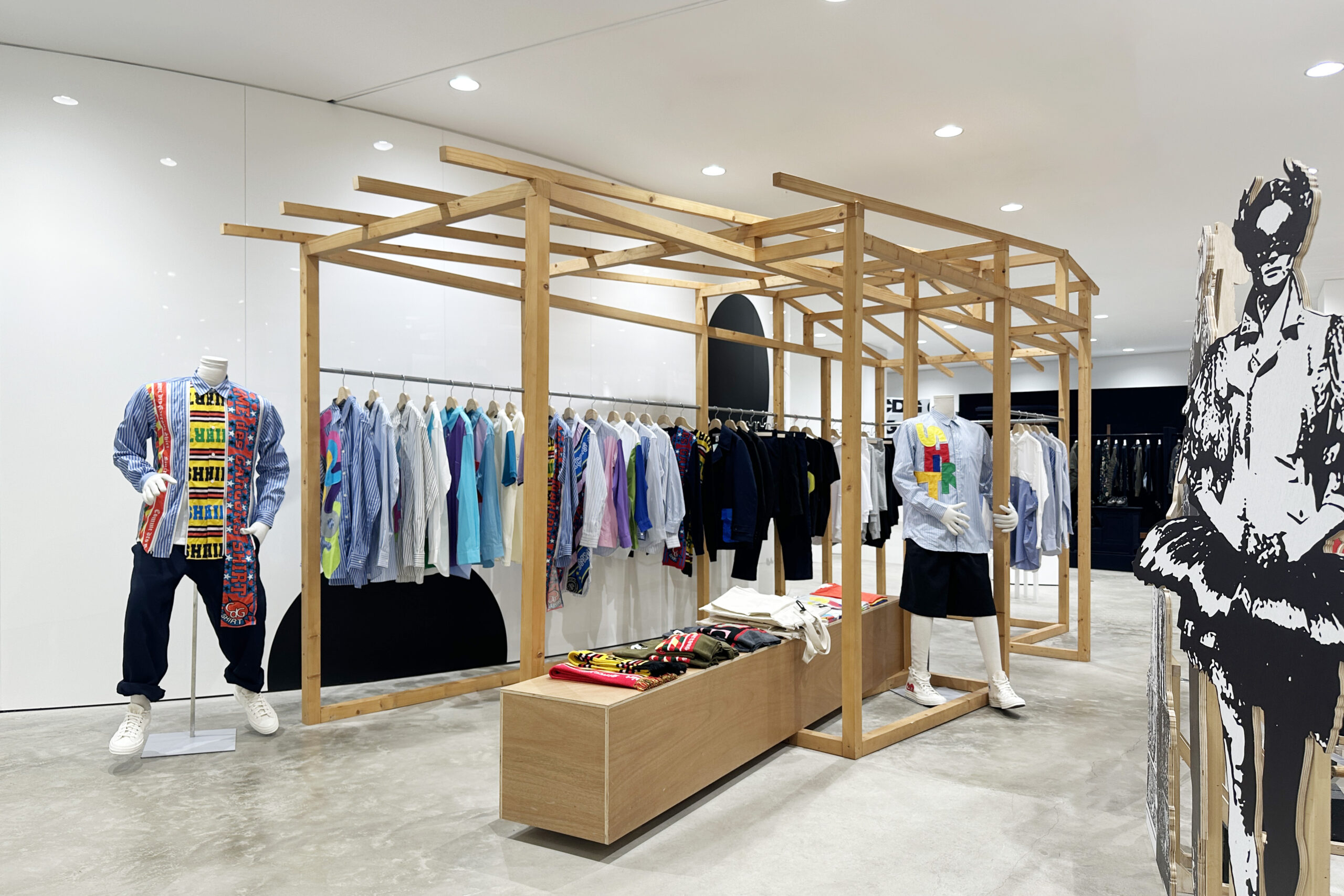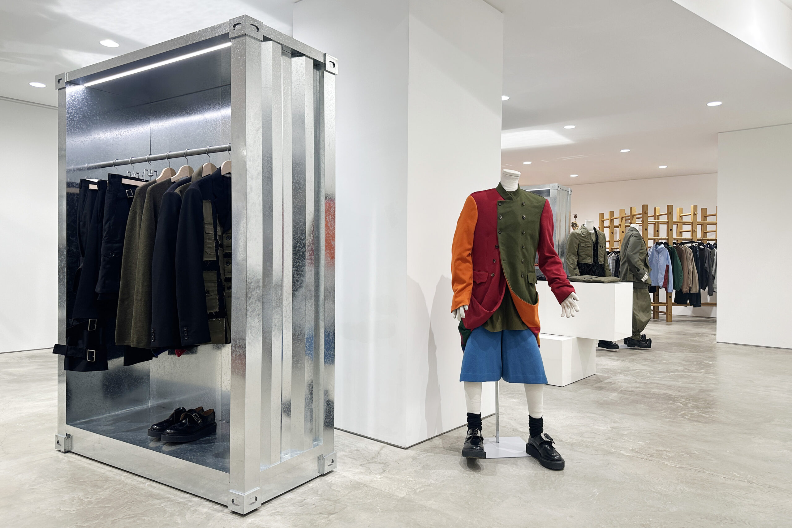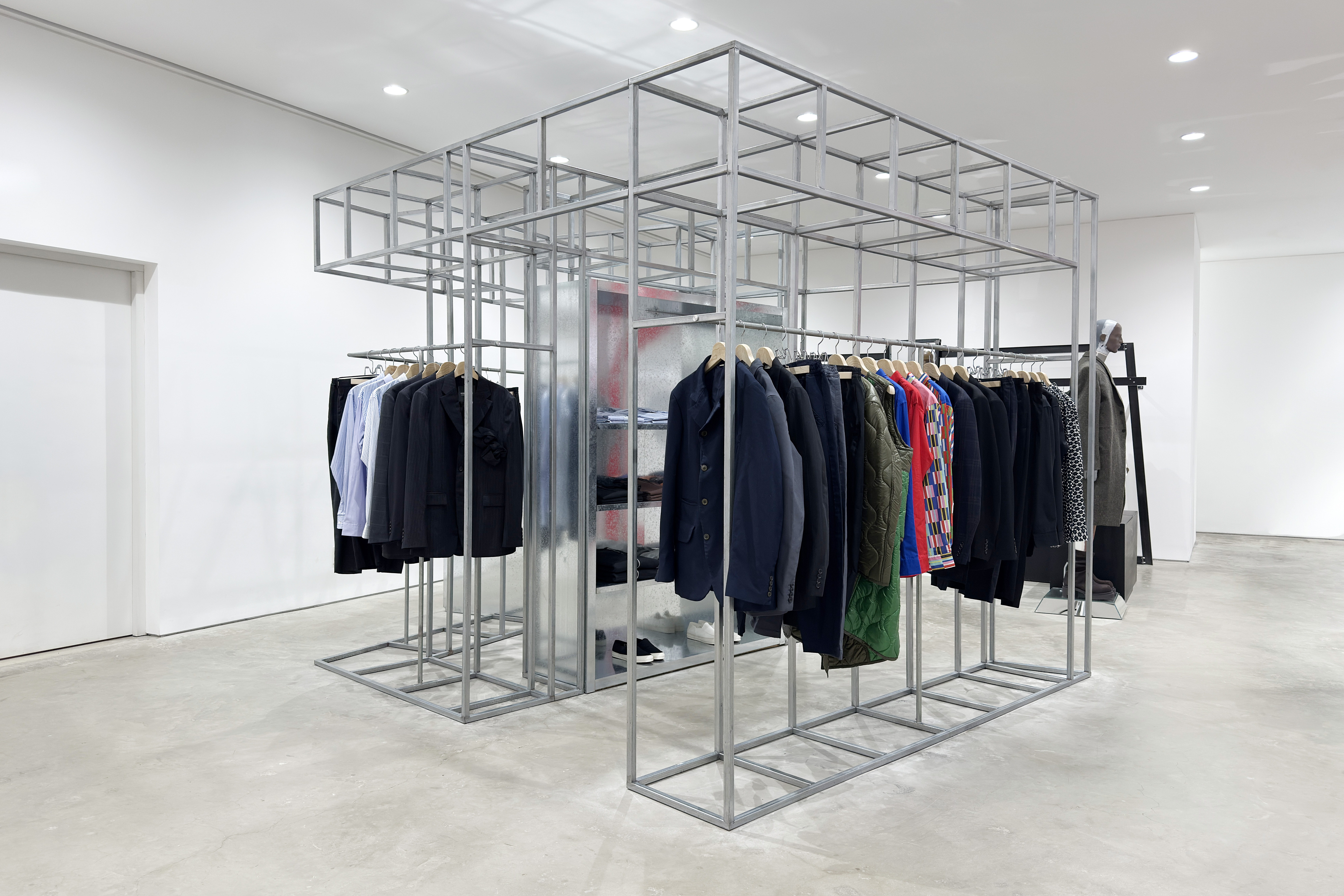 二层 Jan Jan Van Essche 区域迎来曾在安特卫普 Momu Museum「KHAYAL」展览中亮相的特别人台——由艺术家 Rune Tuerlinckx 以回收木椅、铲柄与钢杆手工打造。人台以动态姿态悬停,仿佛衣物仍在行走,为观者留下无尽想象,亦将 Jan Jan Van Essche 的原始手稿化为可触现实。