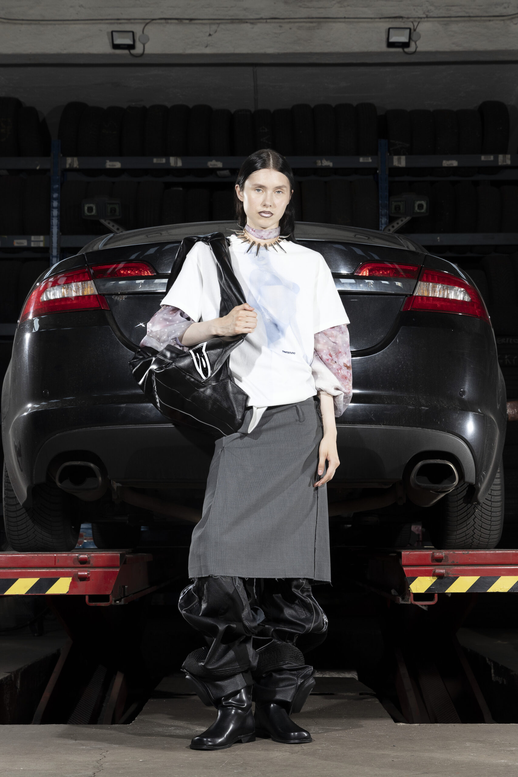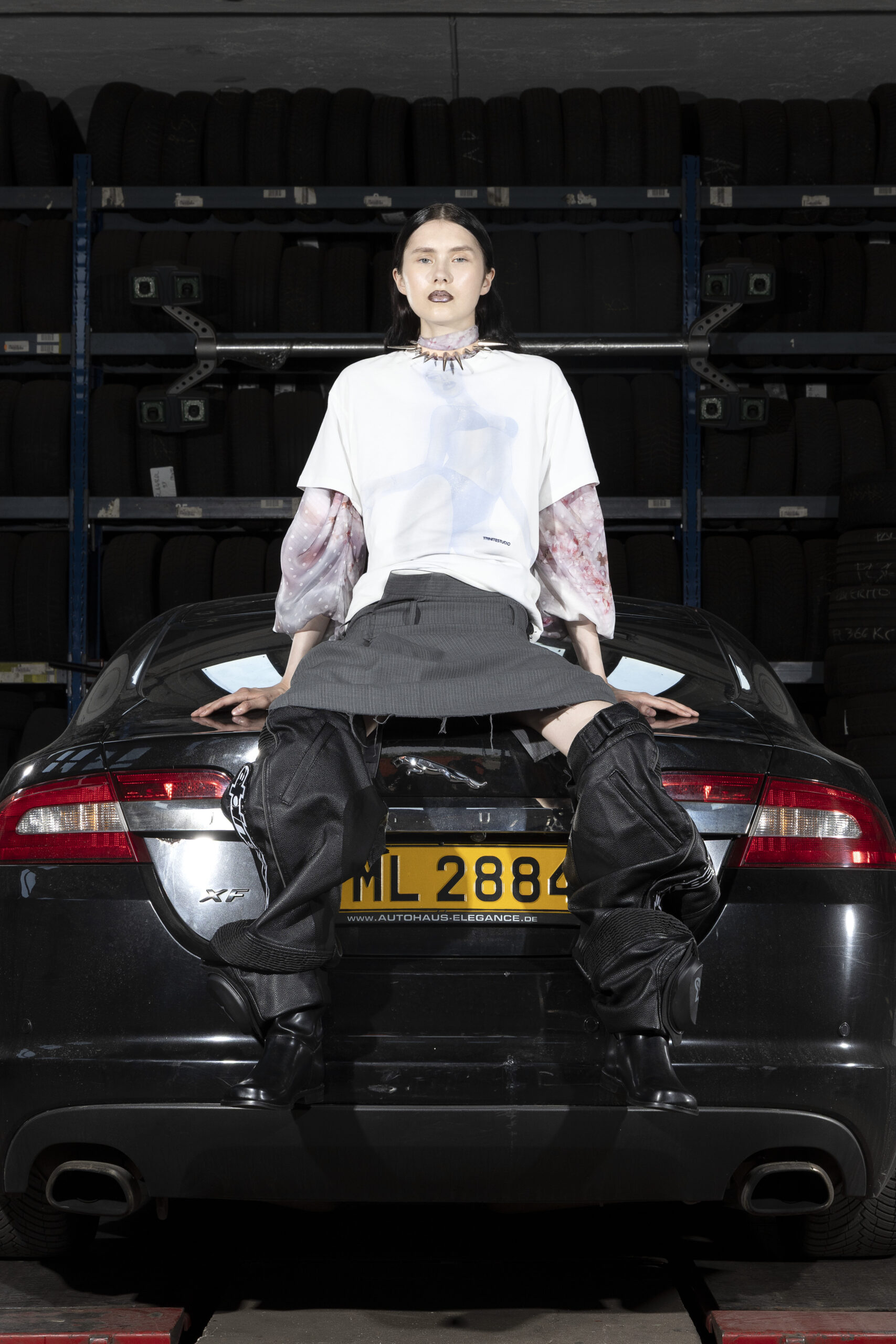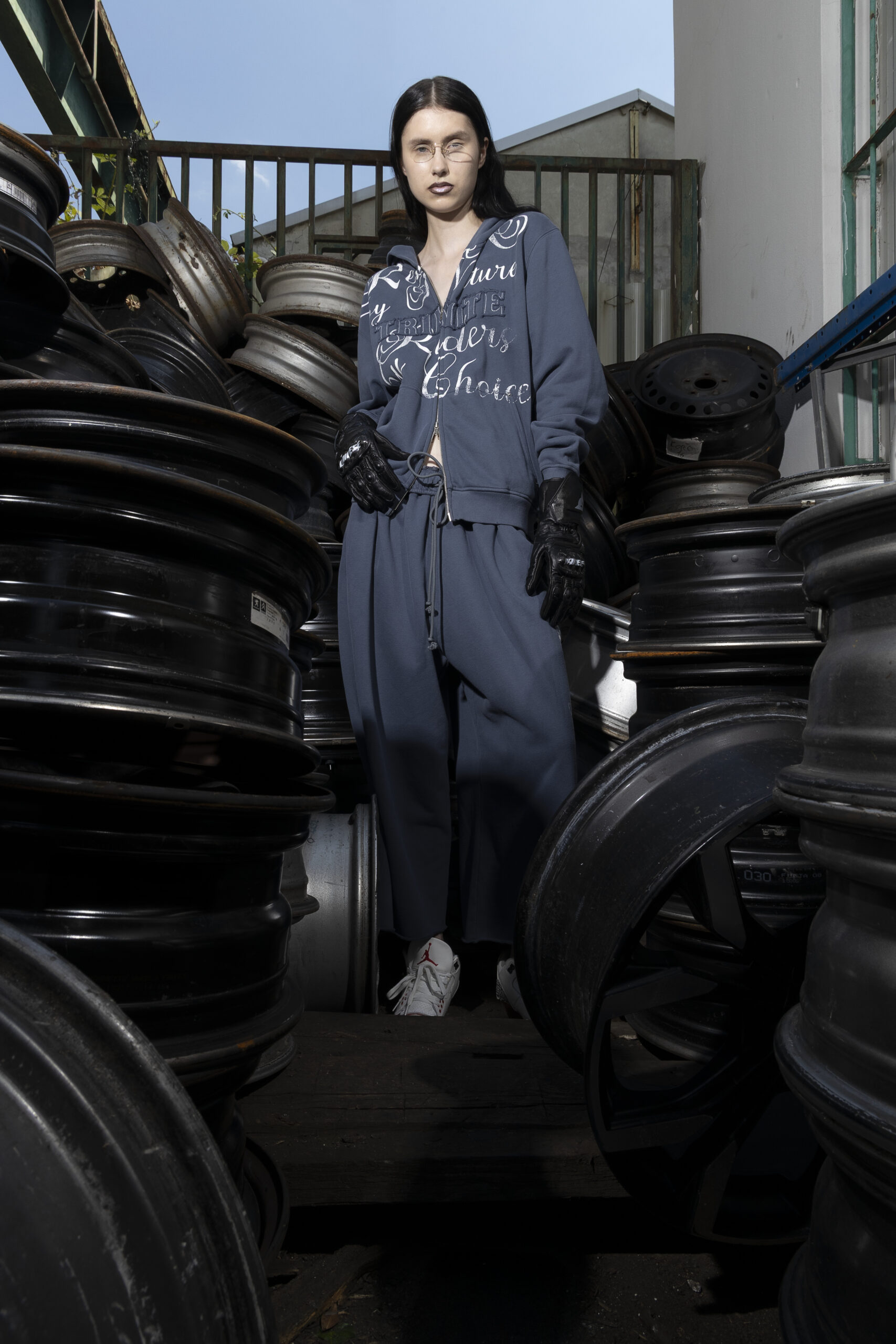 TRINITESTUDIO 2025 早秋系列以维多利亚的繁复与机车文化的桀骜碰撞,缎带与牛仔、蕾丝与护具交叠,浪漫在速度中被撕裂并重组。旧织物与机车印象被裁片吸收,塑造危险感的甜美与不对称的力量,构筑反叛与优雅并存的女性形象。