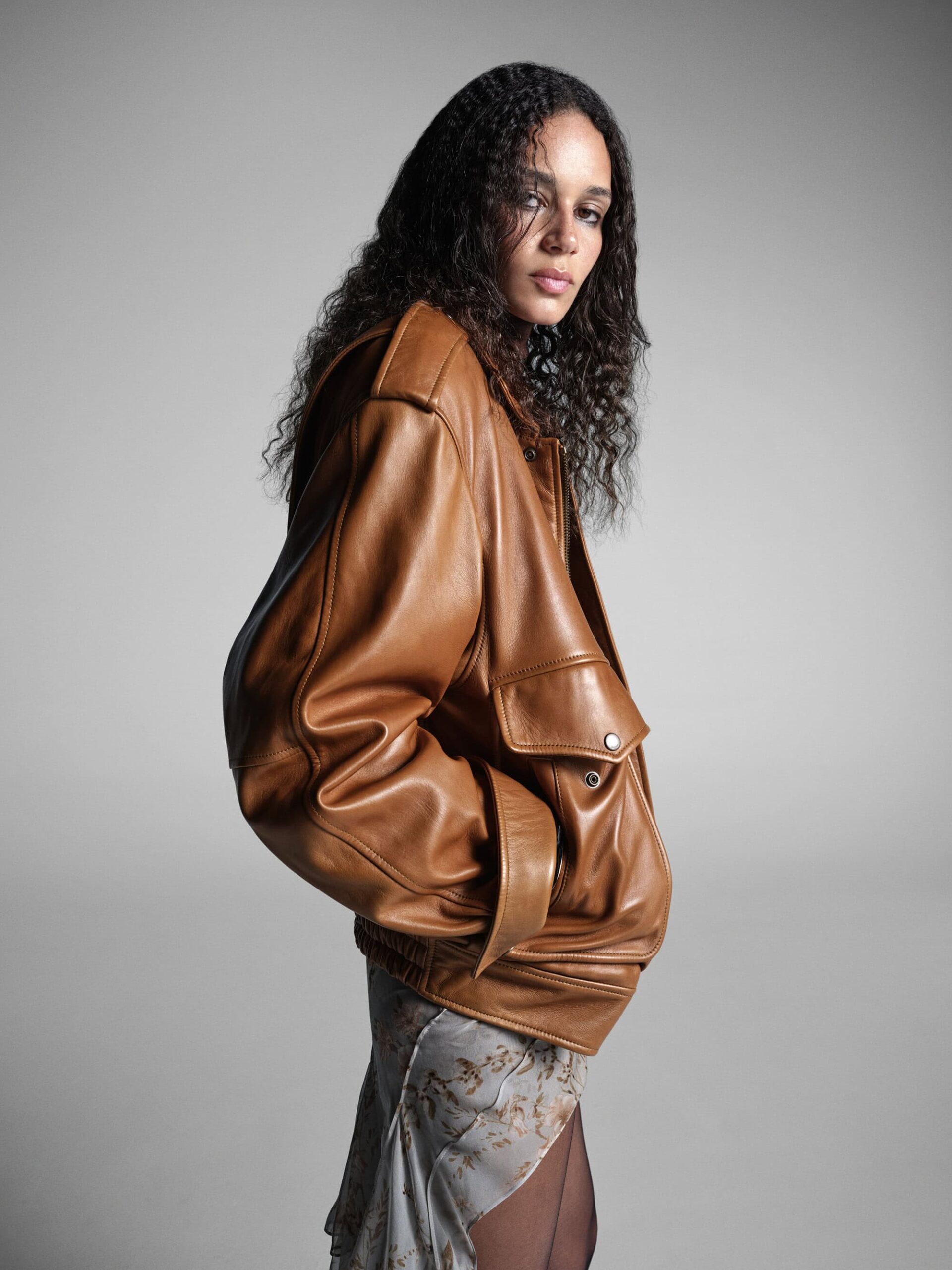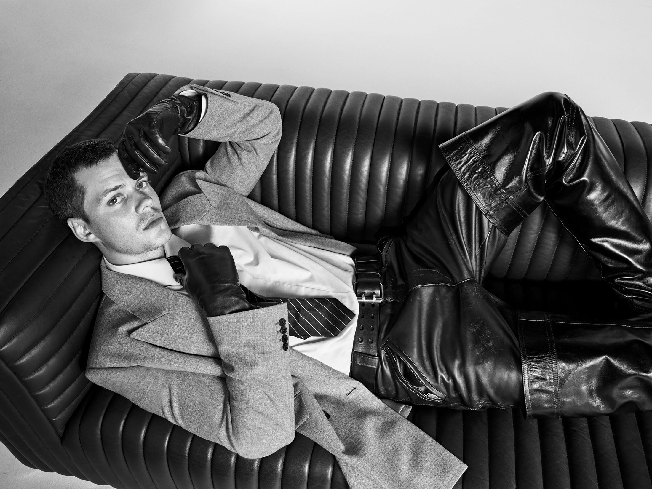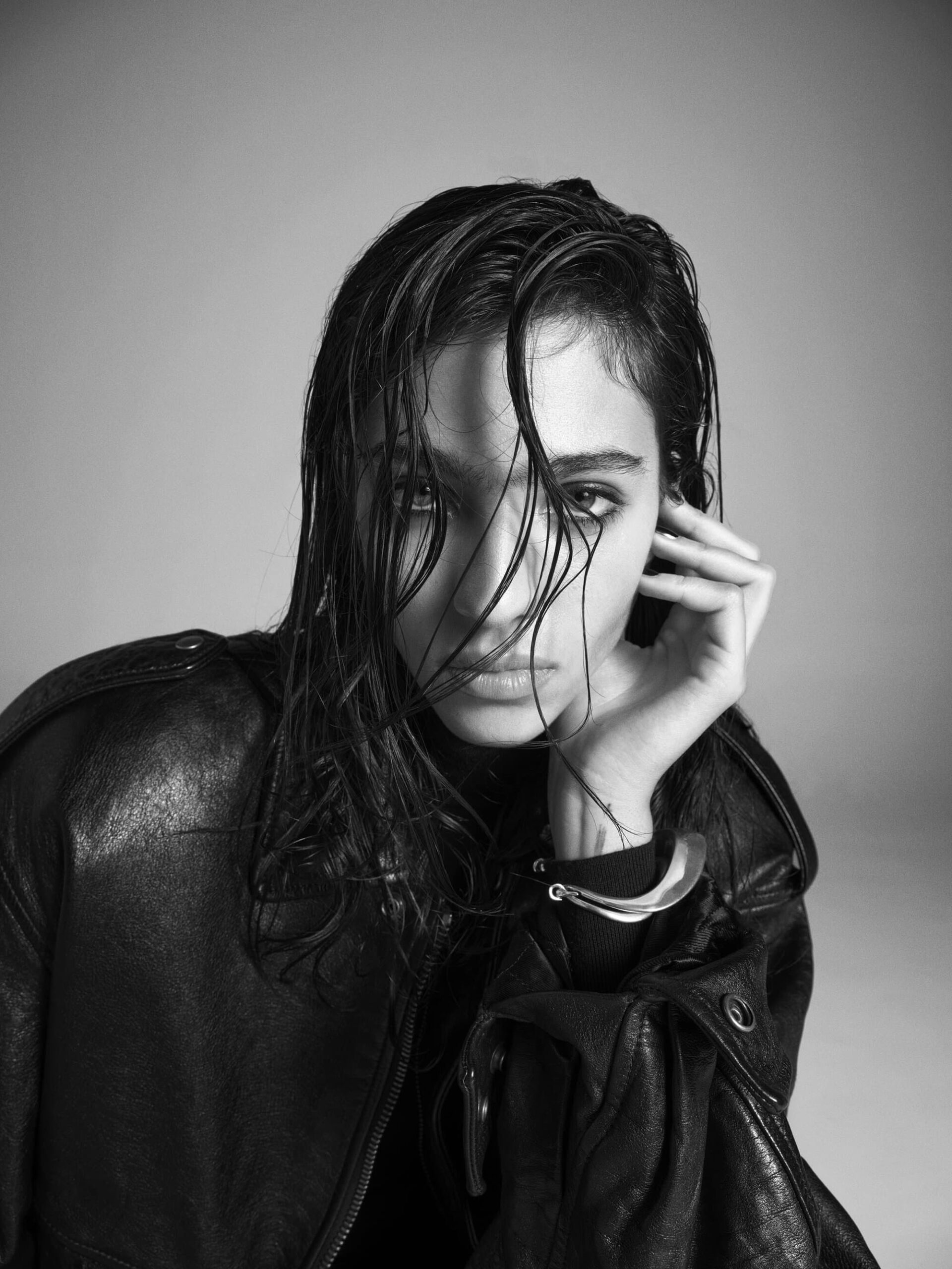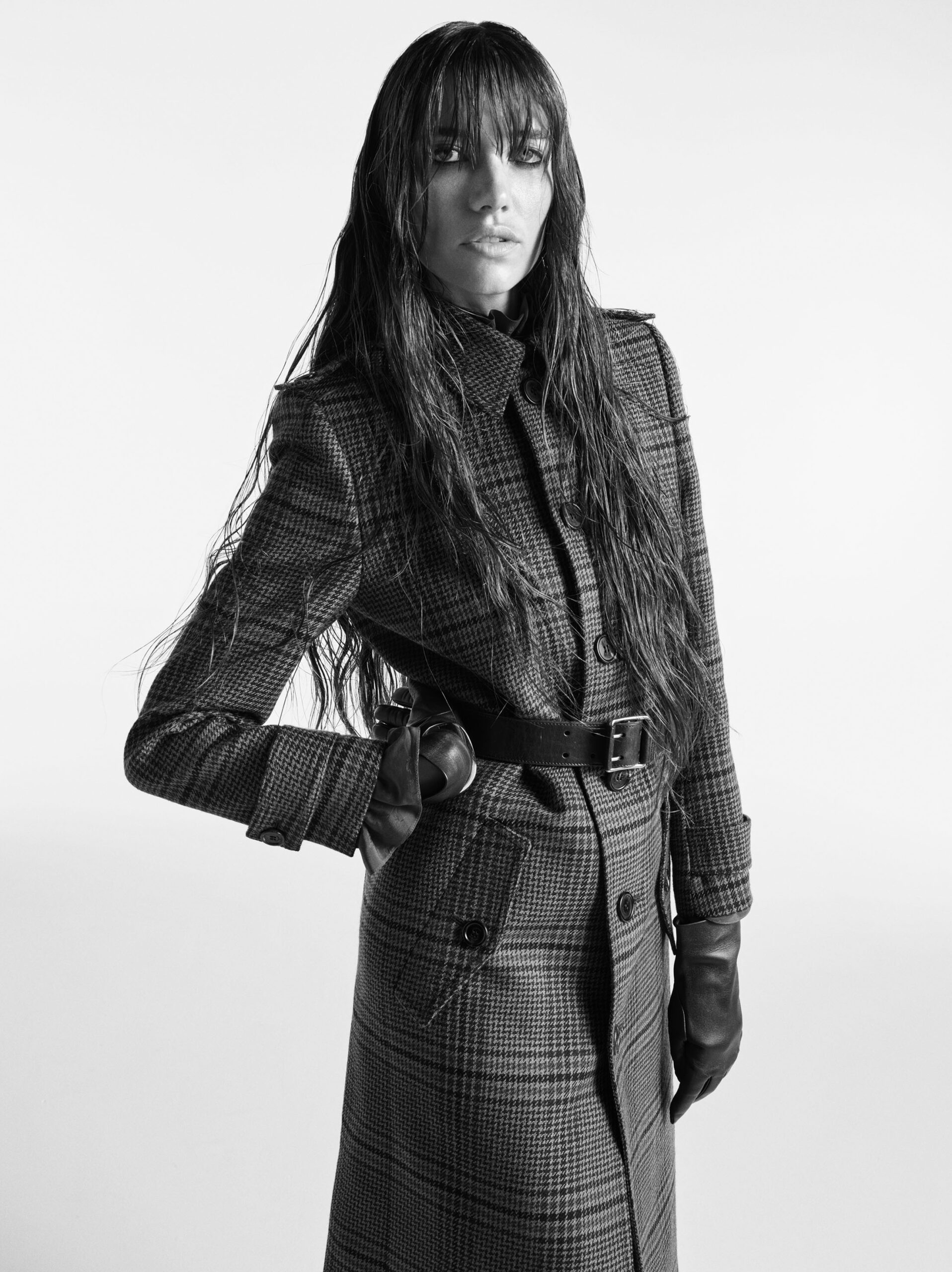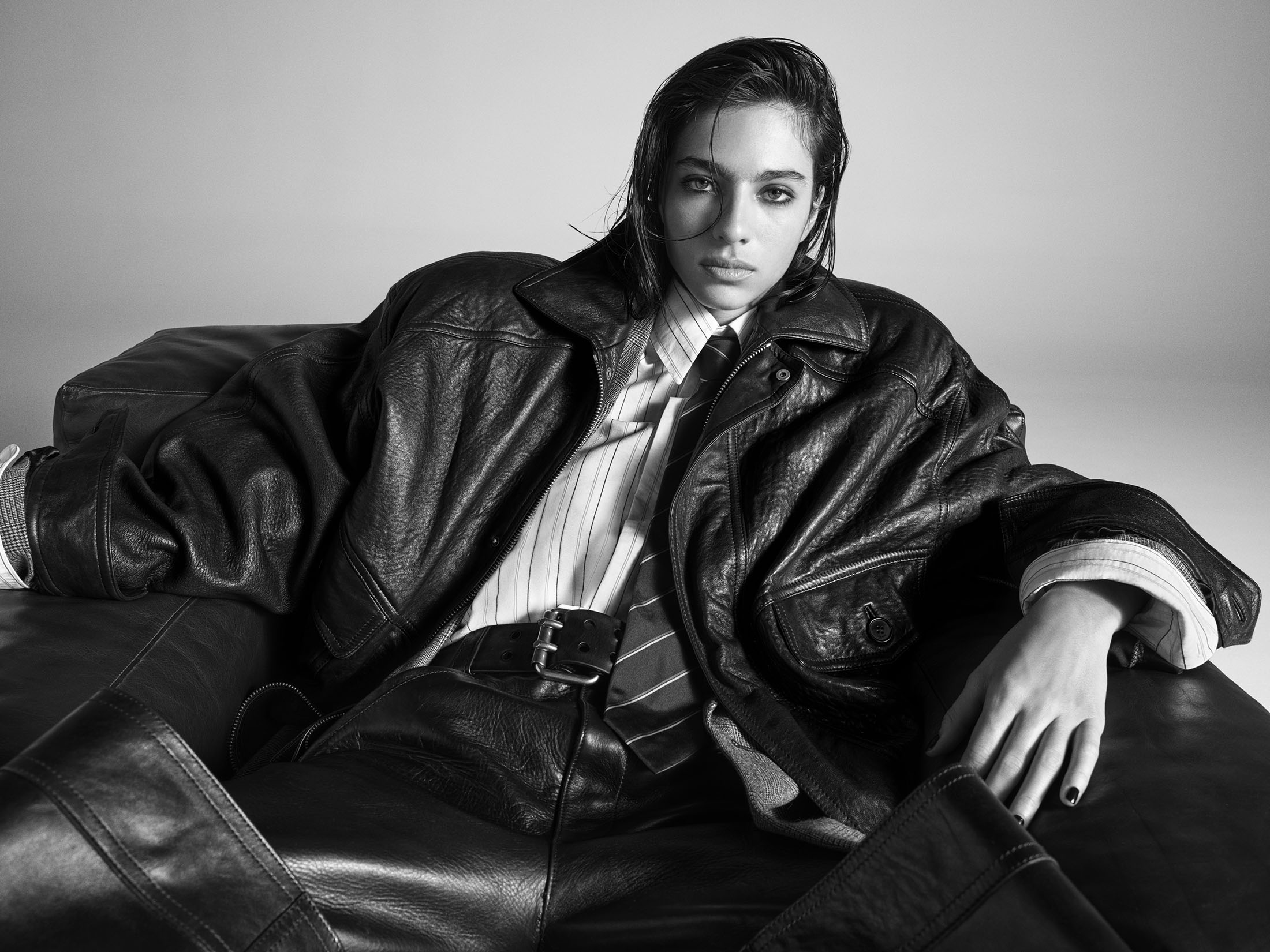此次广告延续了品牌一贯的精致风格——黑色皮革、宽大外套以及充满戏剧性的姿态,让模特们仿佛与时尚空间融为一体,充满张力与氛围感。Sorrenti 的镜头捕捉到了极具原始质感的瞬间,黑白肖像中的情感表达尤其深刻,而红色花卉与绿色软装则为这一冷峻画面增添了画意般的色彩冲击。