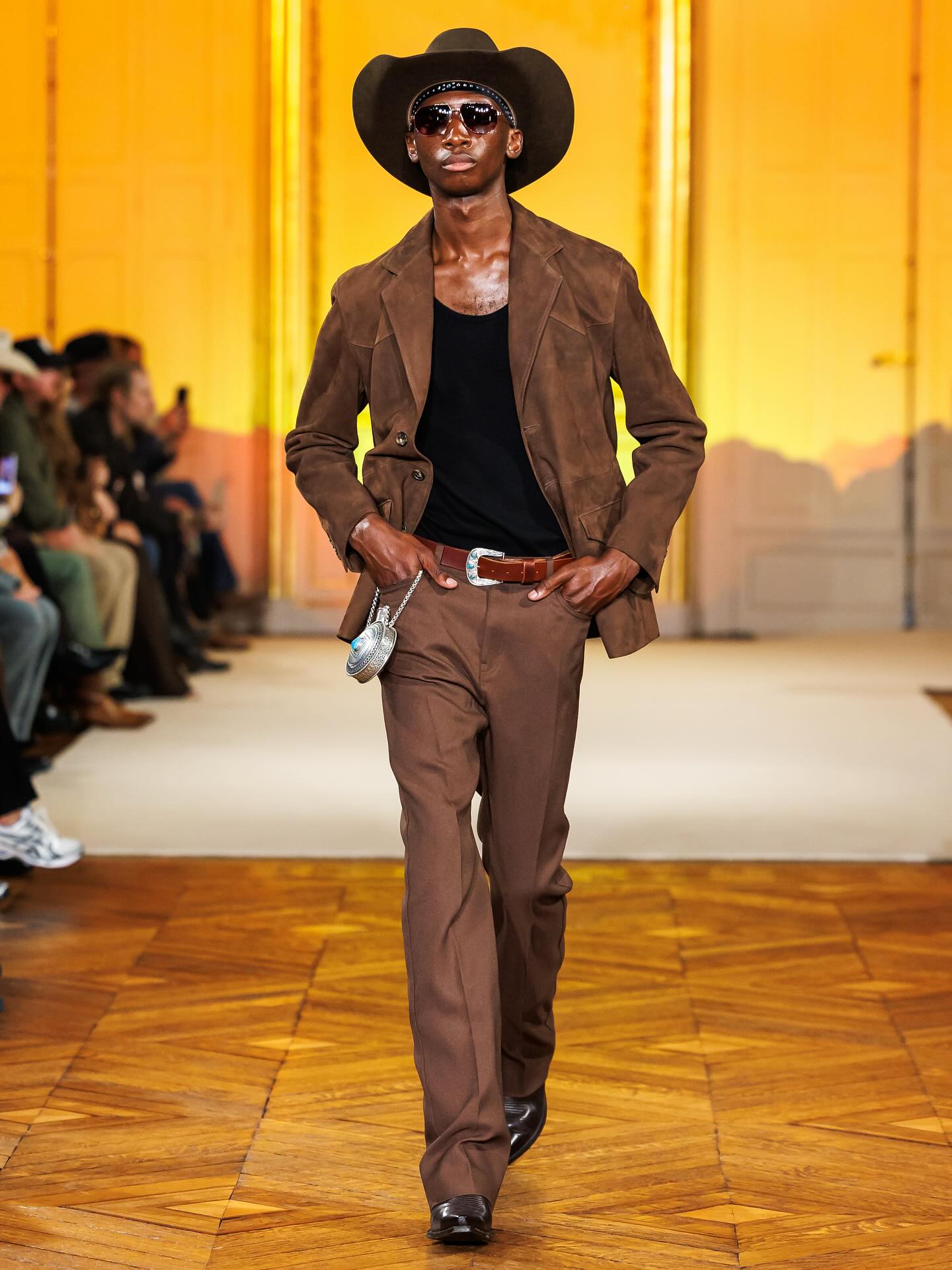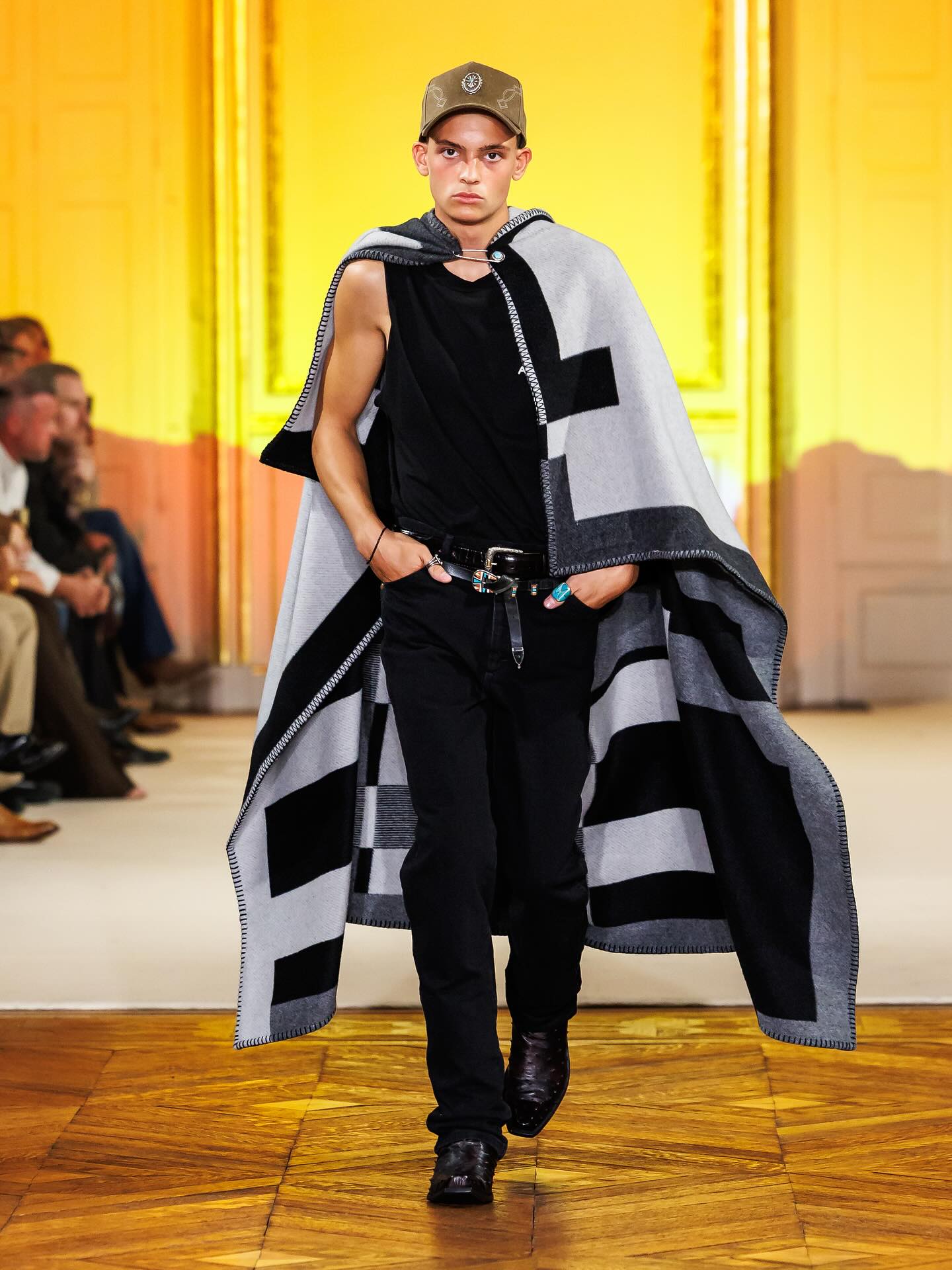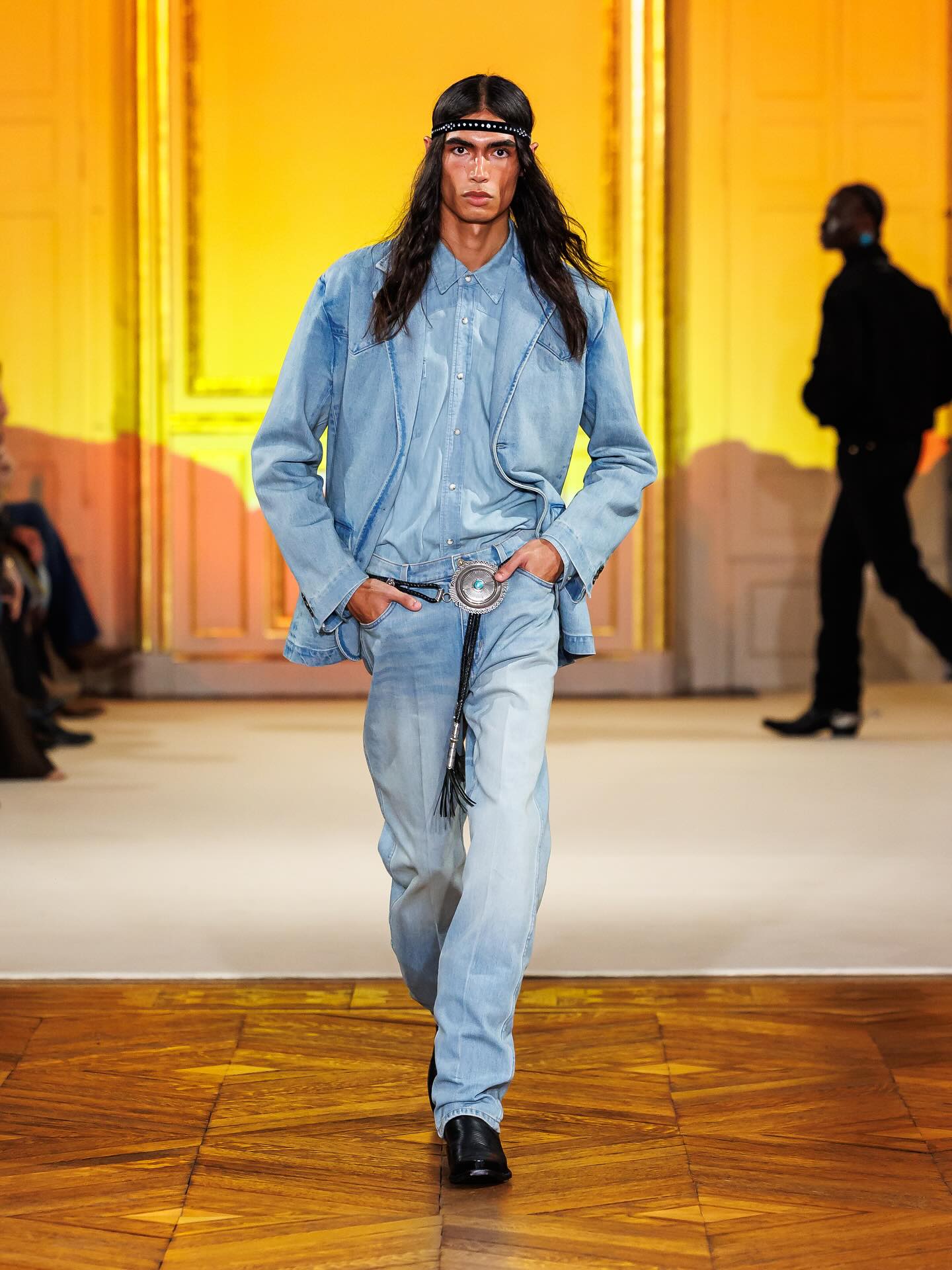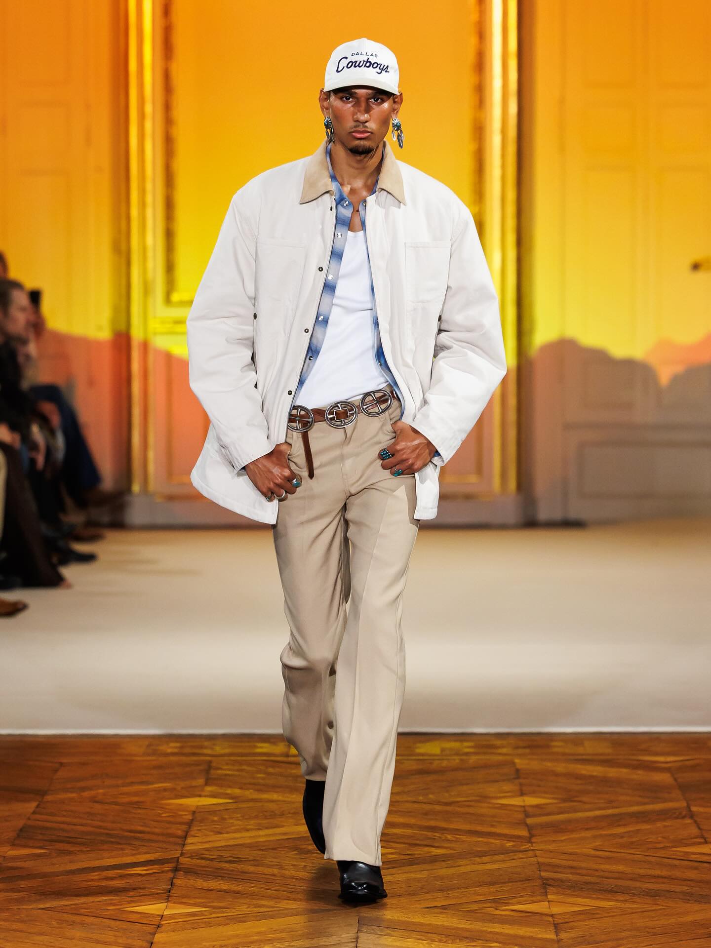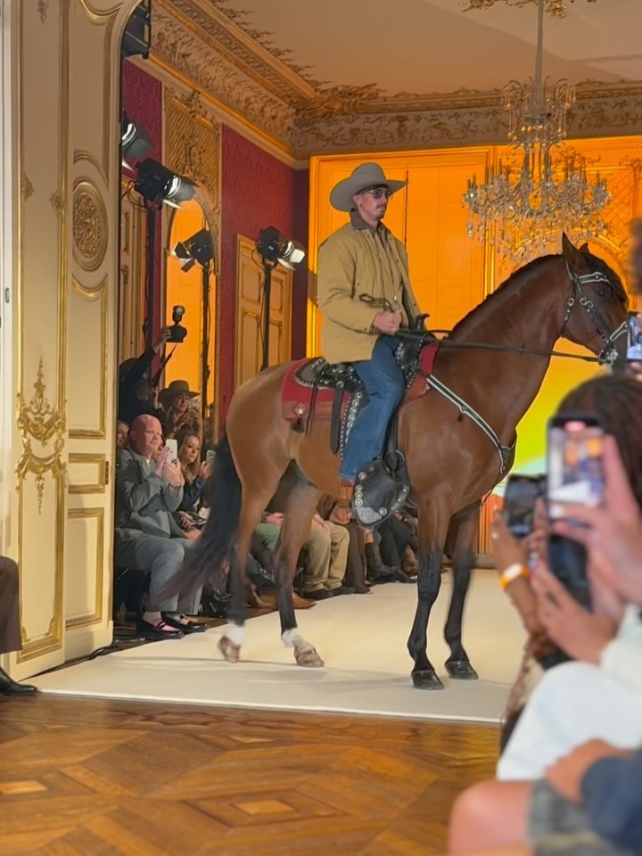 在今年的 4 月 6 日,Post Malone(本名 Austin Post) 被拍摄到在巴黎出现,着手于同名新品牌 Austin Post 的工作,并确认会在巴黎举办秀场。如今,品牌的首个系列「At First Light」正式发布。该系列灵感来自 Post Malone 在德克萨斯州长大的回忆,受到了牧场文化、绿松石、靴子、牛仔布的启发,诠释着达拉斯西部传统与西南地区的牛仔精神。现场还出现了一位模特直接骑着马登场,成为了本次秀场的高潮瞬间。