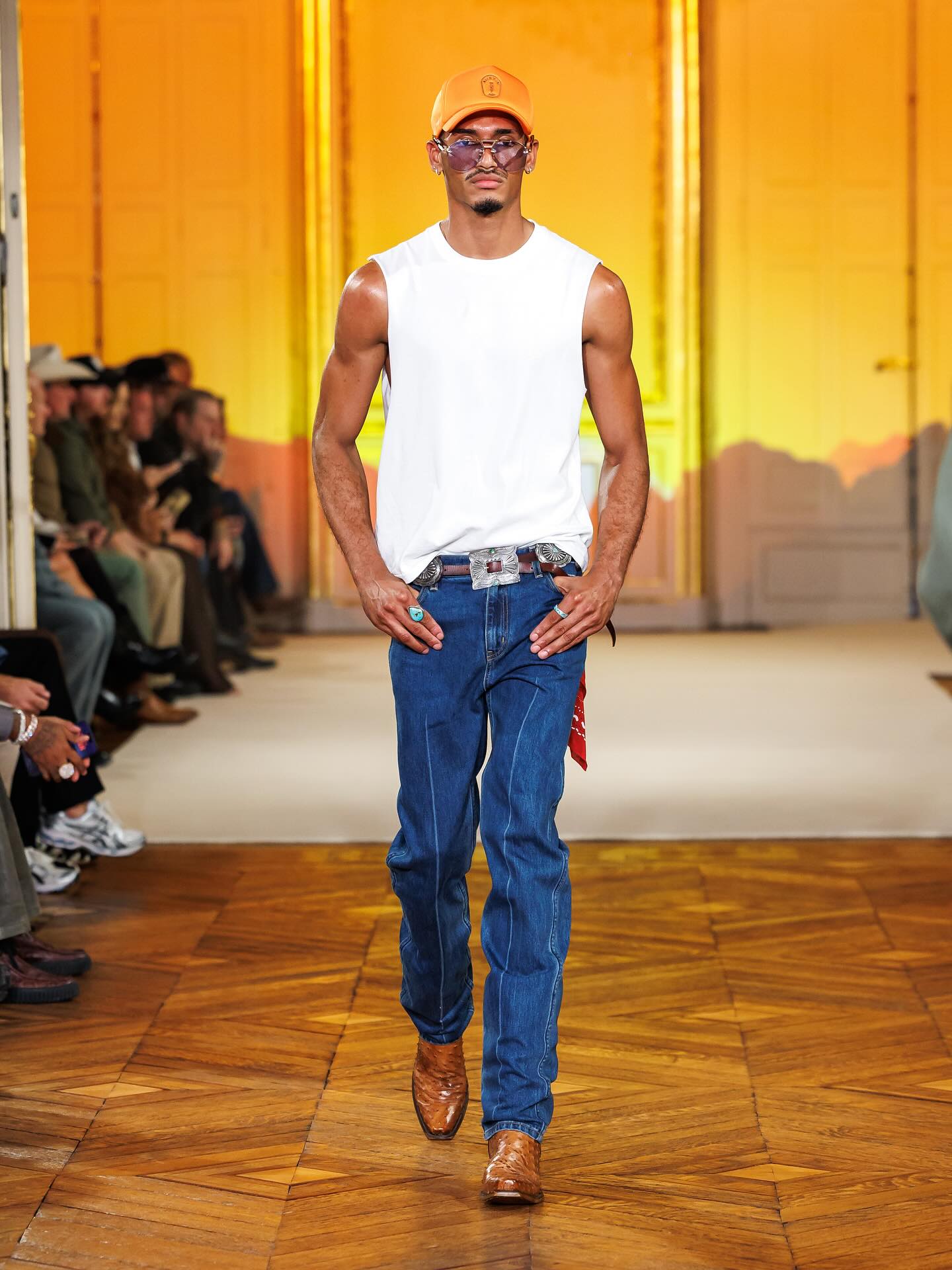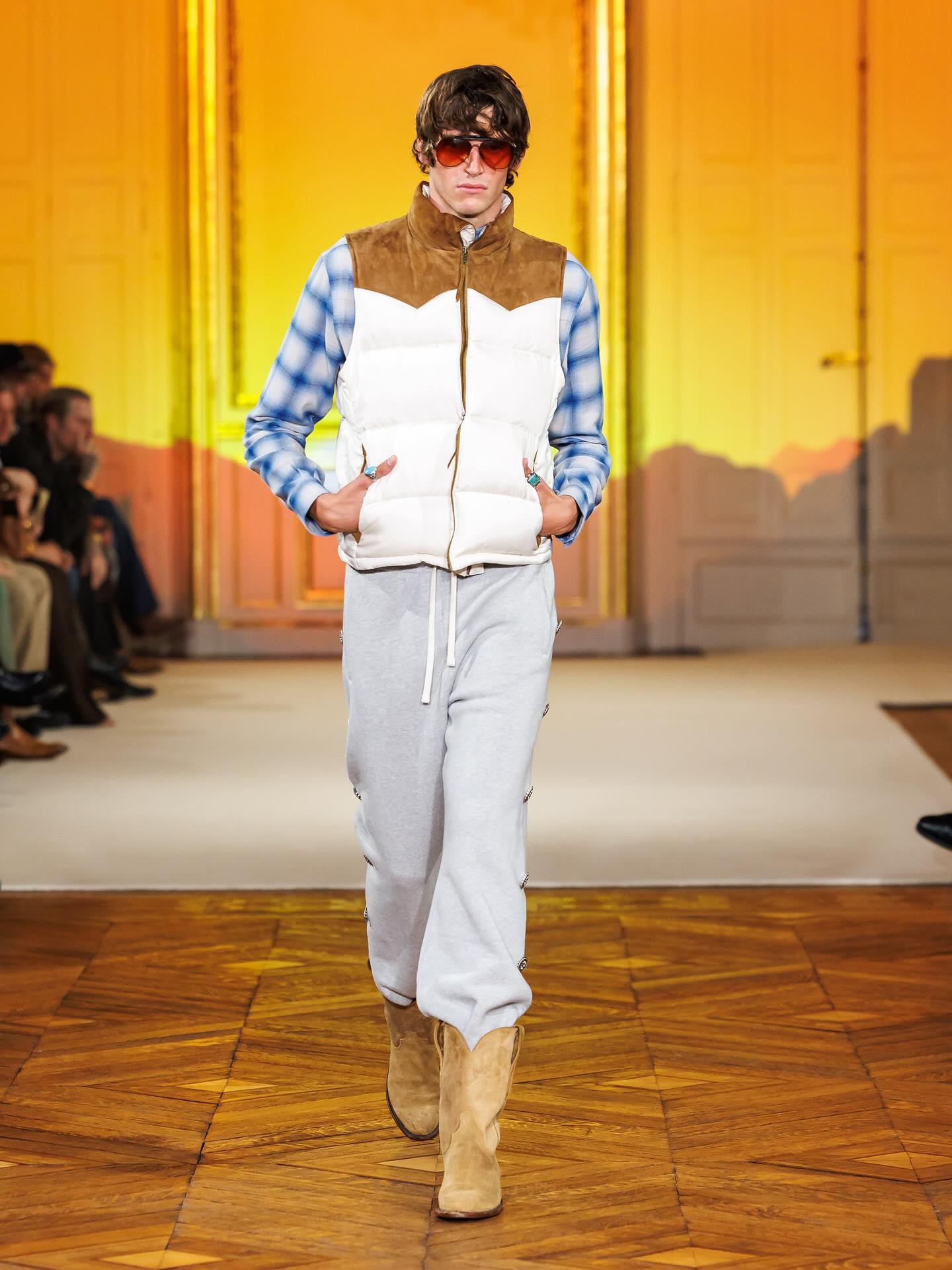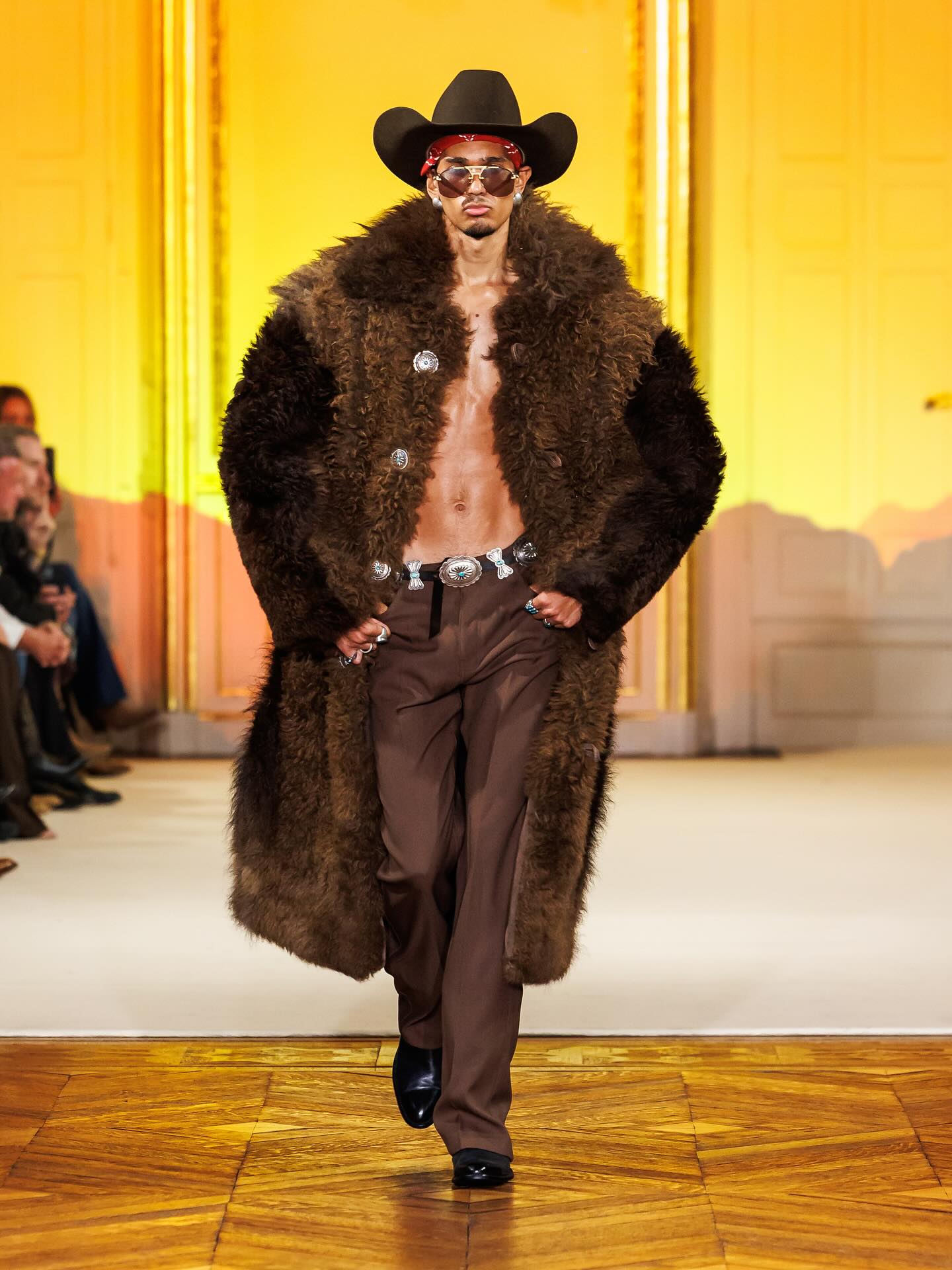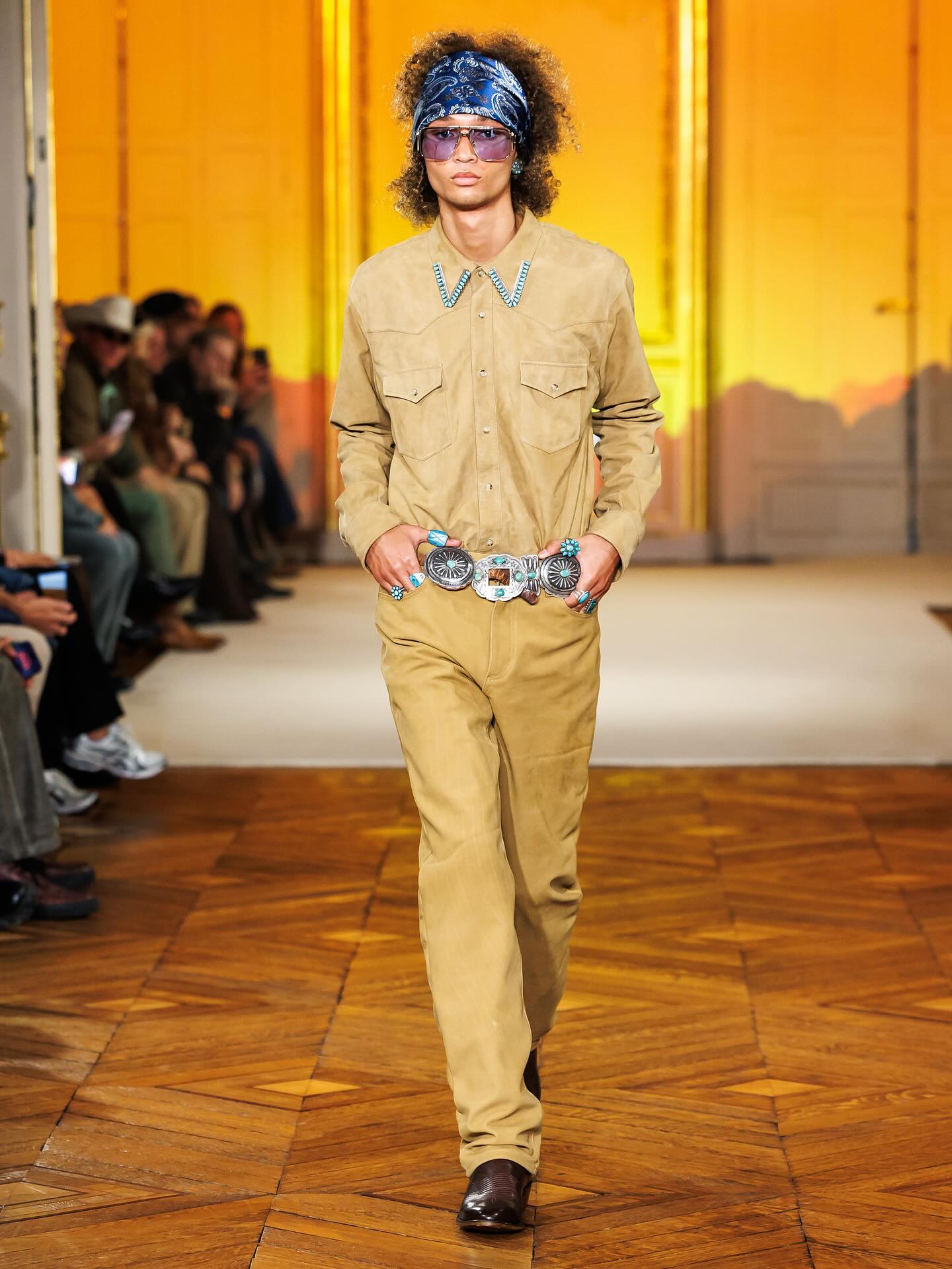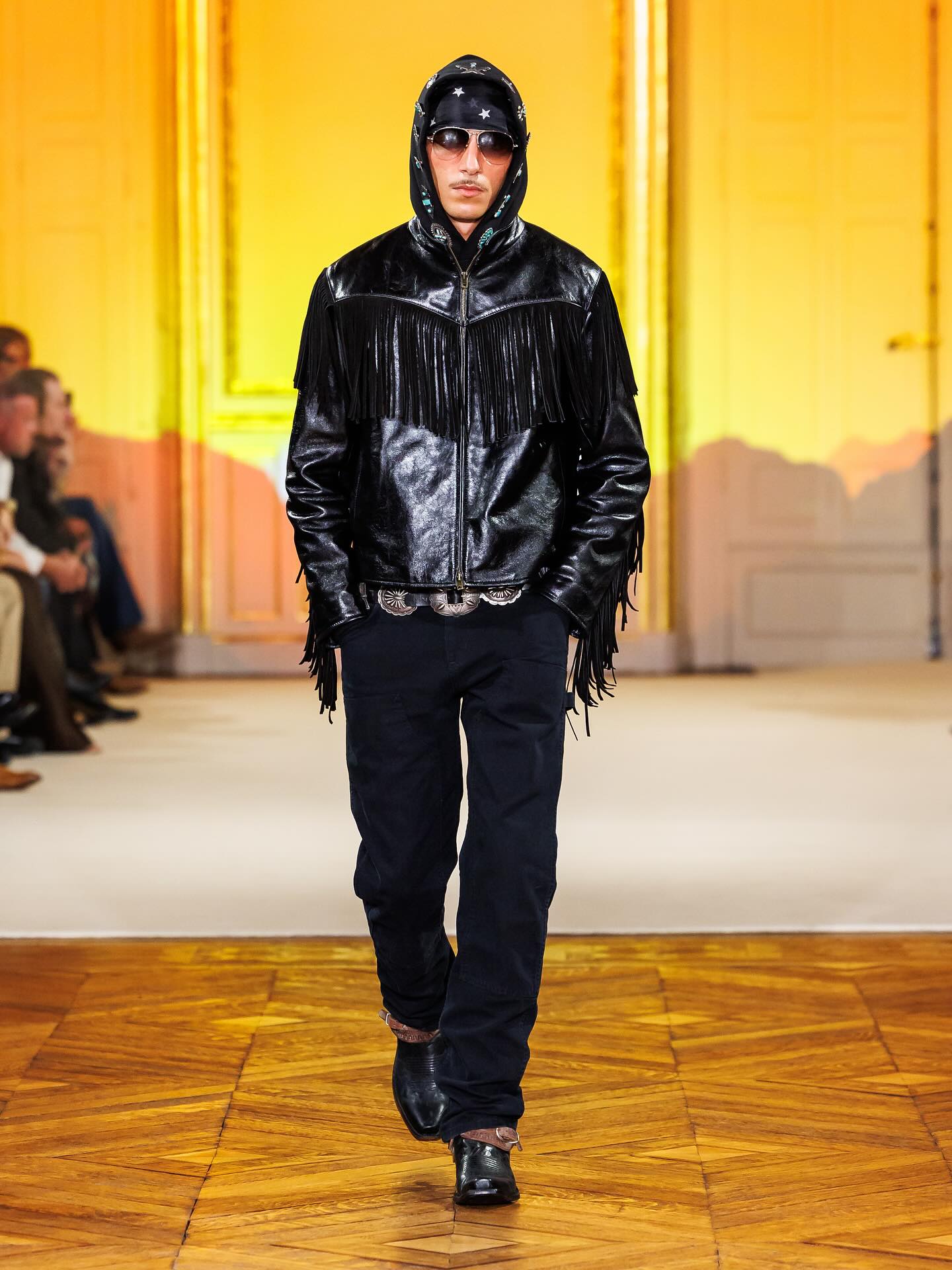在今年的 4 月 6 日,Post Malone(本名 Austin Post) 被拍摄到在巴黎出现,着手于同名新品牌 Austin Post 的工作,并确认会在巴黎举办秀场。如今,品牌的首个系列「At First Light」正式发布。该系列灵感来自 Post Malone 在德克萨斯州长大的回忆,受到了牧场文化、绿松石、靴子、牛仔布的启发,诠释着达拉斯西部传统与西南地区的牛仔精神。现场还出现了一位模特直接骑着马登场,成为了本次秀场的高潮瞬间。