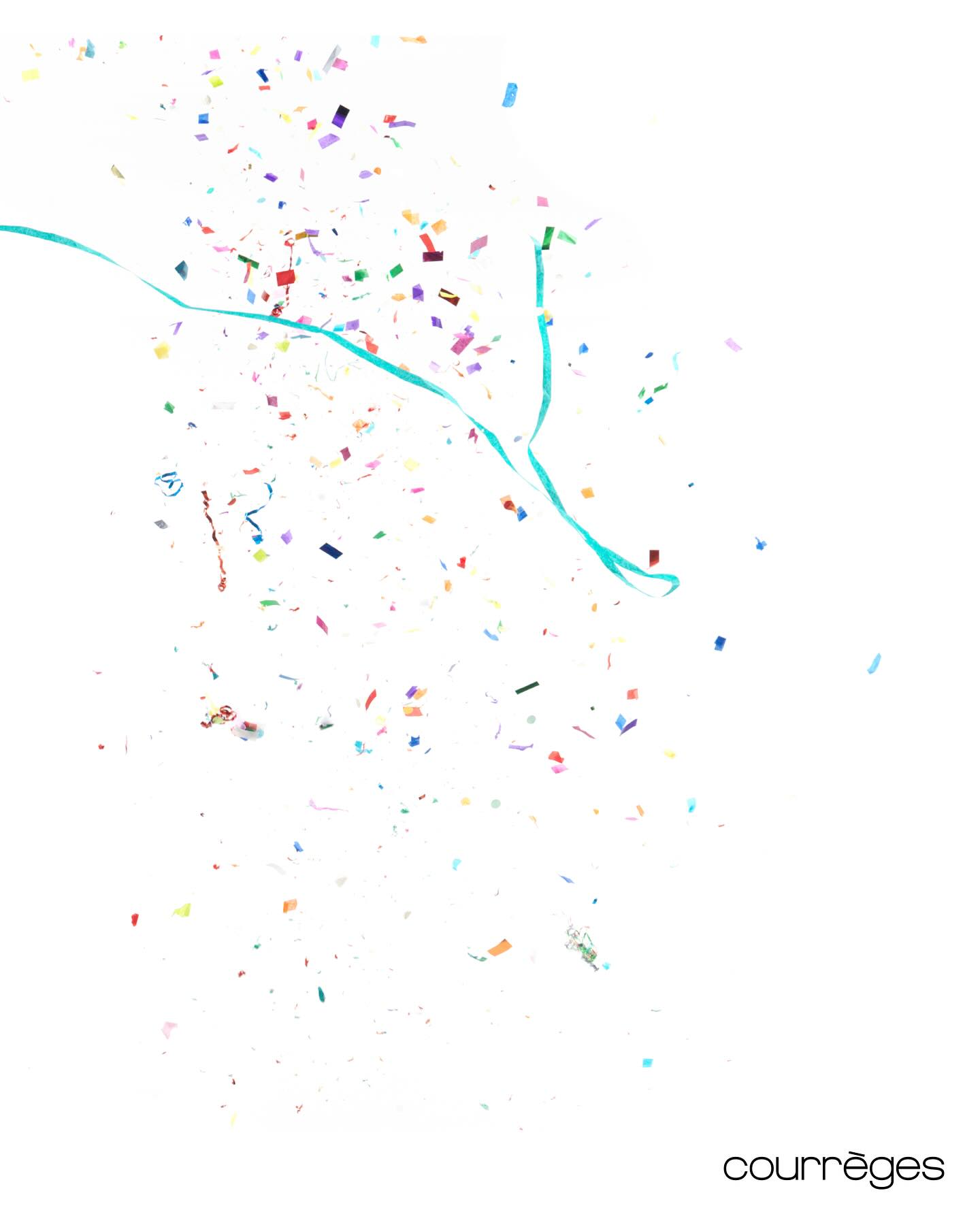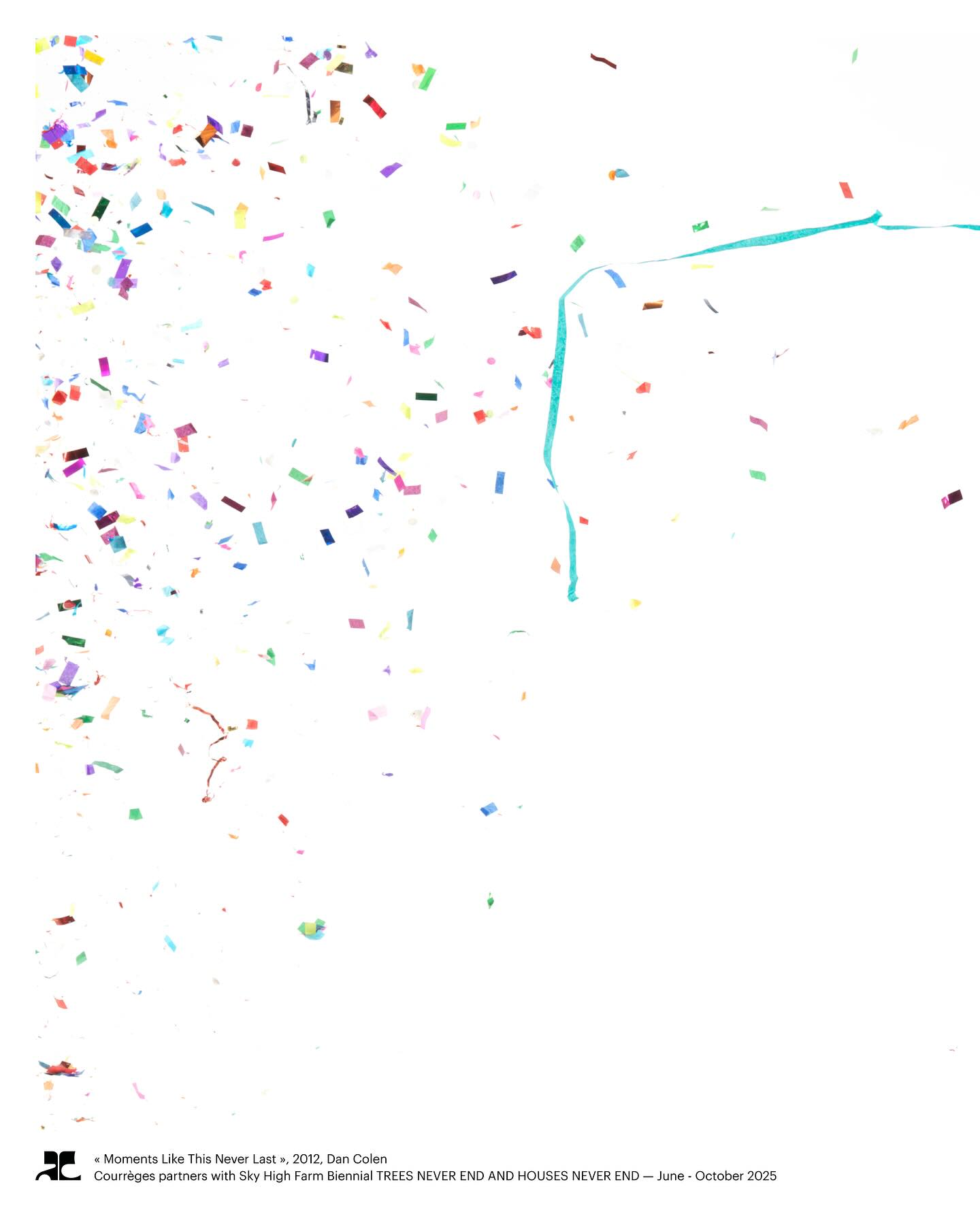 Courrèges 艺术总监 Nicolas Di Felice 携手艺术家 Dan Colen 及 Sky High Farm Biennial,以颠覆传统的艺术企划呈现 2025 秋冬系列。本次宣传摒弃常规产品展示,仅以纯白背景下逆向飘落的彩色纸屑构成视觉核心,灵感源自 Di Felice 收藏的爆炸瞬间影像。该创作将商业空间转化为「希望的画布」,诠释「喜悦即抵抗」的哲学理念。活动同时支持 2025 年 6 月于纽约州日耳曼敦举办的首届 Sky High Farm 双年展,通过艺术力量为粮食主权与气候变化议题募集资金。