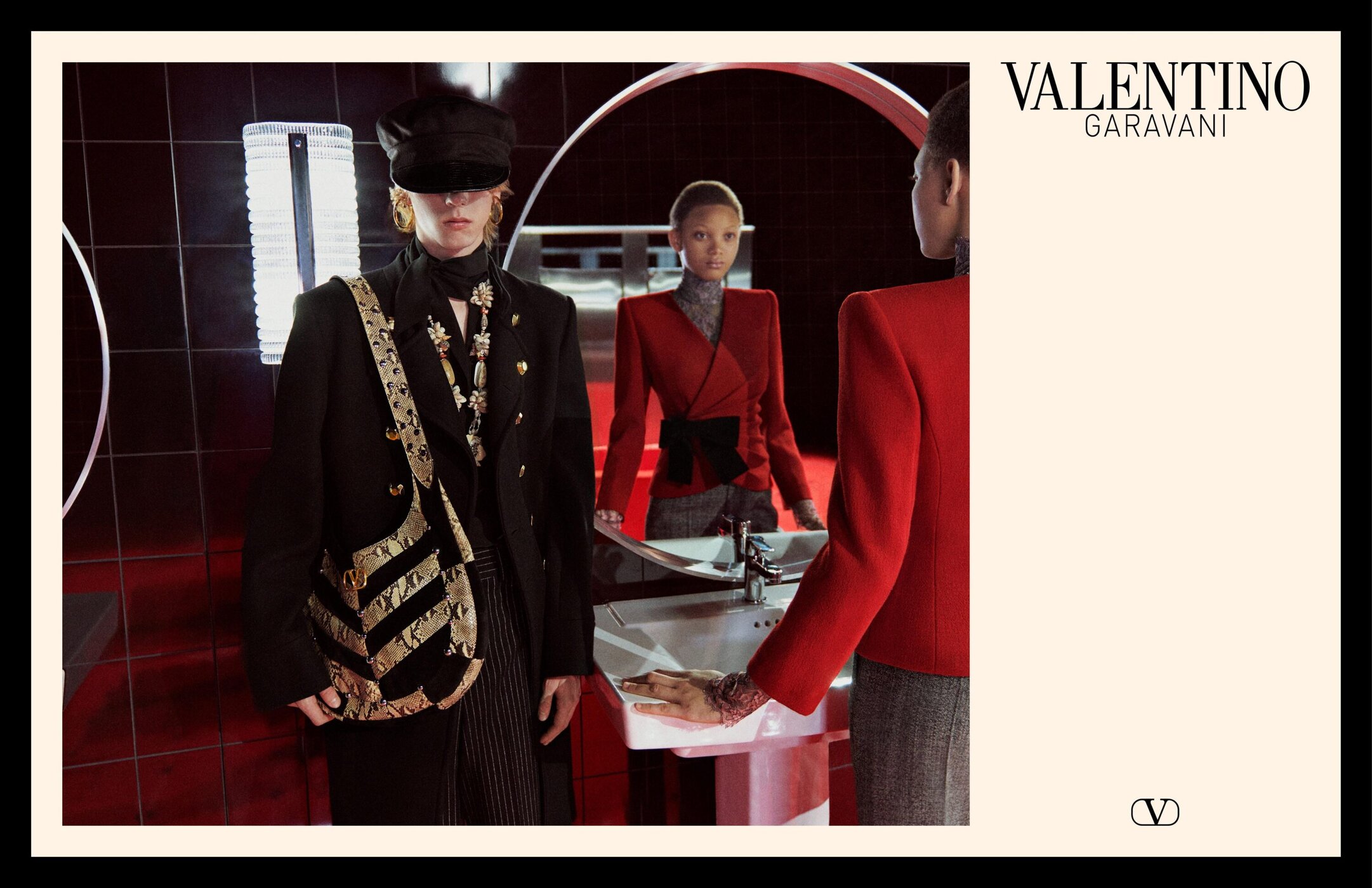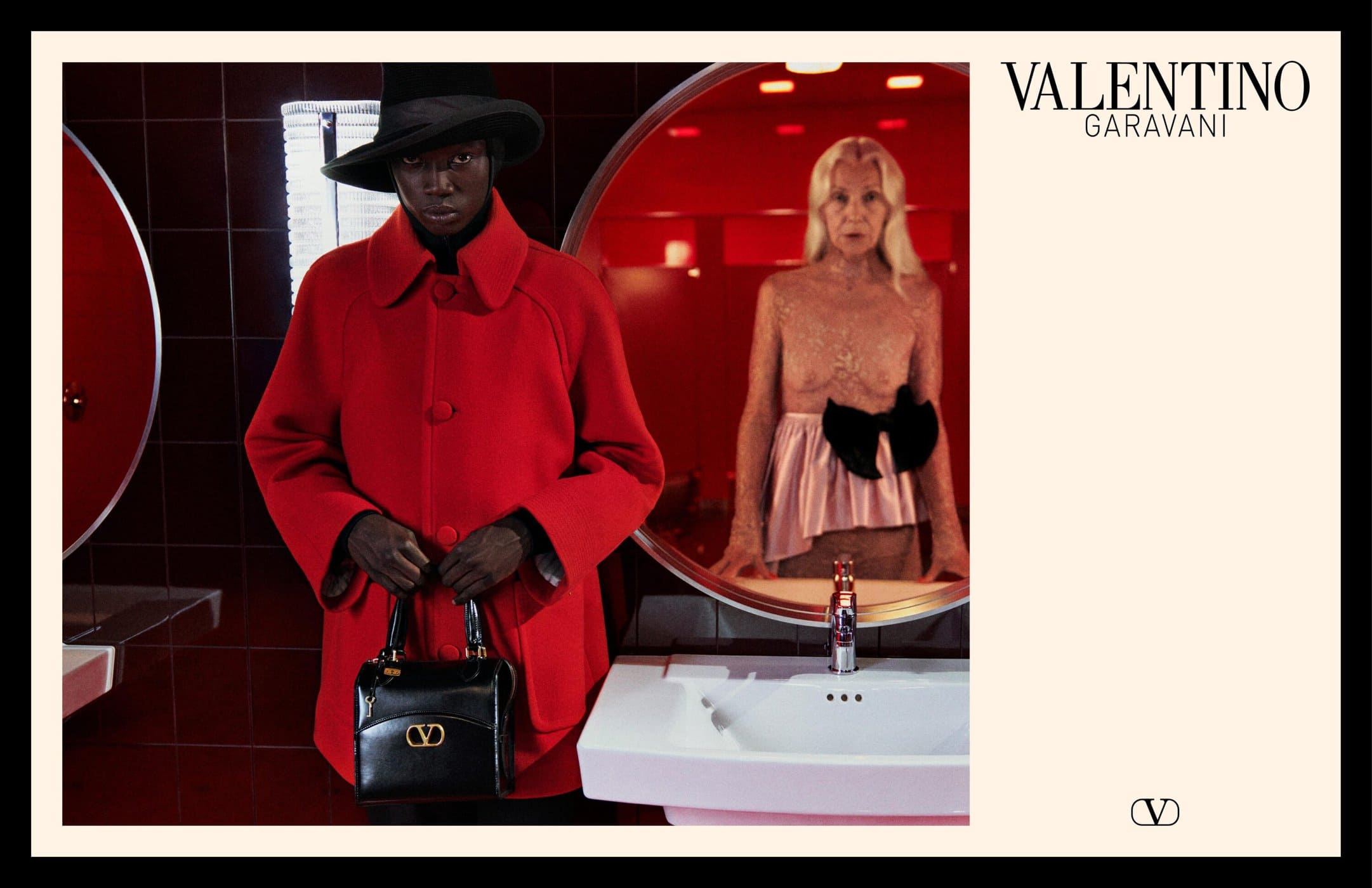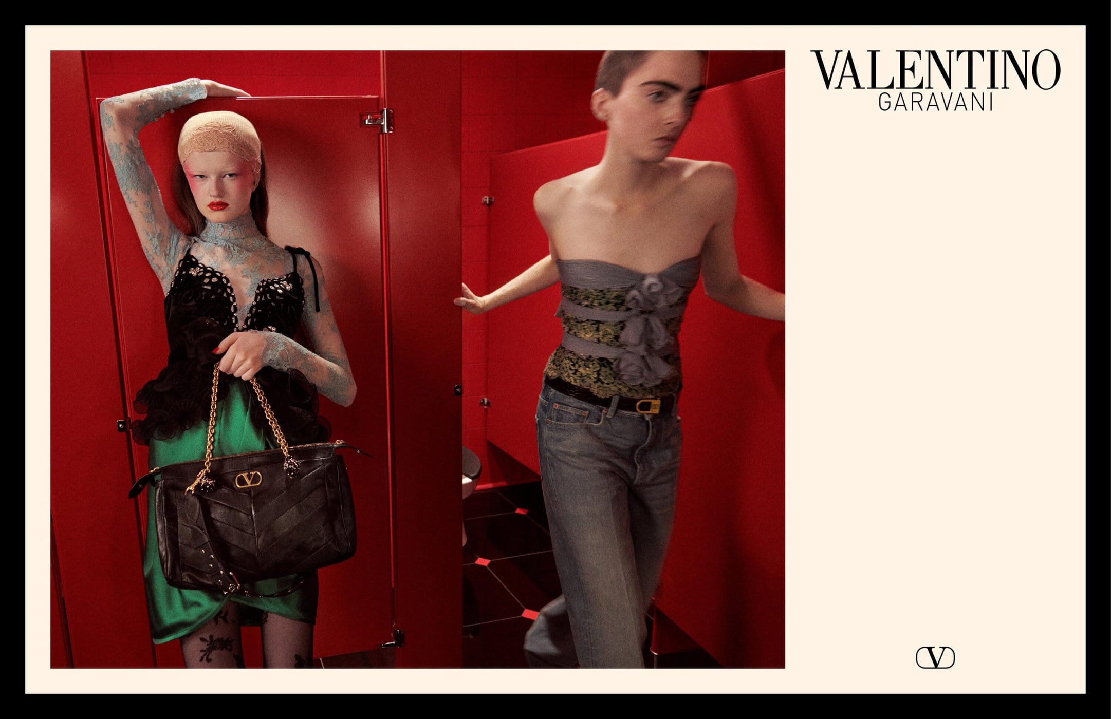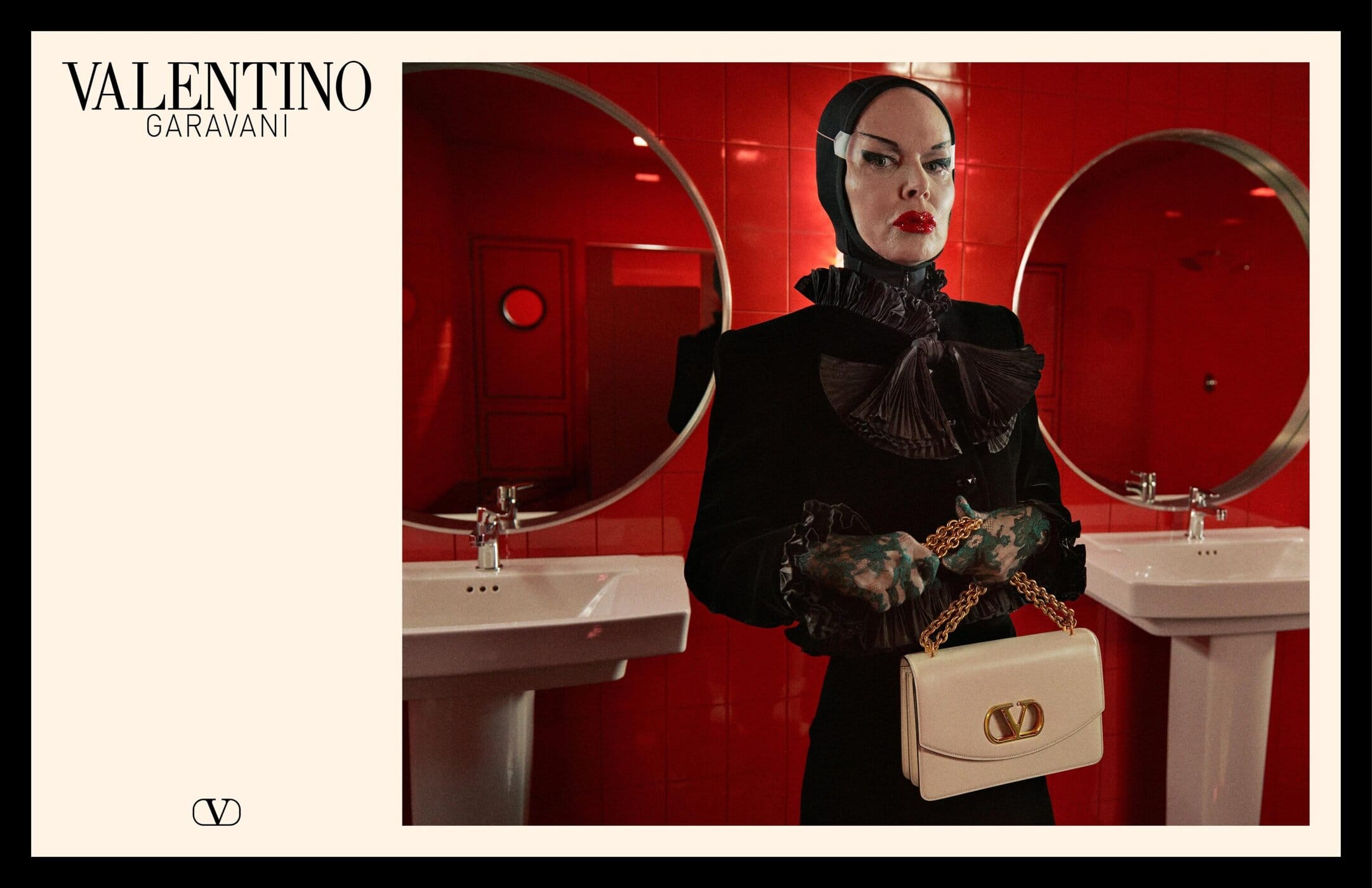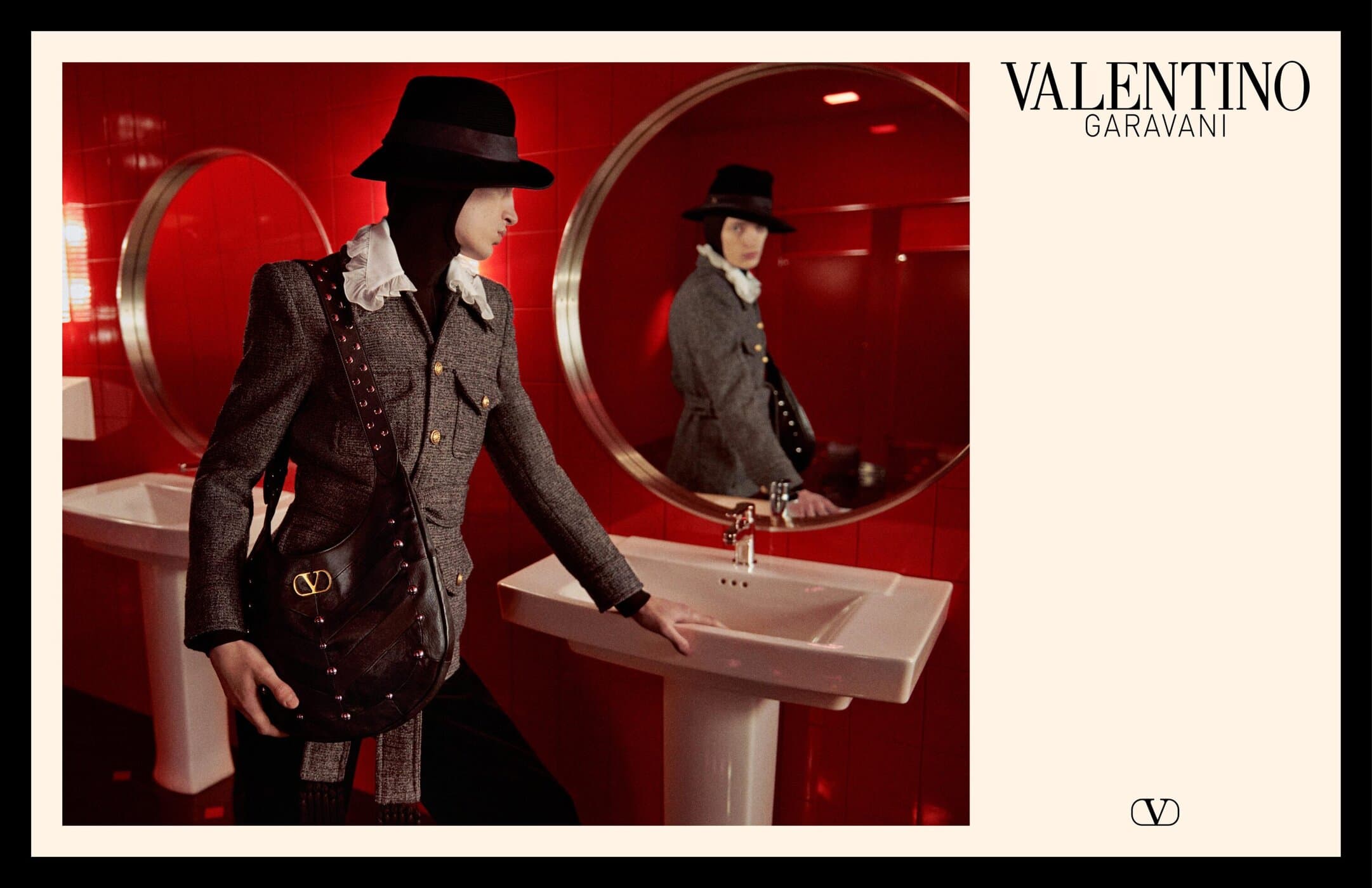 Valentino 2025 秋冬系列大片大胆延伸了创意总监亚 Alessandro Michele 的愿景。该片名为「私密元剧场(Le Méta-Théâtre Des Intimités)」,重现了 3 月巴黎时装周秀上的公共卫生间场景。由艺术总监 Christopher Simmonds 执导、摄影师 Glen Luchford 执镜、Jonathan Kaye 负责造型,音乐家 Clairo、表演艺术家 Kembra Pfahler 等名人担任模特,在这里,普通的空间变成了探索隐私、身份和自我表达相交汇的舞台。