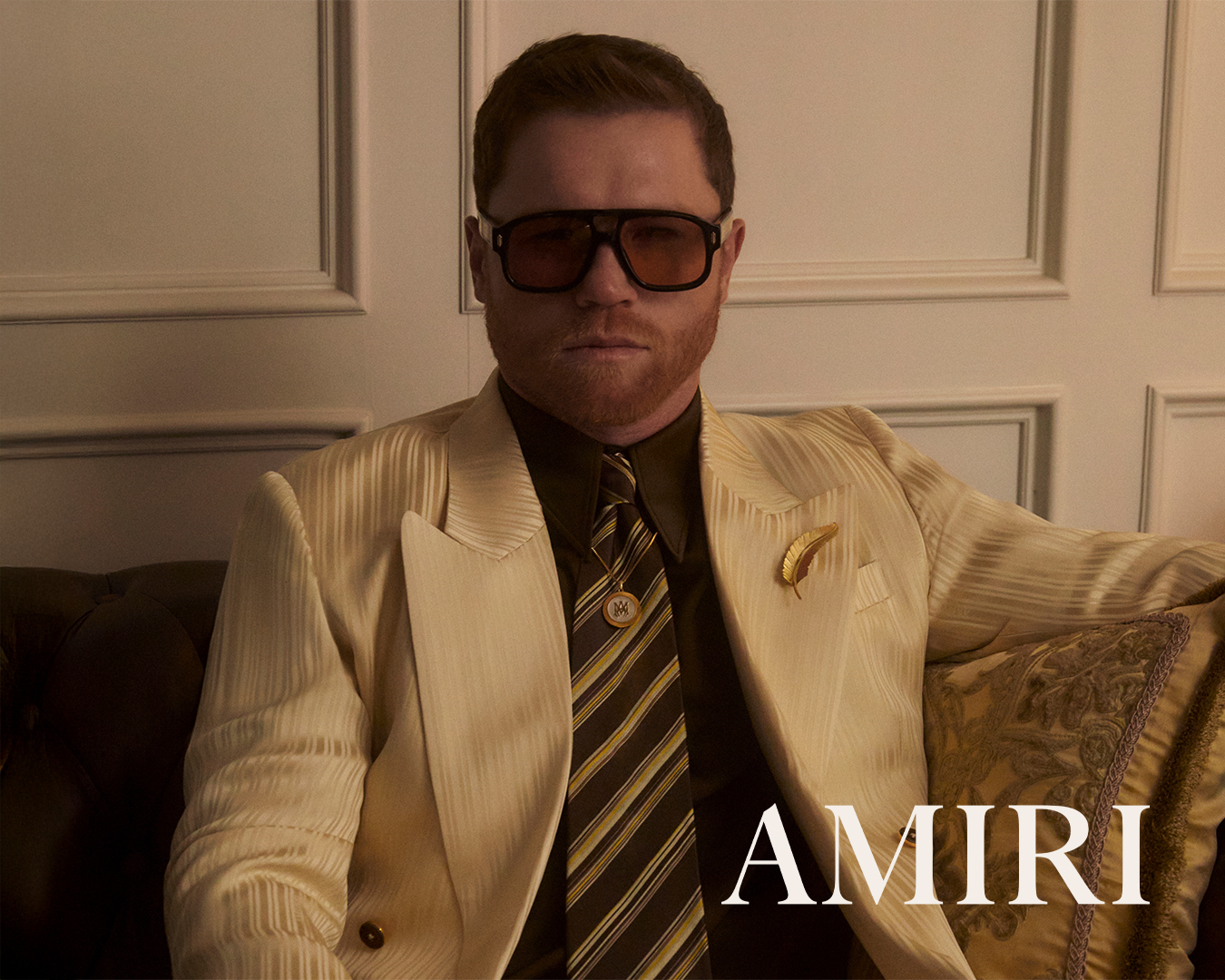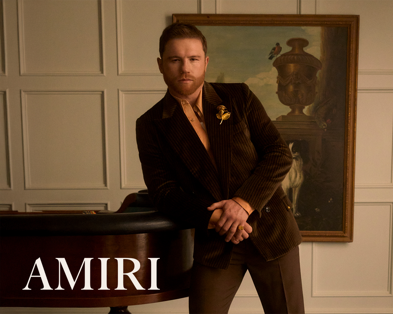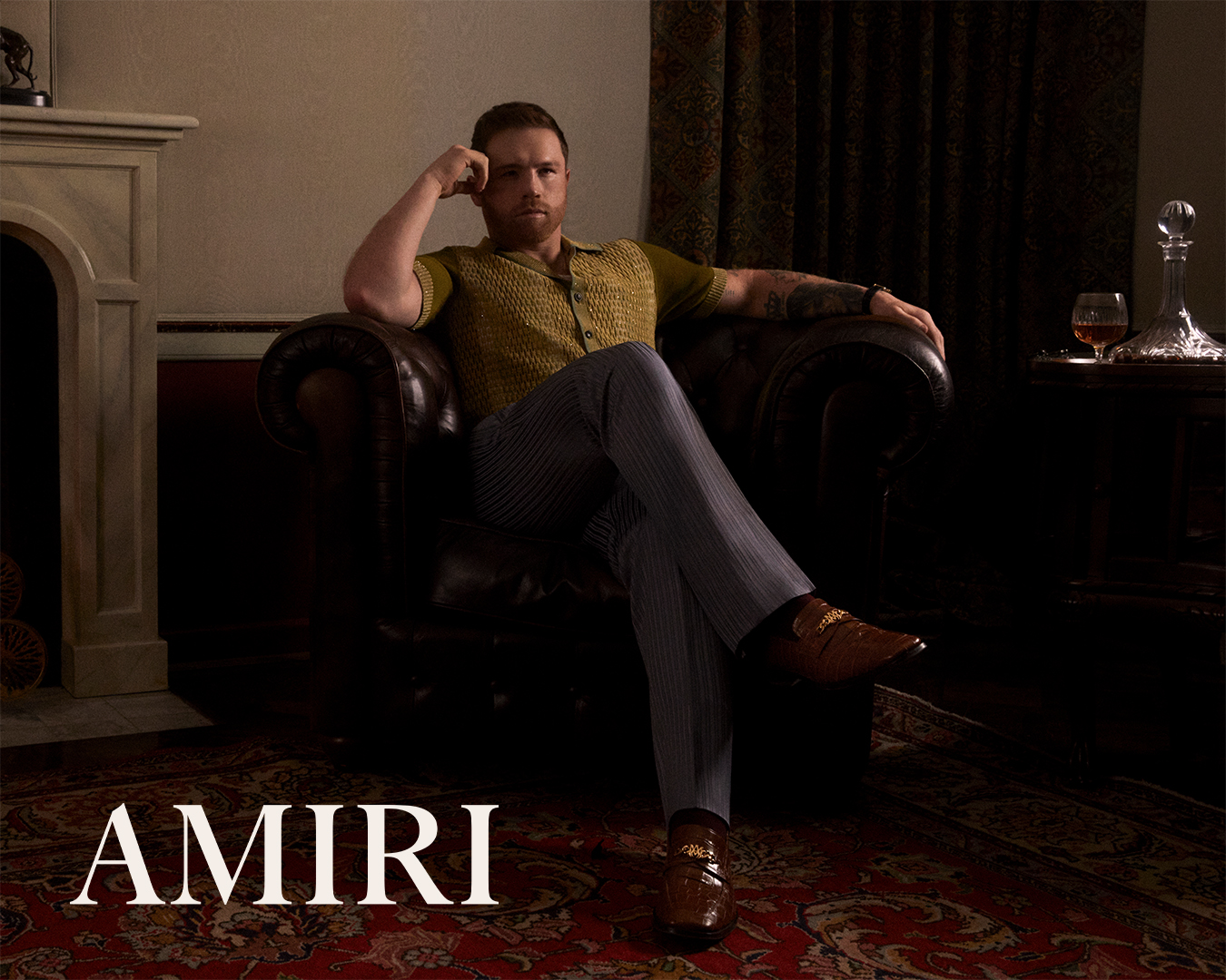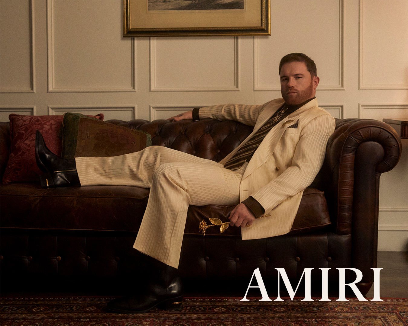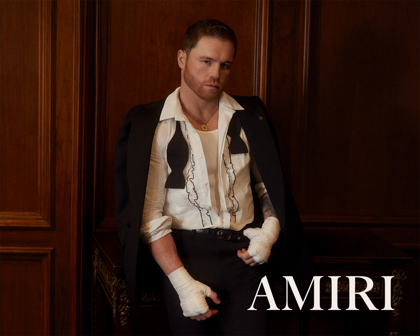 AMIRI 品牌代言人 Saúl ‘Canelo’ Álvarez 倾情演绎 2025 秋冬广告大片。在摄影师 Hart Leshkina 的掌镜下,Álvarez 于一栋复古宅邸中收放自如地展现代言人的多面魅力——时而身着利落西装与褶饰衬衫,时而搭配休闲装与拳击缠带,完美融合高级时装与竞技力量,诉说公众形象与真实自我之间的对话。
