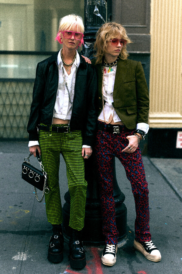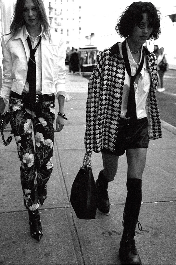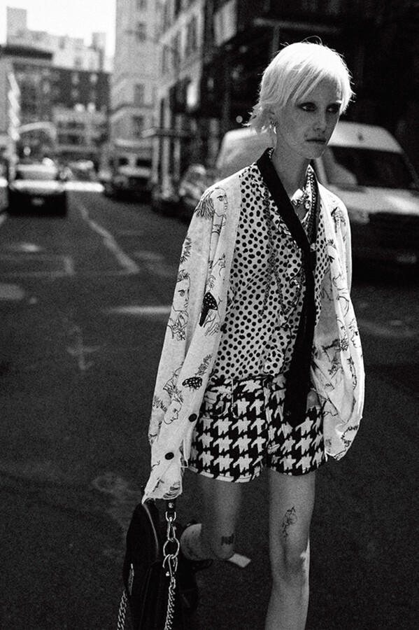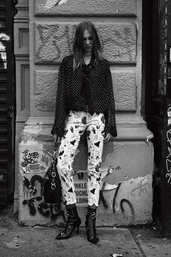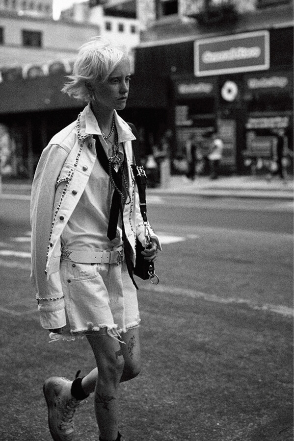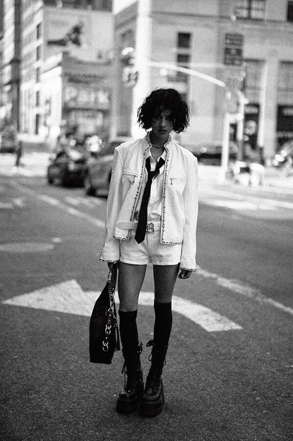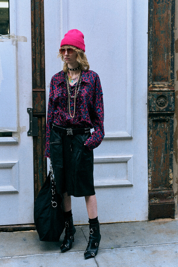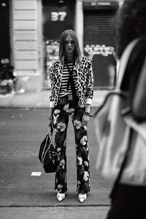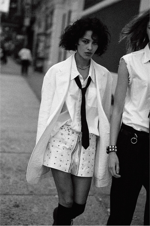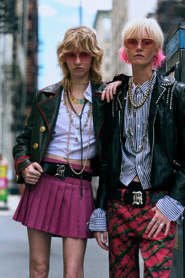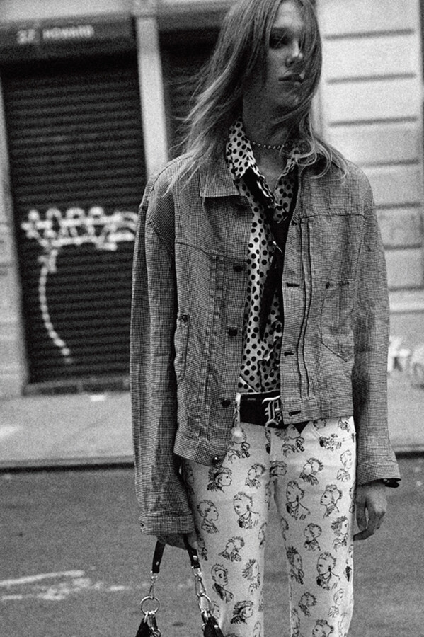 第二部分包括本季最色彩缤纷的款式,亮点包括豹纹西装外套、印有铁丝网图案的牛仔布,以及令人联想起电影《独领风骚》的朋克霓虹格纹。「我成长于 80 年代,深受 Ramones 乐队和 Stephen Sprouse 的启发。我喜欢把喜欢的东西以自己的方式混搭起来。」最后一部分 Chris Leba 选择了黑白作为主题。他强调了梭织衬衫上的单针刺绣,描绘出经典朋克形象,为每套女士造型至少融入了一种男装元素。