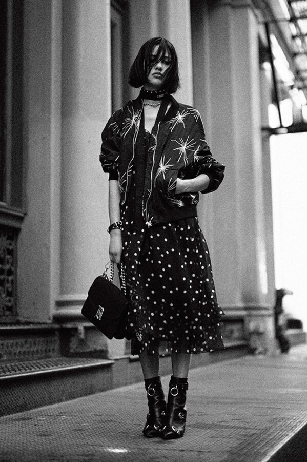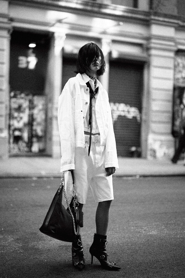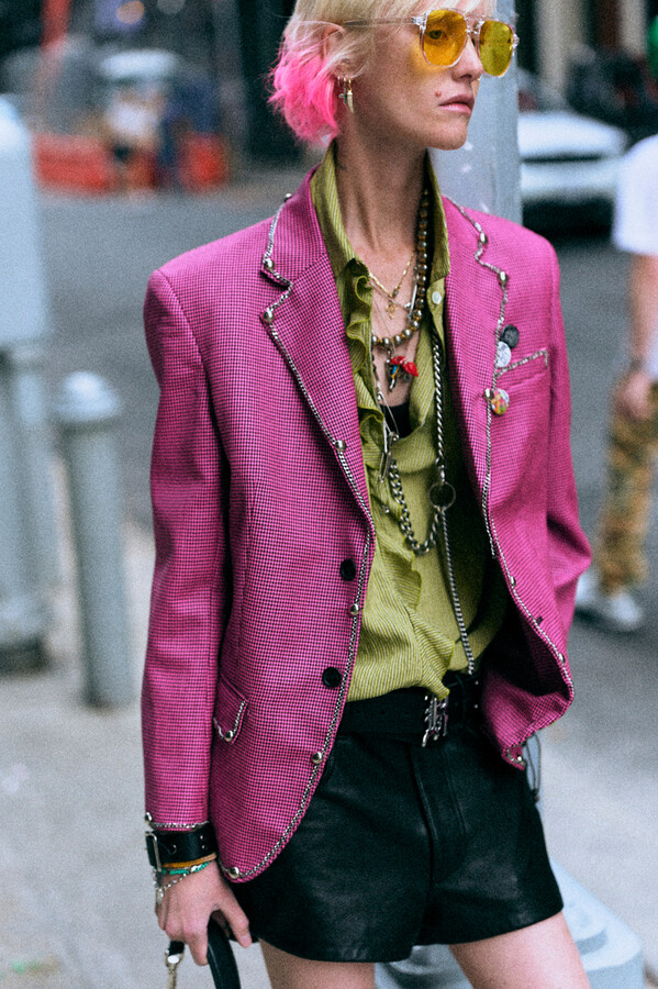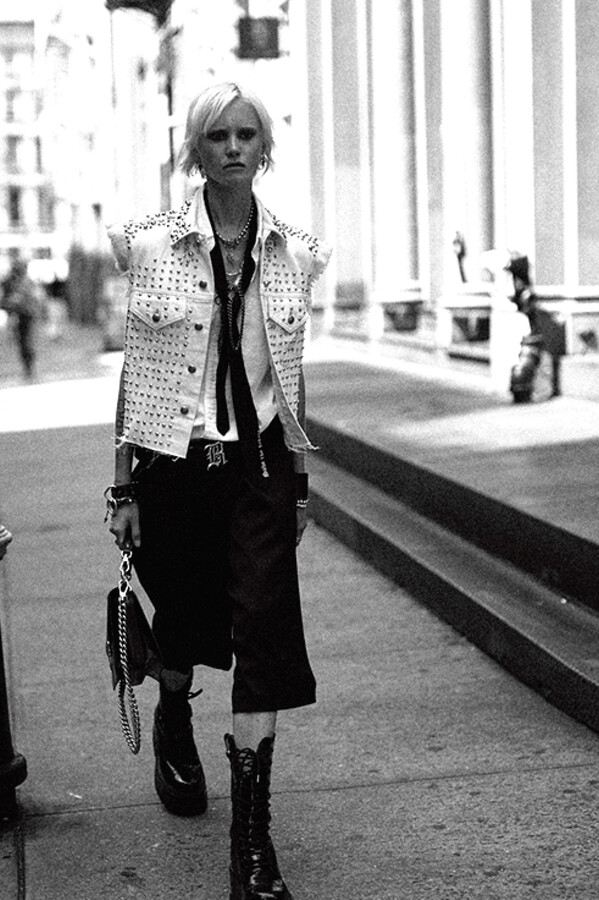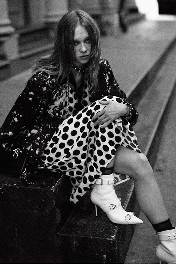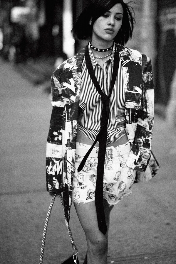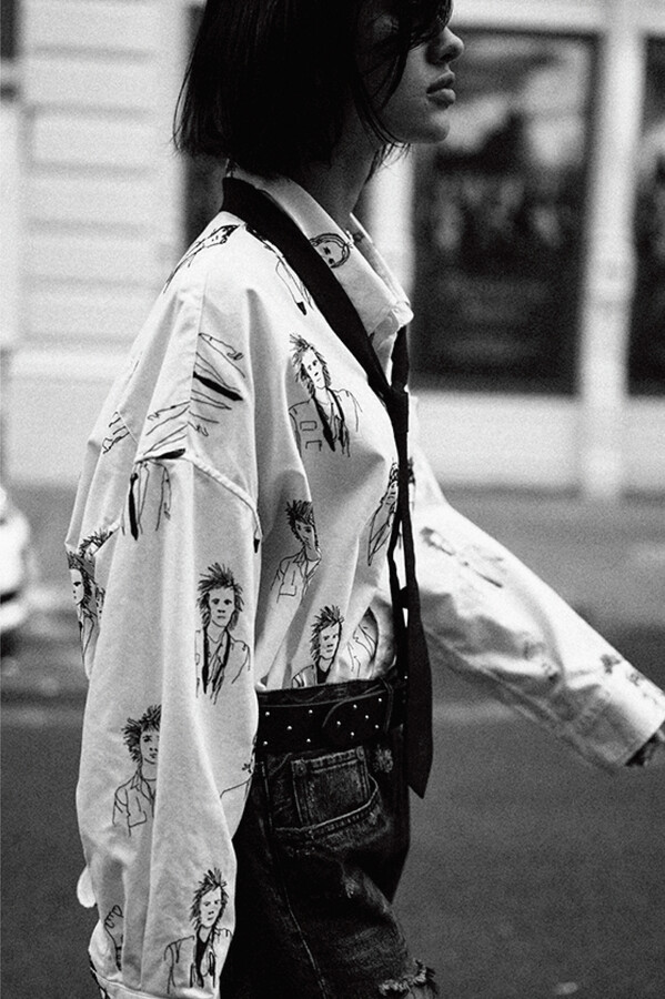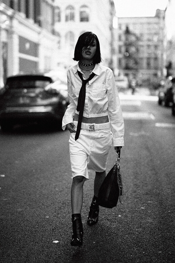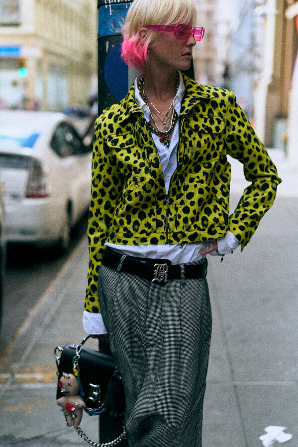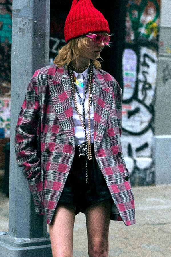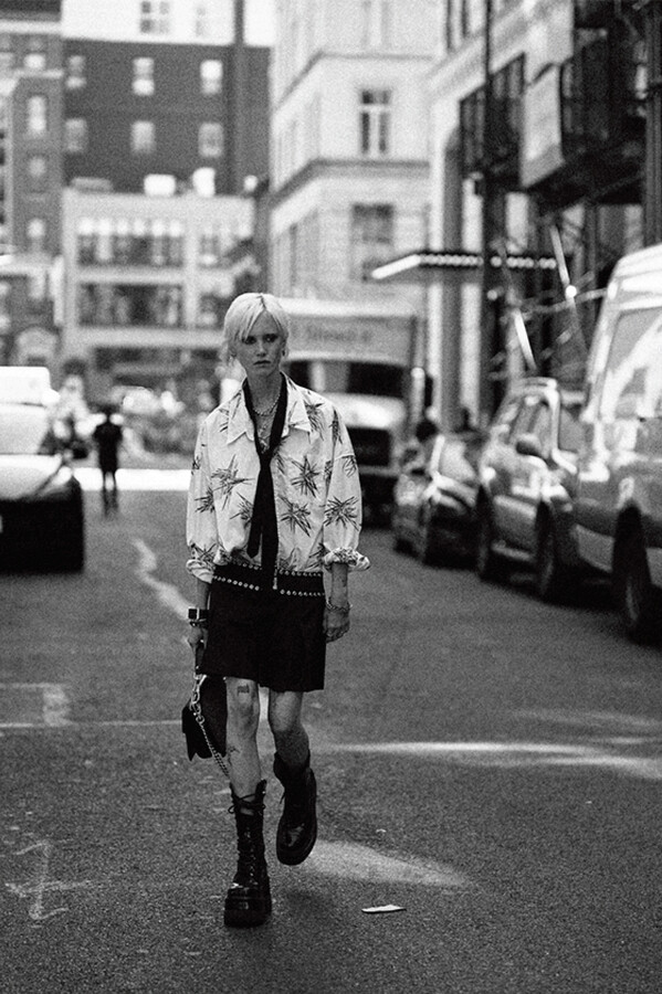 第二部分包括本季最色彩缤纷的款式,亮点包括豹纹西装外套、印有铁丝网图案的牛仔布,以及令人联想起电影《独领风骚》的朋克霓虹格纹。「我成长于 80 年代,深受 Ramones 乐队和 Stephen Sprouse 的启发。我喜欢把喜欢的东西以自己的方式混搭起来。」最后一部分 Chris Leba 选择了黑白作为主题。他强调了梭织衬衫上的单针刺绣,描绘出经典朋克形象,为每套女士造型至少融入了一种男装元素。