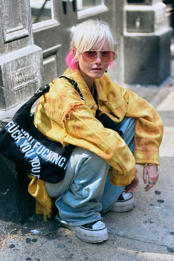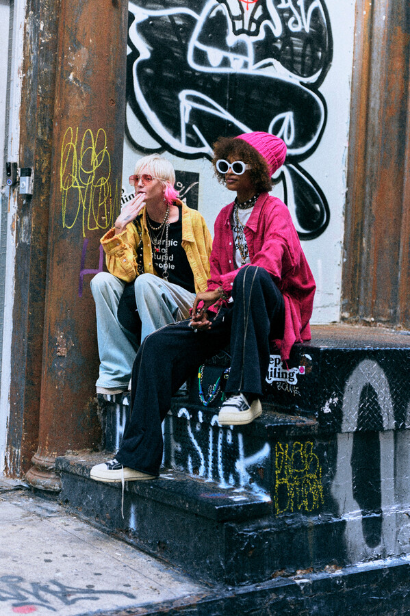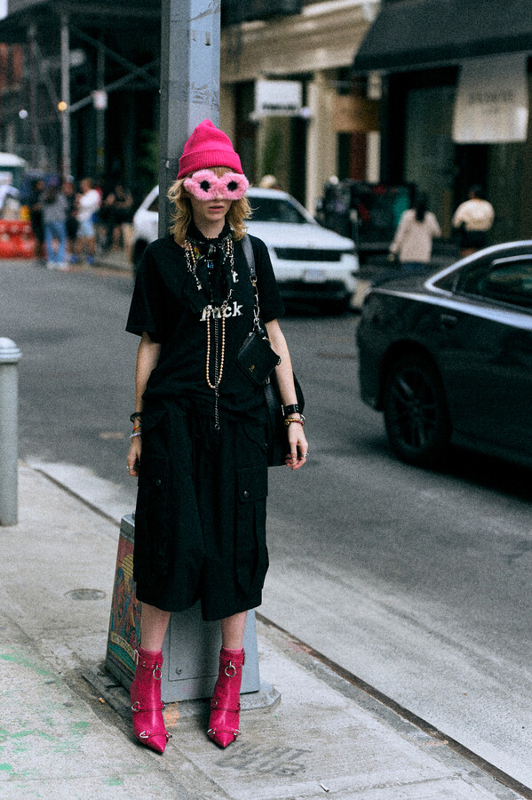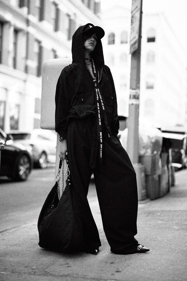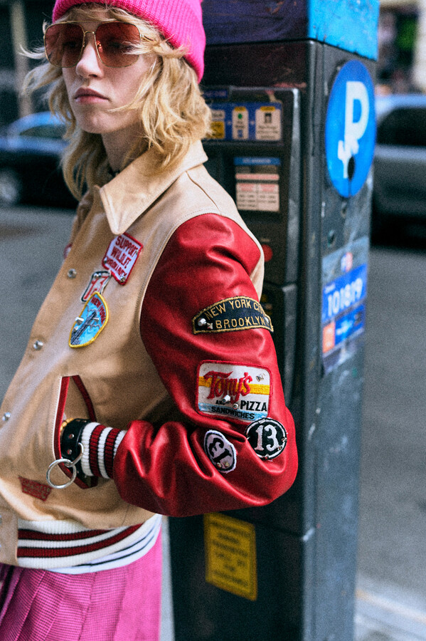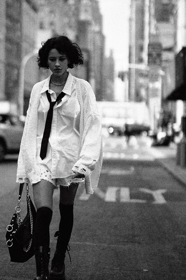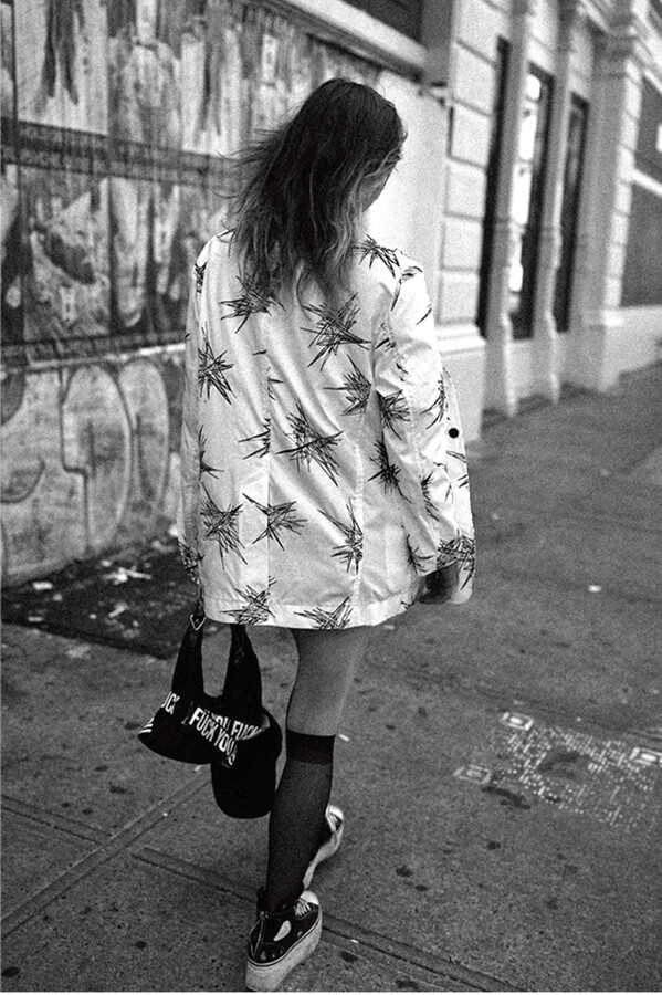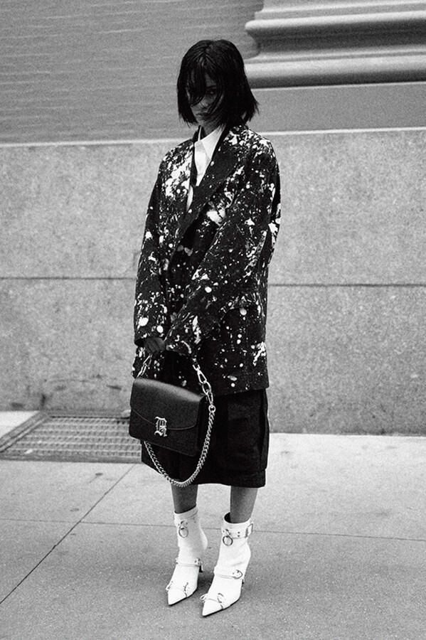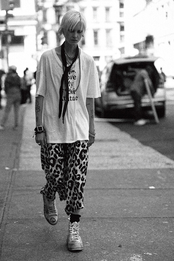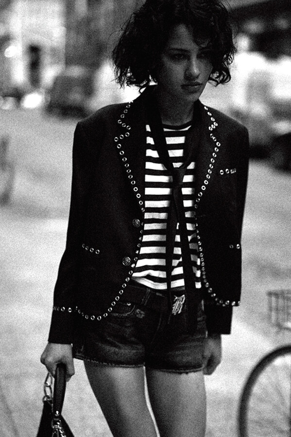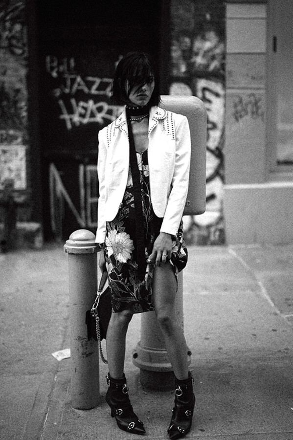 第二部分包括本季最色彩缤纷的款式,亮点包括豹纹西装外套、印有铁丝网图案的牛仔布,以及令人联想起电影《独领风骚》的朋克霓虹格纹。「我成长于 80 年代,深受 Ramones 乐队和 Stephen Sprouse 的启发。我喜欢把喜欢的东西以自己的方式混搭起来。」最后一部分 Chris Leba 选择了黑白作为主题。他强调了梭织衬衫上的单针刺绣,描绘出经典朋克形象,为每套女士造型至少融入了一种男装元素。