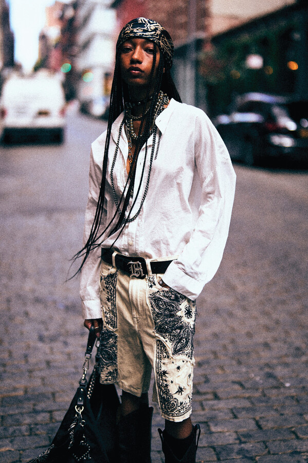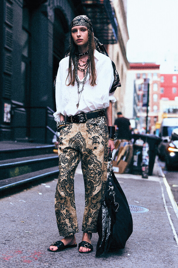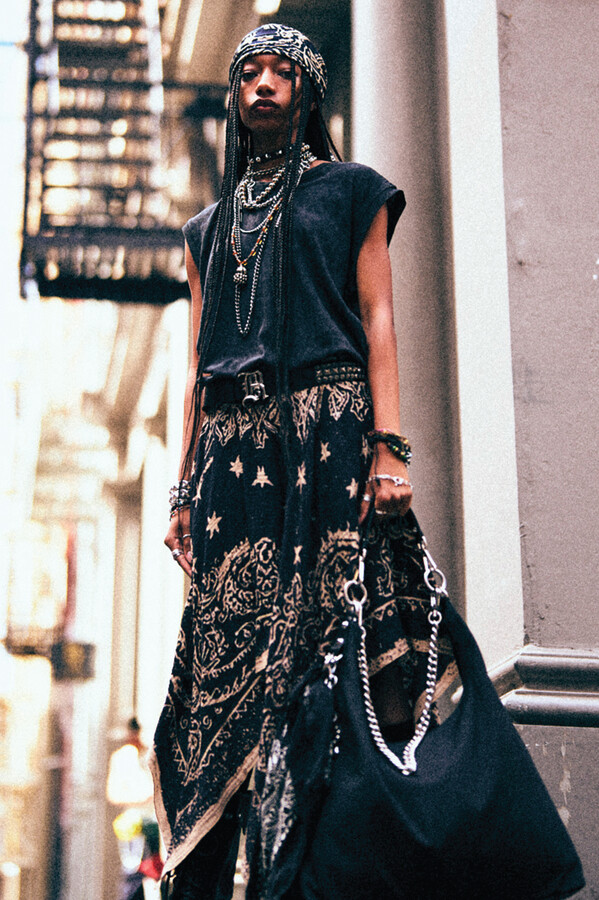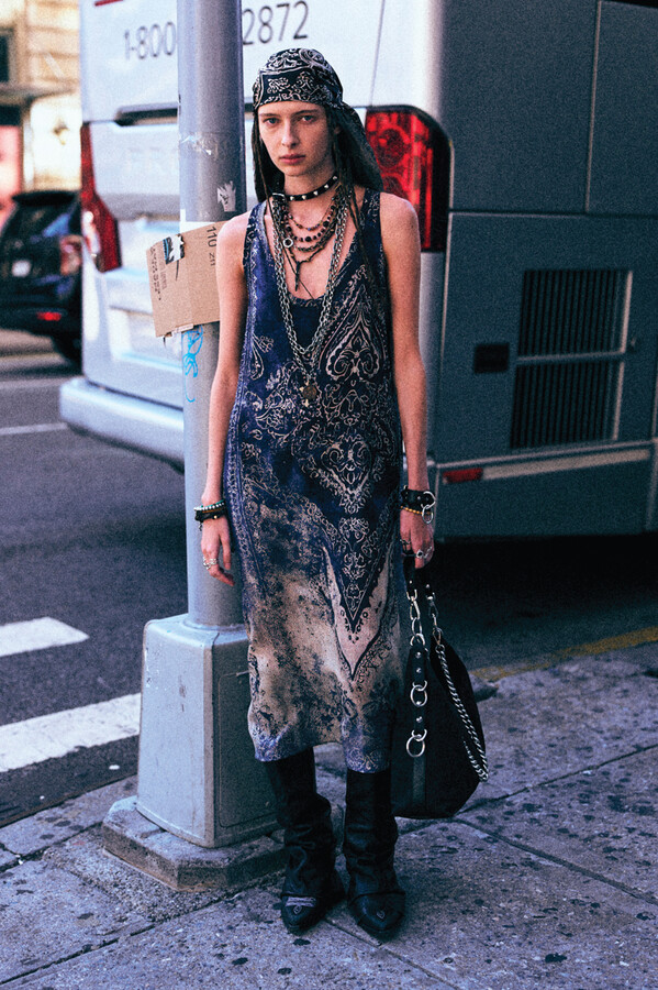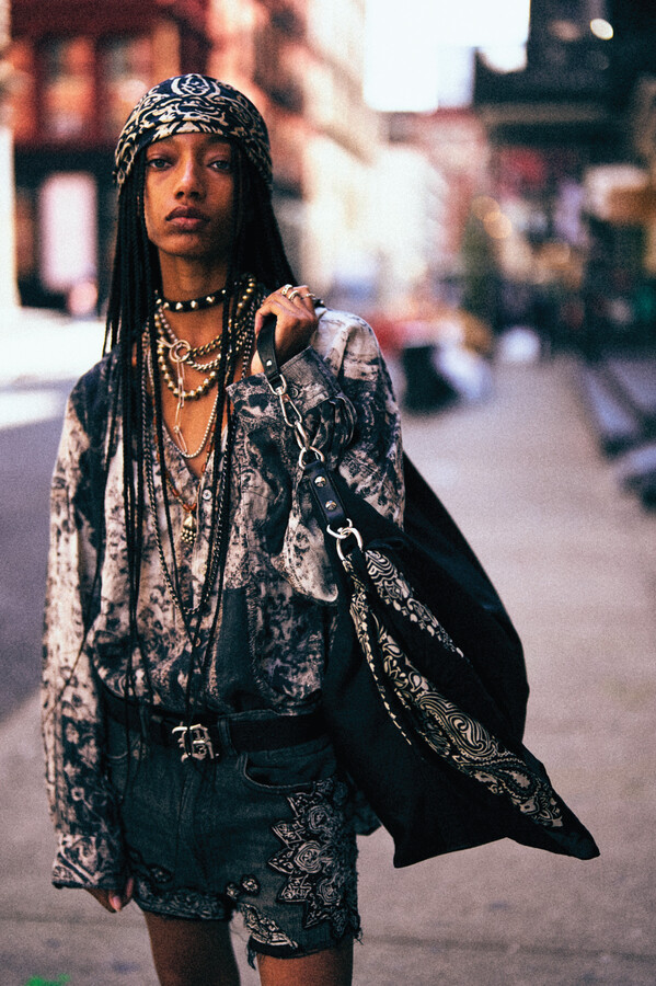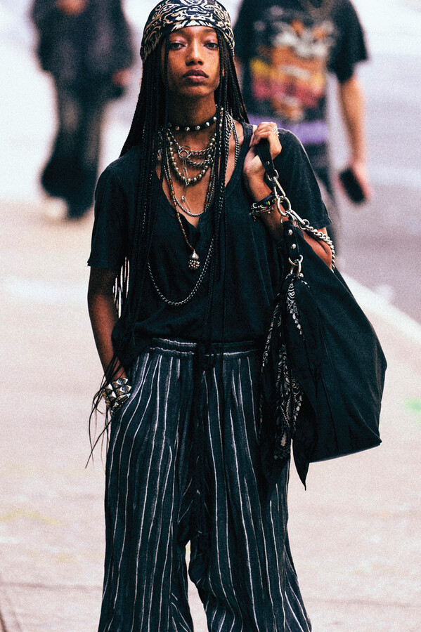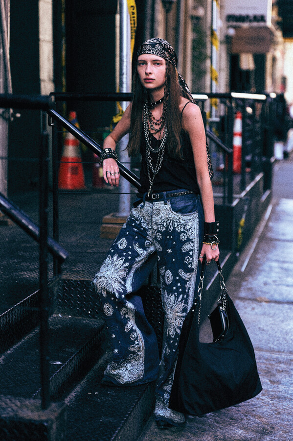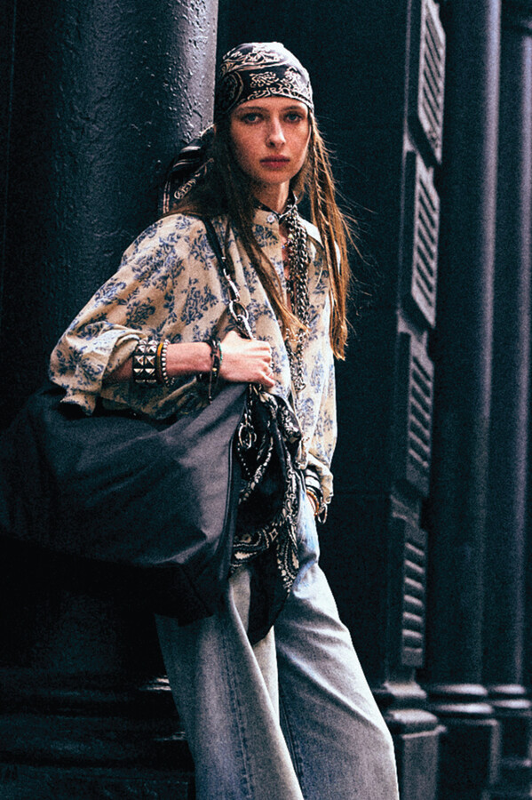 虽然 R13 的核心摇滚风格得以延续,但设计师 Chris Leba 表示「本季追求一种浪漫朋克的氛围」,为 2026 春夏系列带来了更多的色彩、印花和刺绣。他将本季分为三个主题,第一部分以头巾上的常见印花为主。「我经常喜欢选择一些标志性的单品,比如头巾,然后做一些人们从未见过的出乎意料的作品。」Chris Leba 称该主题始于一条牛仔裤,他将印花头巾贴花于裤腿上,之后又将其运用到西装外套、裙子,甚至一双西部靴上。另一亮点是对于木版印刷技术的运用——体现在手工和数码印花两种版本的梭织衬衫和连衣裙上,Leba 称非常喜欢木版印刷技术带来的「印花中的不规则感」。