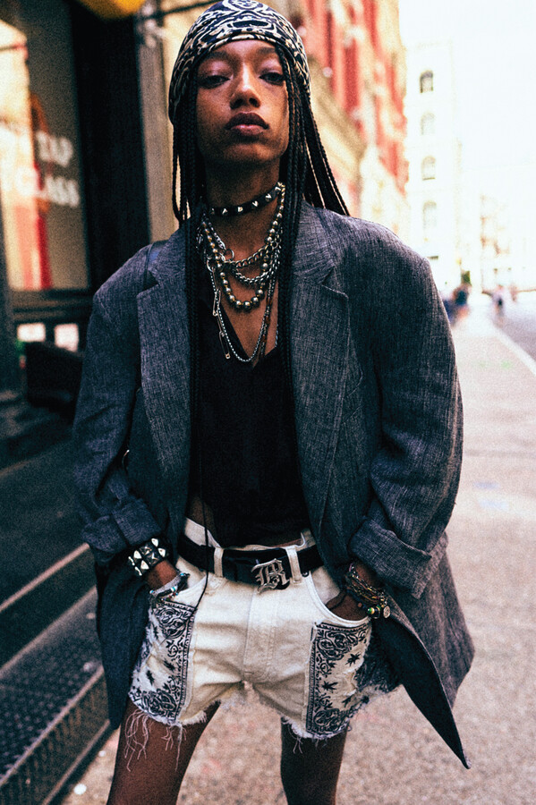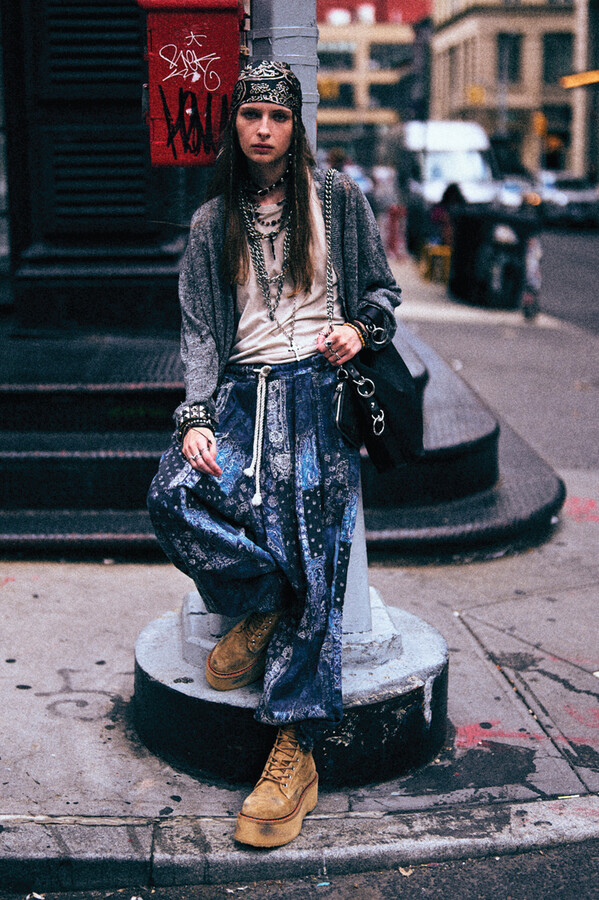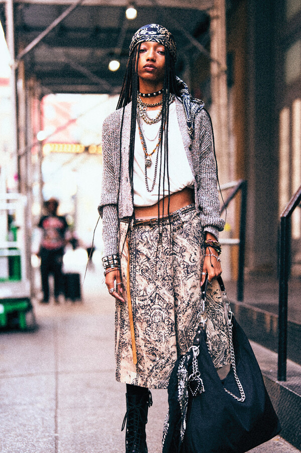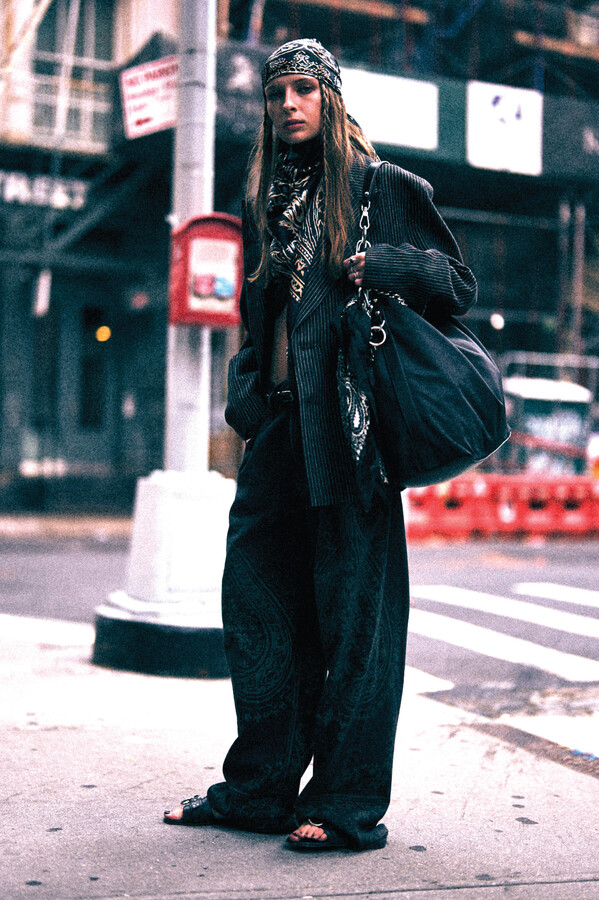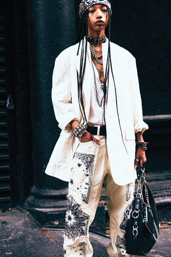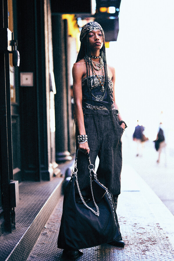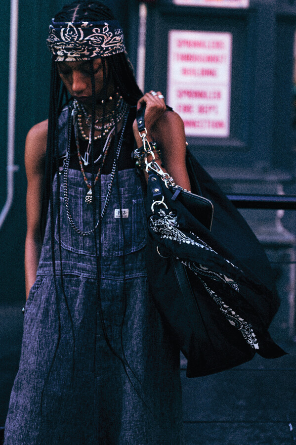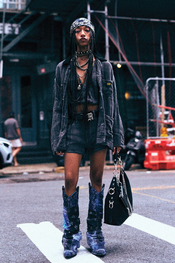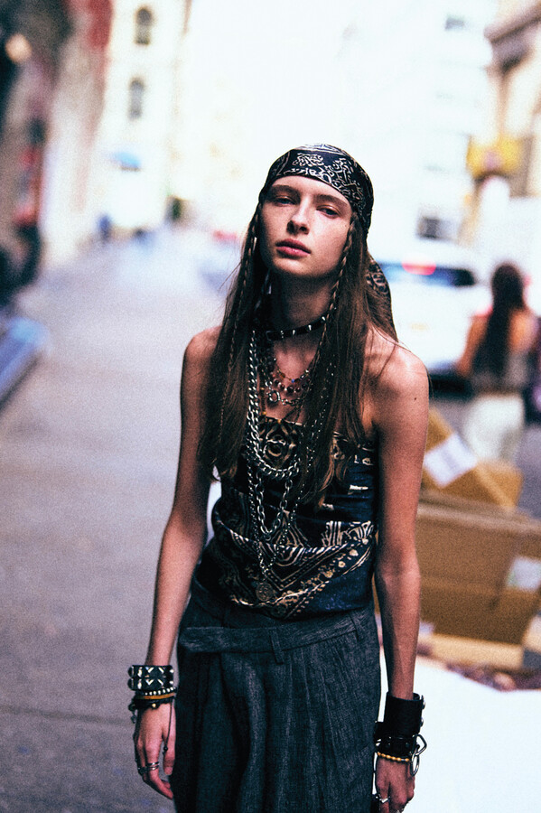 虽然 R13 的核心摇滚风格得以延续,但设计师 Chris Leba 表示「本季追求一种浪漫朋克的氛围」,为 2026 春夏系列带来了更多的色彩、印花和刺绣。他将本季分为三个主题,第一部分以头巾上的常见印花为主。「我经常喜欢选择一些标志性的单品,比如头巾,然后做一些人们从未见过的出乎意料的作品。」Chris Leba 称该主题始于一条牛仔裤,他将印花头巾贴花于裤腿上,之后又将其运用到西装外套、裙子,甚至一双西部靴上。另一亮点是对于木版印刷技术的运用——体现在手工和数码印花两种版本的梭织衬衫和连衣裙上,Leba 称非常喜欢木版印刷技术带来的「印花中的不规则感」。