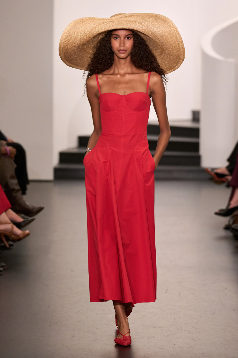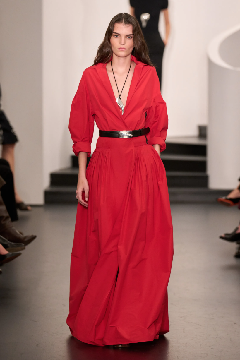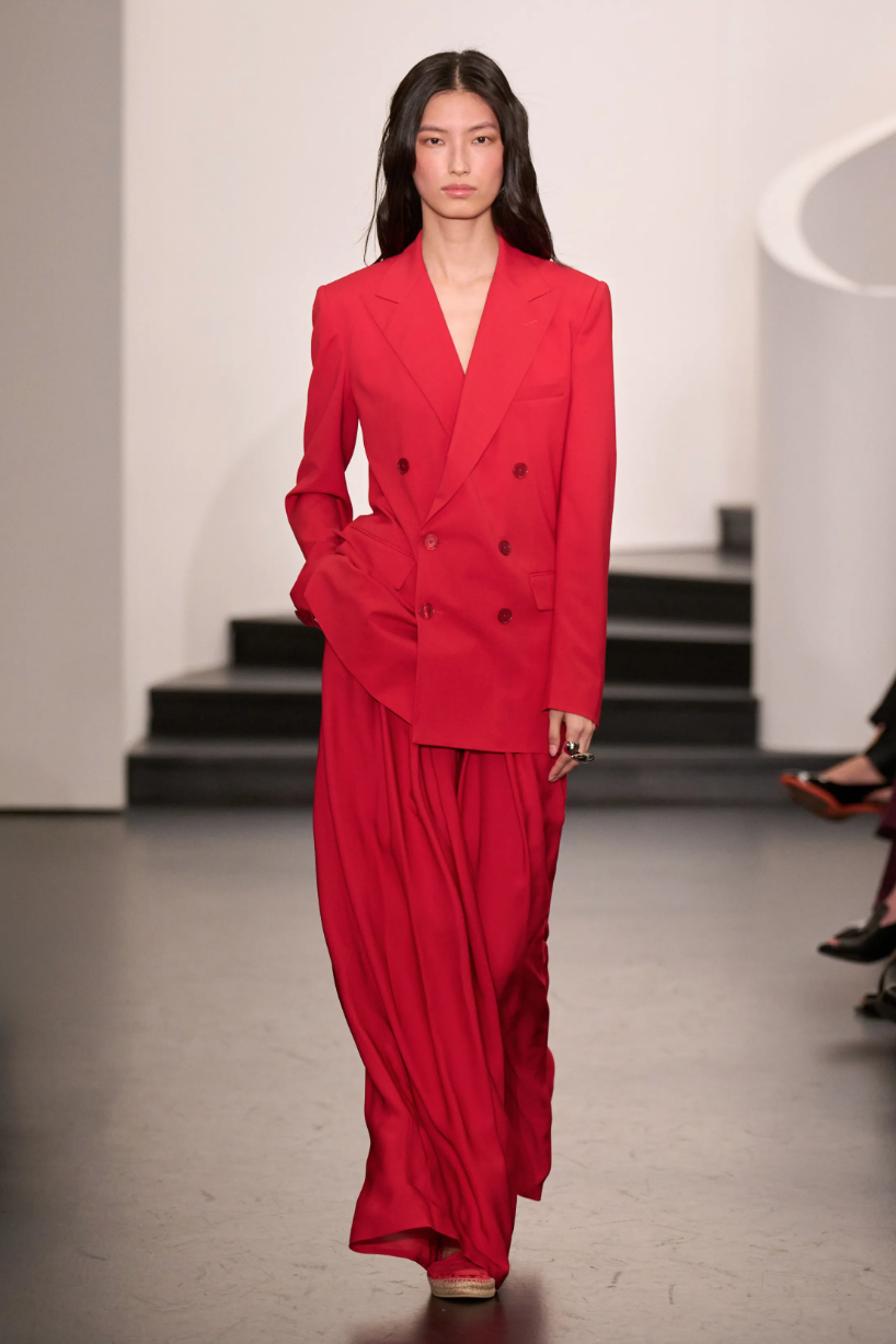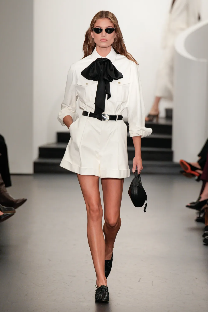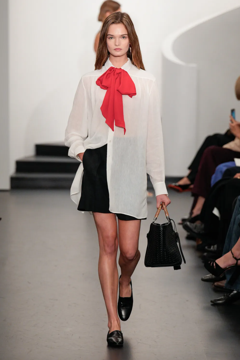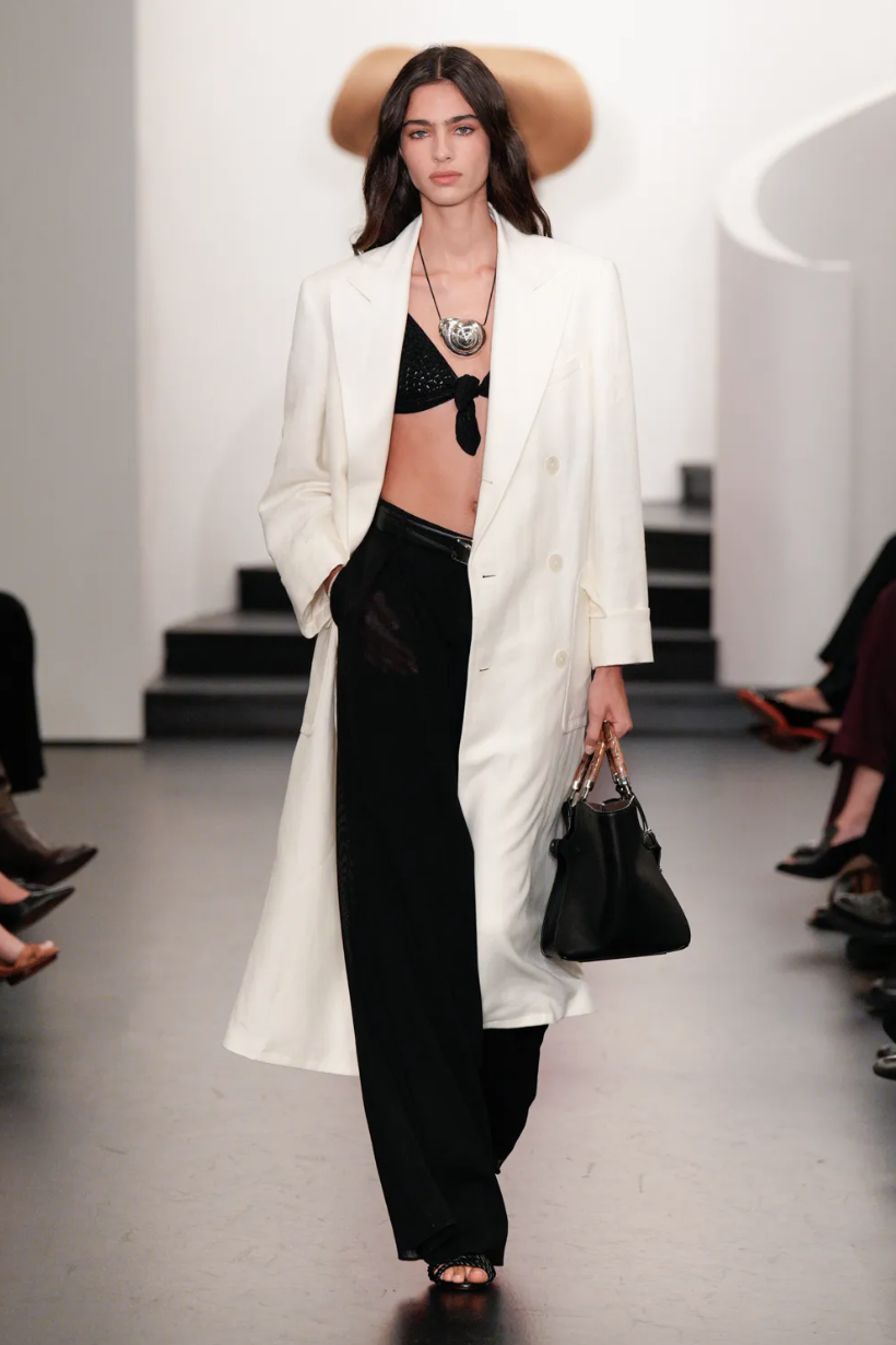 而在 2026 年春夏,Ralph Lauren 摒弃了秋季流行的奢华荷叶边和天鹅绒,转向清爽利落的服装,并以红、白、黑三色为主。与之前的系列一样,本季也在阳刚与柔美之间切换,正如 Ralph Lauren 在秀场笔记中写道的:「力量与性感」。许多剪裁合身的服装都以抹胸代替衬衫,而裤子的腰部则采用纱笼般的包裹式设计。