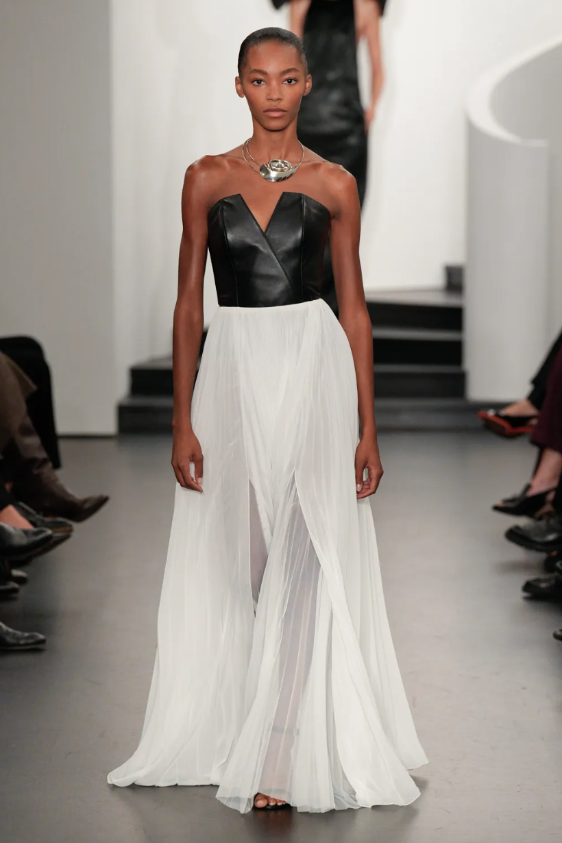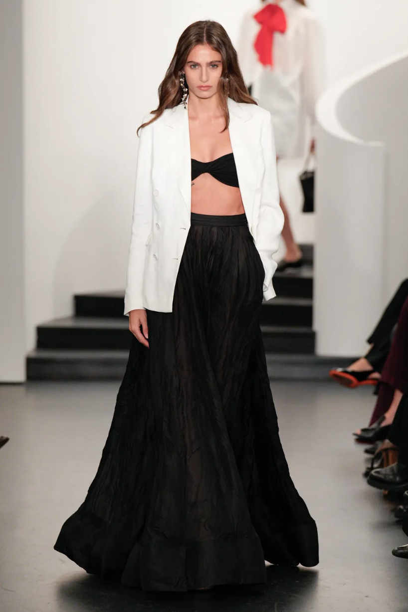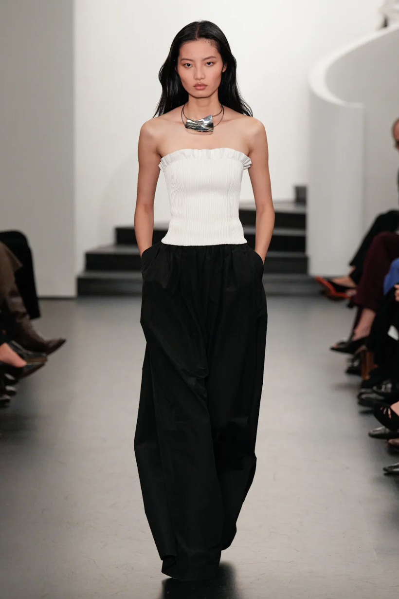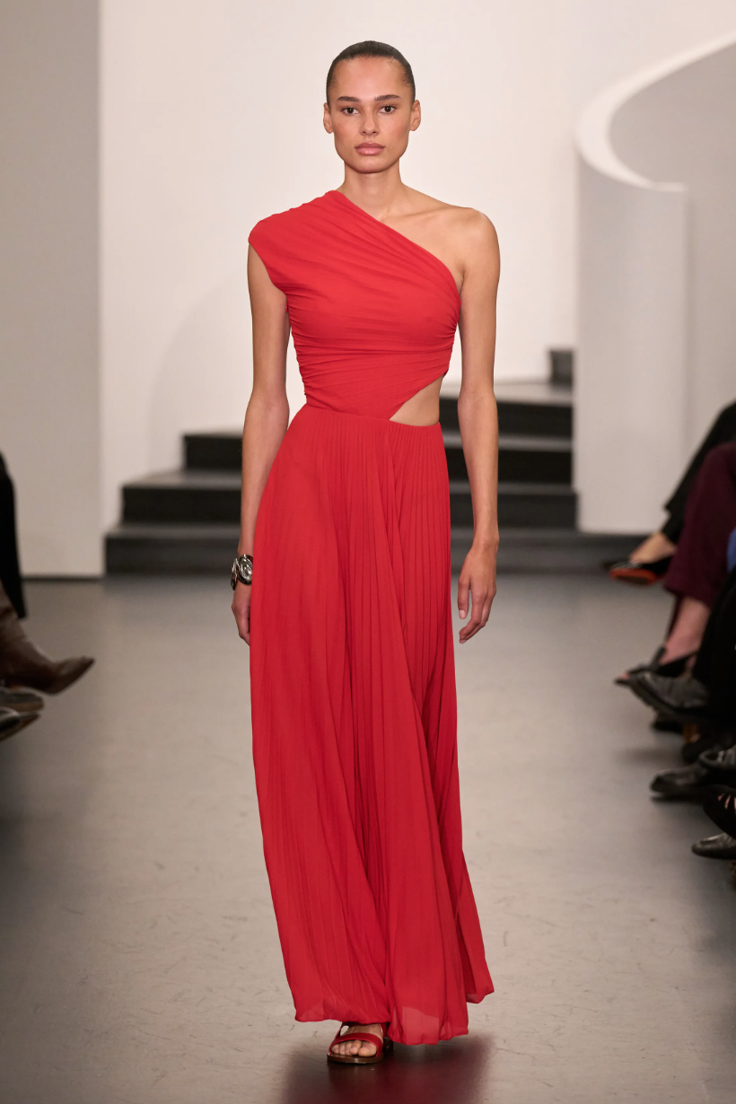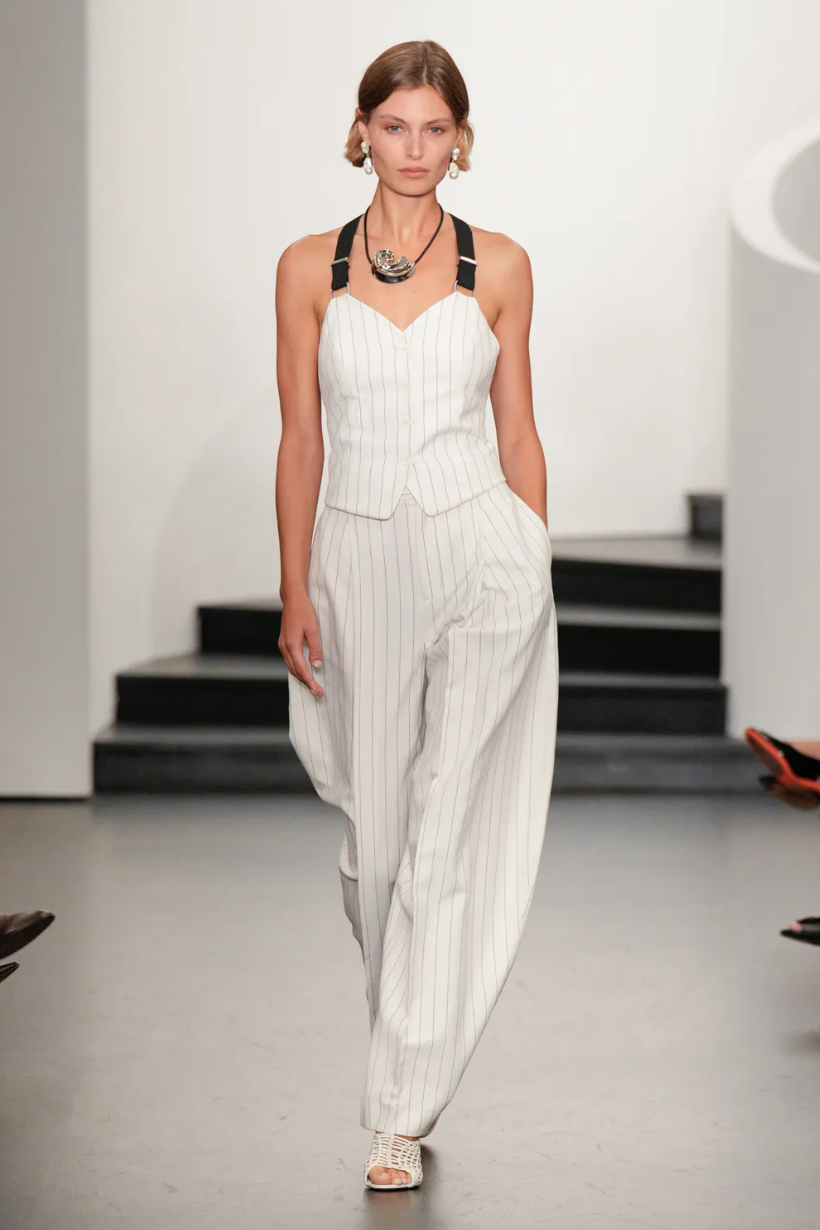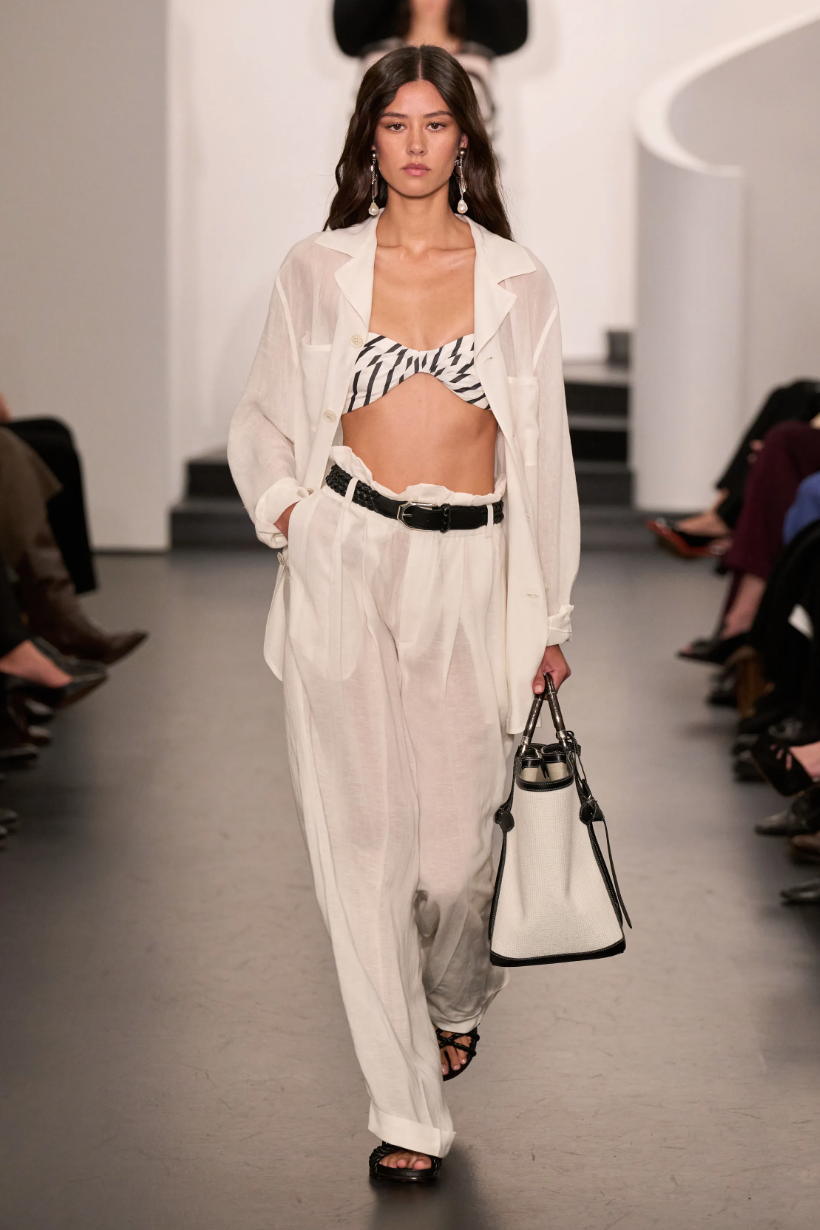 而在 2026 年春夏,Ralph Lauren 摒弃了秋季流行的奢华荷叶边和天鹅绒,转向清爽利落的服装,并以红、白、黑三色为主。与之前的系列一样,本季也在阳刚与柔美之间切换,正如 Ralph Lauren 在秀场笔记中写道的:「力量与性感」。许多剪裁合身的服装都以抹胸代替衬衫,而裤子的腰部则采用纱笼般的包裹式设计。
