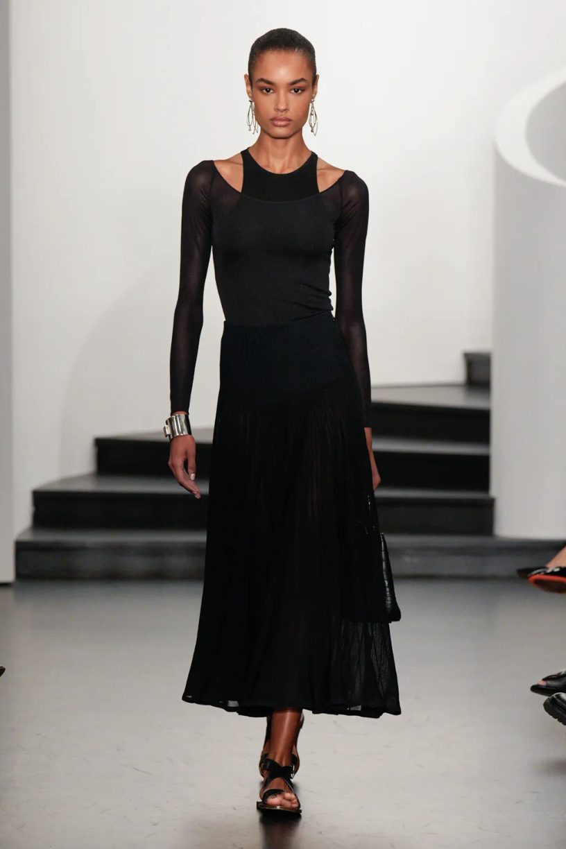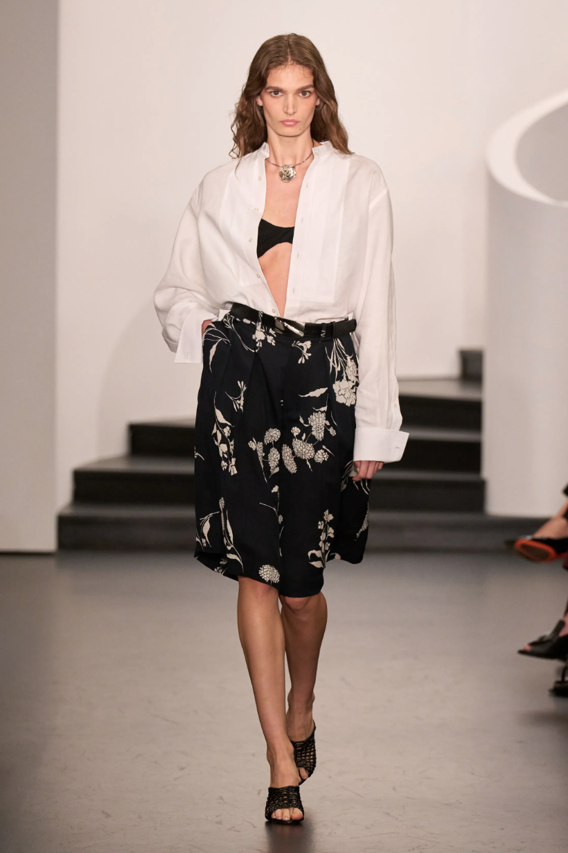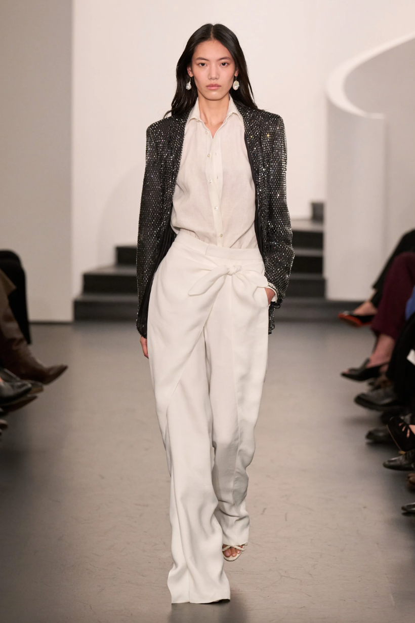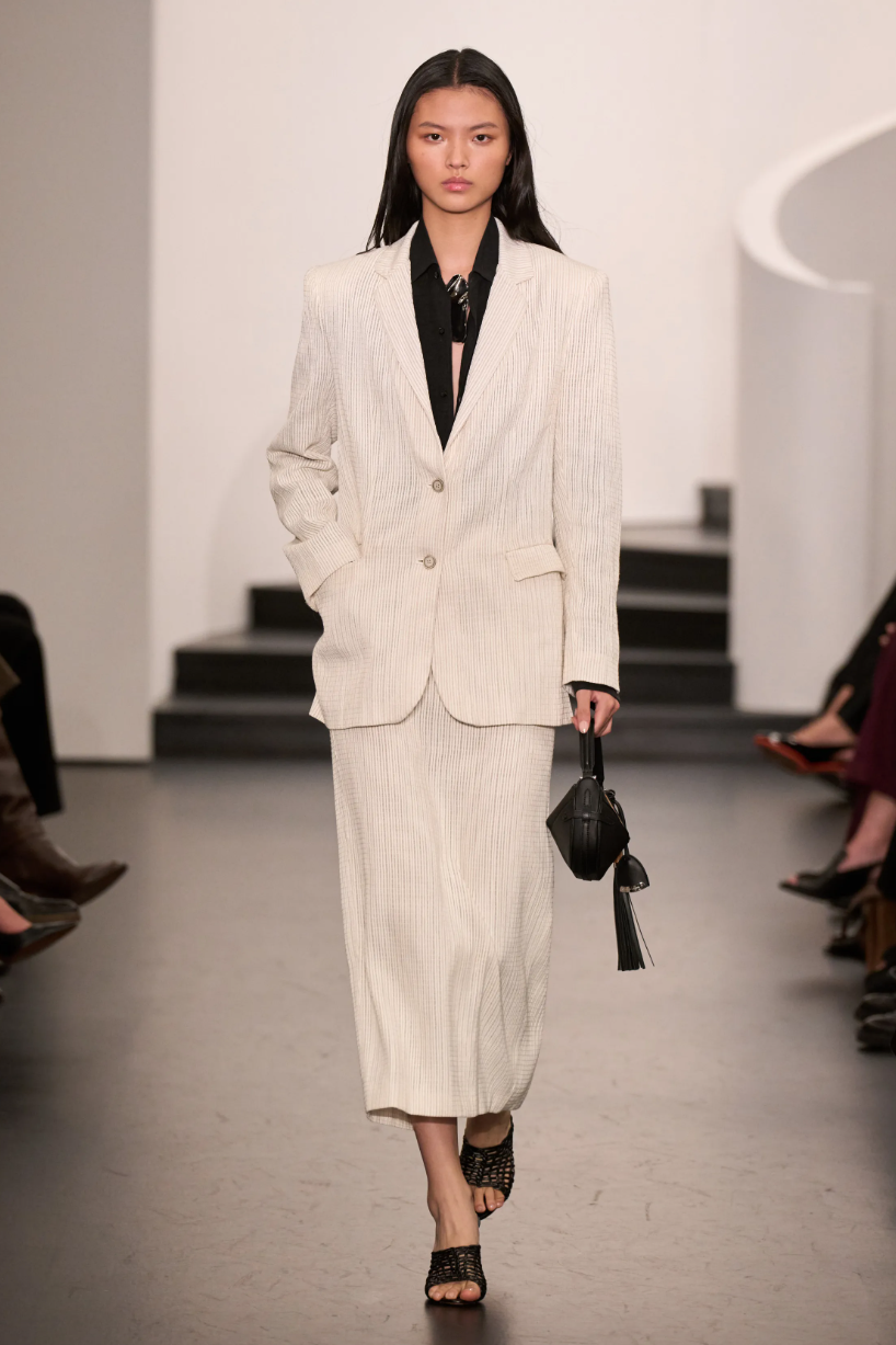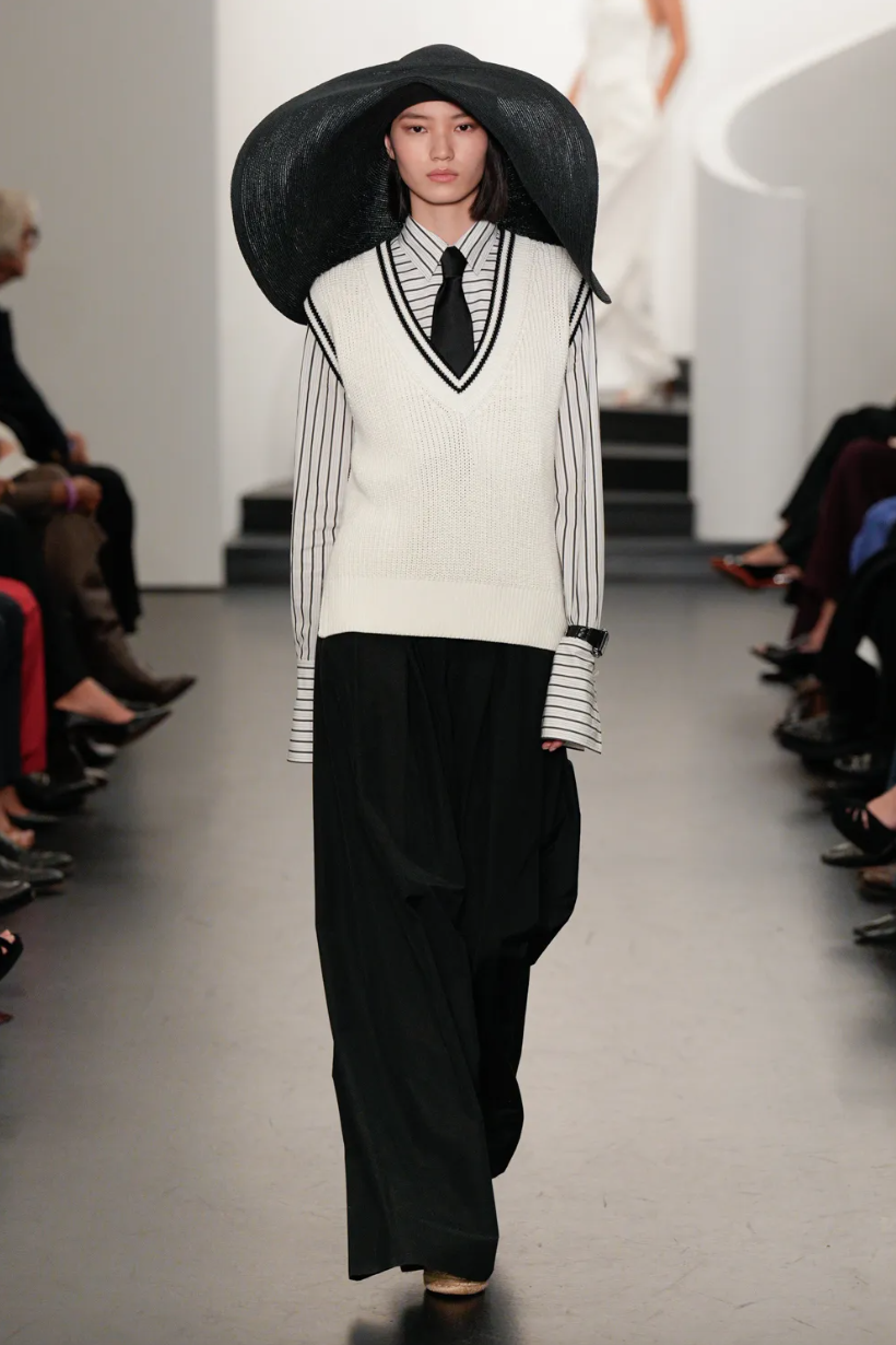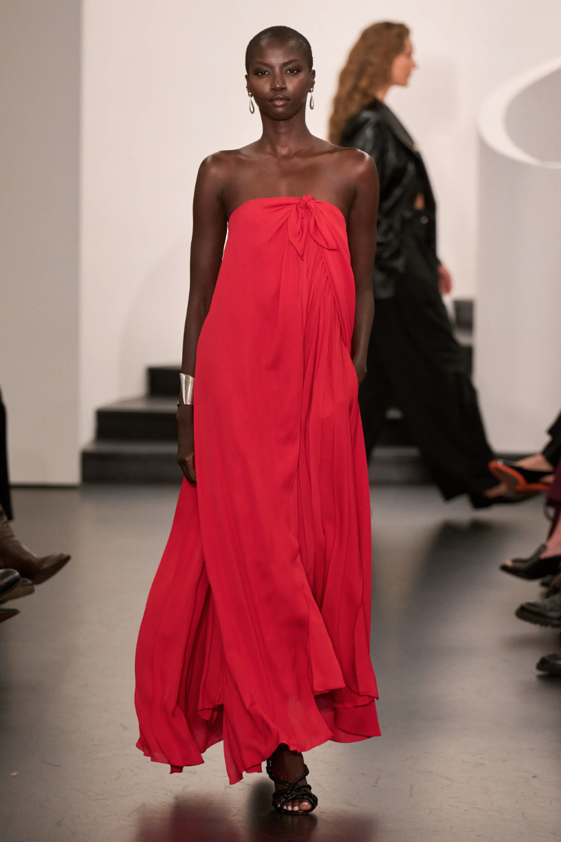 而在 2026 年春夏,Ralph Lauren 摒弃了秋季流行的奢华荷叶边和天鹅绒,转向清爽利落的服装,并以红、白、黑三色为主。与之前的系列一样,本季也在阳刚与柔美之间切换,正如 Ralph Lauren 在秀场笔记中写道的:「力量与性感」。许多剪裁合身的服装都以抹胸代替衬衫,而裤子的腰部则采用纱笼般的包裹式设计。