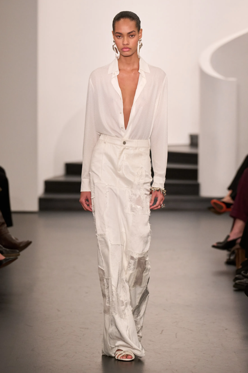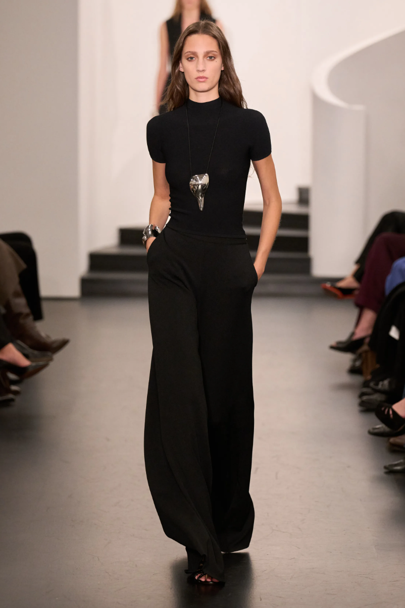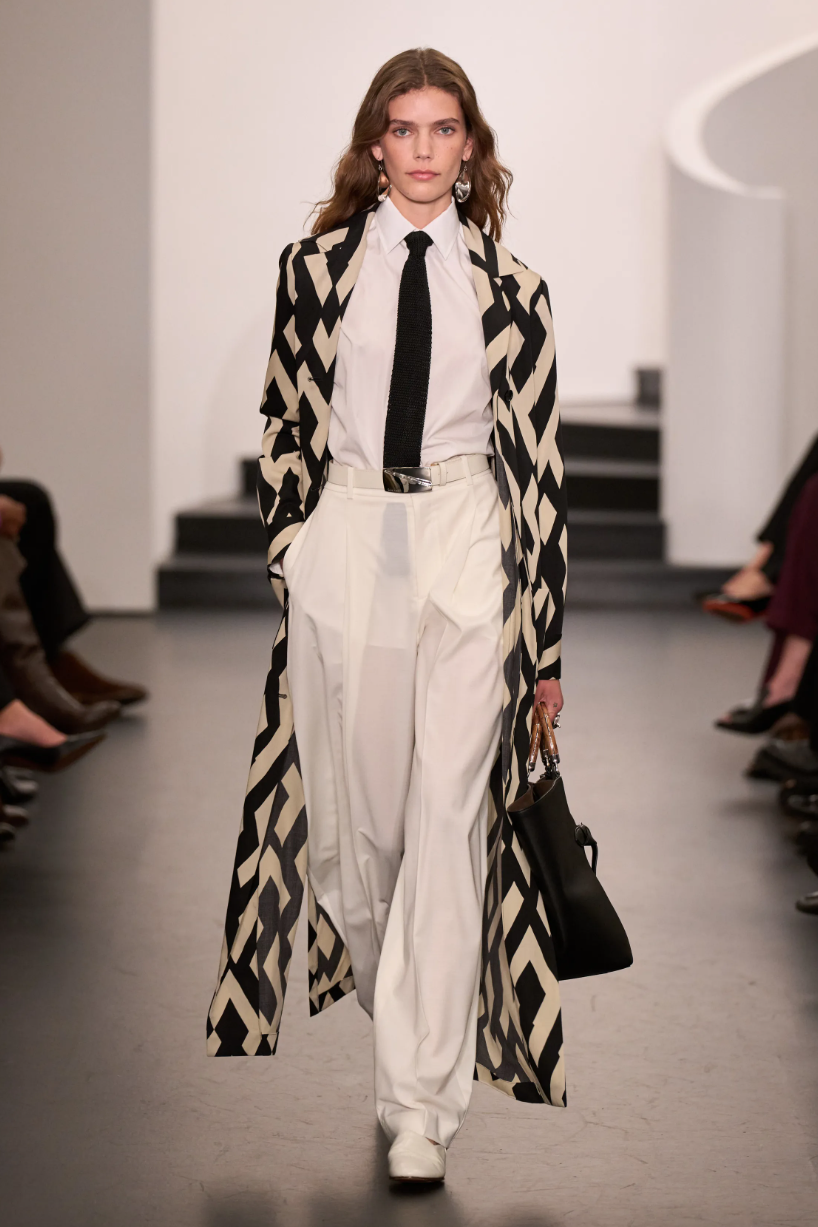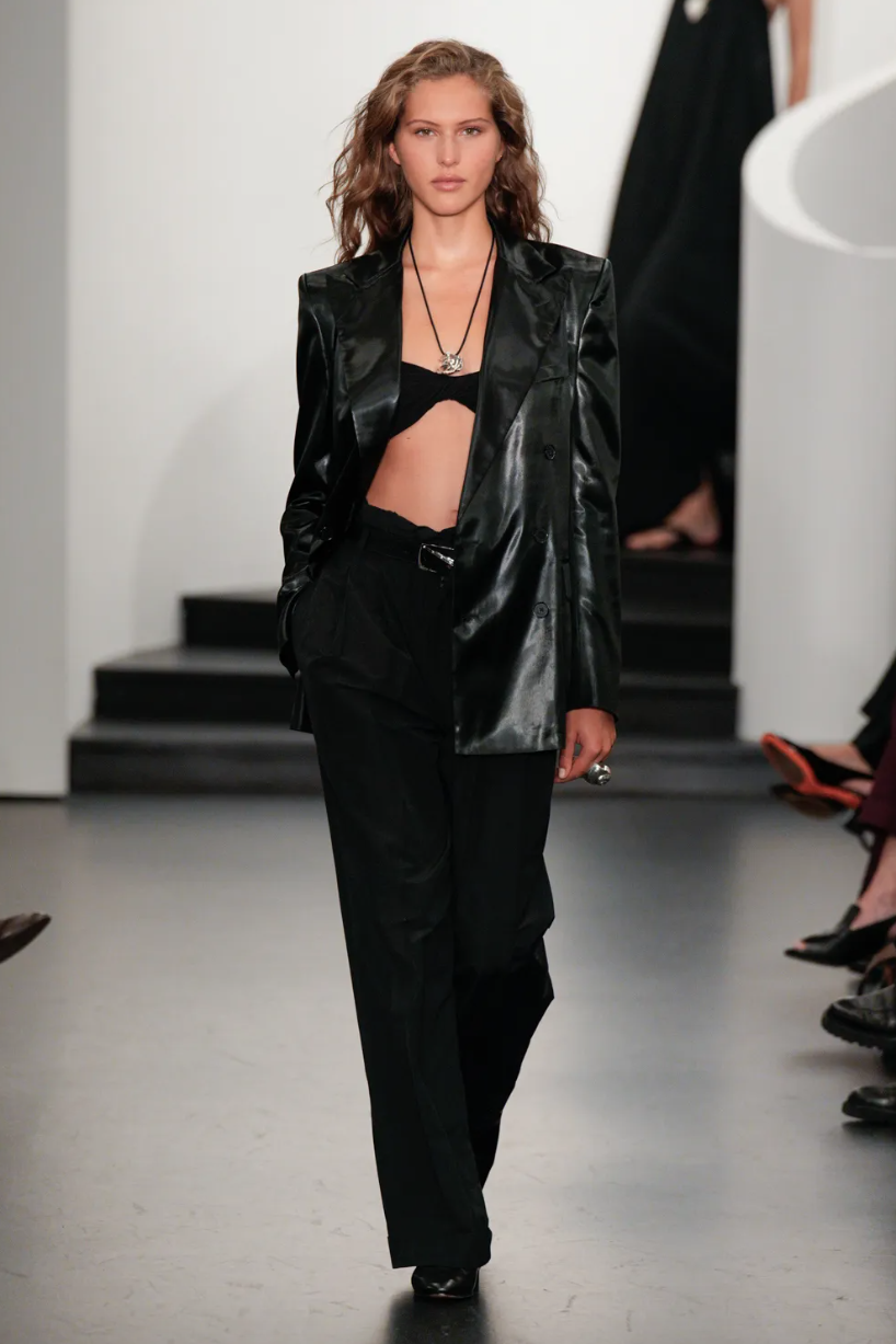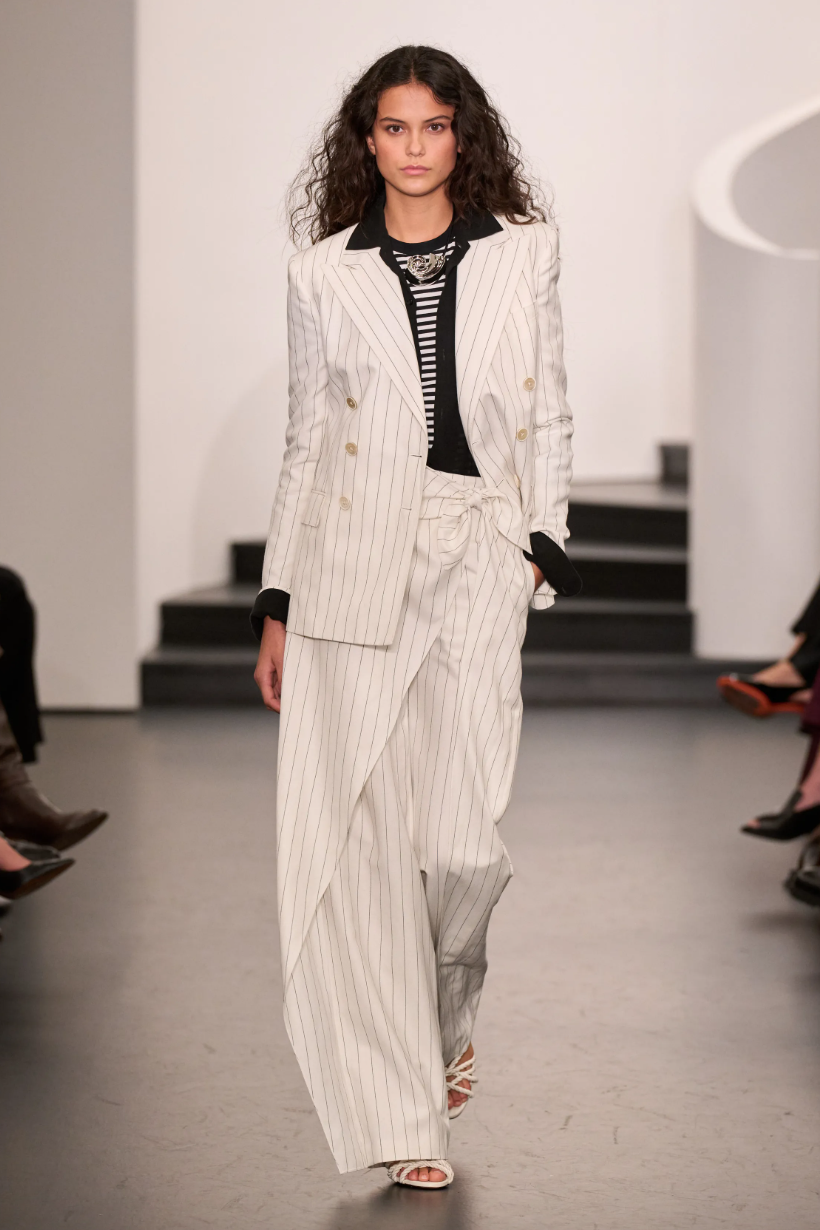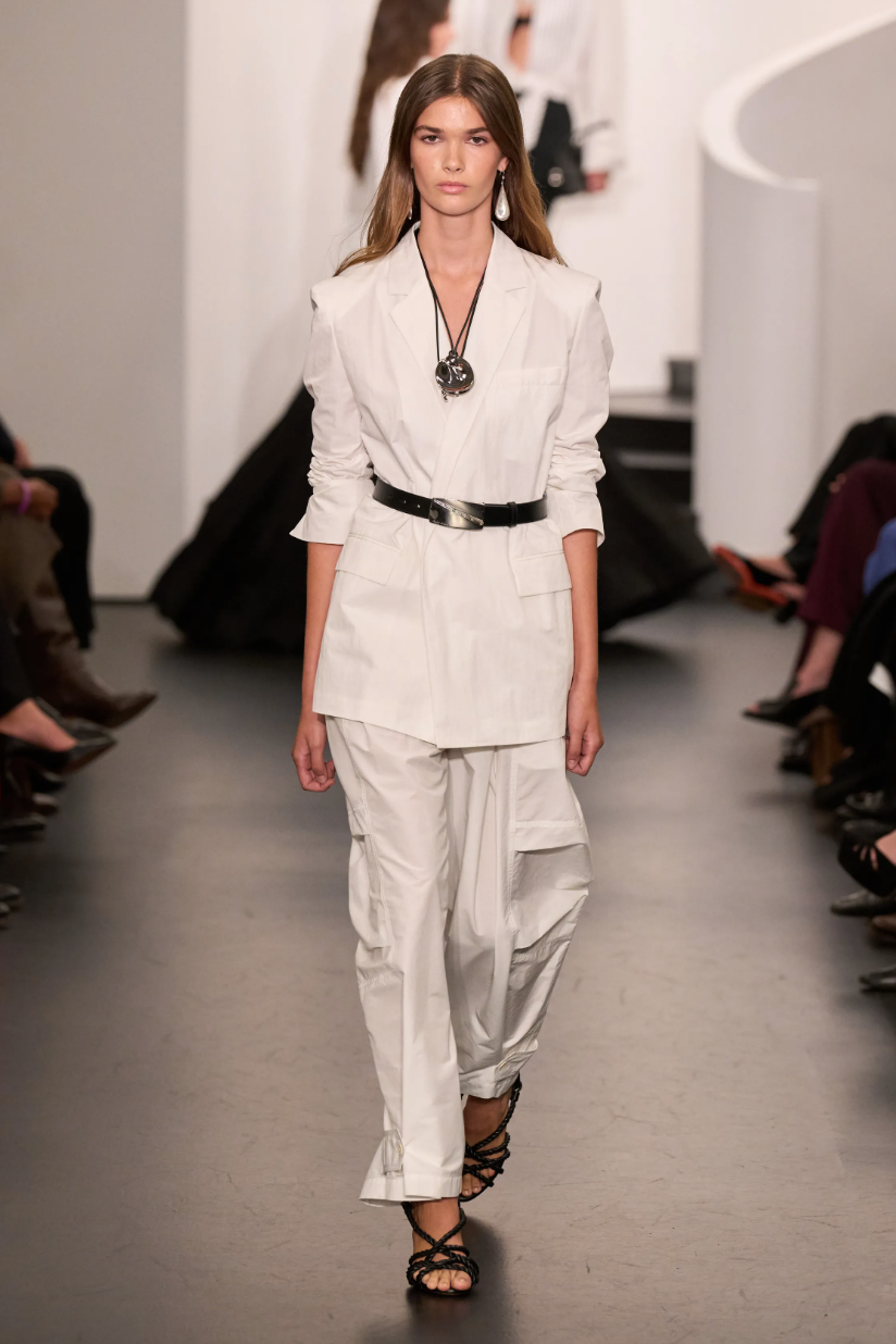 而在 2026 年春夏,Ralph Lauren 摒弃了秋季流行的奢华荷叶边和天鹅绒,转向清爽利落的服装,并以红、白、黑三色为主。与之前的系列一样,本季也在阳刚与柔美之间切换,正如 Ralph Lauren 在秀场笔记中写道的:「力量与性感」。许多剪裁合身的服装都以抹胸代替衬衫,而裤子的腰部则采用纱笼般的包裹式设计。