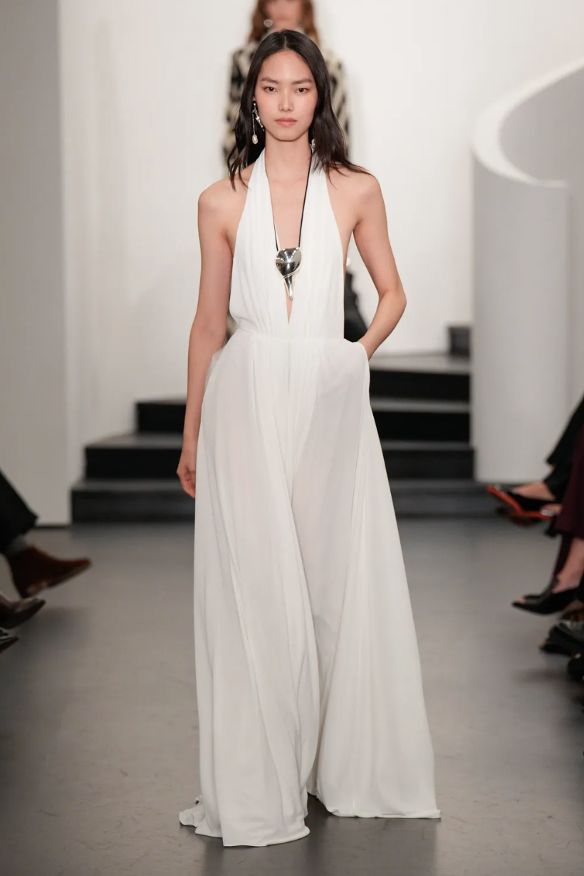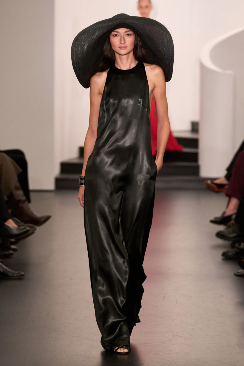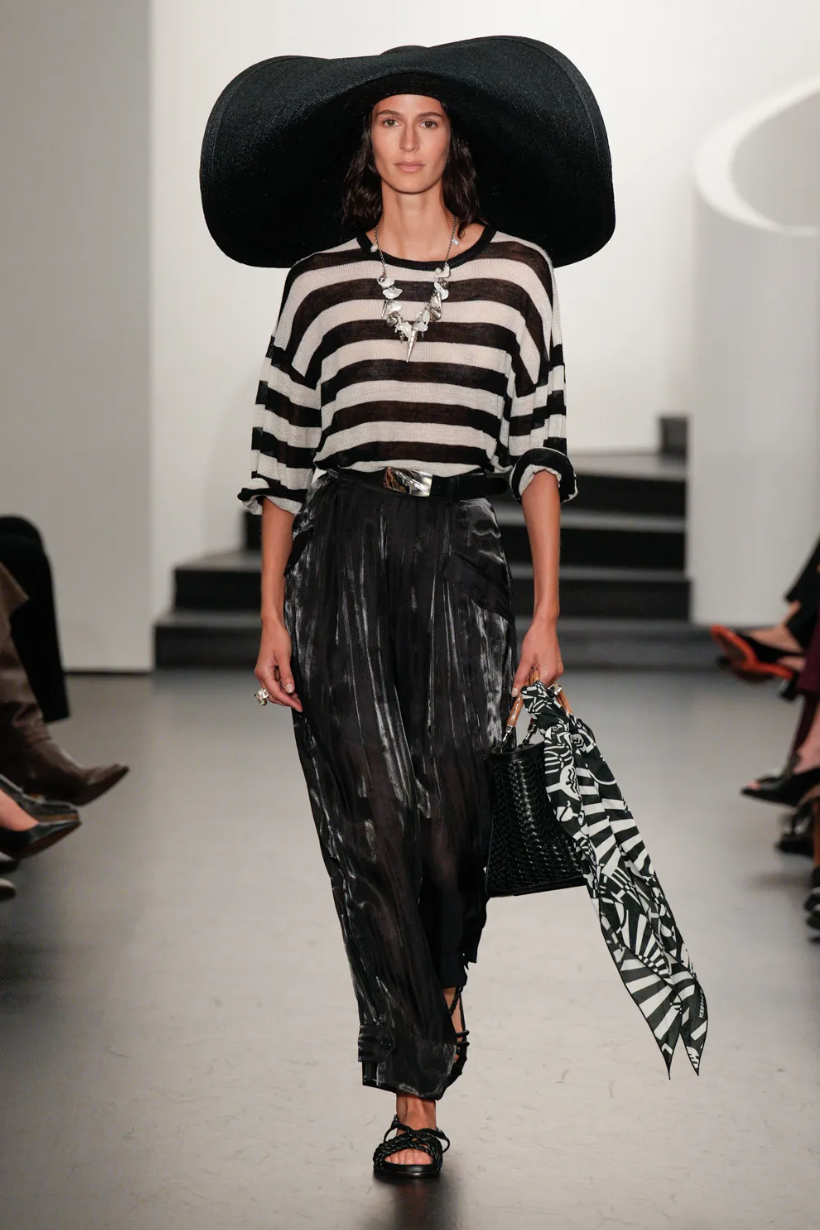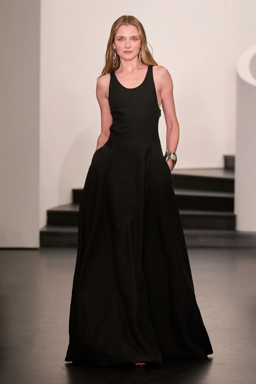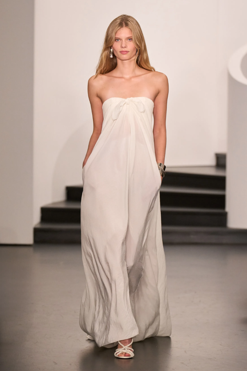 此外,深红色草帽、卡巴纳条纹衫以及丝绳上的银色贝壳吊坠等元素营造出了一种海滨氛围。这种感觉一直延续到了晚装——例如低背长衬裙。其他连衣裙则闪耀着都市夜生活之光。整体造型简洁、极简,甚至略显内敛,但这一切都与上一季一样,依然坚定地体现着 Ralph Lauren 的风格。