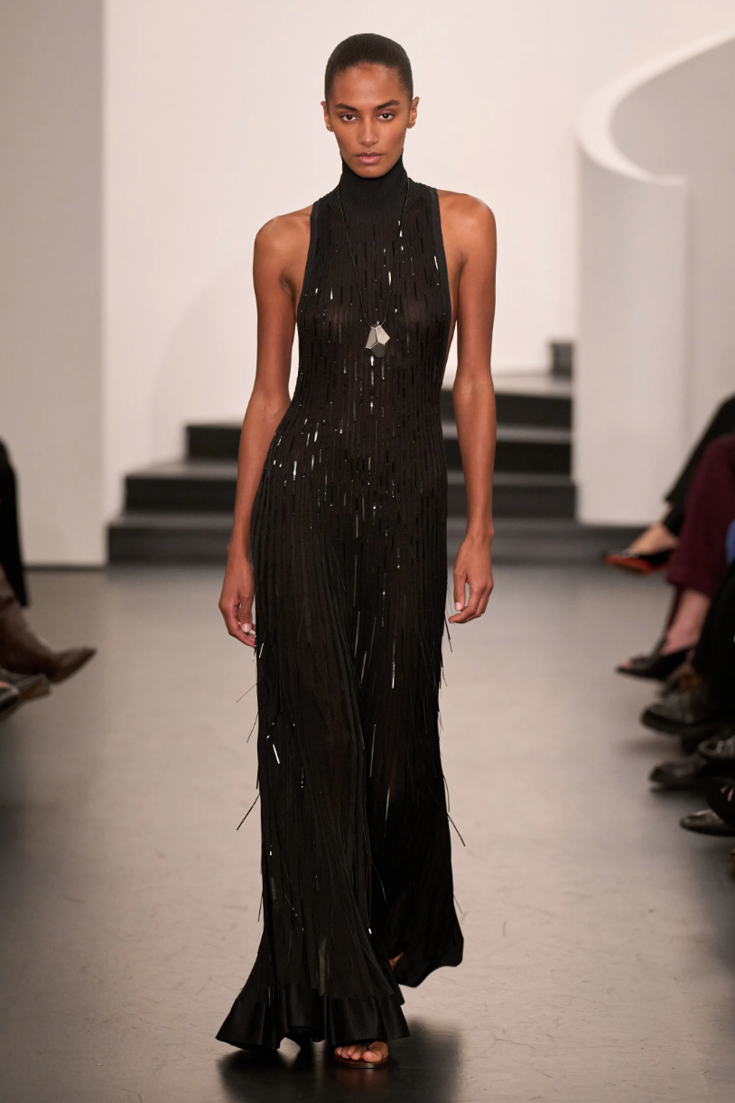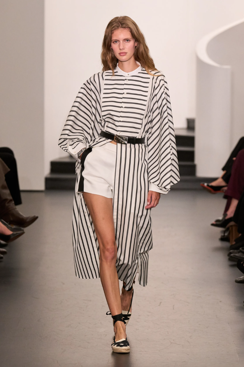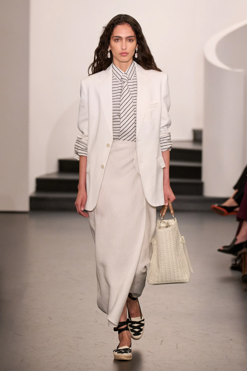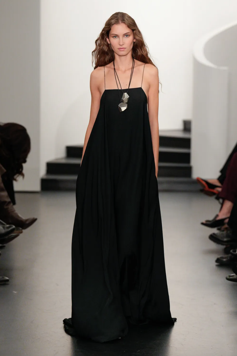 此外,深红色草帽、卡巴纳条纹衫以及丝绳上的银色贝壳吊坠等元素营造出了一种海滨氛围。这种感觉一直延续到了晚装——例如低背长衬裙。其他连衣裙则闪耀着都市夜生活之光。整体造型简洁、极简,甚至略显内敛,但这一切都与上一季一样,依然坚定地体现着 Ralph Lauren 的风格。