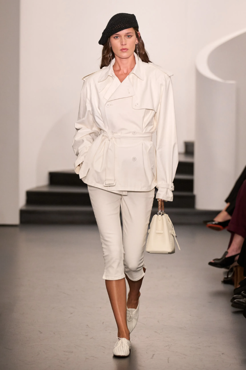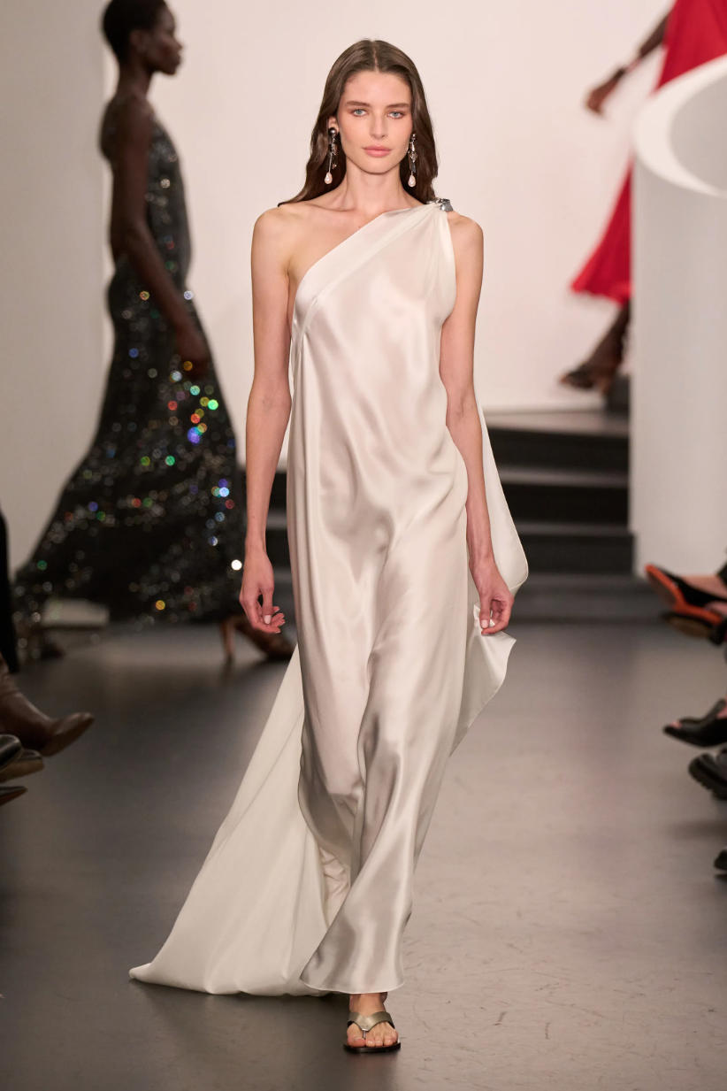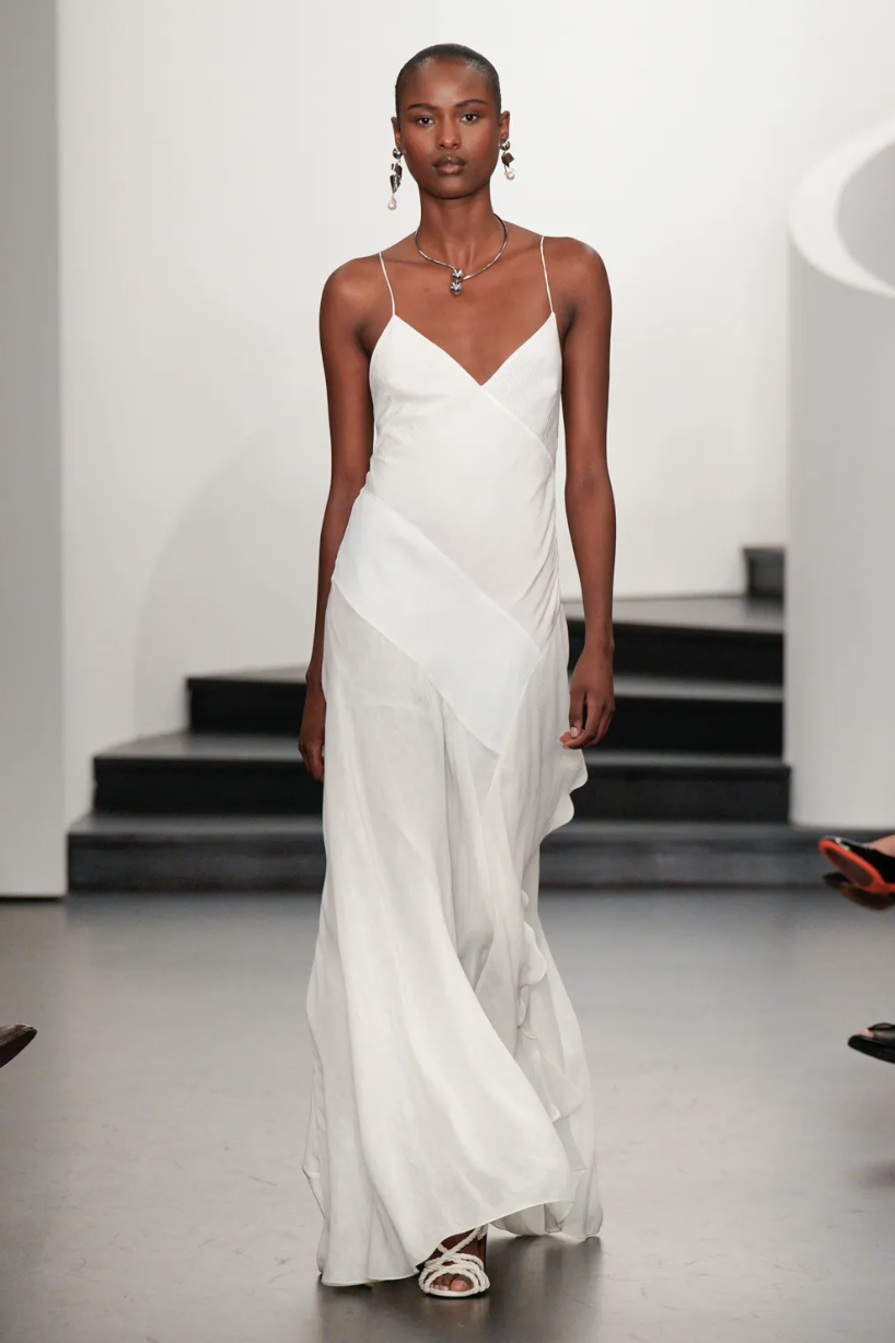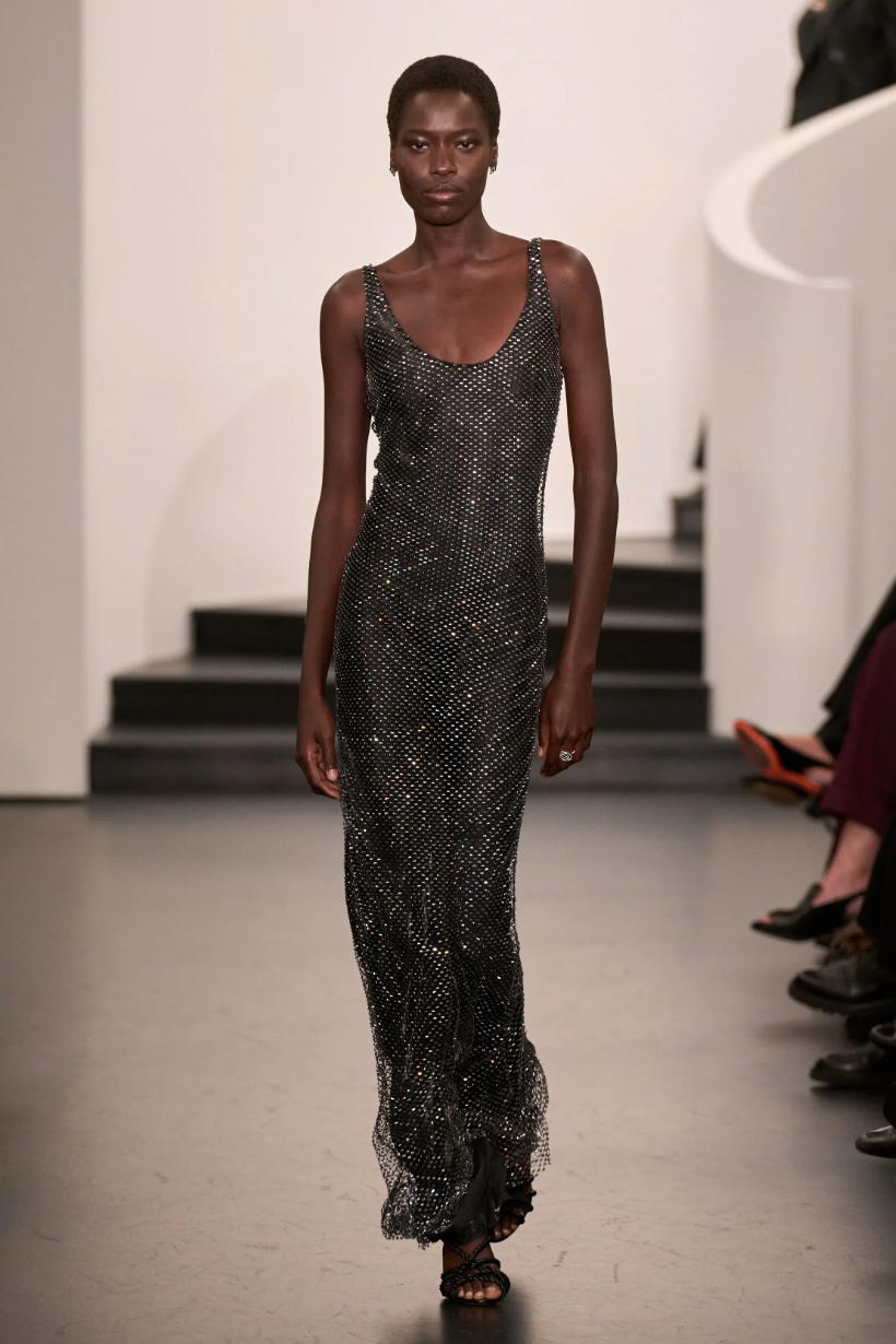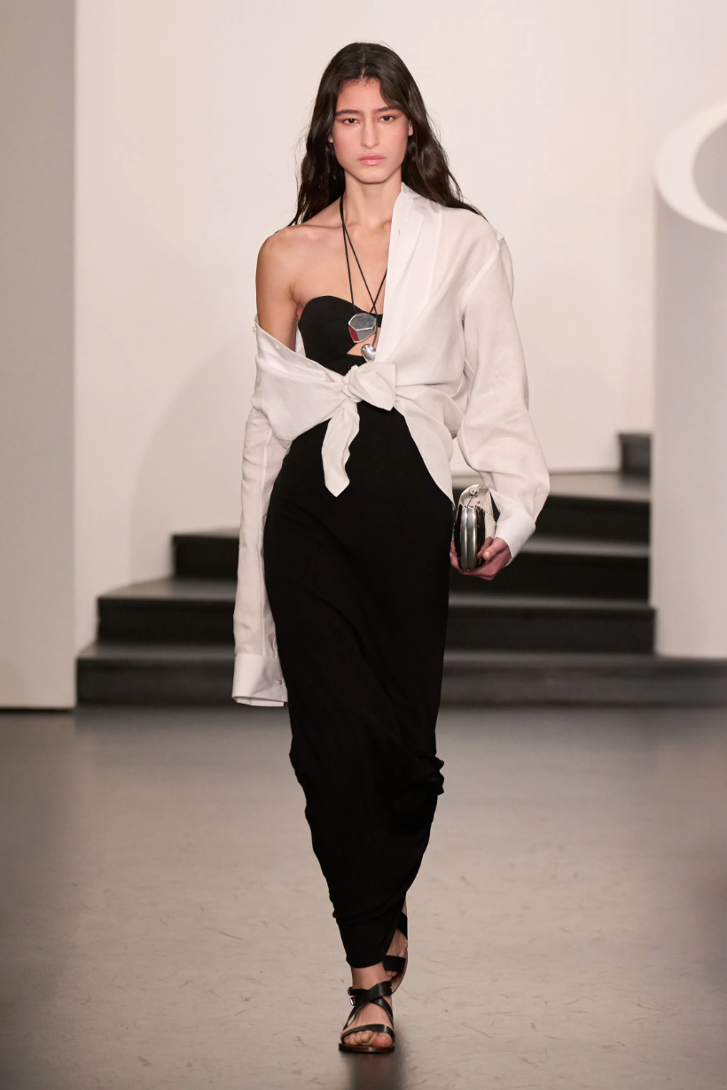 此外,深红色草帽、卡巴纳条纹衫以及丝绳上的银色贝壳吊坠等元素营造出了一种海滨氛围。这种感觉一直延续到了晚装——例如低背长衬裙。其他连衣裙则闪耀着都市夜生活之光。整体造型简洁、极简,甚至略显内敛,但这一切都与上一季一样,依然坚定地体现着 Ralph Lauren 的风格。