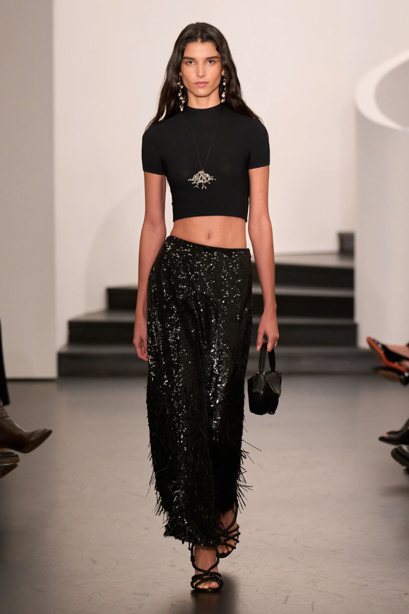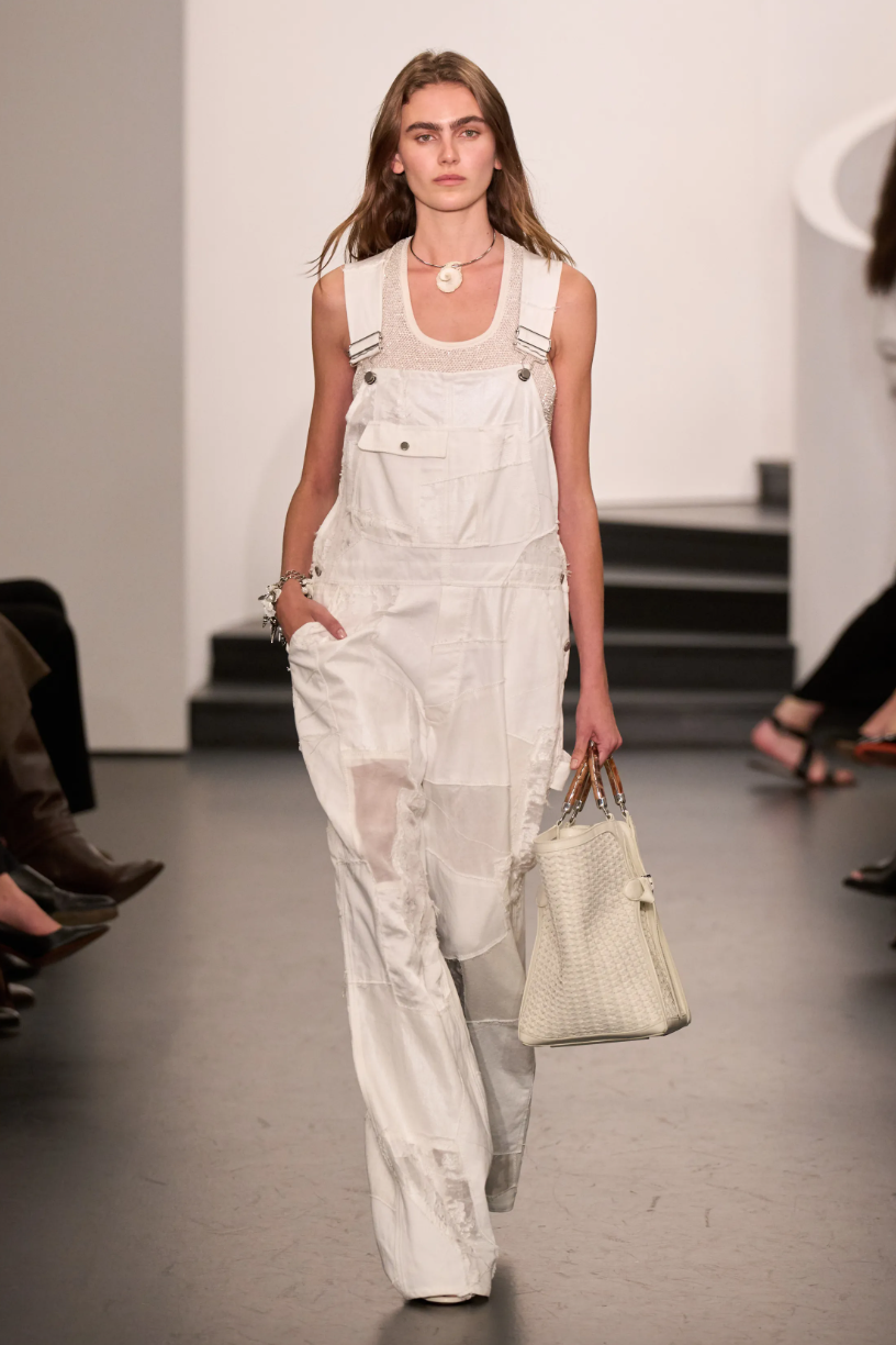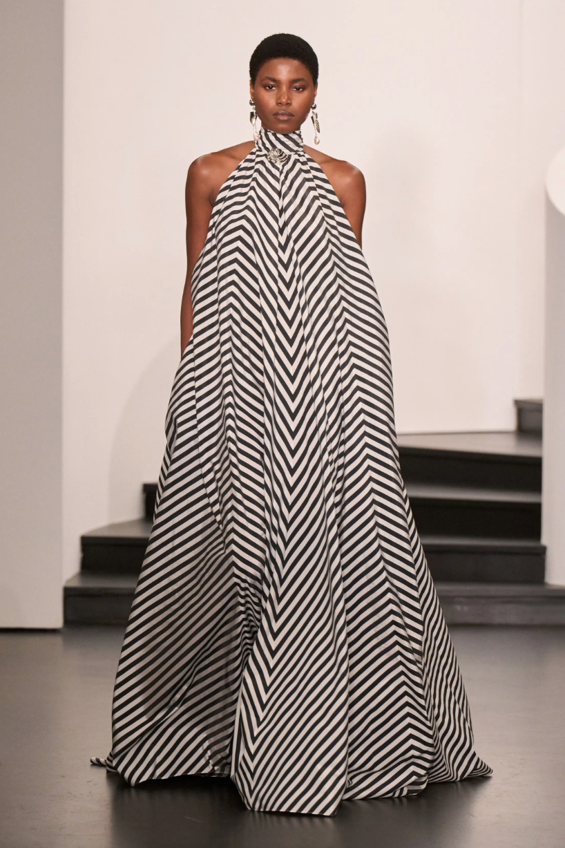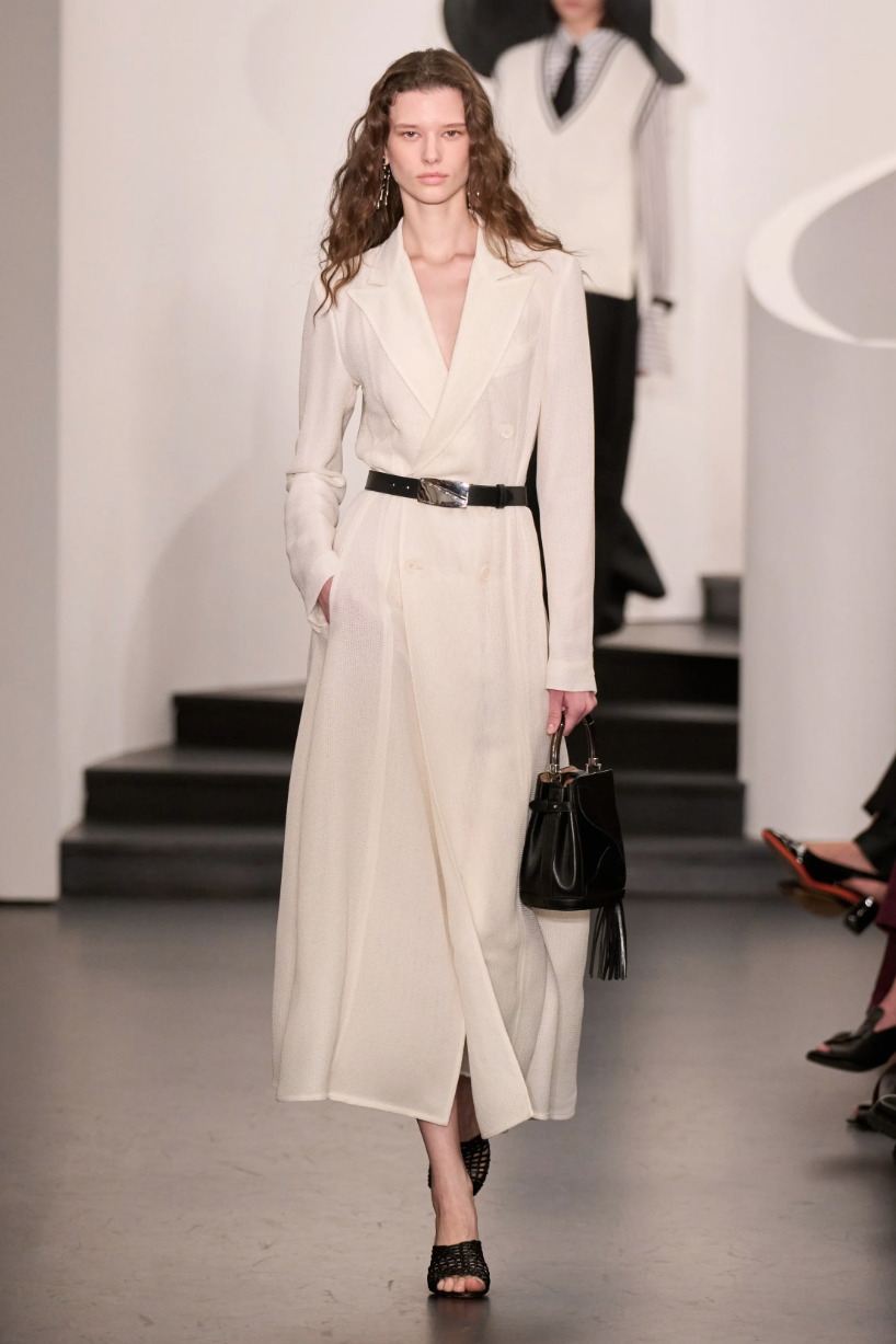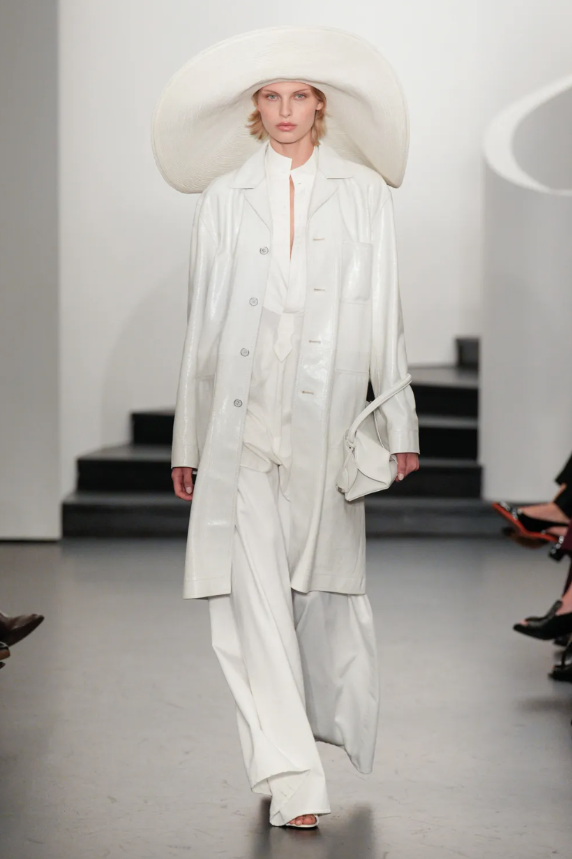 此外,深红色草帽、卡巴纳条纹衫以及丝绳上的银色贝壳吊坠等元素营造出了一种海滨氛围。这种感觉一直延续到了晚装——例如低背长衬裙。其他连衣裙则闪耀着都市夜生活之光。整体造型简洁、极简,甚至略显内敛,但这一切都与上一季一样,依然坚定地体现着 Ralph Lauren 的风格。