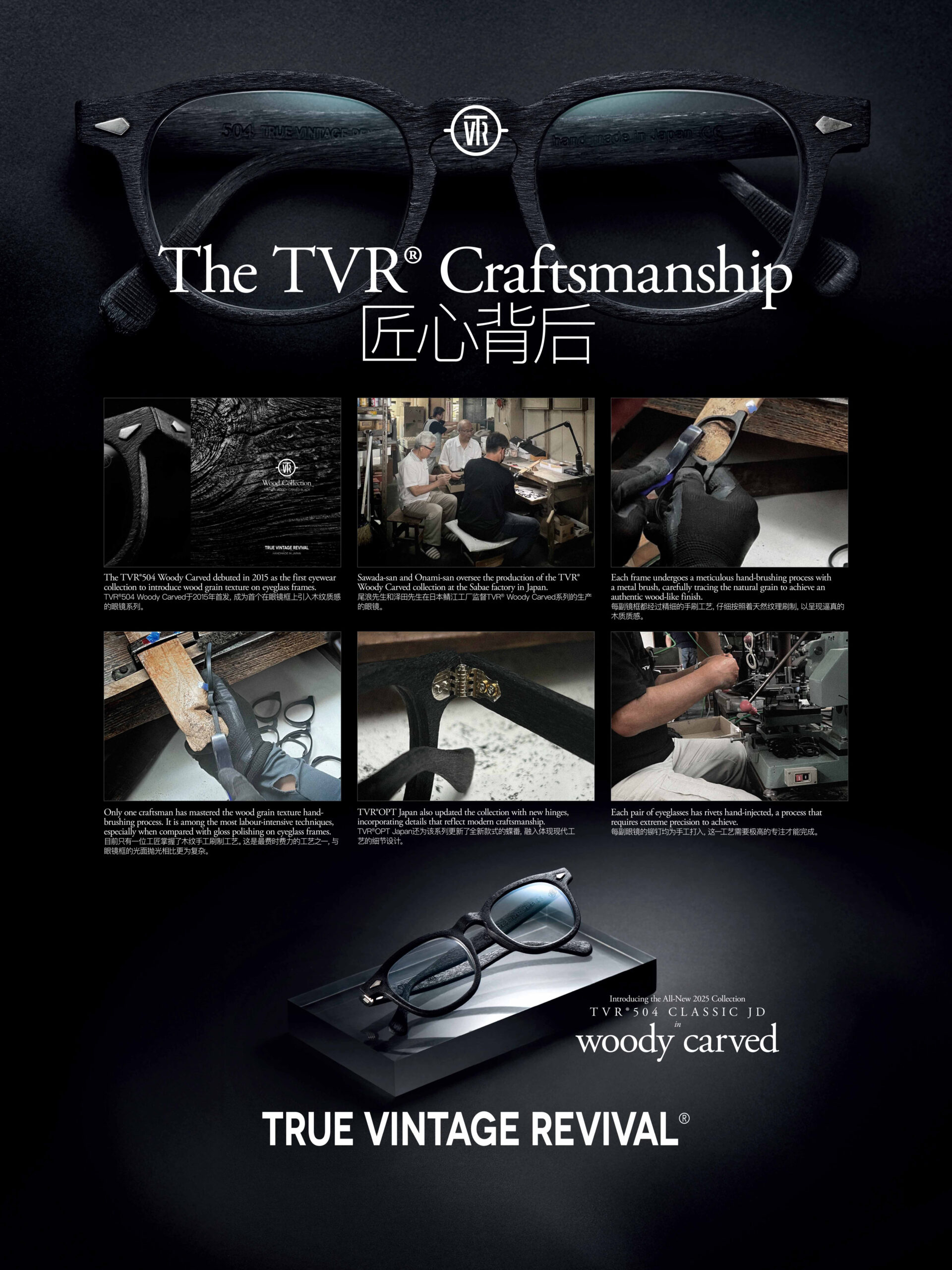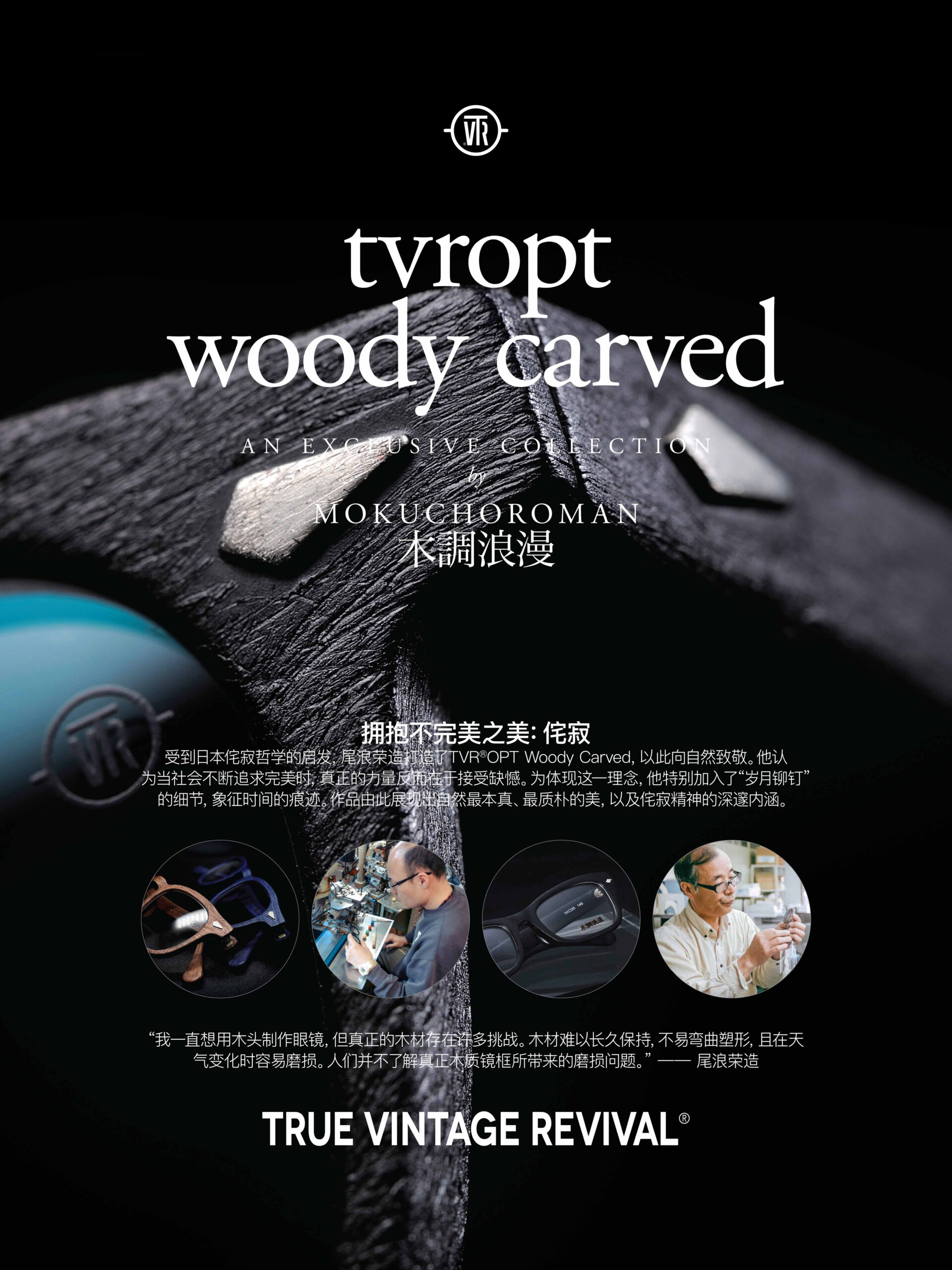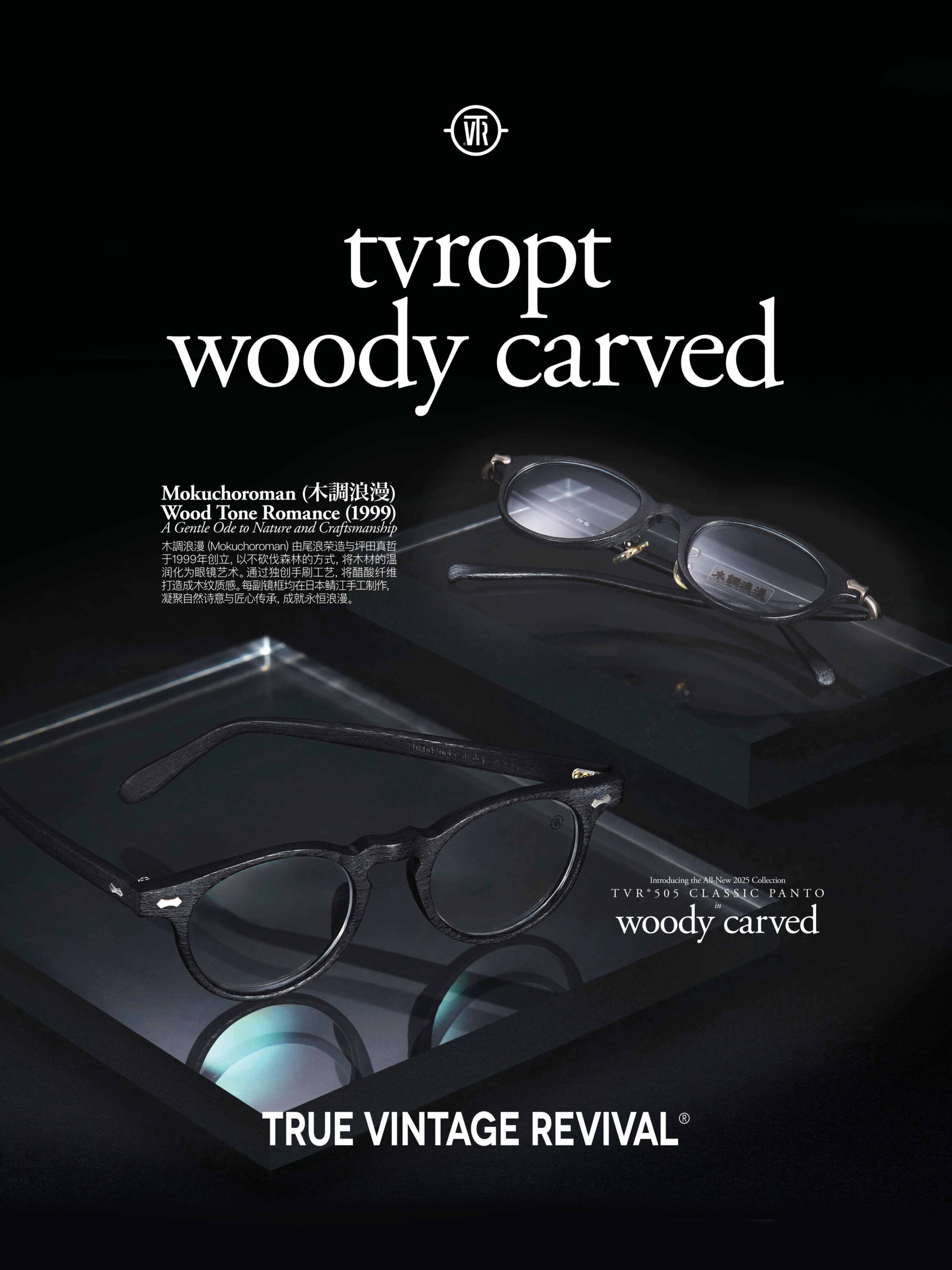TVR®OPT 社长尾浪荣造先生于今秋再访北京,隆重带回二十六年前的传奇设计——Woody Carved 系列。该技术由尾浪社长于 1999 年创立并取得专利,以独有手工刷染木纹的制镜技术,将木头的纹理与质感重现于醋酸材料或赛璐珞、钛合金上。由于初代匠人退休,该设计一度停产。自 2020 年起,历经五年以上努力,传奇设计终得重现,每日产量不超过 20 副,工艺独步全球。