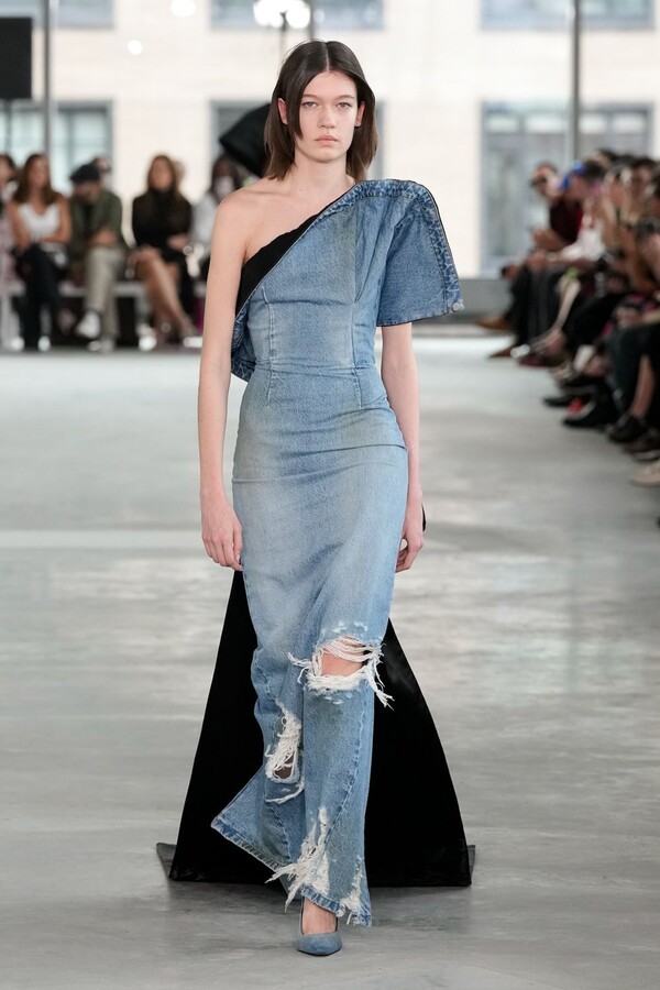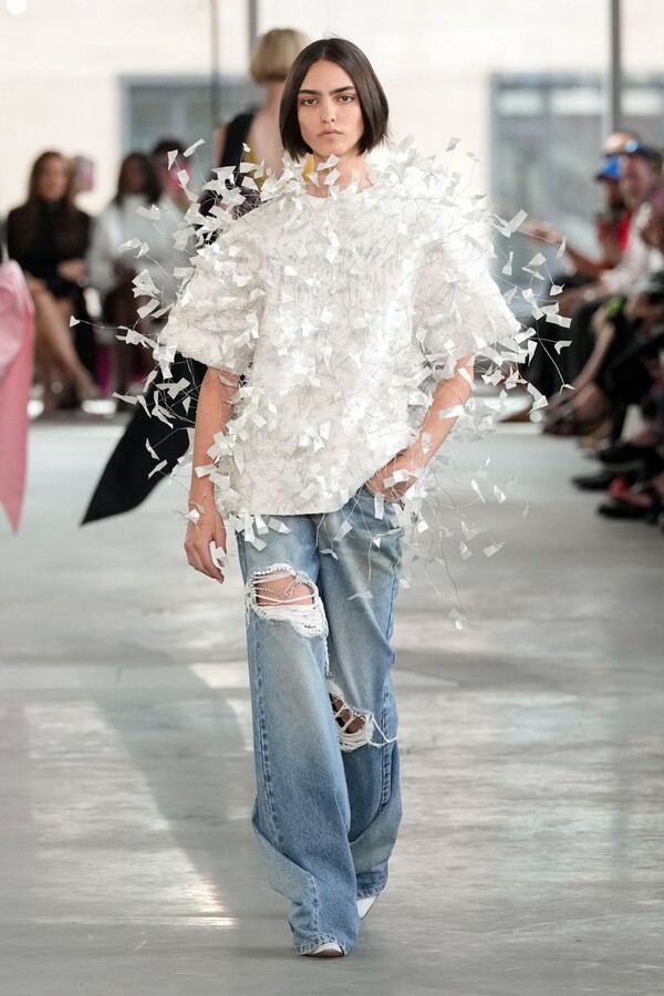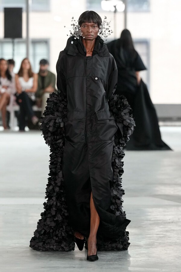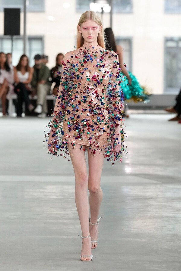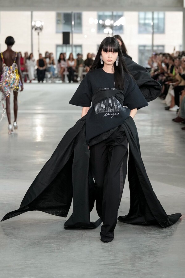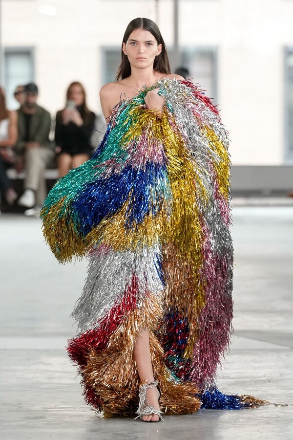 其他亮点包括 Nicholas Aburn 对剪裁的全新诠释——醒目牛仔裤搭配超大西装外套,海军蓝缎面连帽衫搭配燕尾服式长裙,腰带自然下垂。高定风格的 T 恤上印有纽约天际线图案,黑色长裤搭配以夸张的裙摆。另外,压轴的透明亮片连衣裙由一支印度团队耗时数周、手工打造,上面装饰着五彩缤纷的纸屑,并通过金属丝连接到每个亮片上。