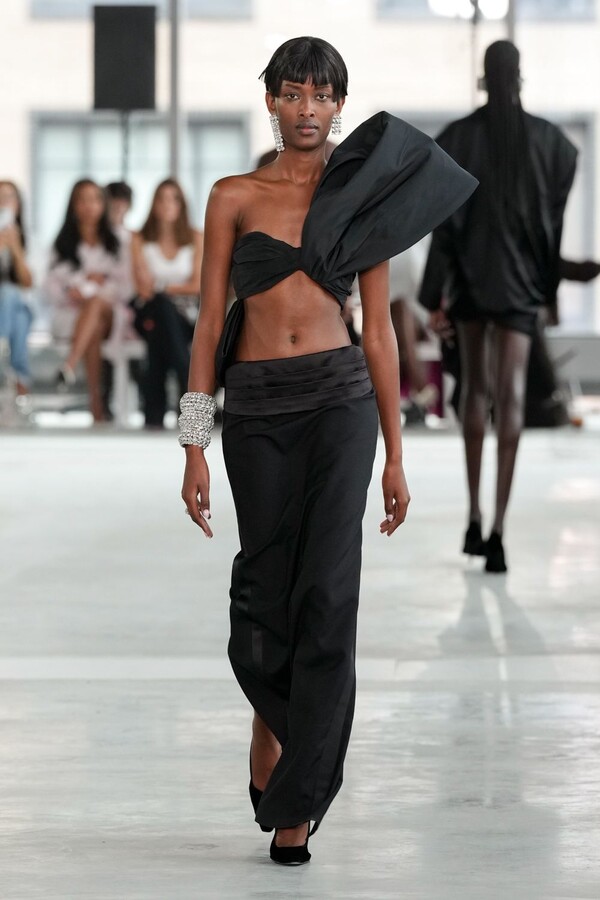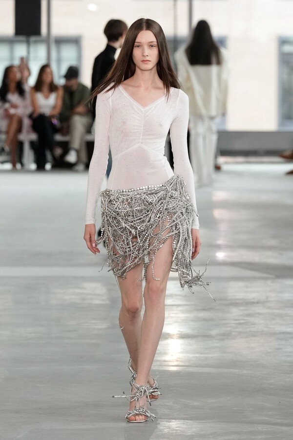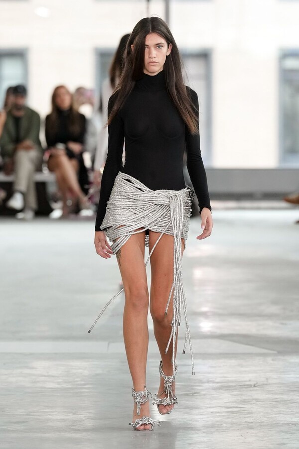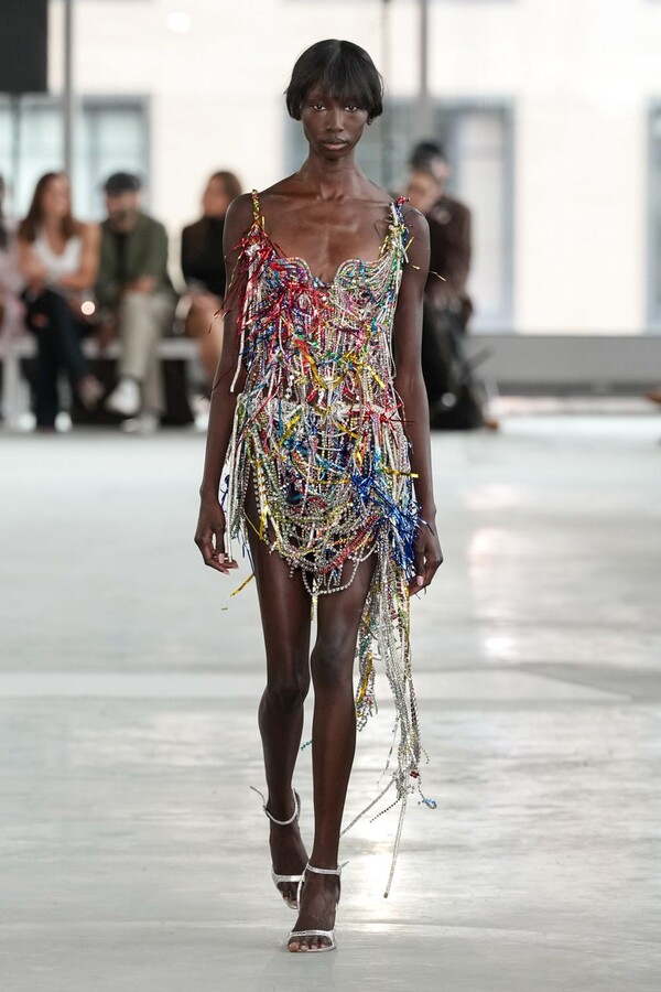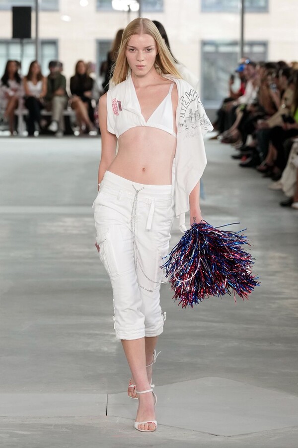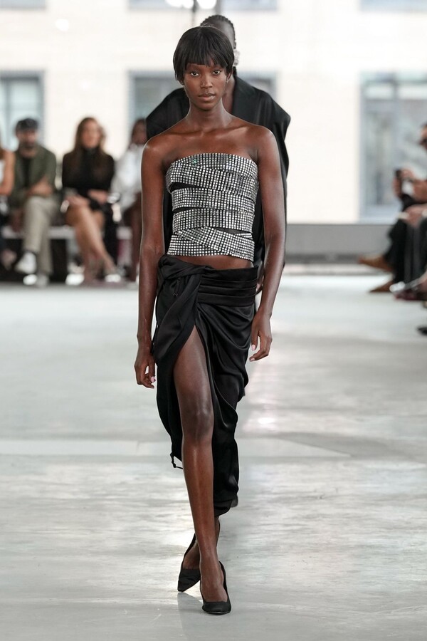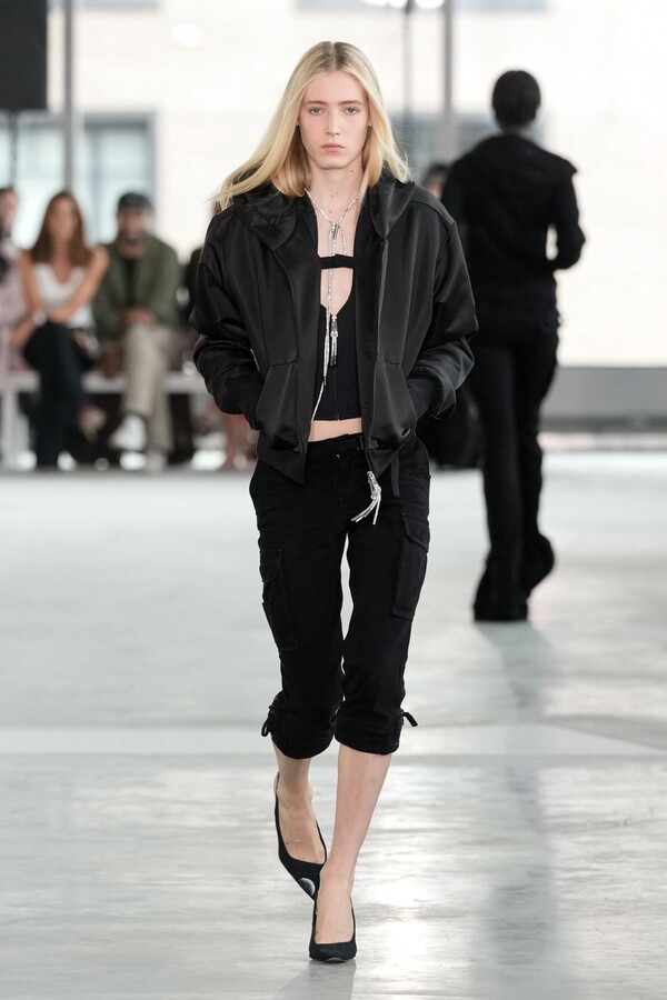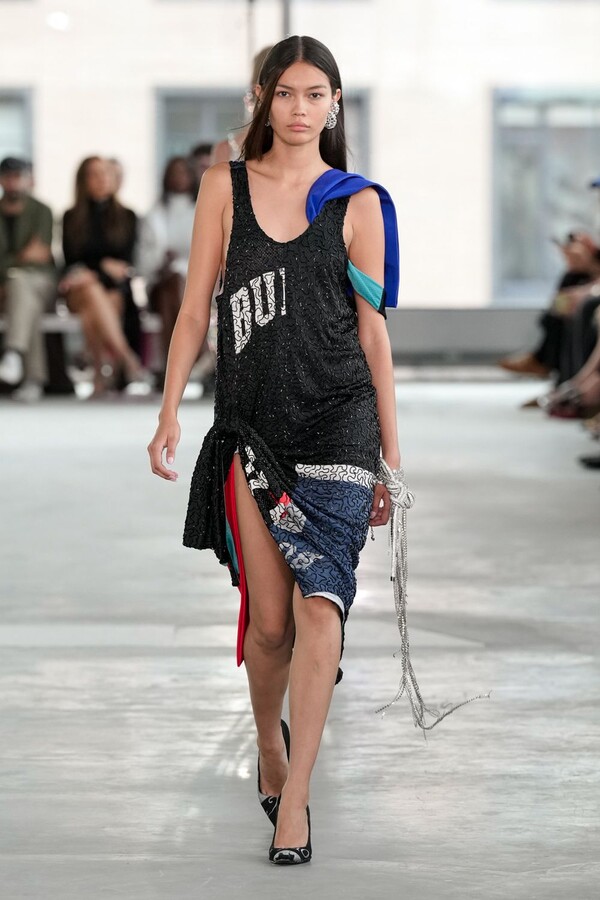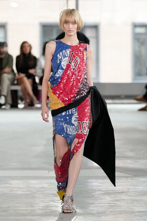 这场由 Emma Wyman 担任造型师的秀以一系列纯色造型开场:第一套是黑色缎面连帽衫搭配工装七分裤——这个带有 Y2K 风格的灵感自《欲望都市》中的Carrie,接着是喇叭裤、紧身夹克搭配夸张的水晶套索项链。本季也融入了更多运动元素,例如由篮球衫剪裁而成的亮片连衣裙、腰部饰有水晶绑带的超大号运动短裤。AREA 标志也进行了全新诠释。
