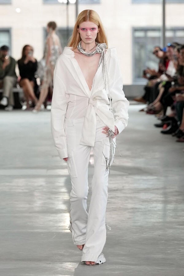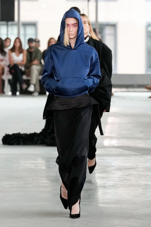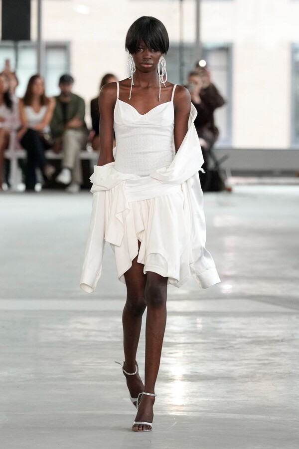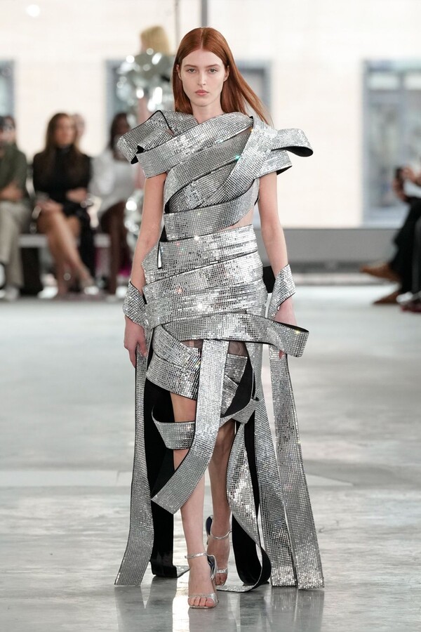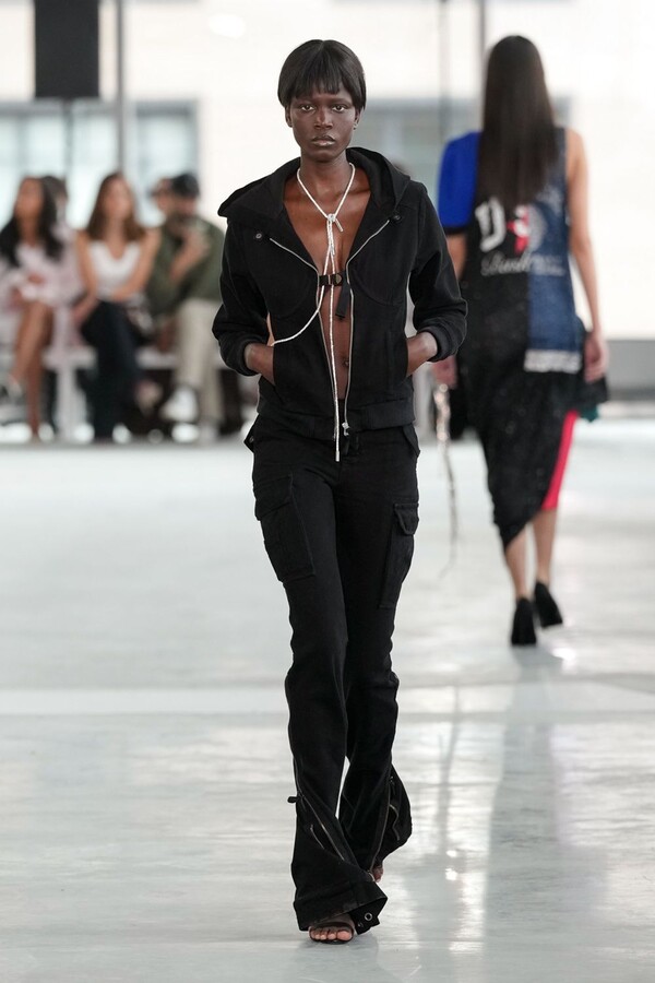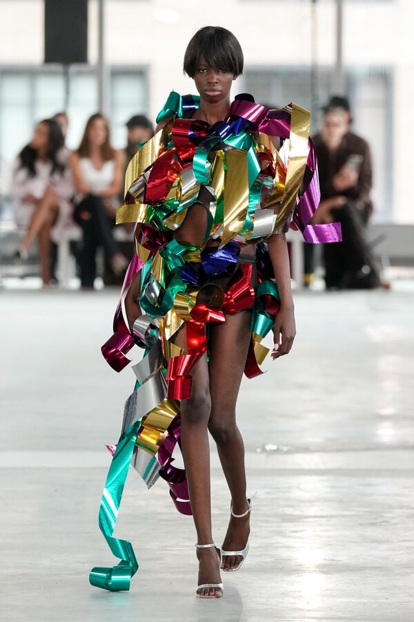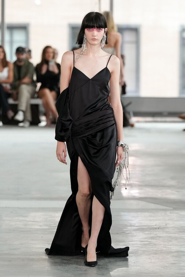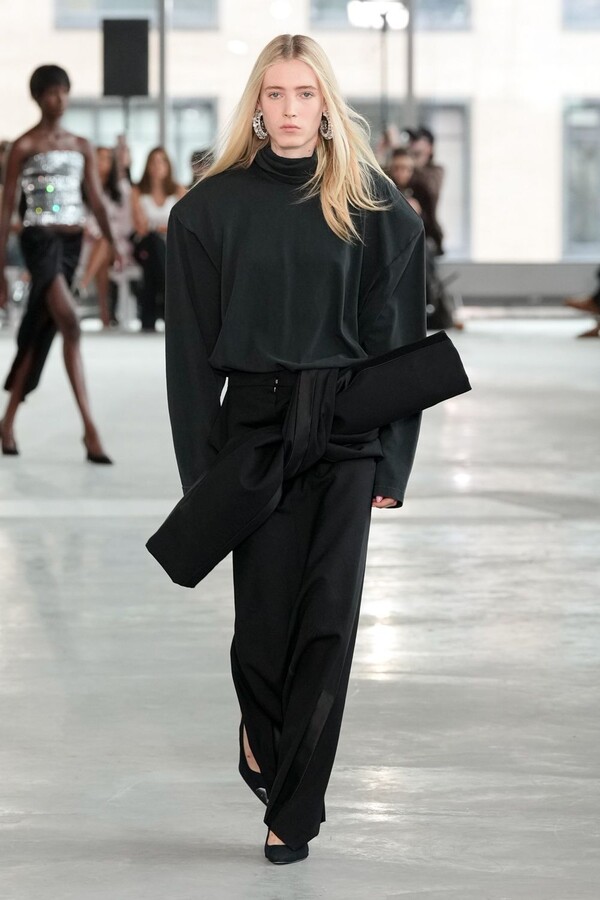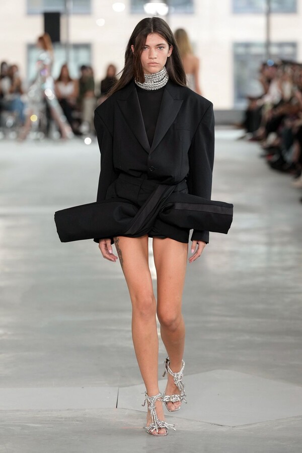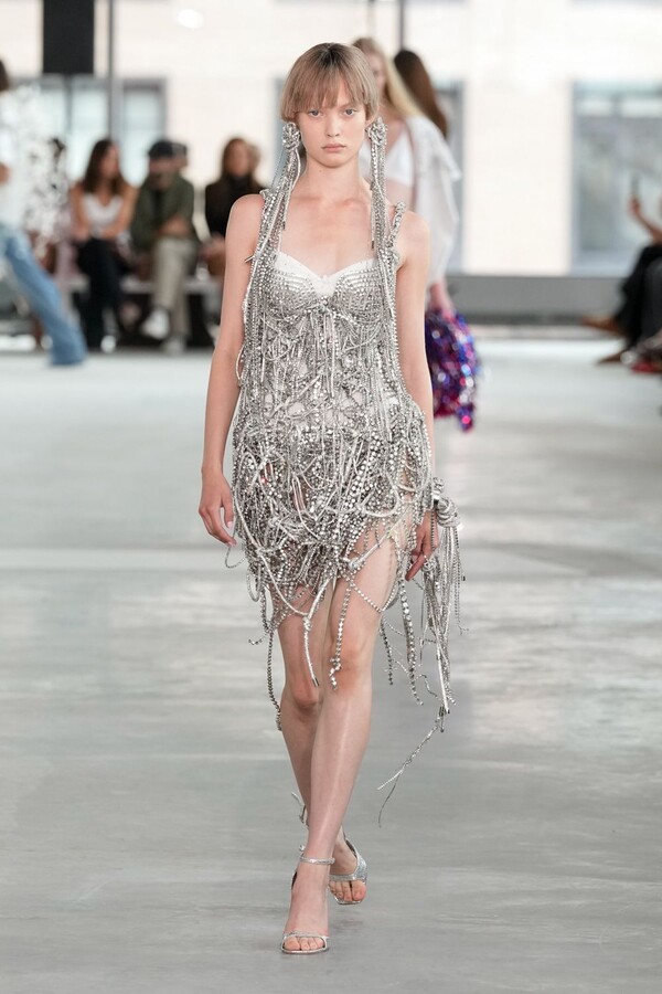 这场由 Emma Wyman 担任造型师的秀以一系列纯色造型开场:第一套是黑色缎面连帽衫搭配工装七分裤——这个带有 Y2K 风格的灵感自《欲望都市》中的Carrie,接着是喇叭裤、紧身夹克搭配夸张的水晶套索项链。本季也融入了更多运动元素,例如由篮球衫剪裁而成的亮片连衣裙、腰部饰有水晶绑带的超大号运动短裤。AREA 标志也进行了全新诠释。