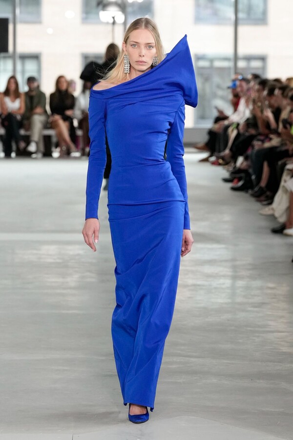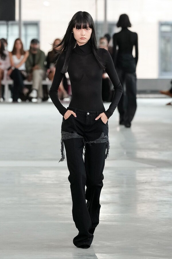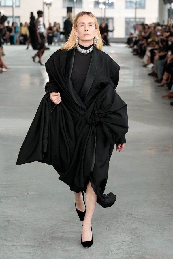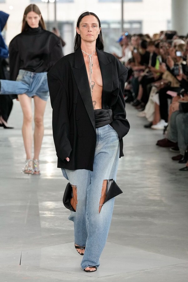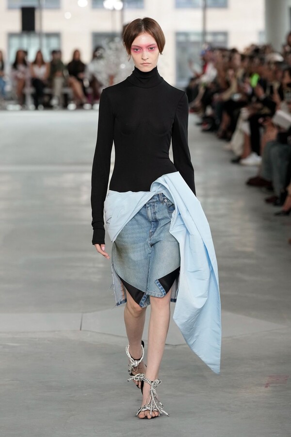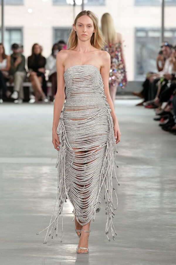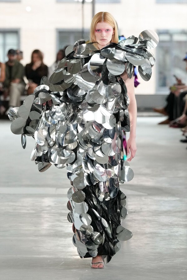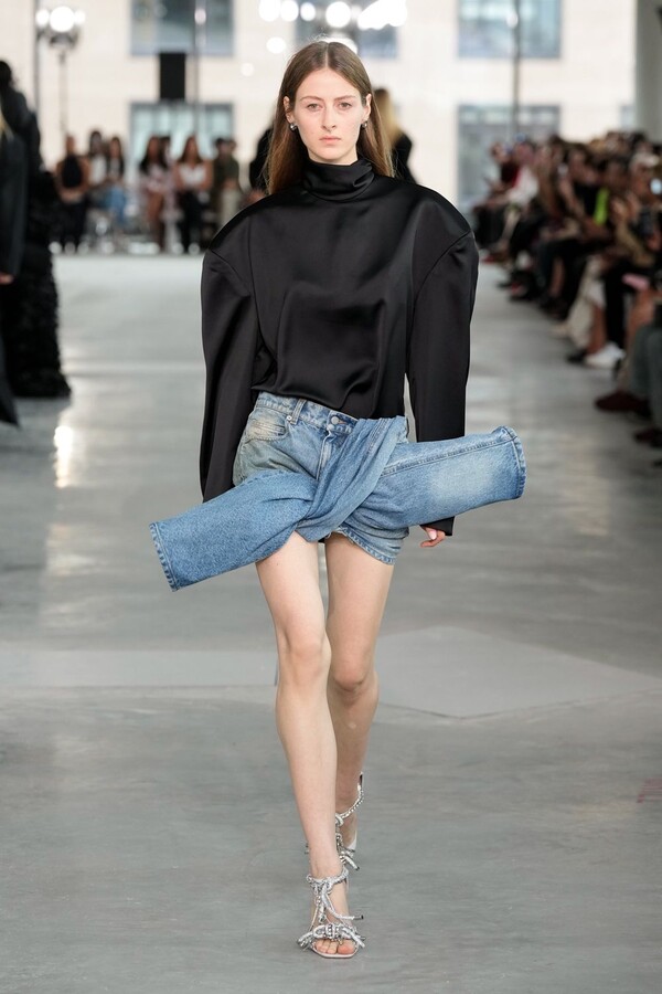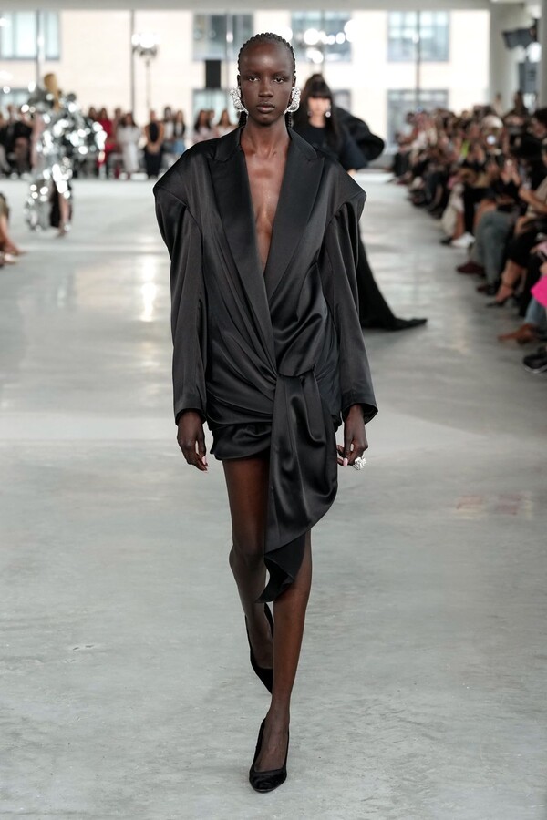 这场由 Emma Wyman 担任造型师的秀以一系列纯色造型开场:第一套是黑色缎面连帽衫搭配工装七分裤——这个带有 Y2K 风格的灵感自《欲望都市》中的Carrie,接着是喇叭裤、紧身夹克搭配夸张的水晶套索项链。本季也融入了更多运动元素,例如由篮球衫剪裁而成的亮片连衣裙、腰部饰有水晶绑带的超大号运动短裤。AREA 标志也进行了全新诠释。