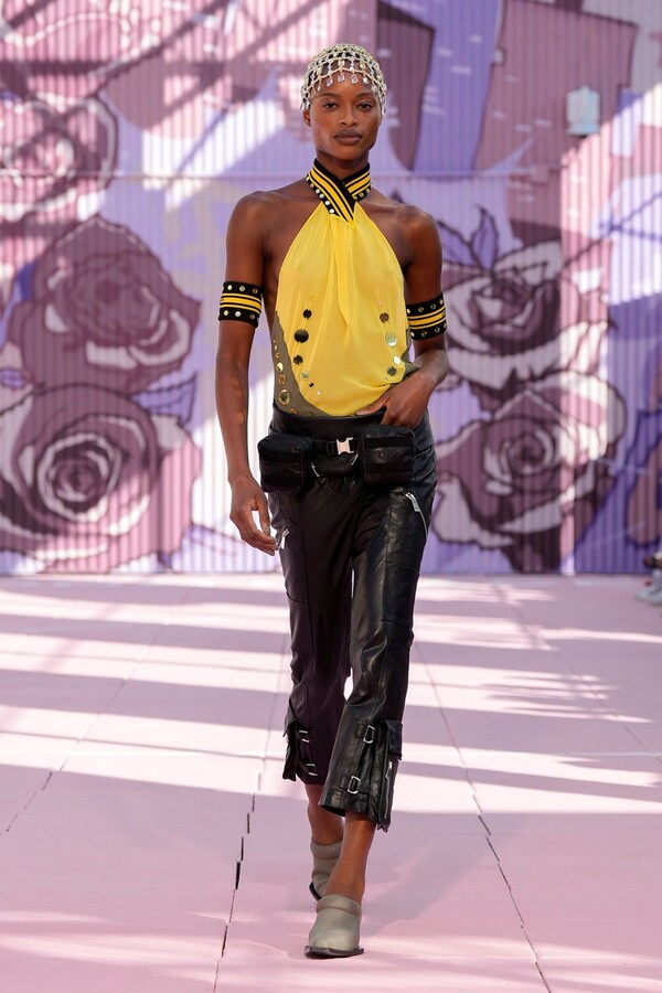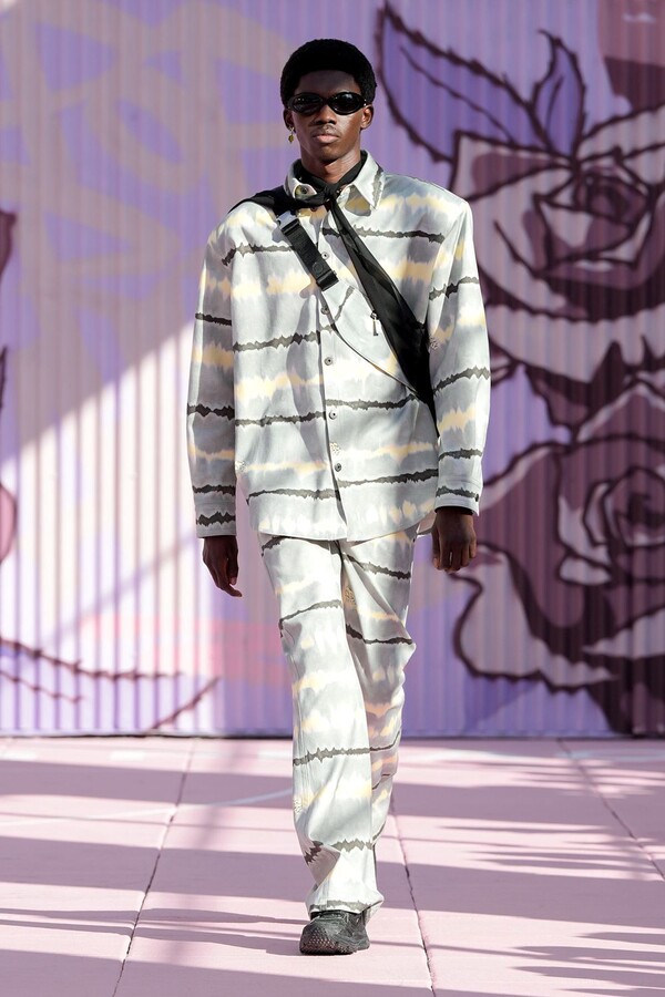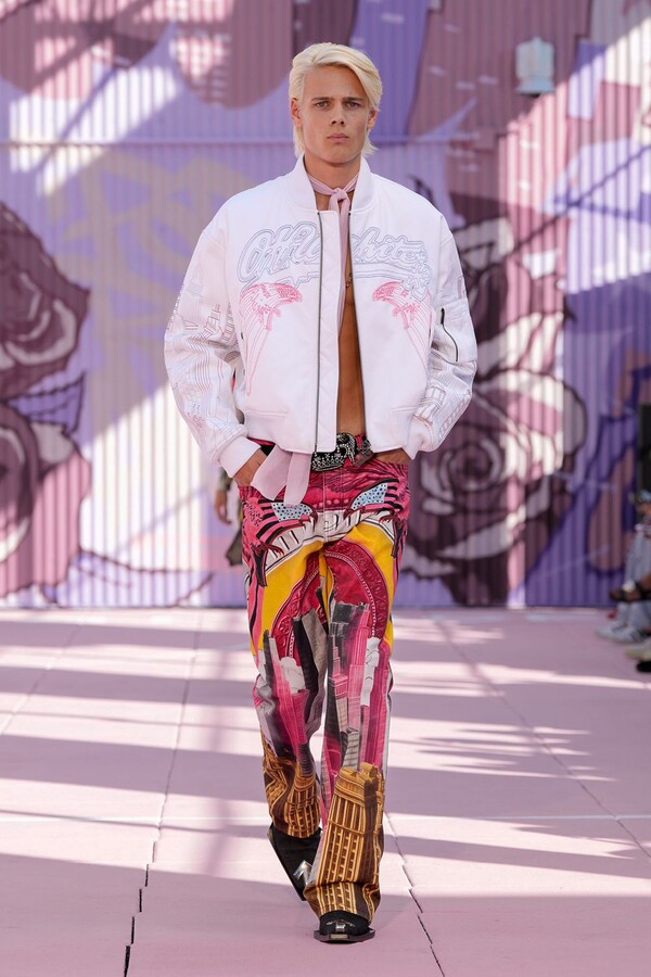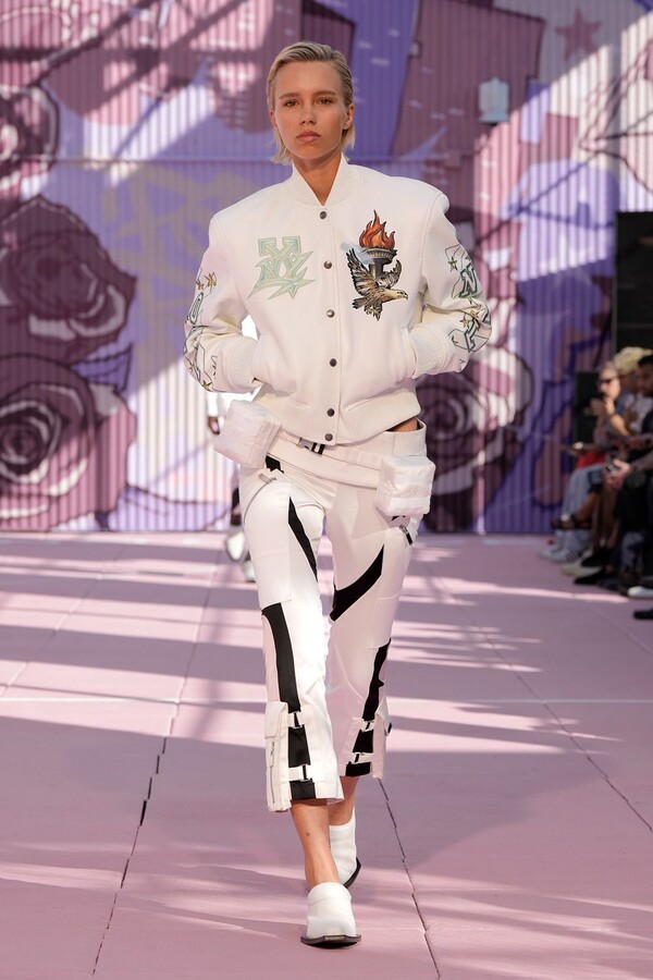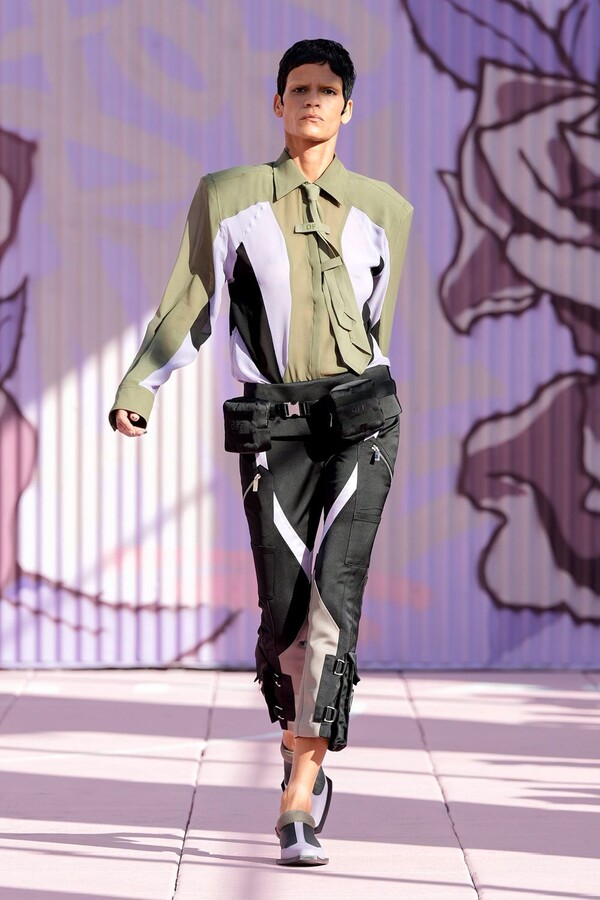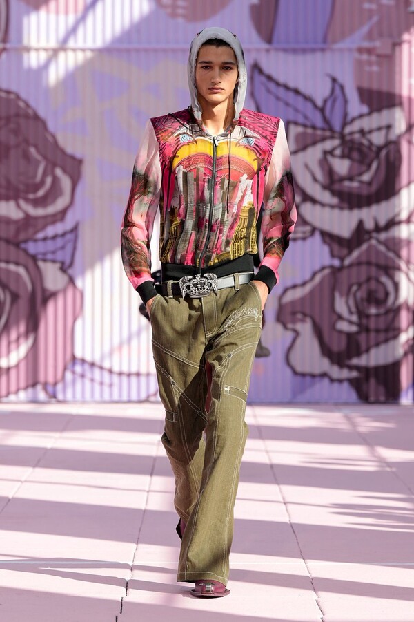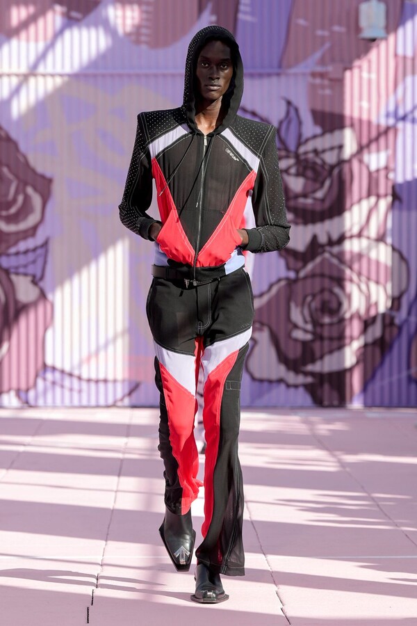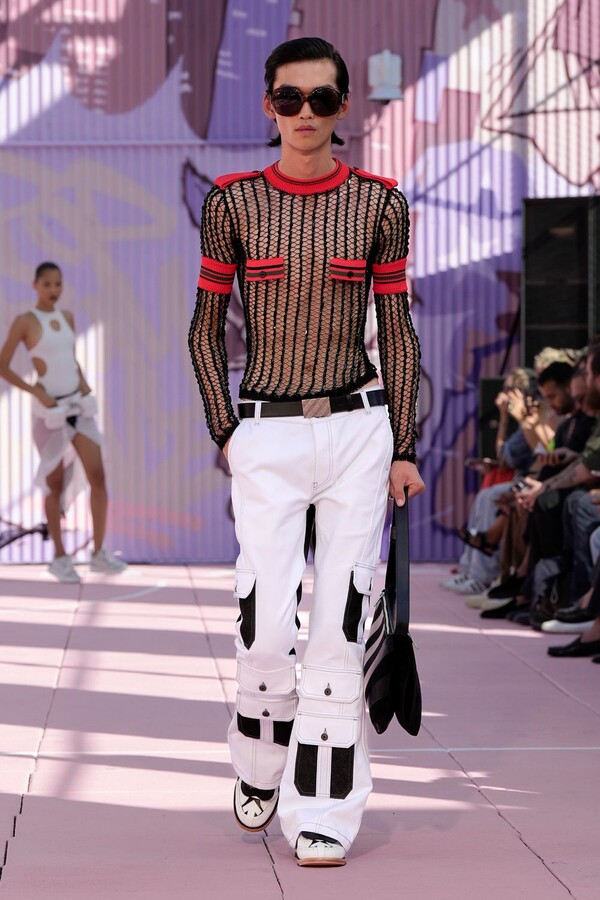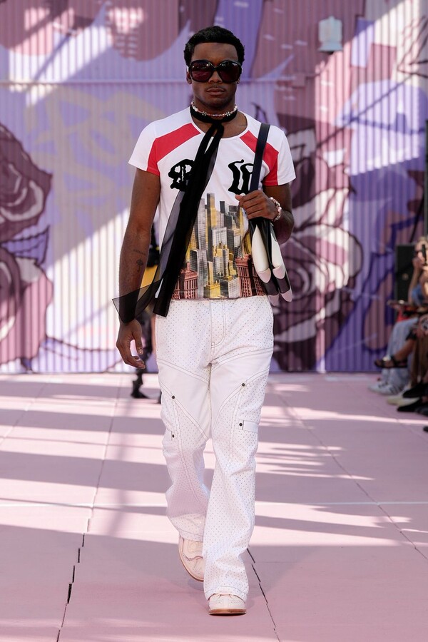 本季的廓形偏向纤细修长,穿插着结构感元素,例如贴合身体曲线的缝线、加固的接缝以及如同内置支撑的拼接。印花和表面处理巧妙地融合了都市意象与高级定制工艺。连帽衫和牛仔裤上点缀着天际线图案,大胆的撞色在层叠造型中营造出动感对比。轻薄面料层叠于不透明的底层,巧妙的镂空、网眼嵌饰则将硬朗的街头风格变得更轻盈和运动感。