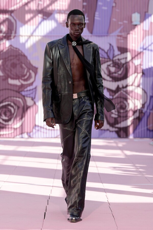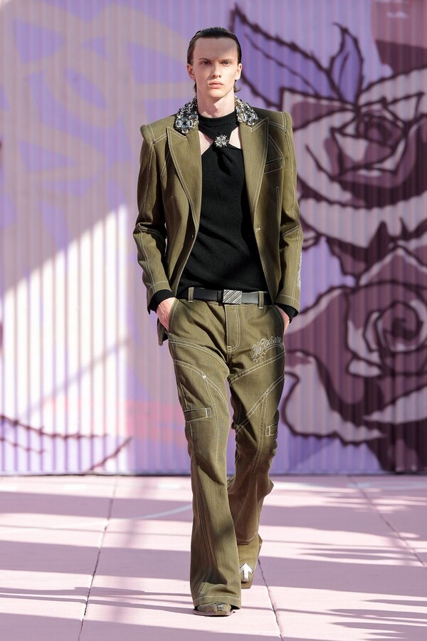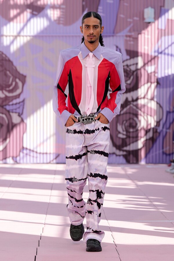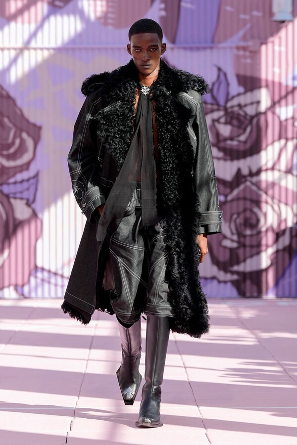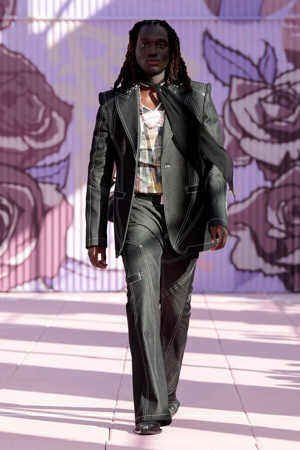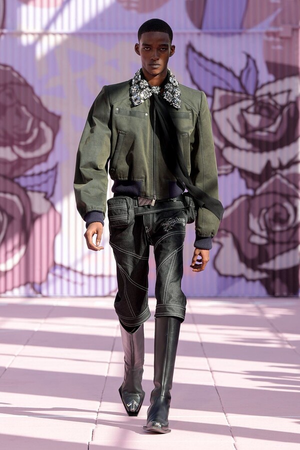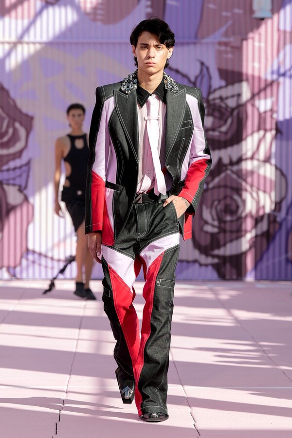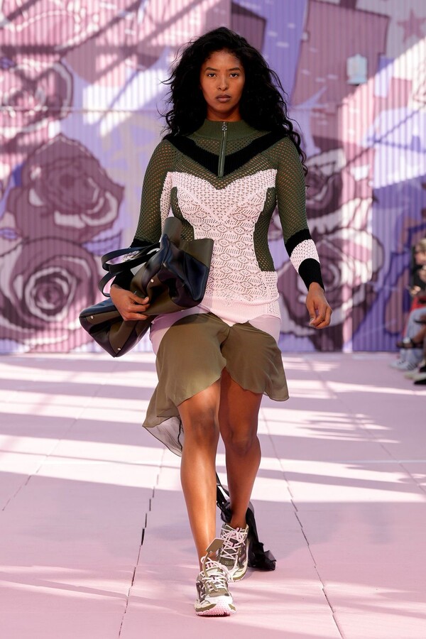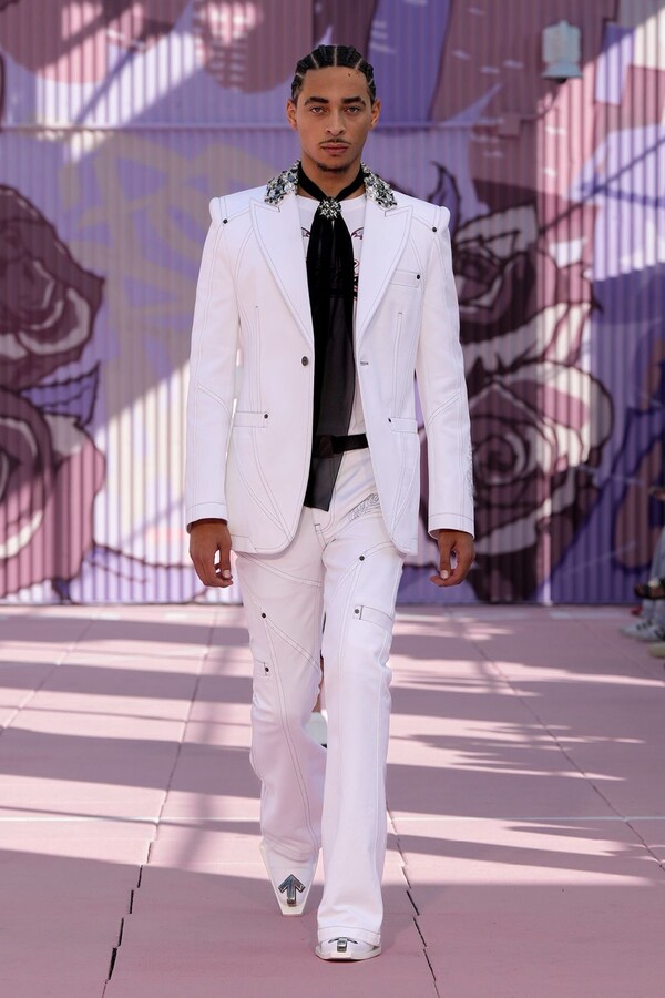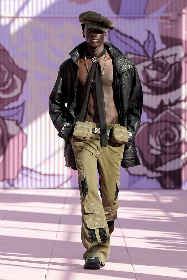 本季的廓形偏向纤细修长,穿插着结构感元素,例如贴合身体曲线的缝线、加固的接缝以及如同内置支撑的拼接。印花和表面处理巧妙地融合了都市意象与高级定制工艺。连帽衫和牛仔裤上点缀着天际线图案,大胆的撞色在层叠造型中营造出动感对比。轻薄面料层叠于不透明的底层,巧妙的镂空、网眼嵌饰则将硬朗的街头风格变得更轻盈和运动感。