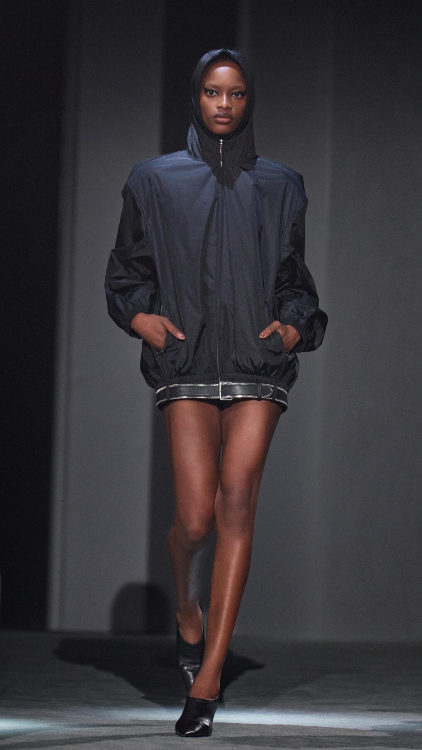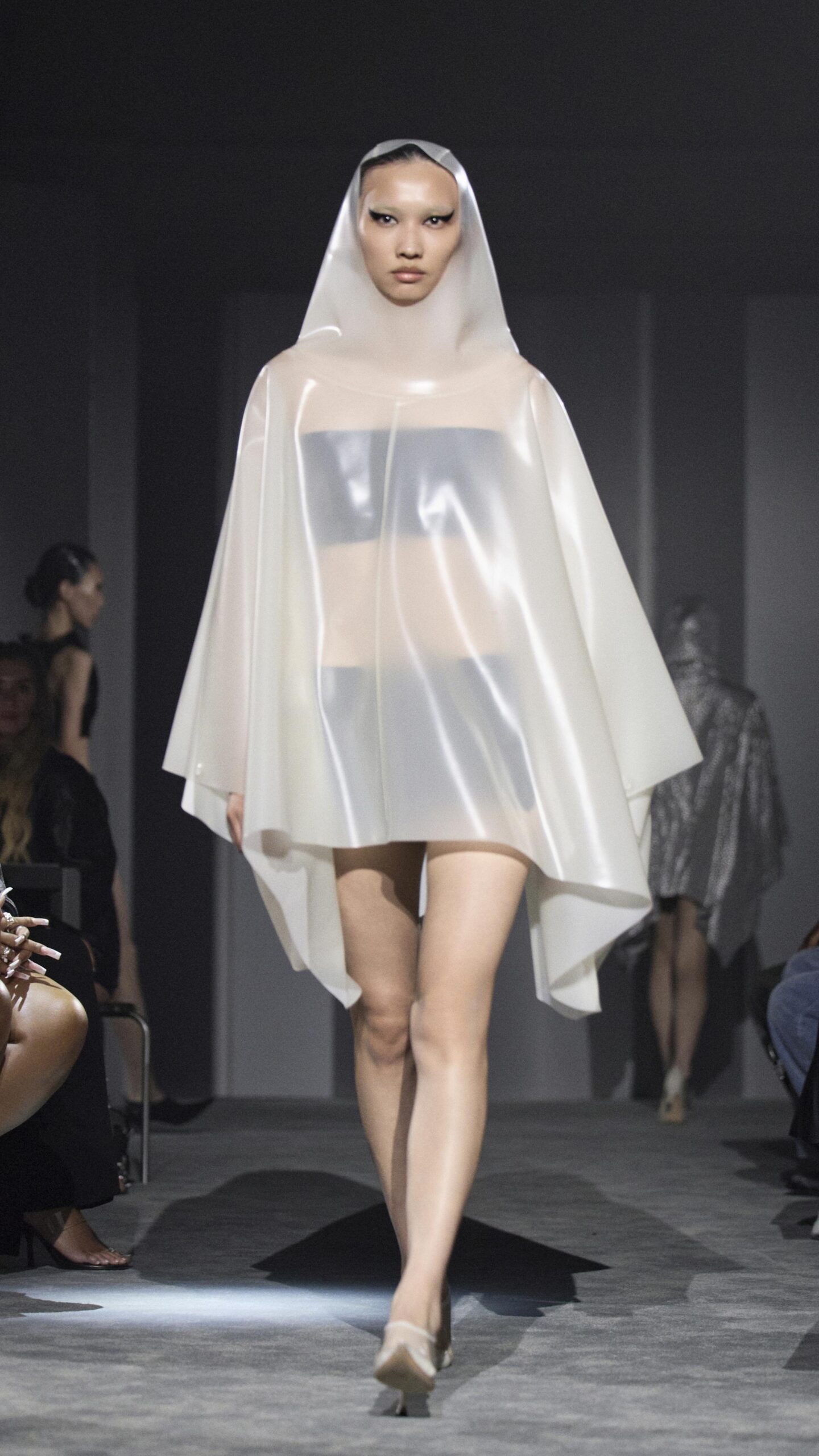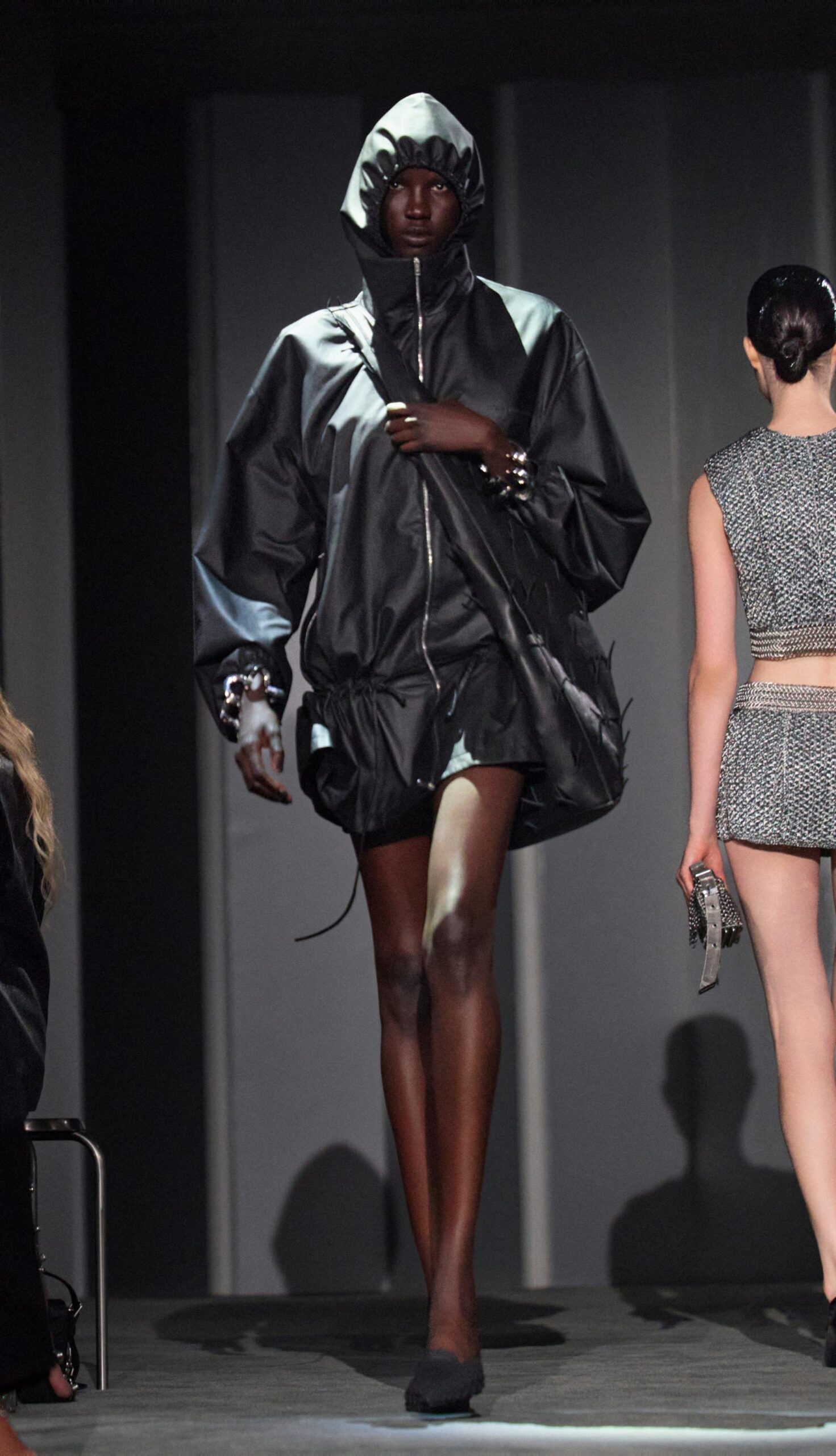 面料延续着故事的脉络。经典粗花呢经由金属层压工艺的改造,呈现出隐秘而现代的质感。钩针编织被赋予新的内涵,蜕变为更显庄重优雅的风格——于温婉中注入强大气场。弹性针织面料通过立体剪裁,化为雕塑感的斗篷与兜帽,模糊了未来主义与未来本身的界限。激光切割的尼龙与乳胶之下,隐约透出一抹荧光色彩,在克制与展露之间营造出微妙张力。透明塑料材质层叠于丹宁与尼龙之上,微妙平衡着防护与裸露之间的张力。