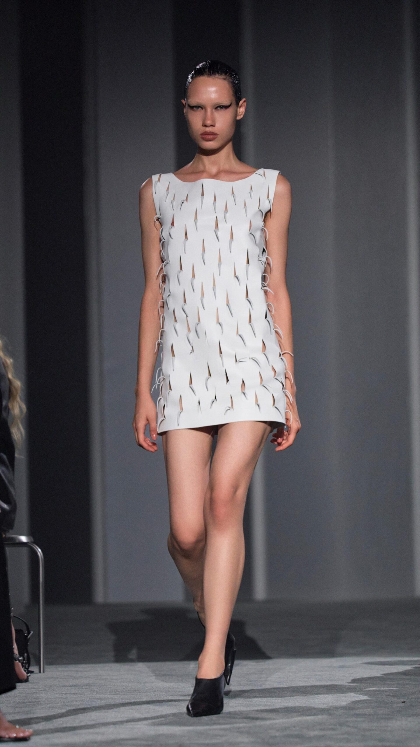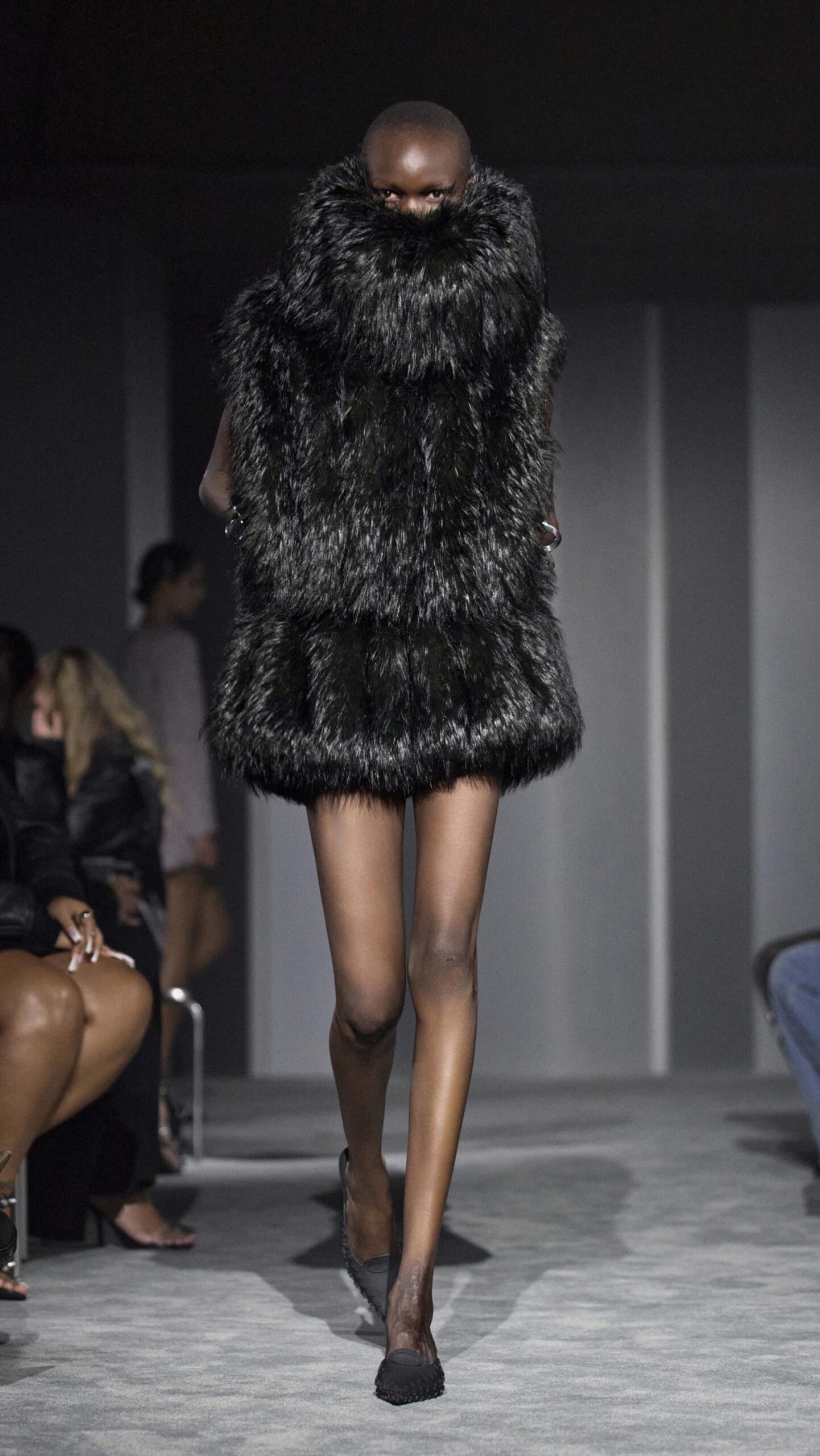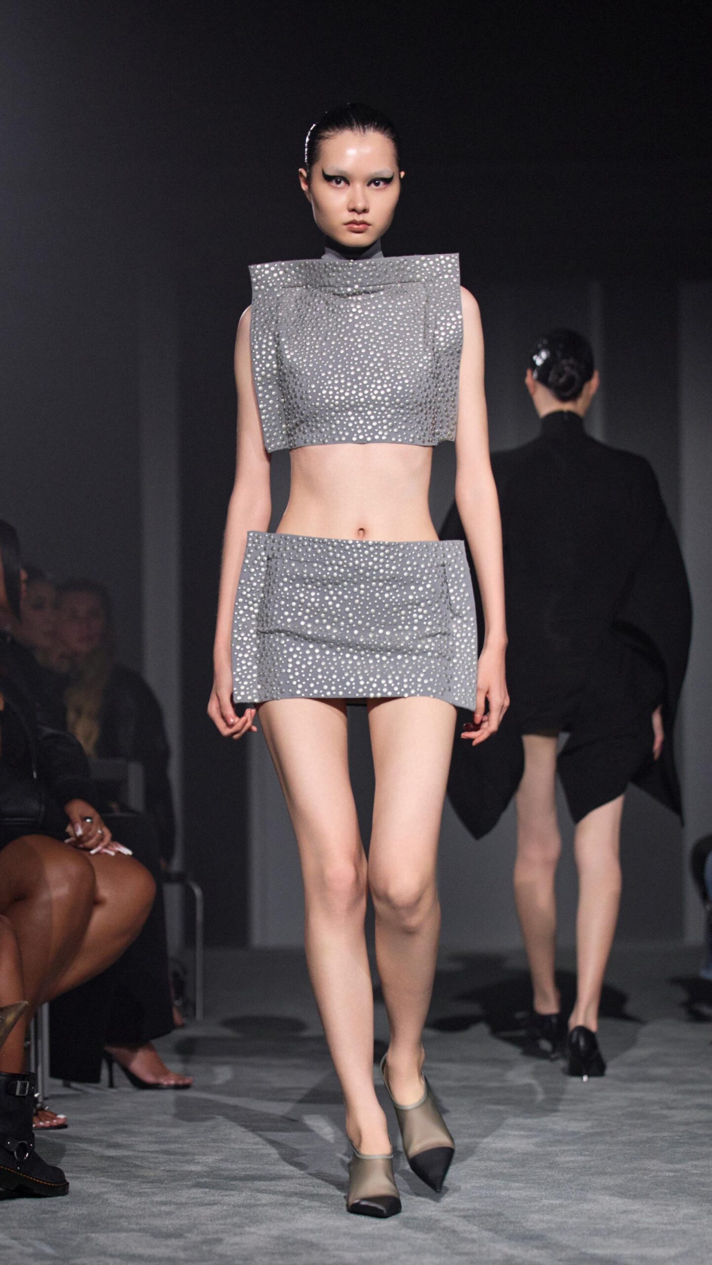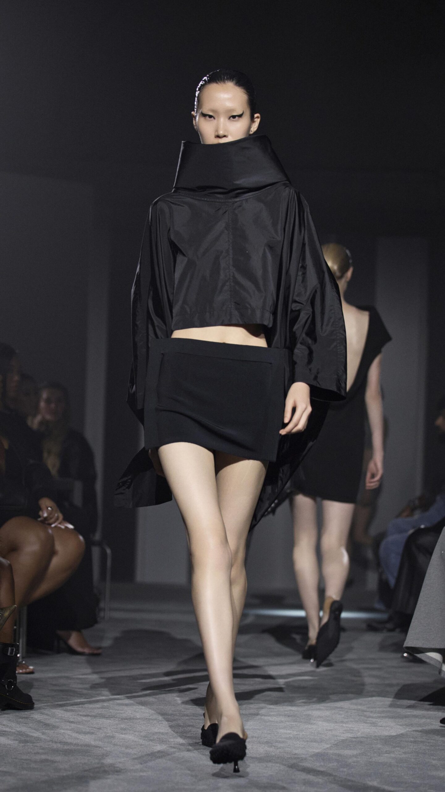 面料延续着故事的脉络。经典粗花呢经由金属层压工艺的改造,呈现出隐秘而现代的质感。钩针编织被赋予新的内涵,蜕变为更显庄重优雅的风格——于温婉中注入强大气场。弹性针织面料通过立体剪裁,化为雕塑感的斗篷与兜帽,模糊了未来主义与未来本身的界限。激光切割的尼龙与乳胶之下,隐约透出一抹荧光色彩,在克制与展露之间营造出微妙张力。透明塑料材质层叠于丹宁与尼龙之上,微妙平衡着防护与裸露之间的张力。