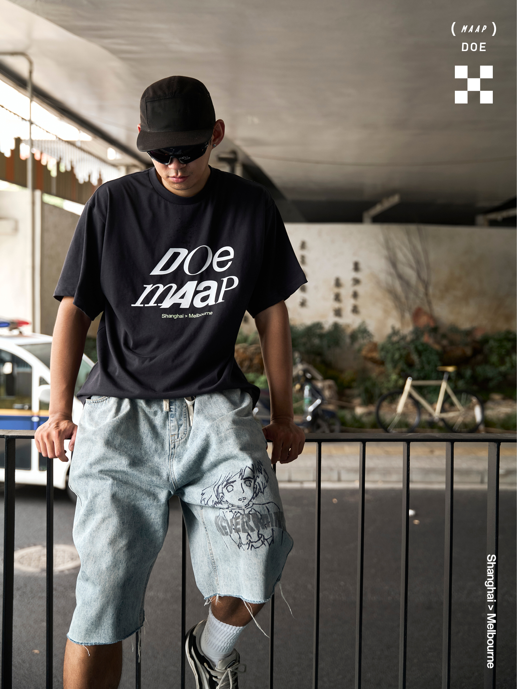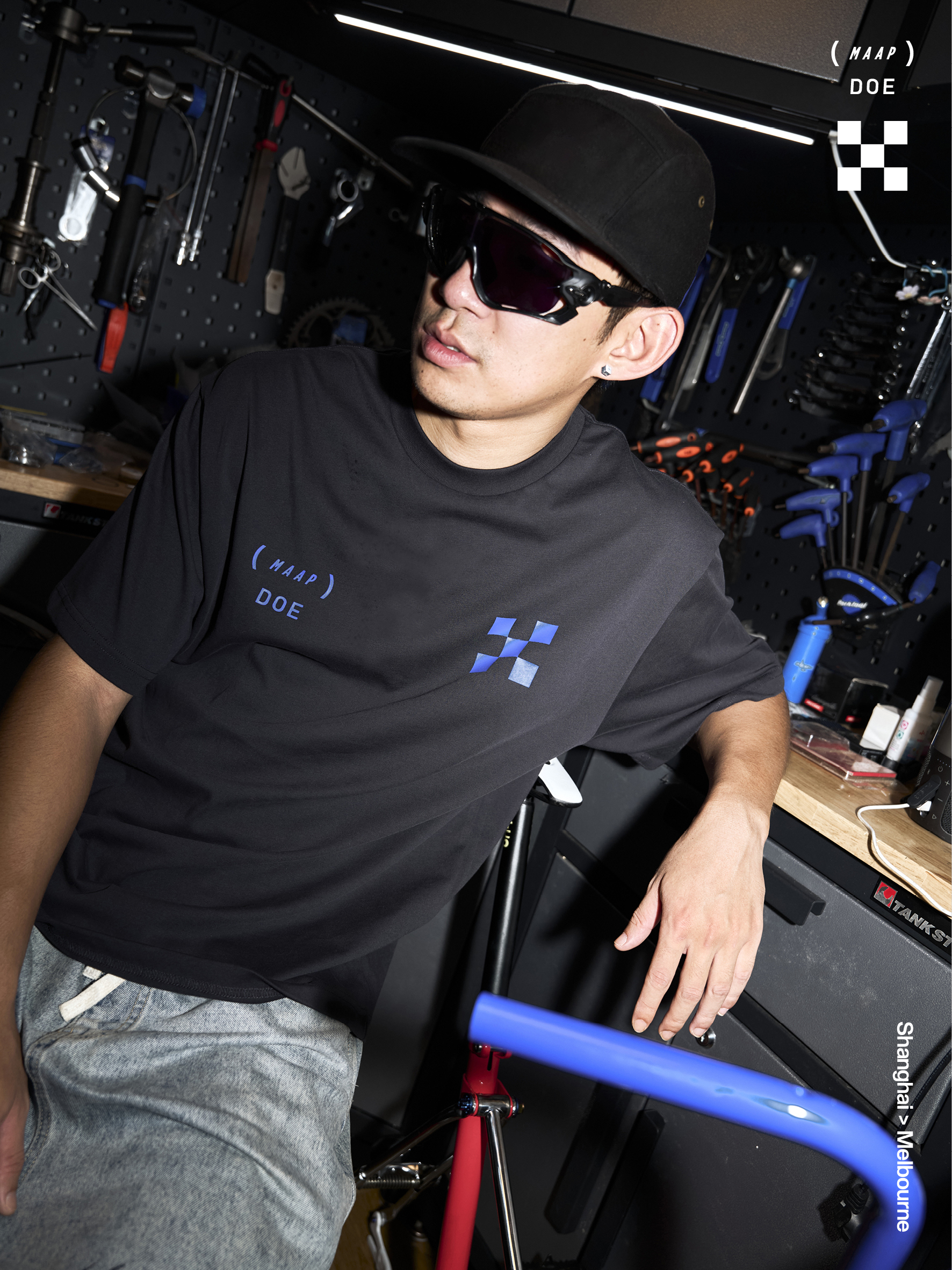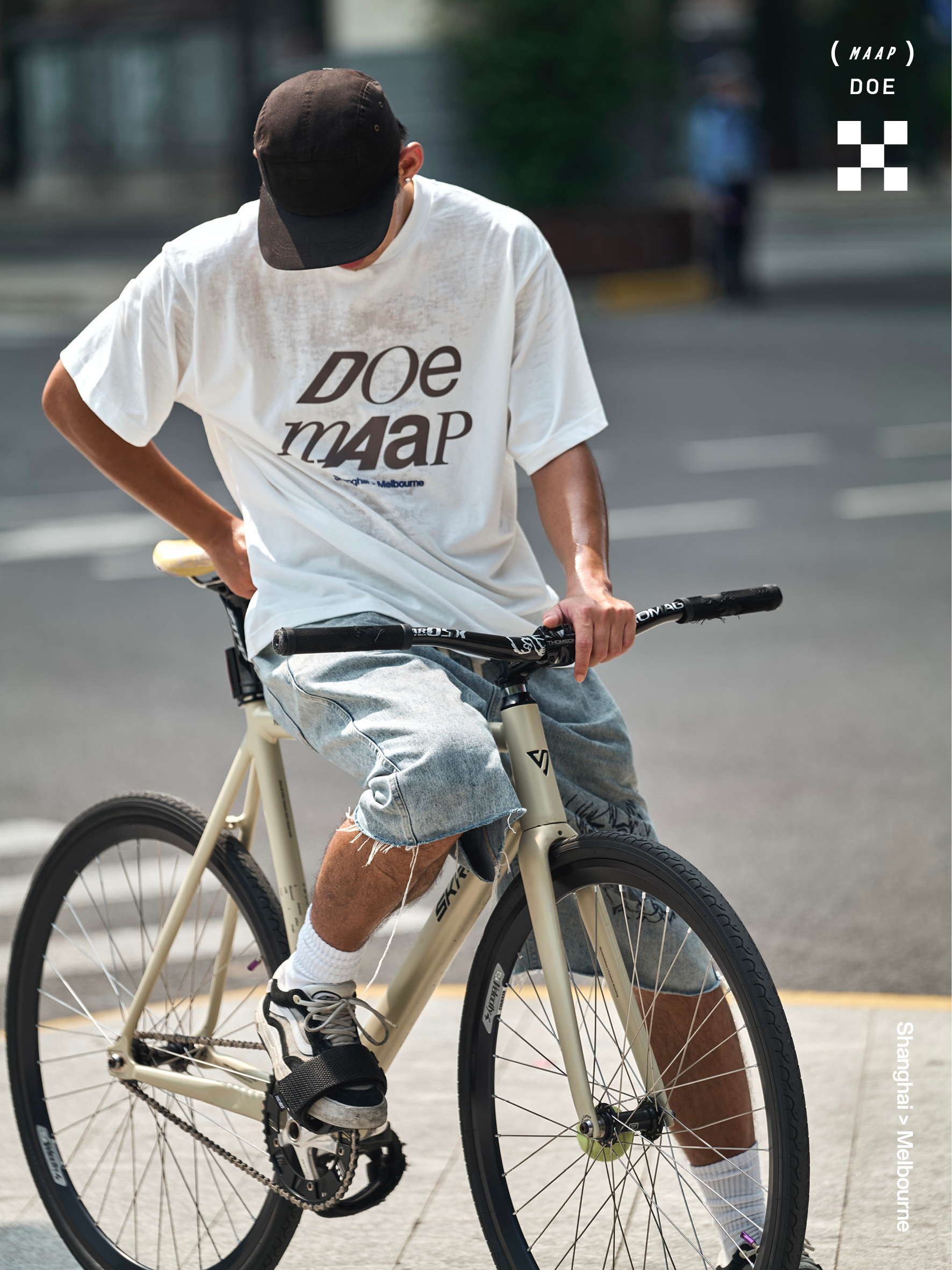 DOE 与来自澳大利亚墨尔本的功能性骑行品牌 MAAP 共同推出联名 T 恤系列。DOE 扎根于上海,一直致力于本土青年文化、促进社群运动;MAAP 则来自墨尔本,以高性能骑行装备闻名,并于今年在上海静安寺商区中心开设门店,与 DOE 铜仁路店相距不远。双方凭借地理位置的邻近与对骑行文化的共同追求,促成了此次合作。此次联名不仅是两个品牌共同推动城市骑行氛围发展与深化理解的体现,更是上海与墨尔本两地文化的互动、在地社群连接的生动见证。