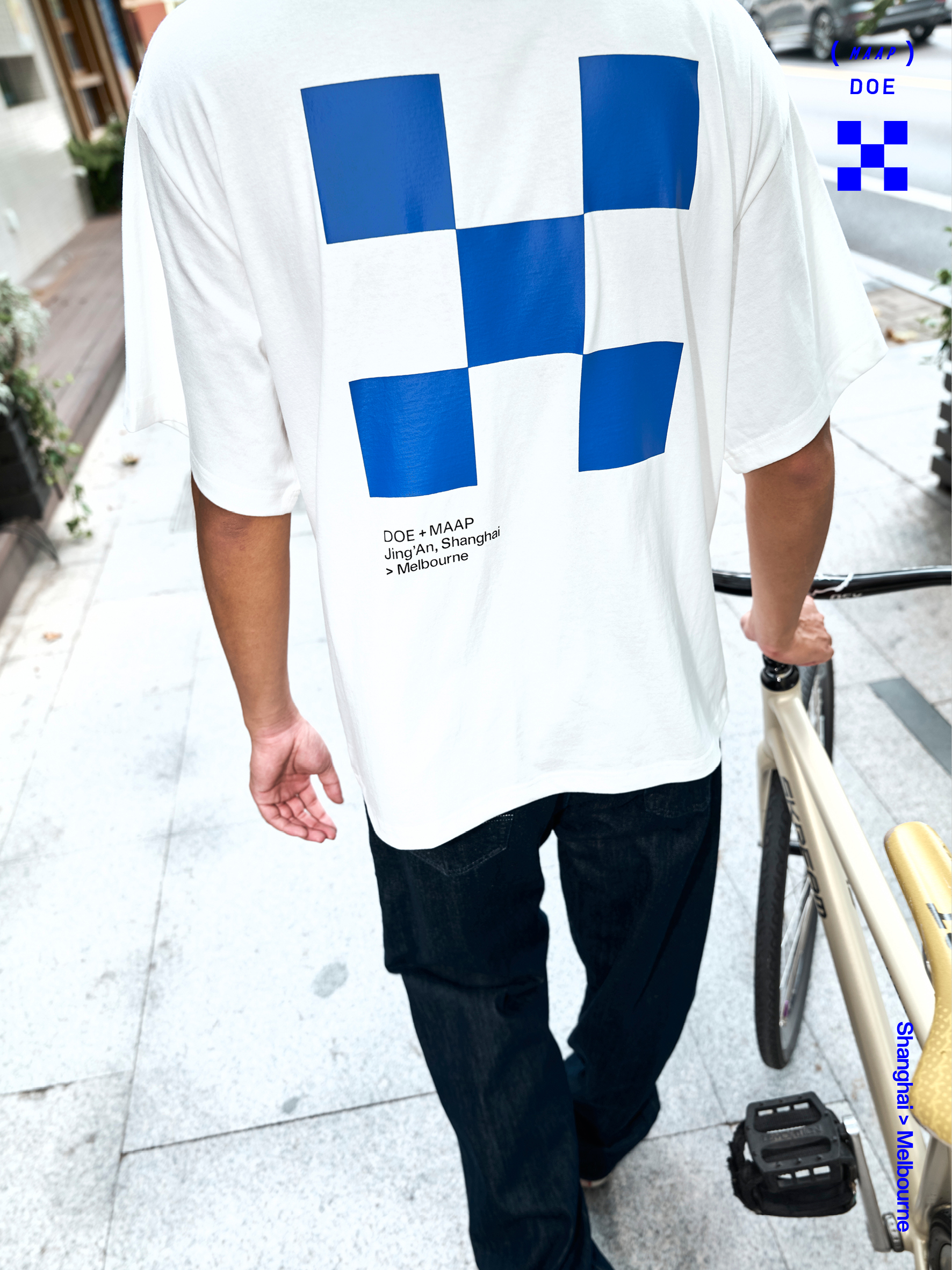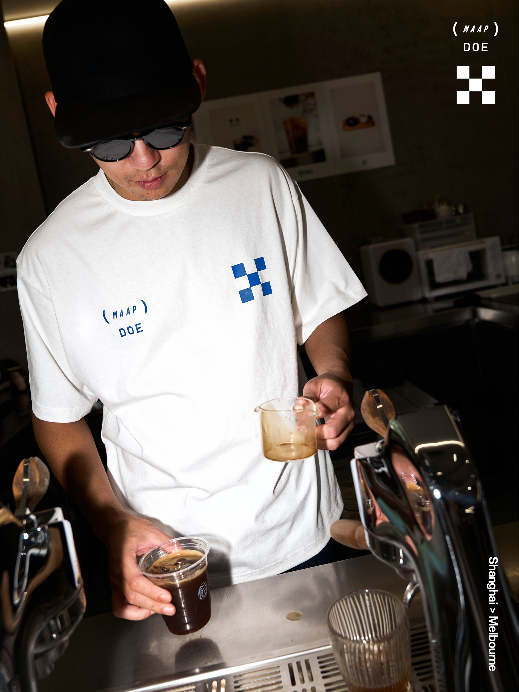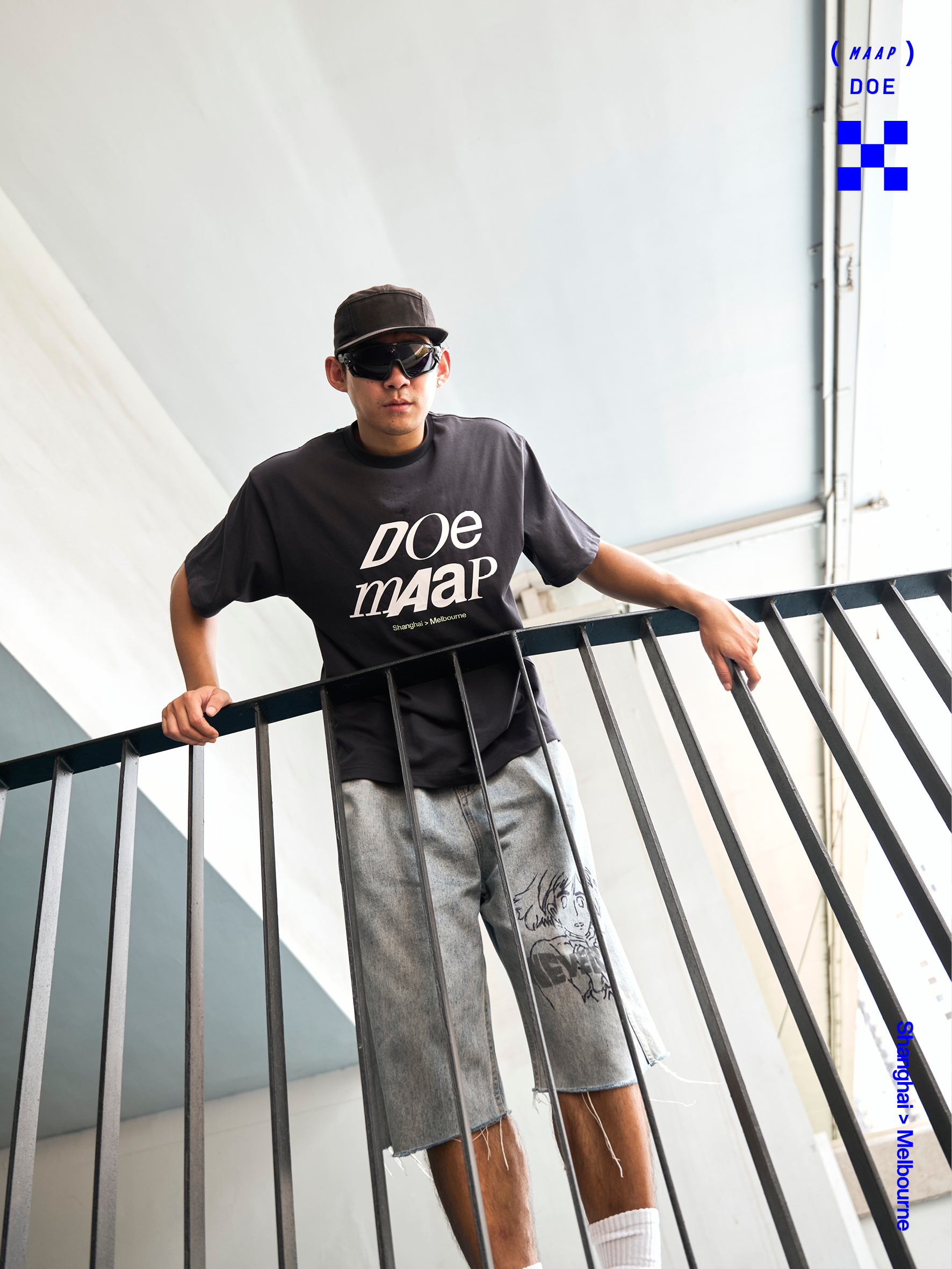 DOE 与来自澳大利亚墨尔本的功能性骑行品牌 MAAP 共同推出联名 T 恤系列。DOE 扎根于上海,一直致力于本土青年文化、促进社群运动;MAAP 则来自墨尔本,以高性能骑行装备闻名,并于今年在上海静安寺商区中心开设门店,与 DOE 铜仁路店相距不远。双方凭借地理位置的邻近与对骑行文化的共同追求,促成了此次合作。此次联名不仅是两个品牌共同推动城市骑行氛围发展与深化理解的体现,更是上海与墨尔本两地文化的互动、在地社群连接的生动见证。