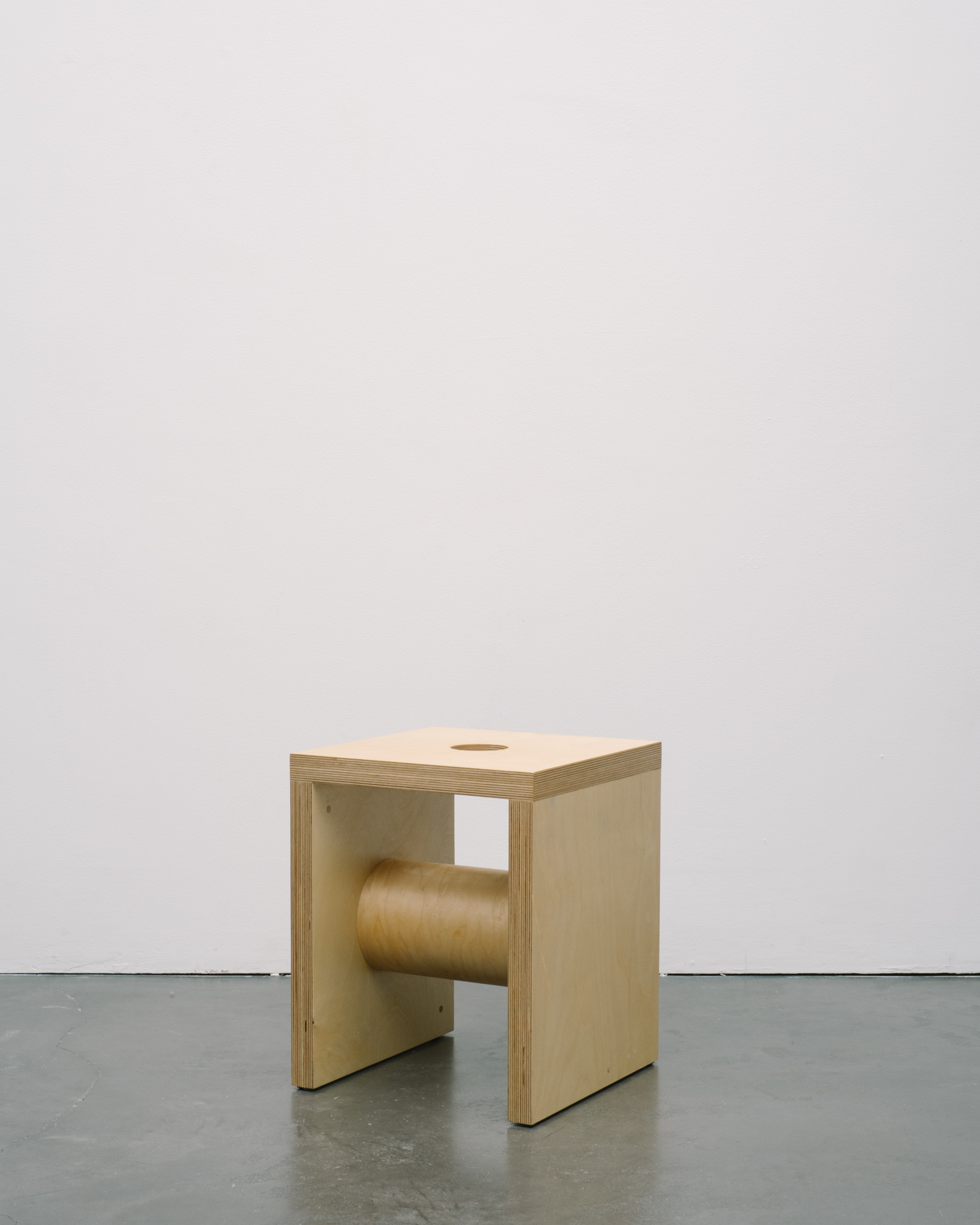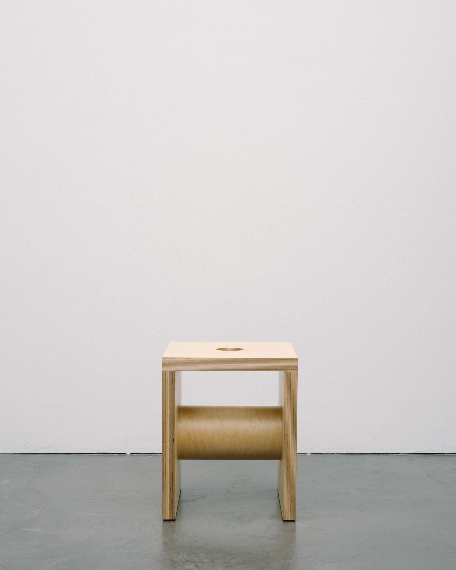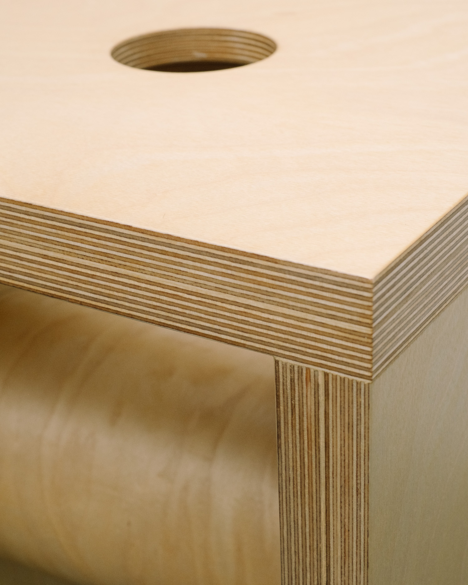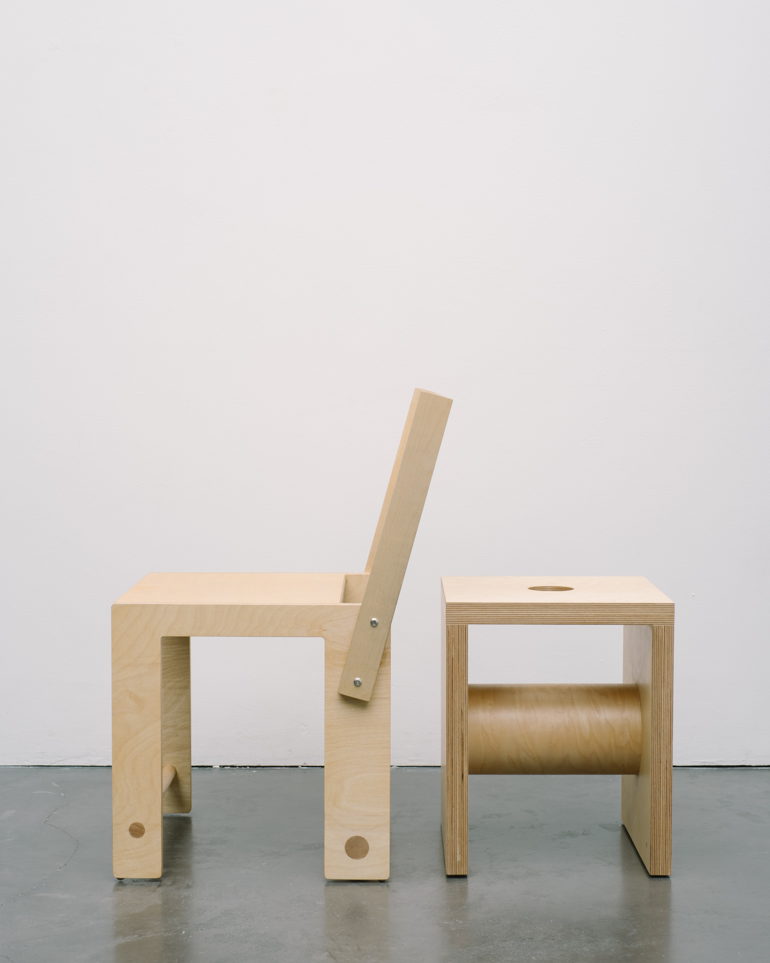 合作系列包括一款由波罗的海桦木胶合板打造的椅子,以钢制螺栓固定矩形座面与倾斜靠背,直径 1 英寸与 1.5 英寸的枫木圆木杆在椅腿间形成结构与美学的双重连接;另一款同材质凳子亦以桦木夹板打造,座面与两侧均为双层板结构;上层板面开有直径 3 英寸与 4.5 英寸的圆孔,形成层次感并露出贯穿两侧的桦木圆柱,呼应椅子设计语言,营造两件作品间的对话感。