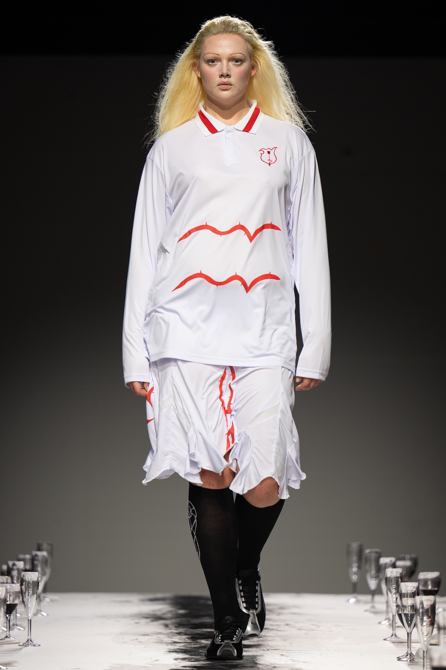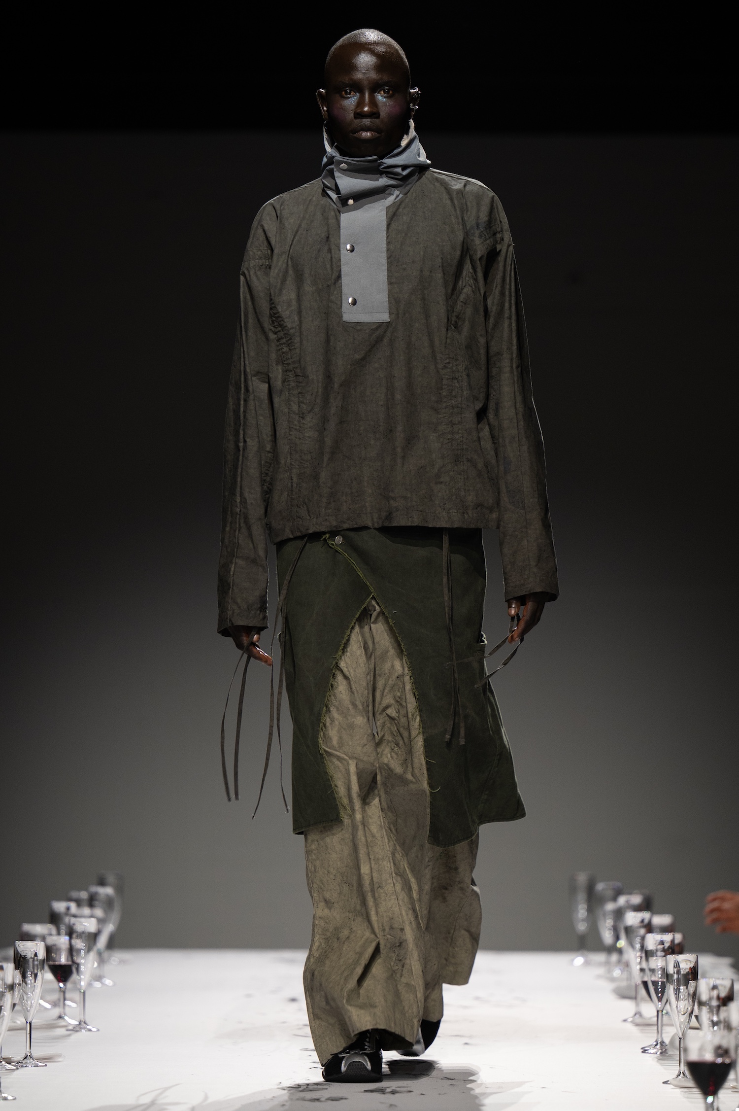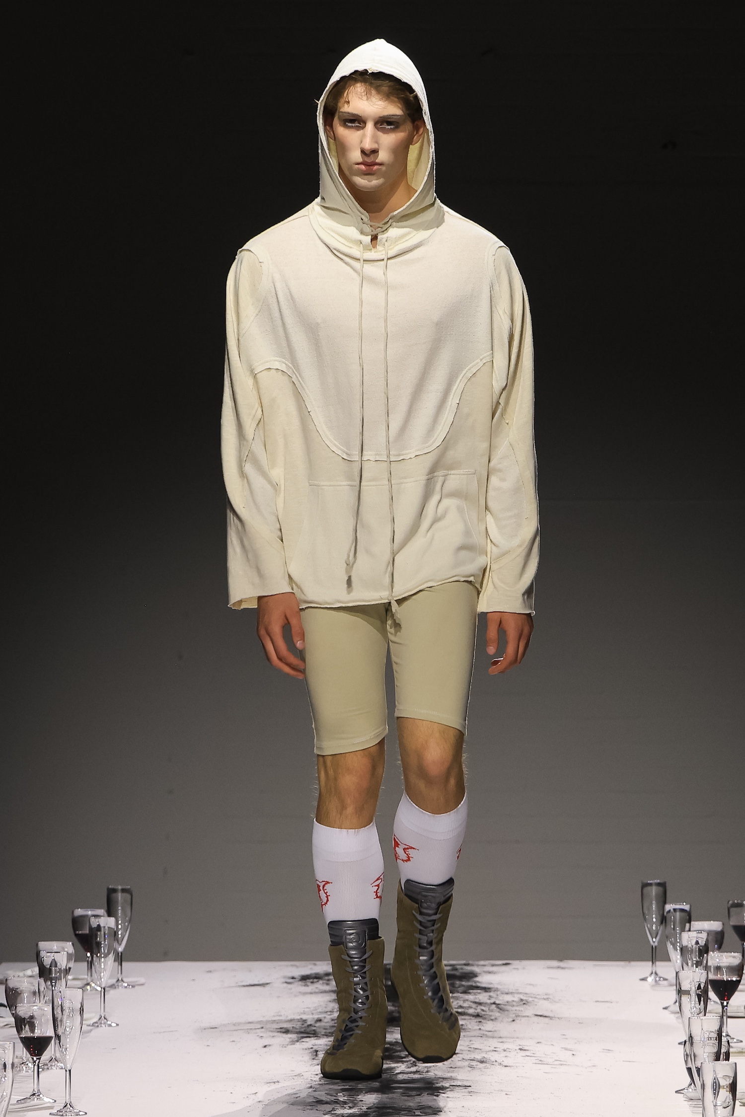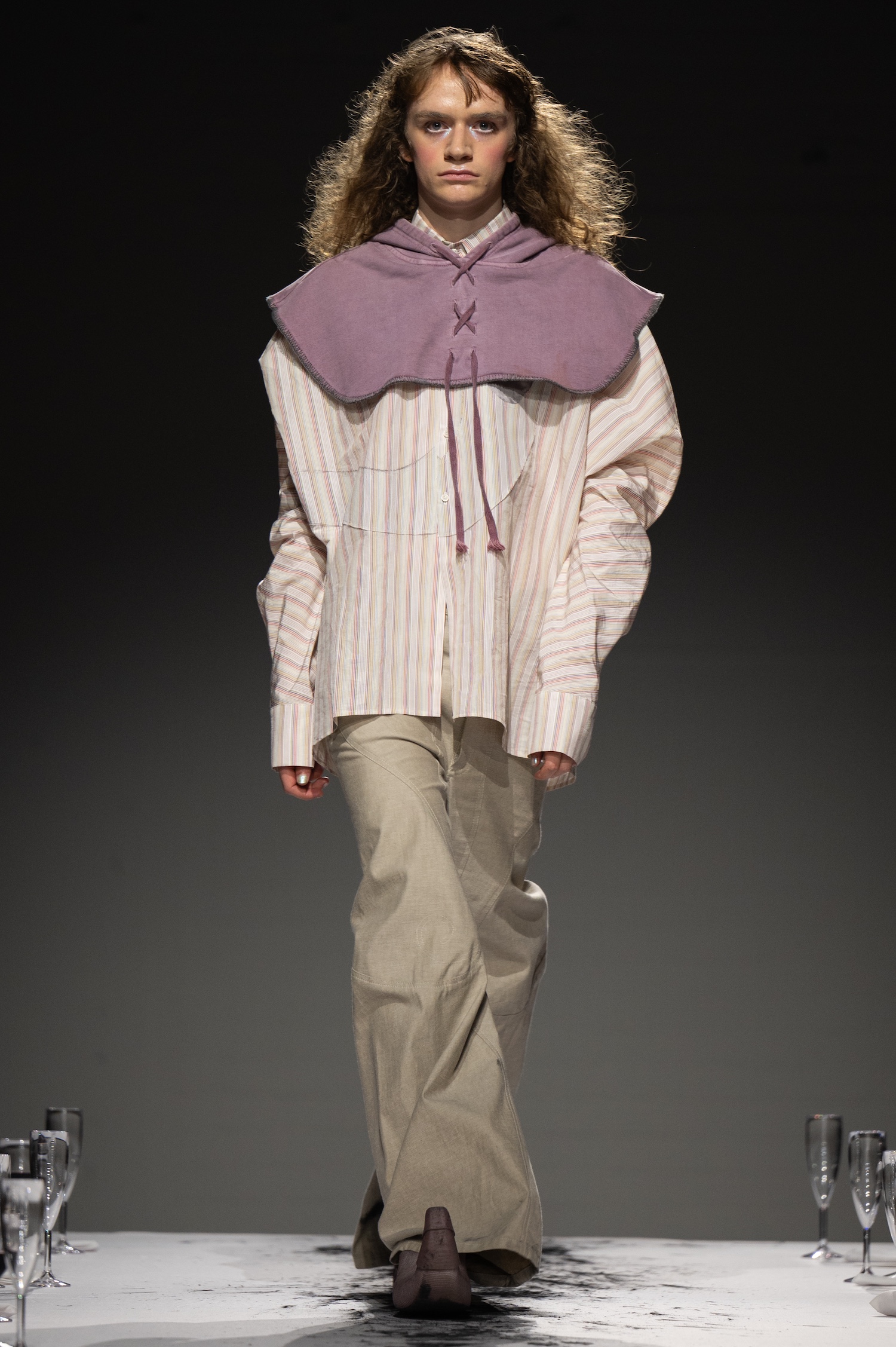 这一季,Lueder 带来了一个晚宴派对——「Convivium」,即古罗马的盛宴。走道上散落着破碎的红酒杯,延伸至一张铺着白色桌布的长餐桌,而餐桌本身也成为了 T 台。Lueder 的设计世界过去一直深受深厚的历史与神话背景启发,如中世纪轮廓、民间服饰和神话传说等元素。这次春夏系列在此基础上继续延续了她的叙事风格,同时融入了 Baz Luhrmann 导演的《罗密欧与朱丽叶》中狂欢节般的氛围。系列中的细节元素,如弯曲的妖精鞋和披风式斗篷,强烈地展示了这一灵感。