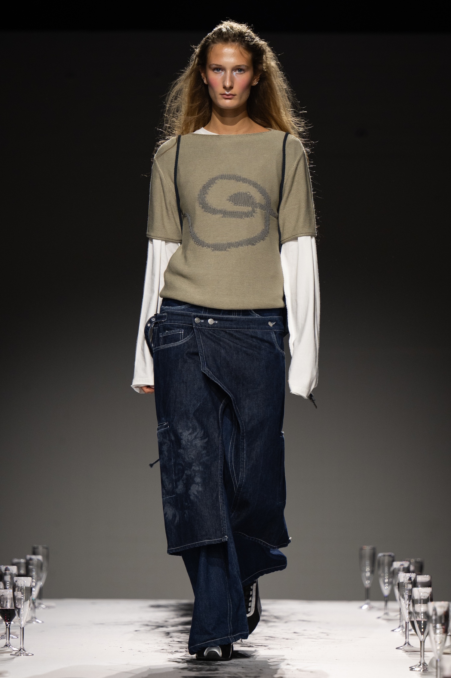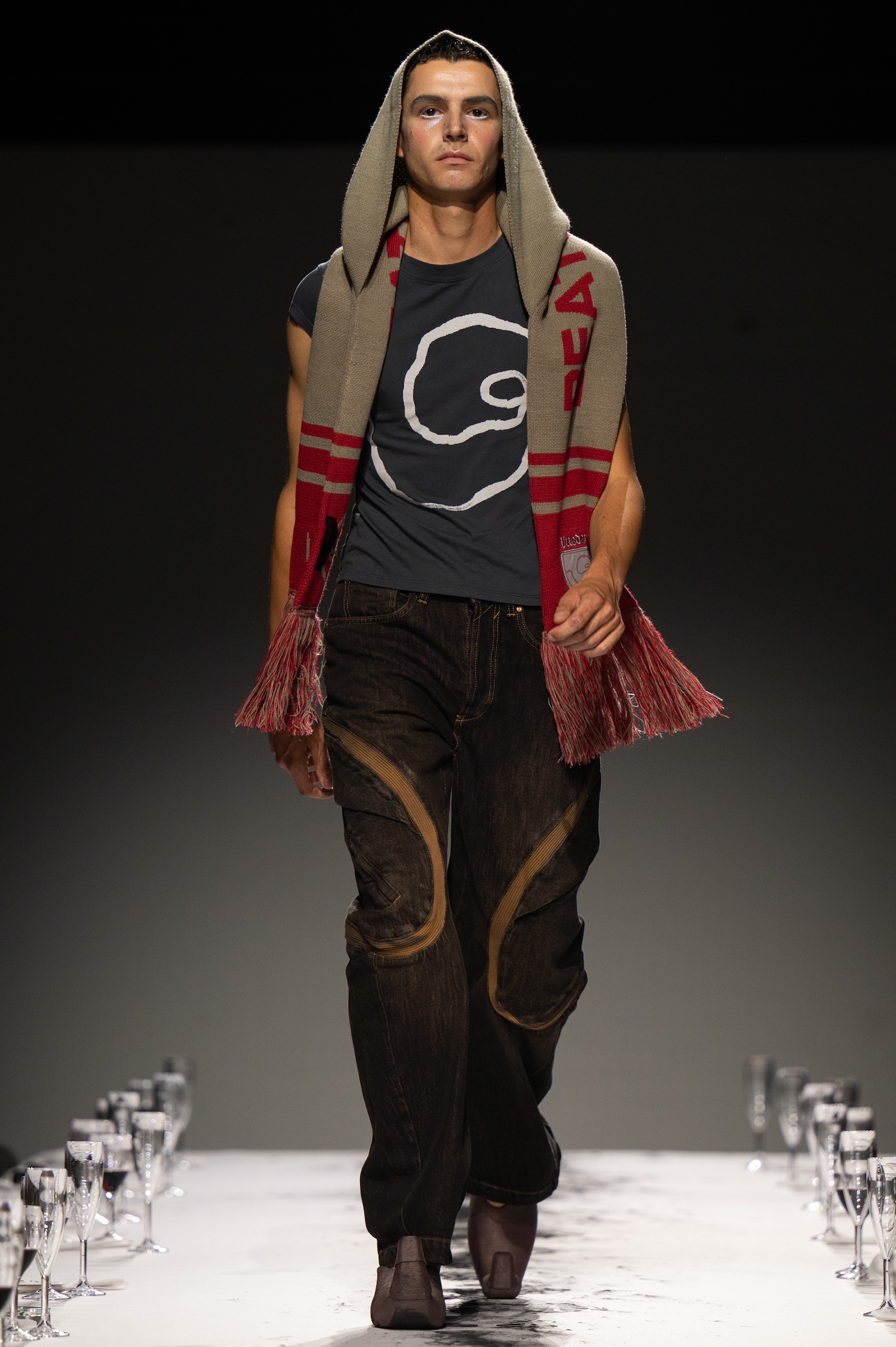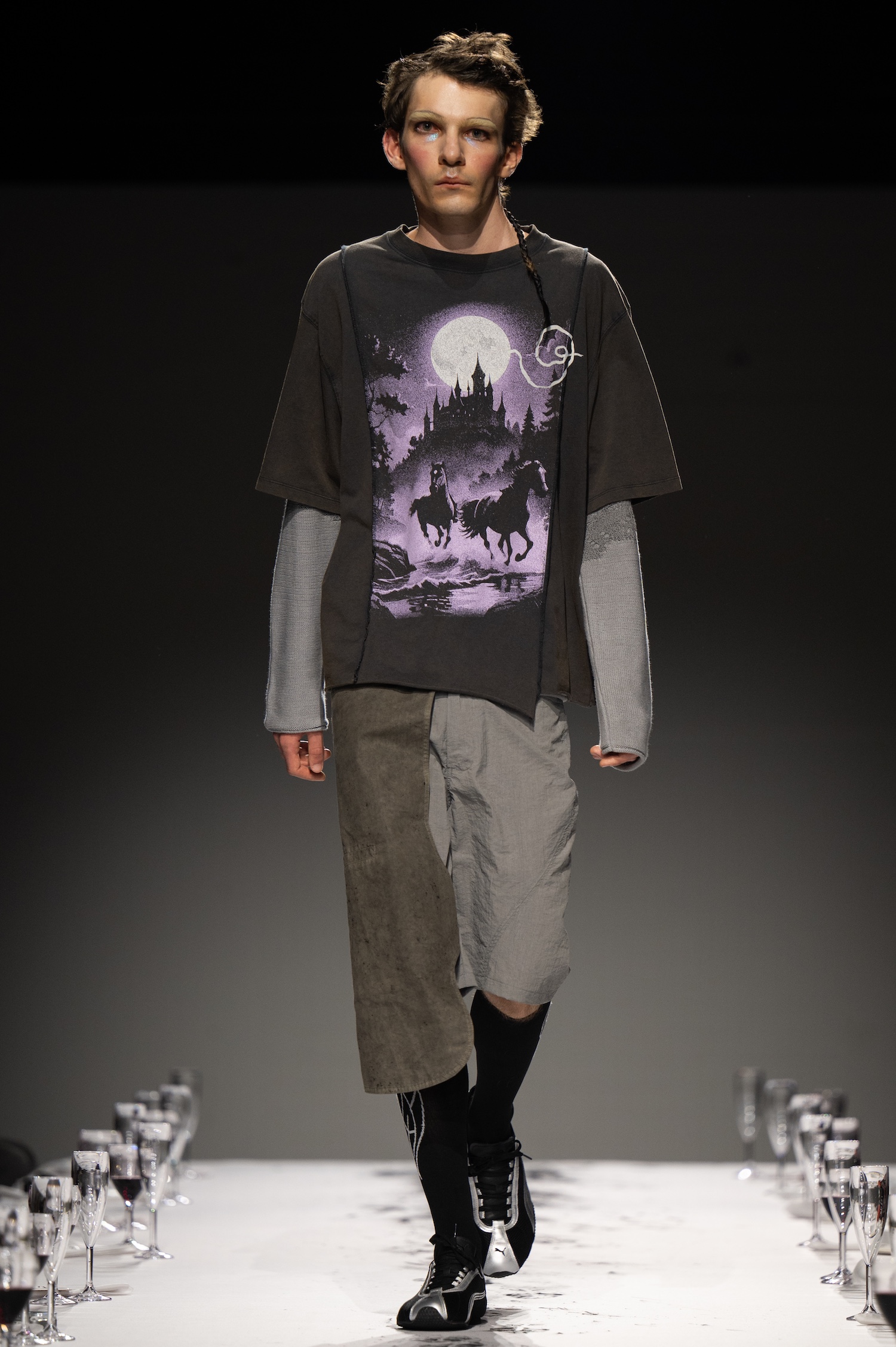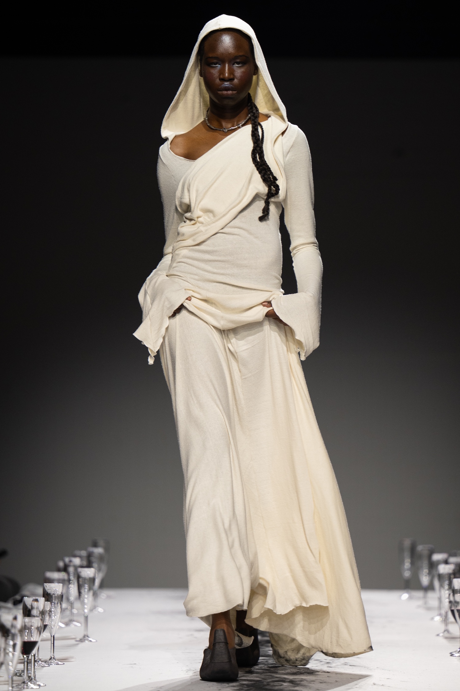 这一季,Lueder 带来了一个晚宴派对——「Convivium」,即古罗马的盛宴。走道上散落着破碎的红酒杯,延伸至一张铺着白色桌布的长餐桌,而餐桌本身也成为了 T 台。Lueder 的设计世界过去一直深受深厚的历史与神话背景启发,如中世纪轮廓、民间服饰和神话传说等元素。这次春夏系列在此基础上继续延续了她的叙事风格,同时融入了 Baz Luhrmann 导演的《罗密欧与朱丽叶》中狂欢节般的氛围。系列中的细节元素,如弯曲的妖精鞋和披风式斗篷,强烈地展示了这一灵感。