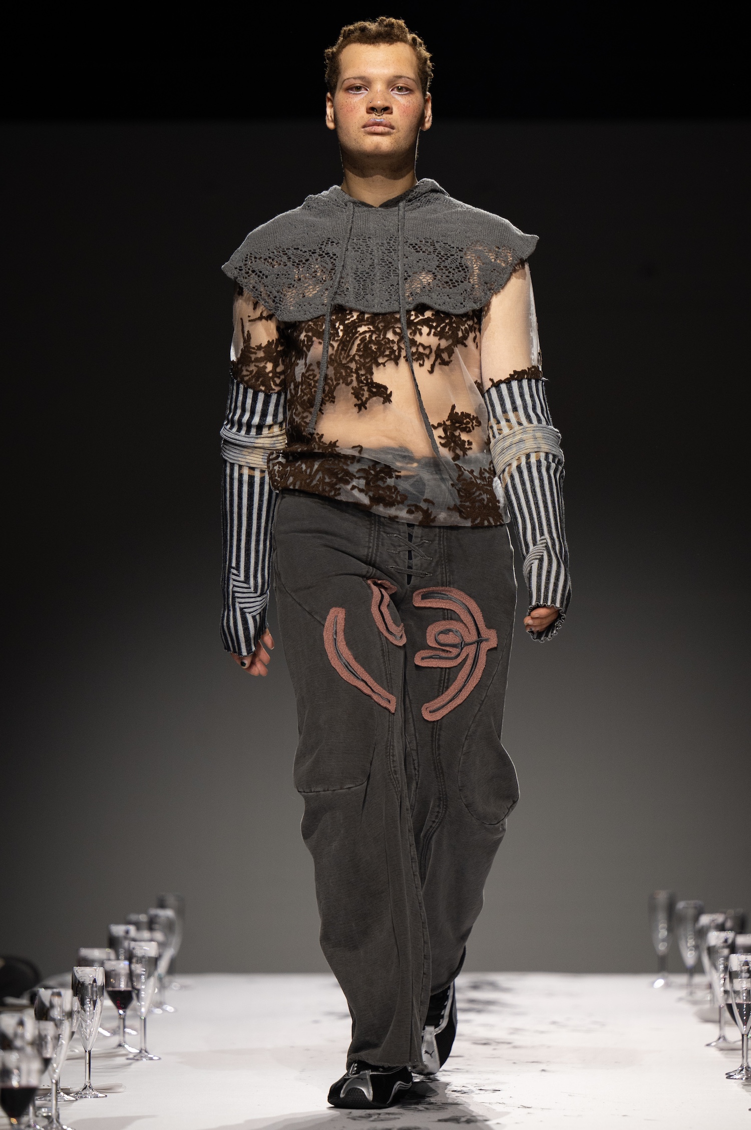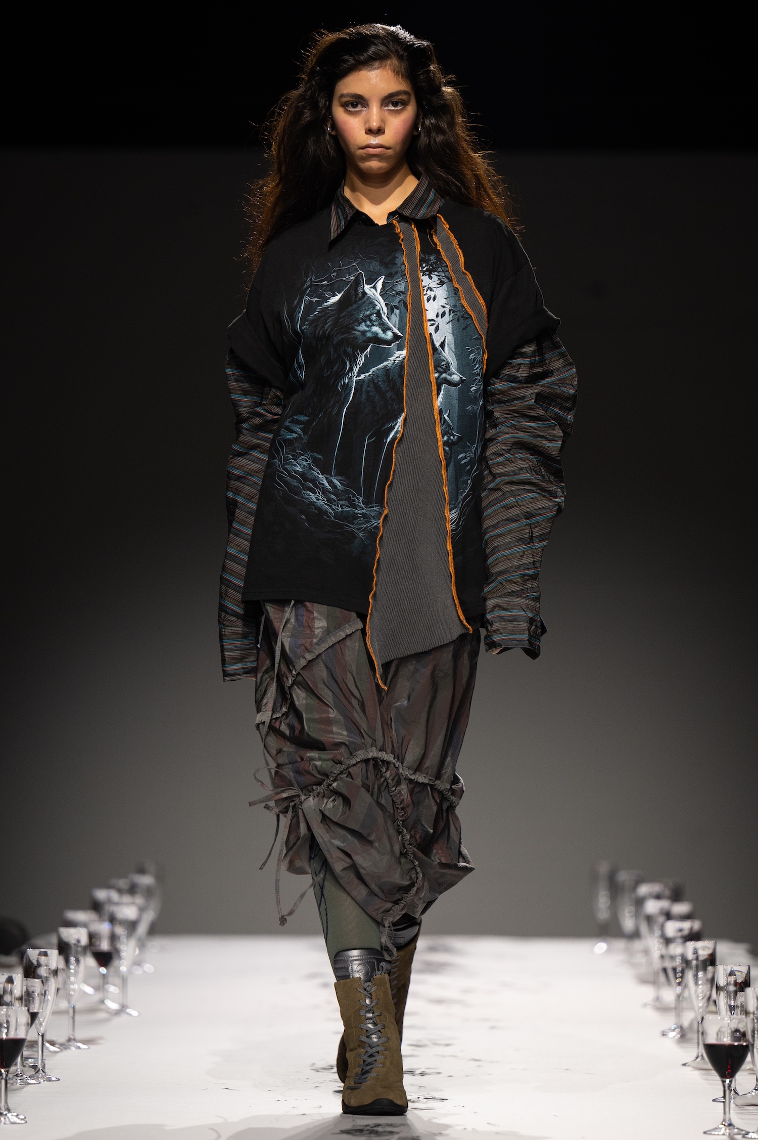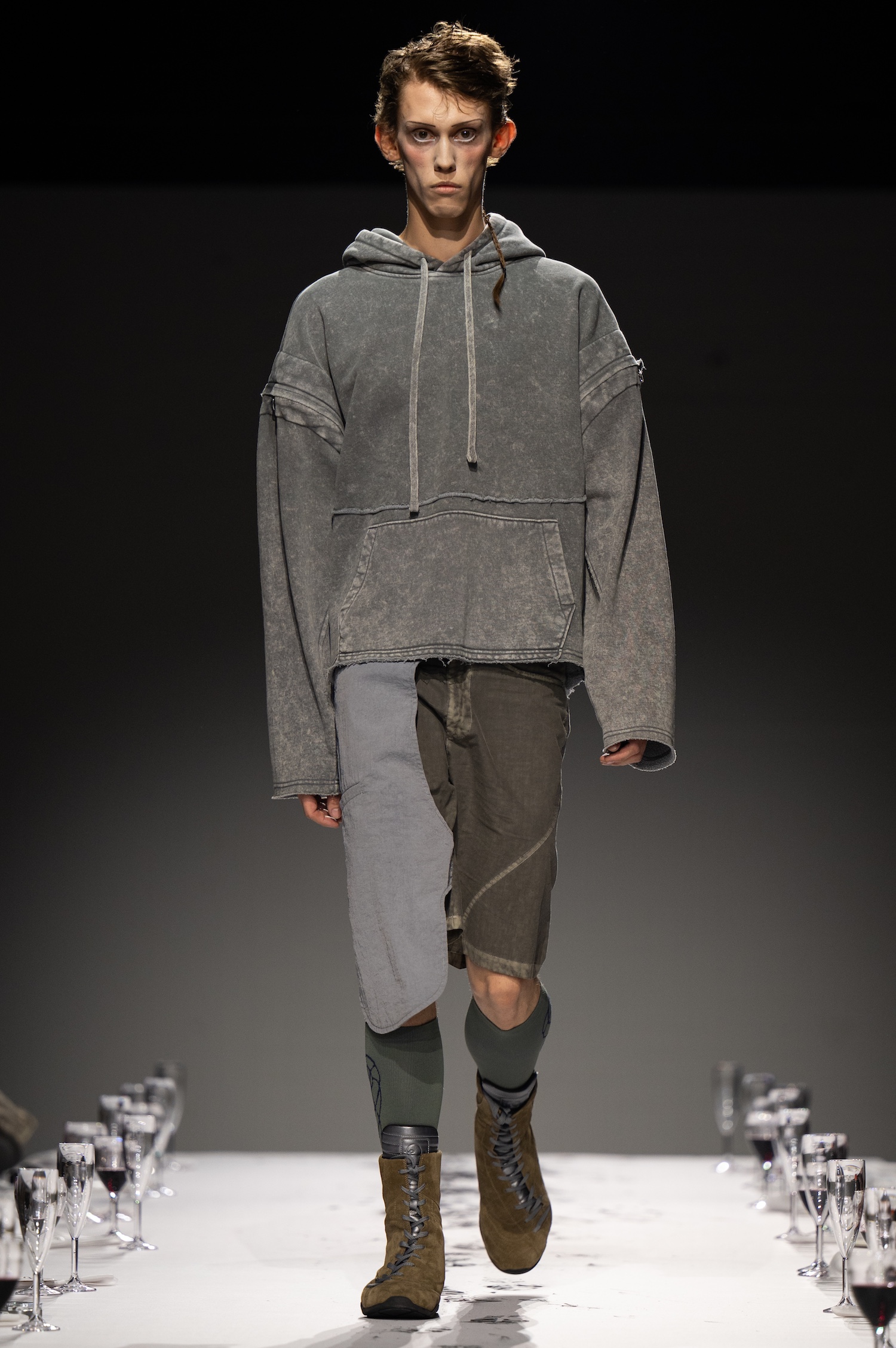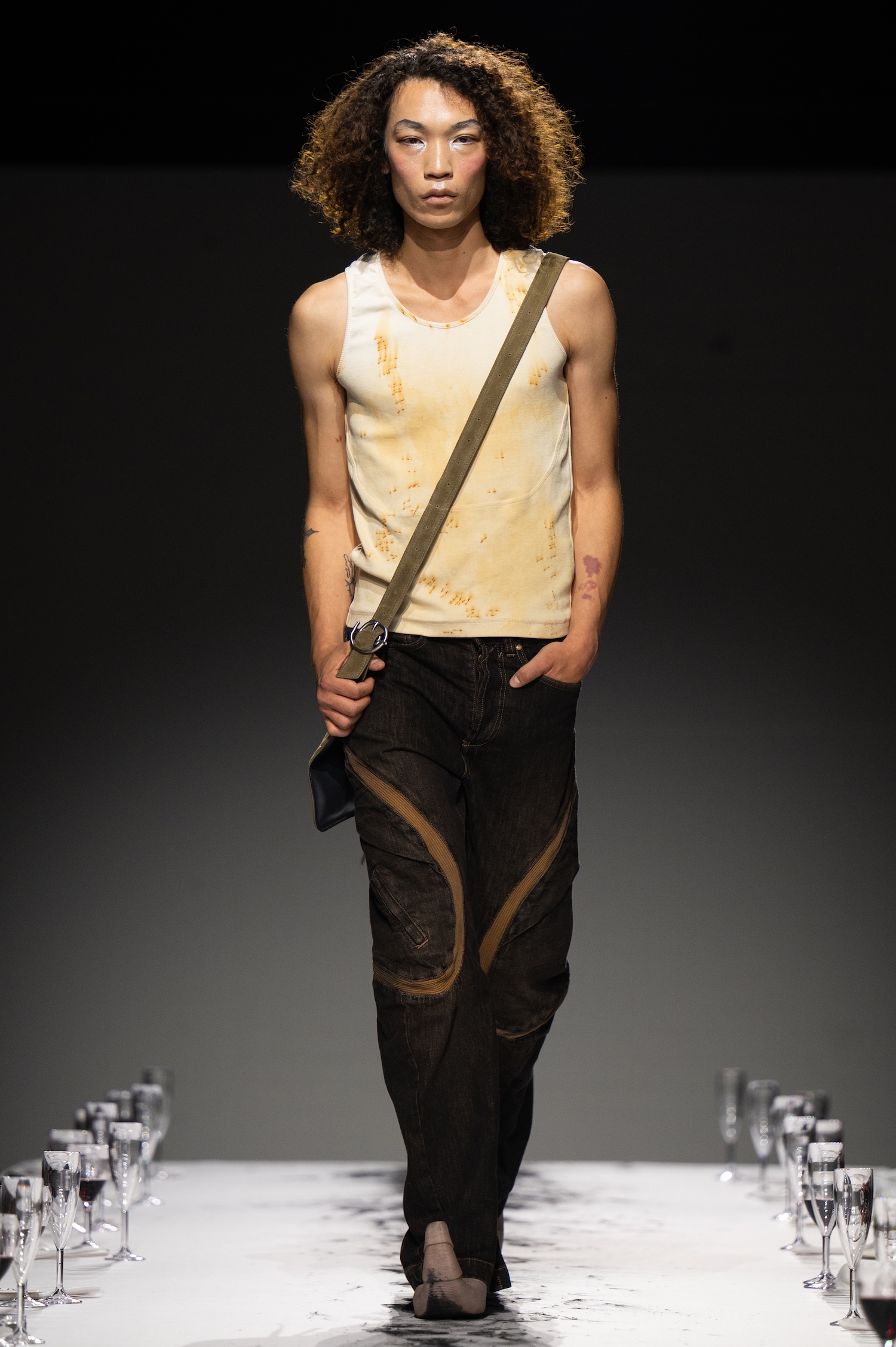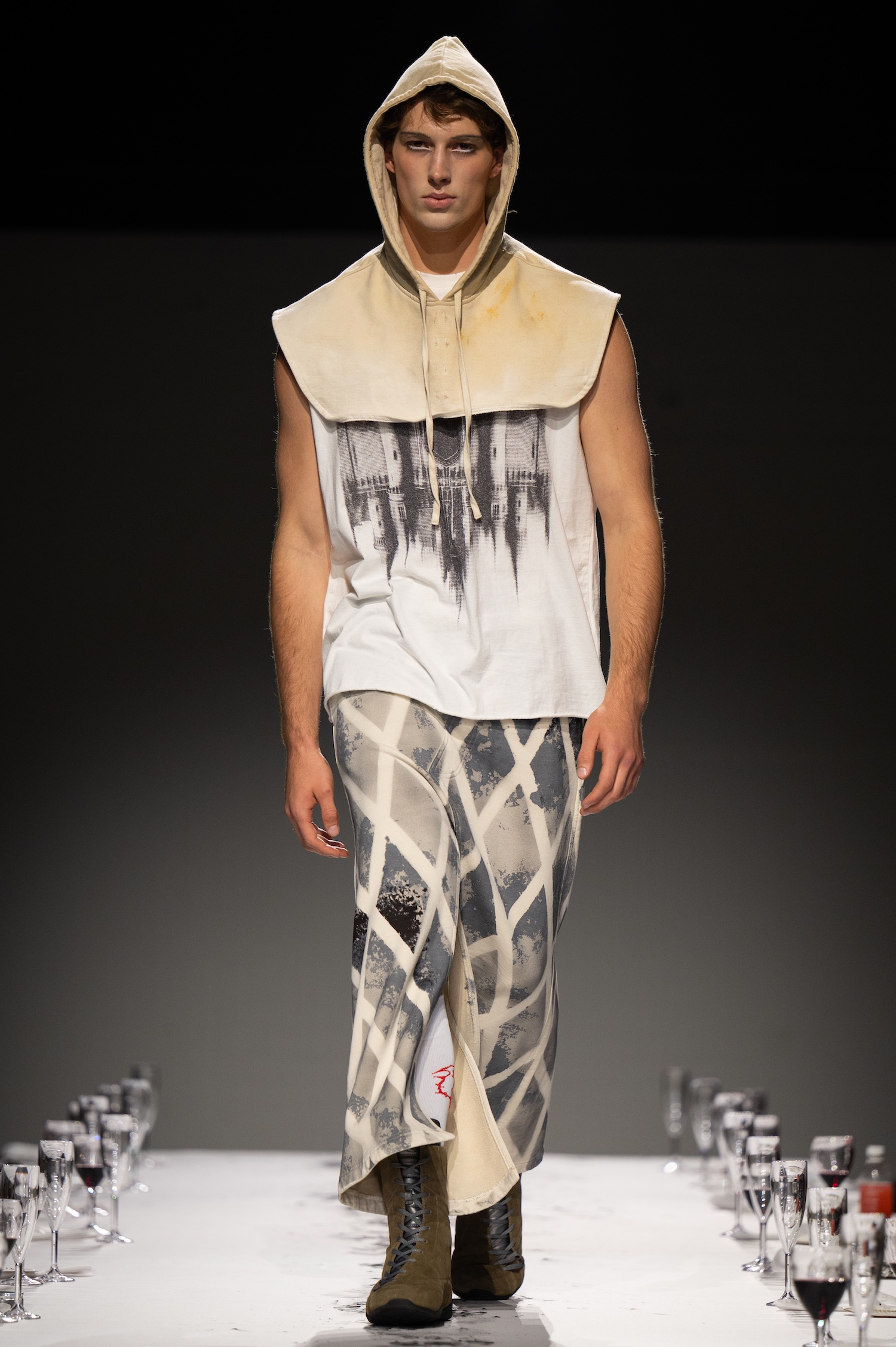 这一季,Lueder 带来了一个晚宴派对——「Convivium」,即古罗马的盛宴。走道上散落着破碎的红酒杯,延伸至一张铺着白色桌布的长餐桌,而餐桌本身也成为了 T 台。Lueder 的设计世界过去一直深受深厚的历史与神话背景启发,如中世纪轮廓、民间服饰和神话传说等元素。这次春夏系列在此基础上继续延续了她的叙事风格,同时融入了 Baz Luhrmann 导演的《罗密欧与朱丽叶》中狂欢节般的氛围。系列中的细节元素,如弯曲的妖精鞋和披风式斗篷,强烈地展示了这一灵感。