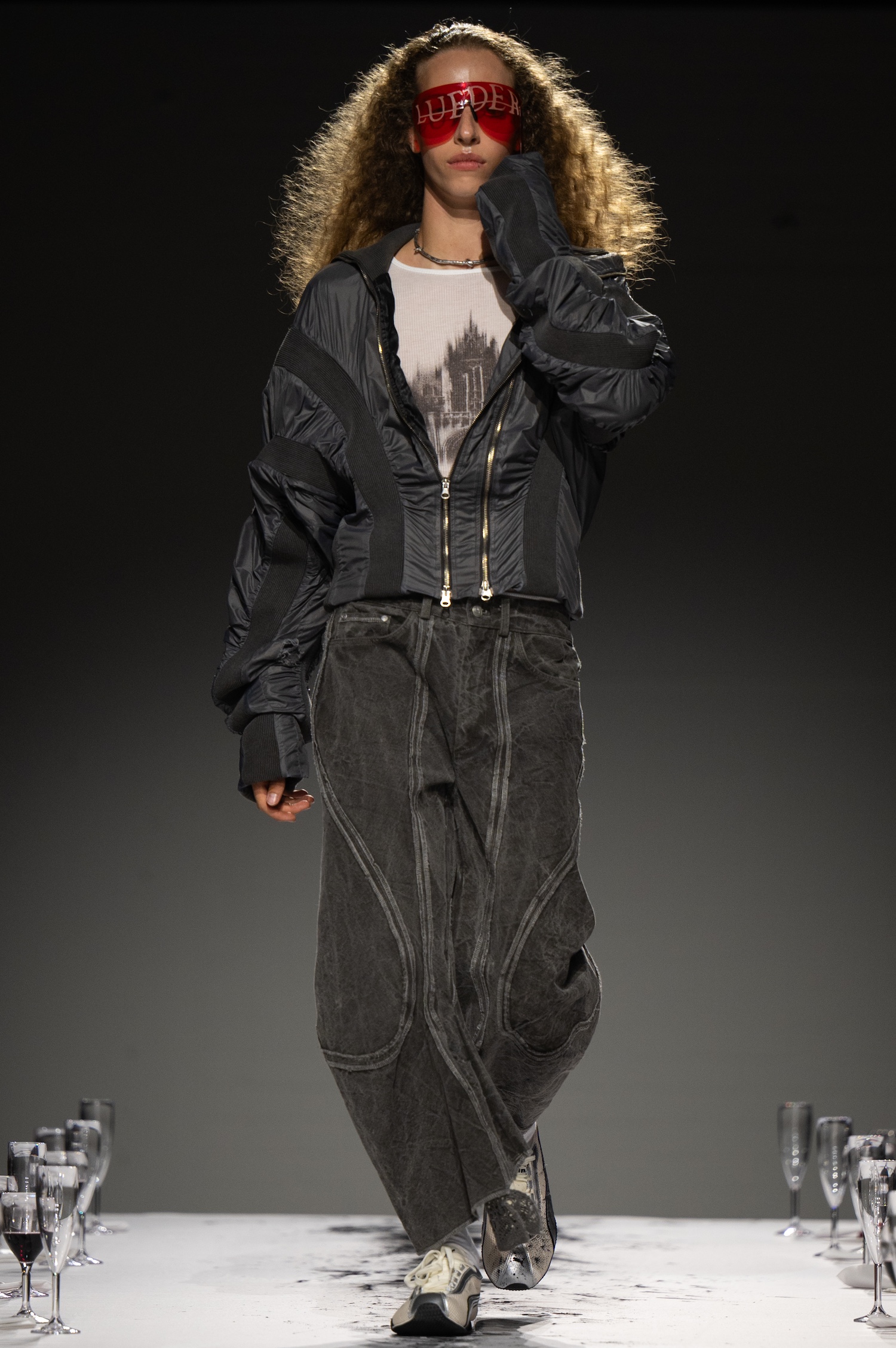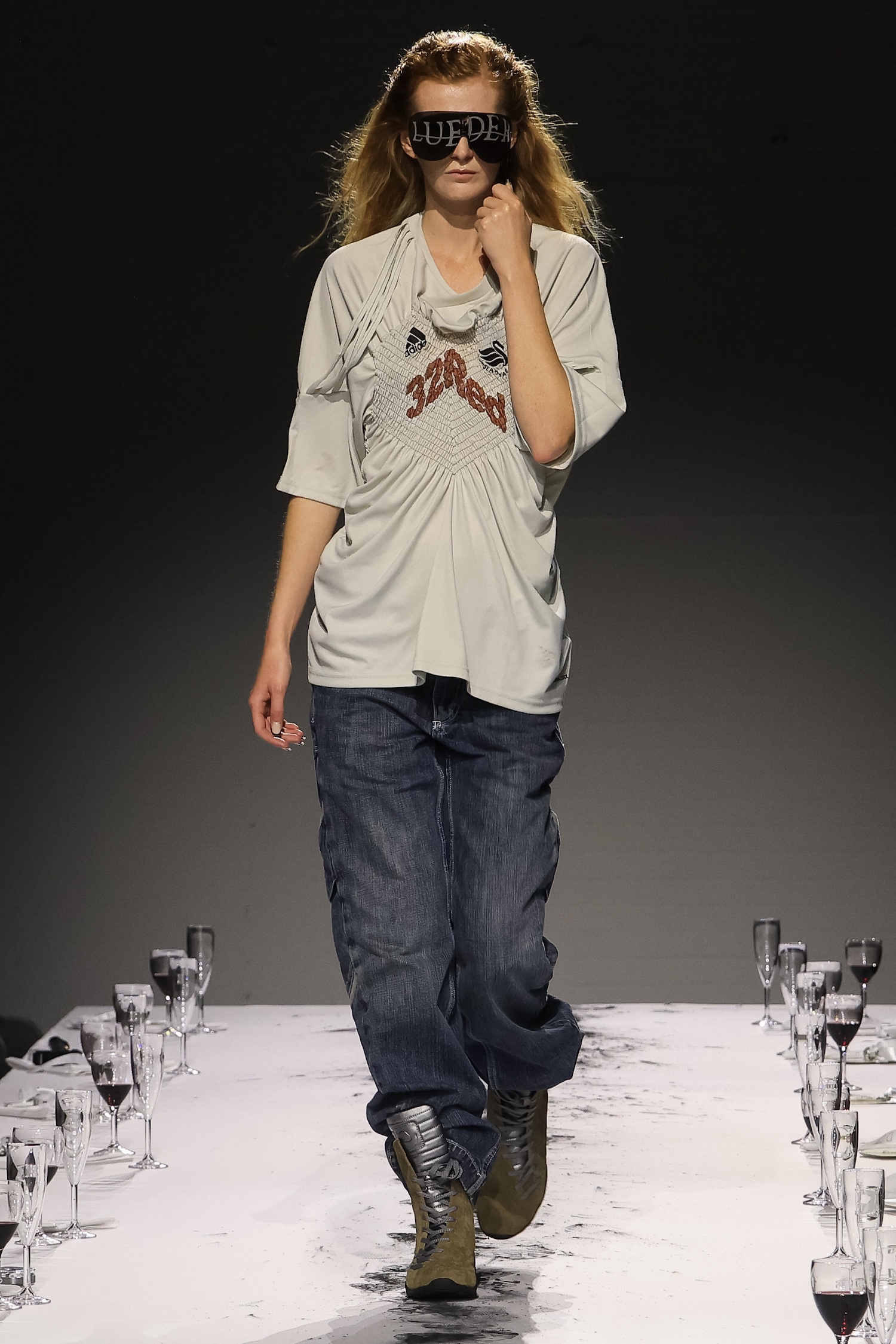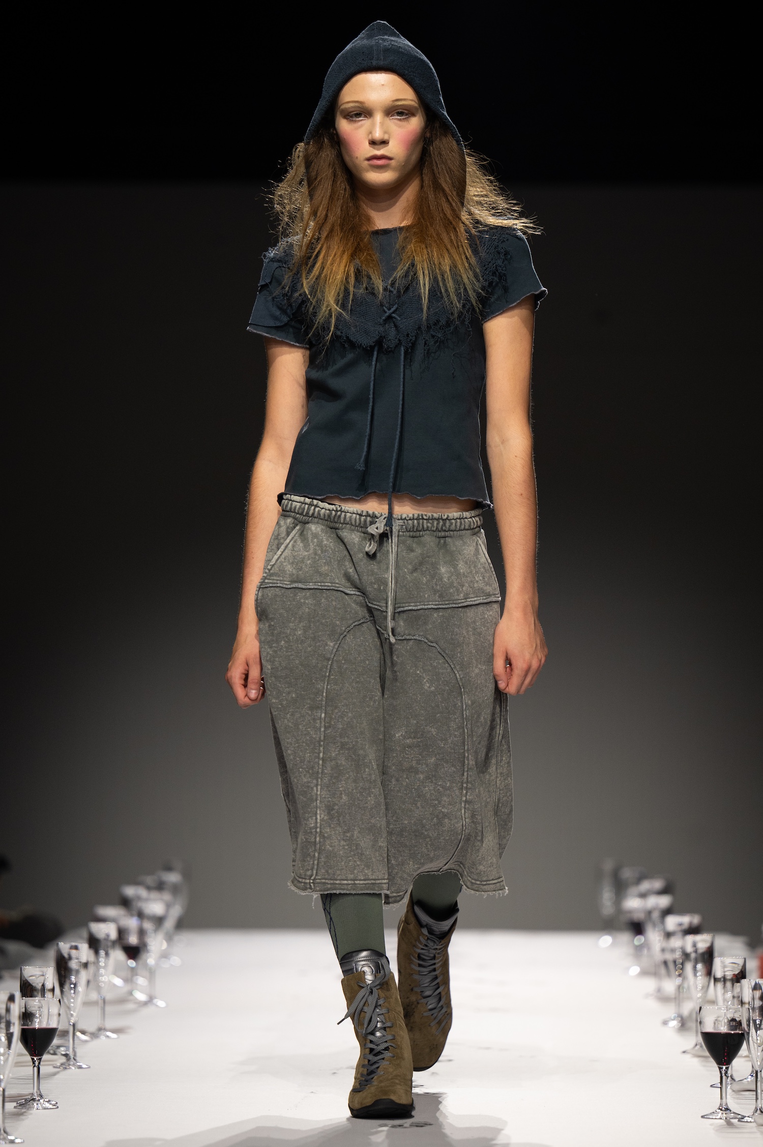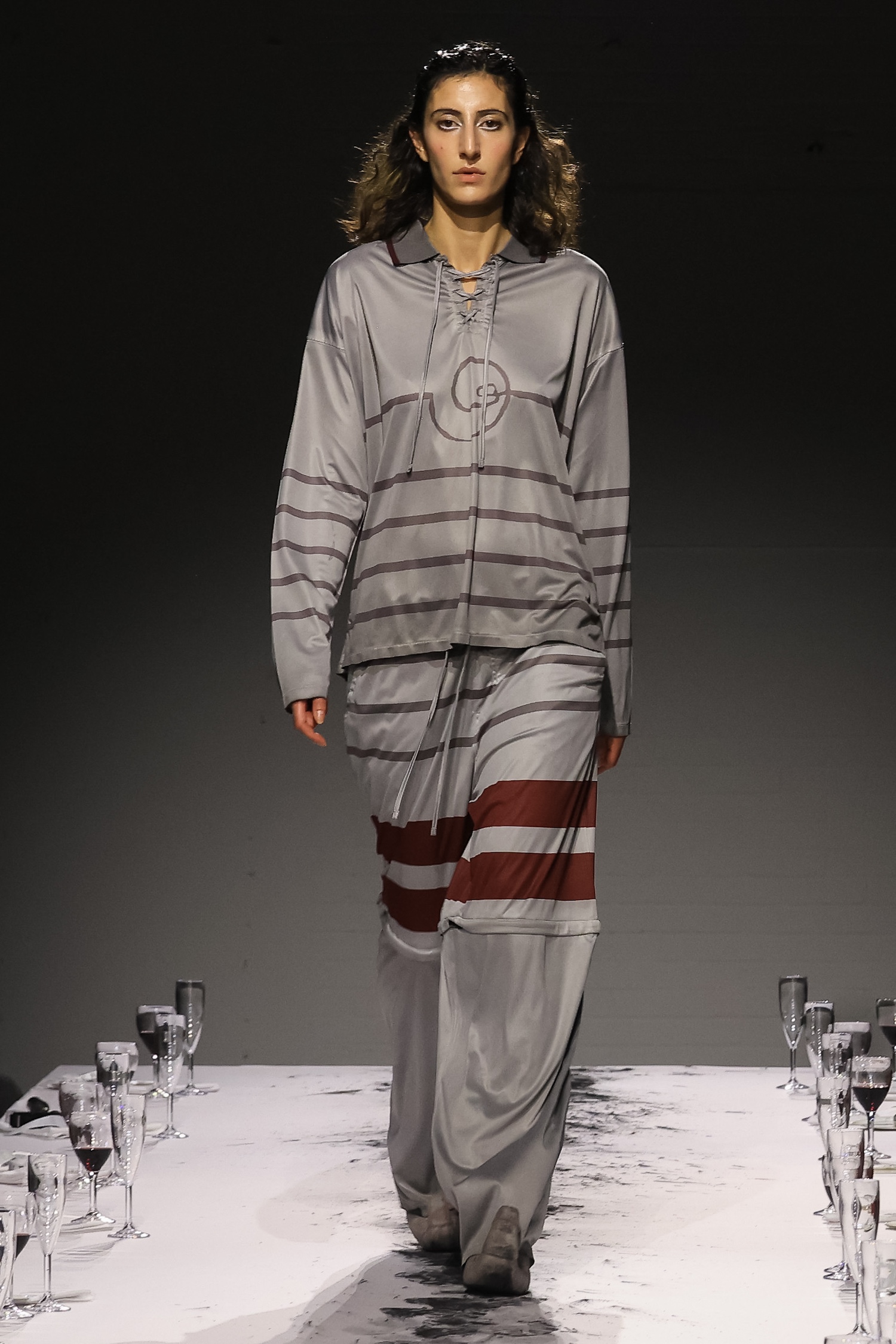 这一季,Lueder 带来了一个晚宴派对——「Convivium」,即古罗马的盛宴。走道上散落着破碎的红酒杯,延伸至一张铺着白色桌布的长餐桌,而餐桌本身也成为了 T 台。Lueder 的设计世界过去一直深受深厚的历史与神话背景启发,如中世纪轮廓、民间服饰和神话传说等元素。这次春夏系列在此基础上继续延续了她的叙事风格,同时融入了 Baz Luhrmann 导演的《罗密欧与朱丽叶》中狂欢节般的氛围。系列中的细节元素,如弯曲的妖精鞋和披风式斗篷,强烈地展示了这一灵感。