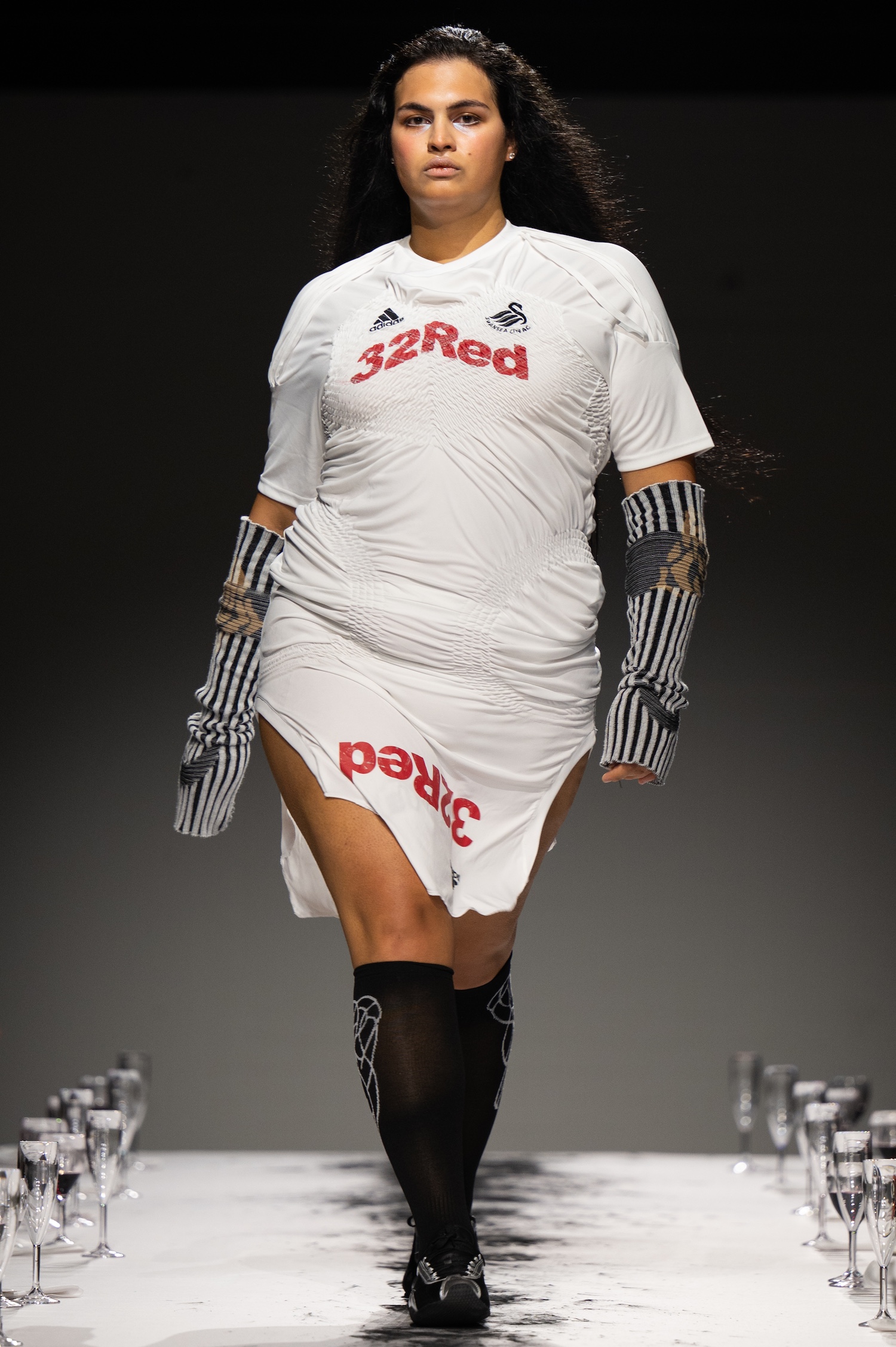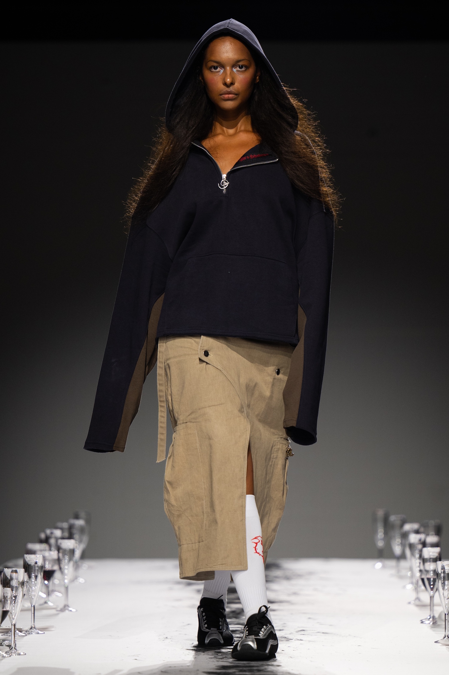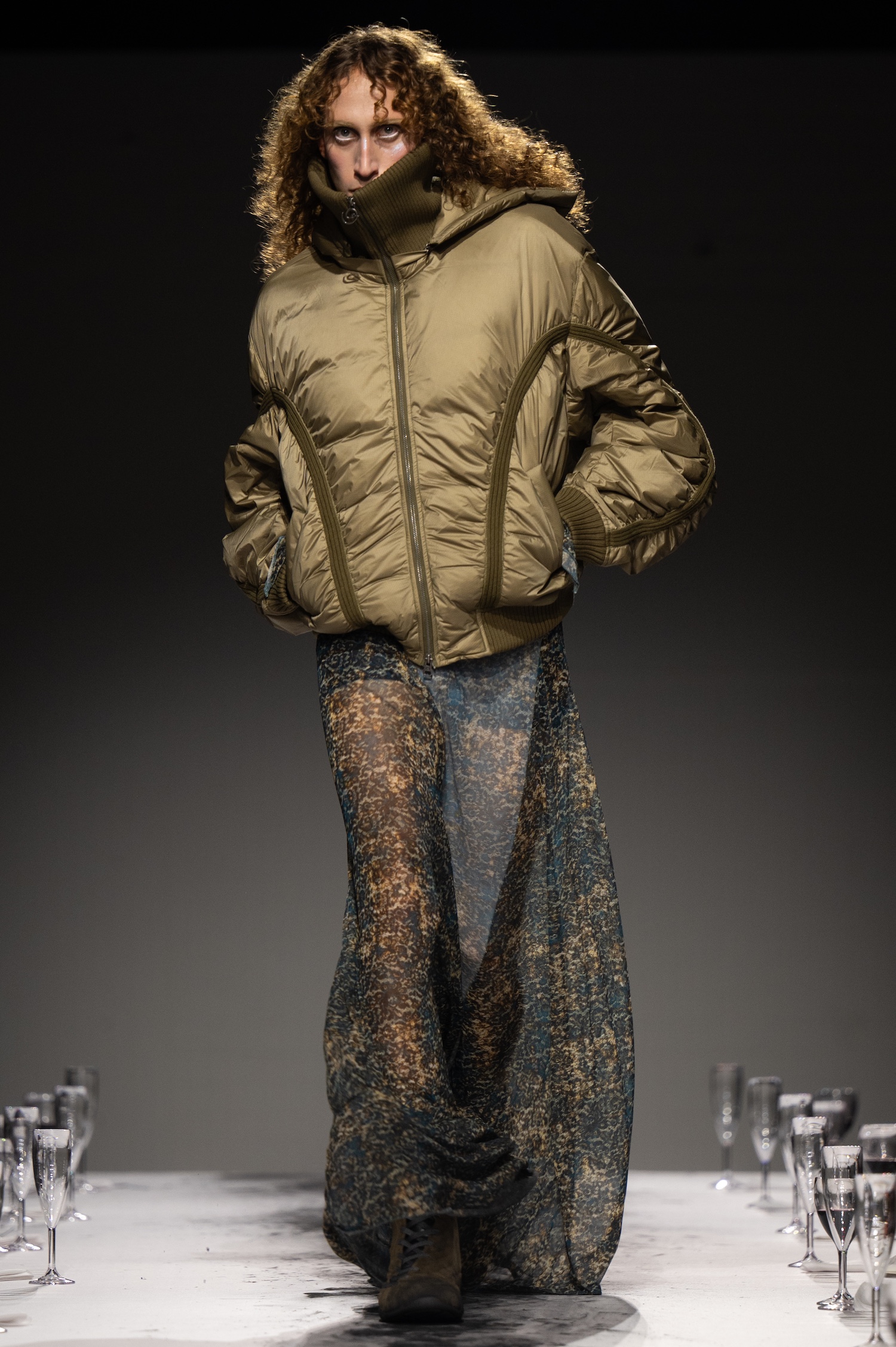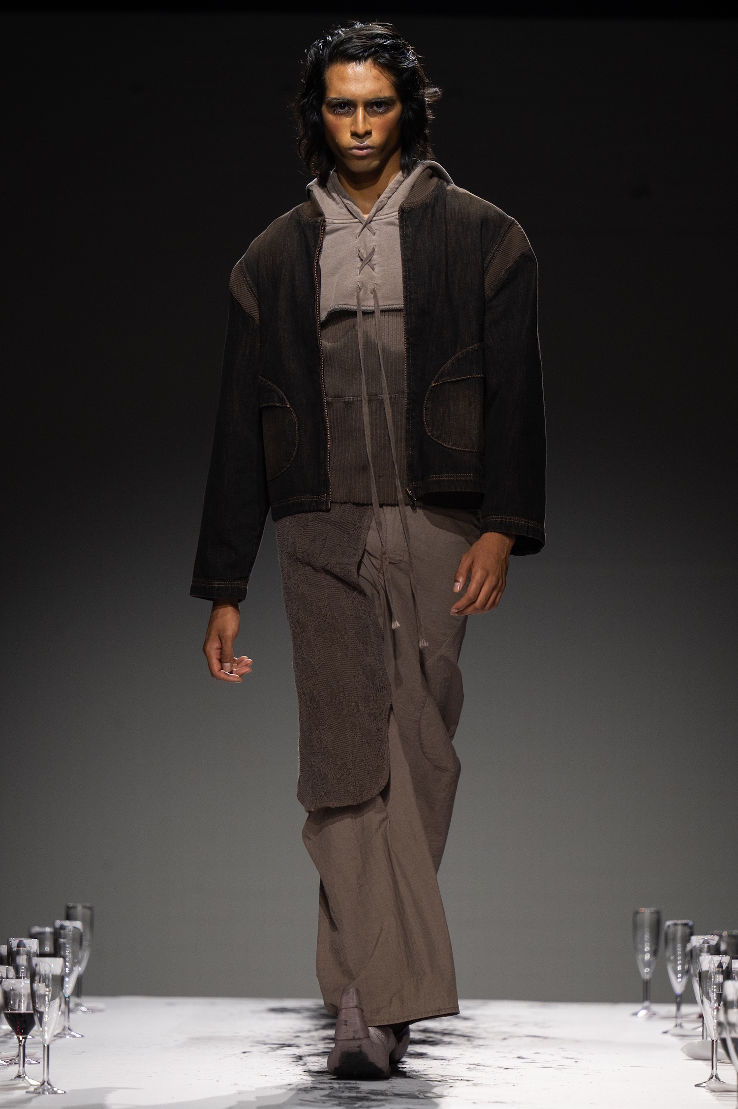 这一季,Lueder 带来了一个晚宴派对——「Convivium」,即古罗马的盛宴。走道上散落着破碎的红酒杯,延伸至一张铺着白色桌布的长餐桌,而餐桌本身也成为了 T 台。Lueder 的设计世界过去一直深受深厚的历史与神话背景启发,如中世纪轮廓、民间服饰和神话传说等元素。这次春夏系列在此基础上继续延续了她的叙事风格,同时融入了 Baz Luhrmann 导演的《罗密欧与朱丽叶》中狂欢节般的氛围。系列中的细节元素,如弯曲的妖精鞋和披风式斗篷,强烈地展示了这一灵感。