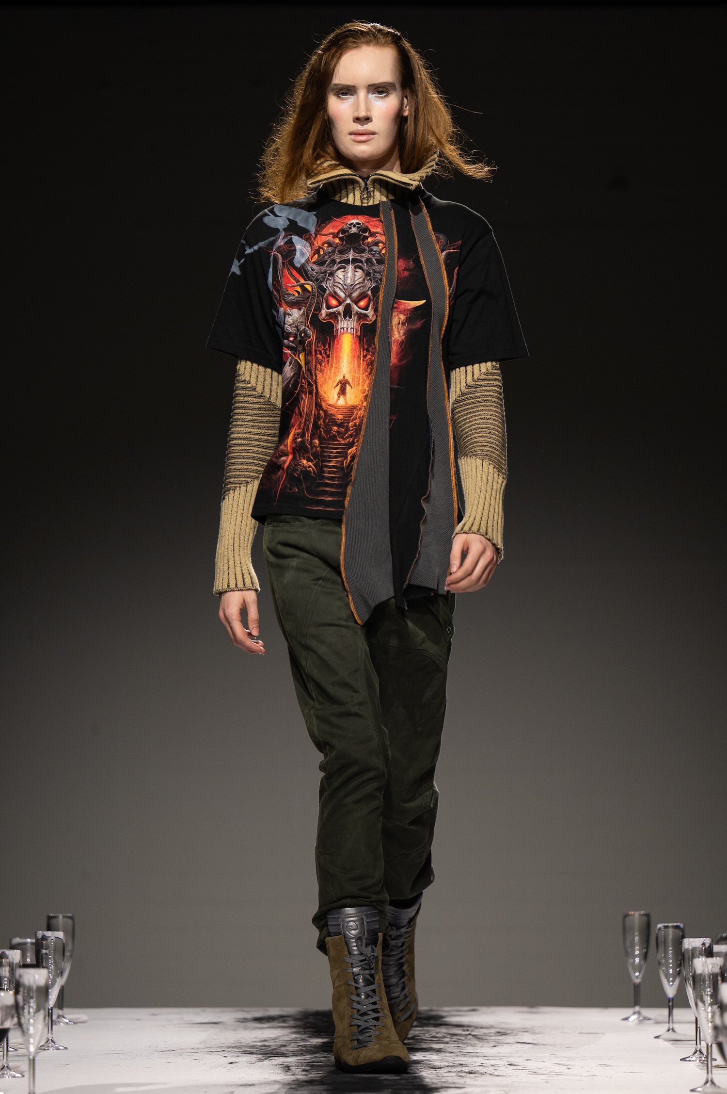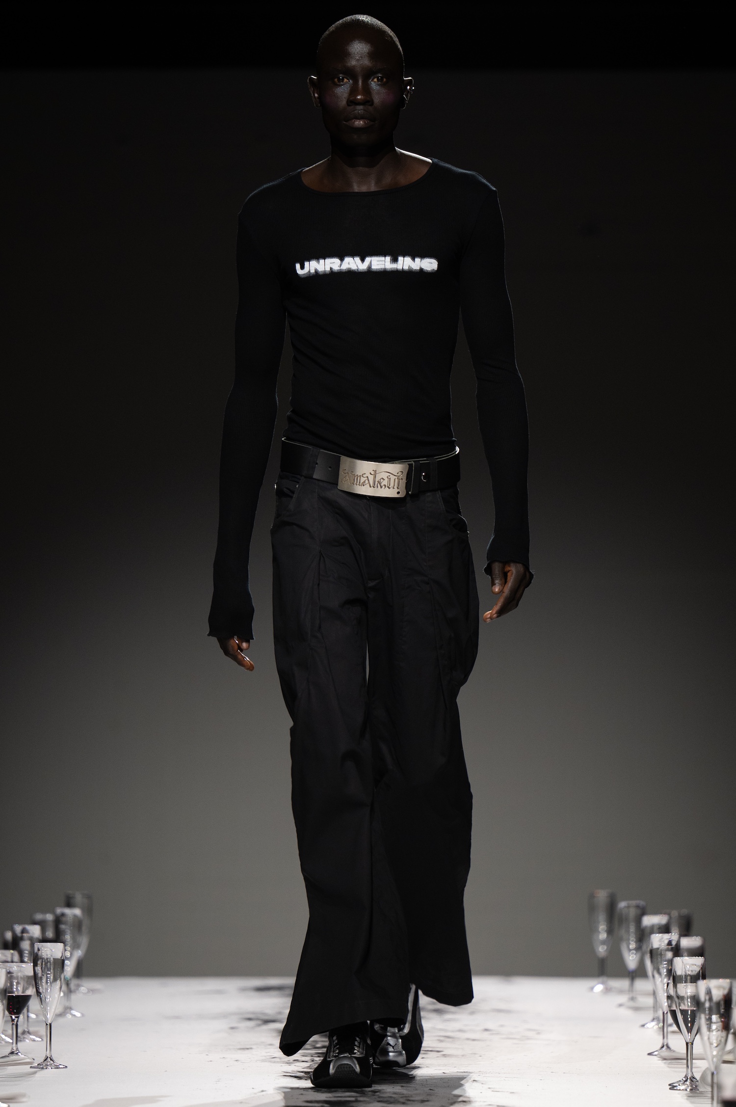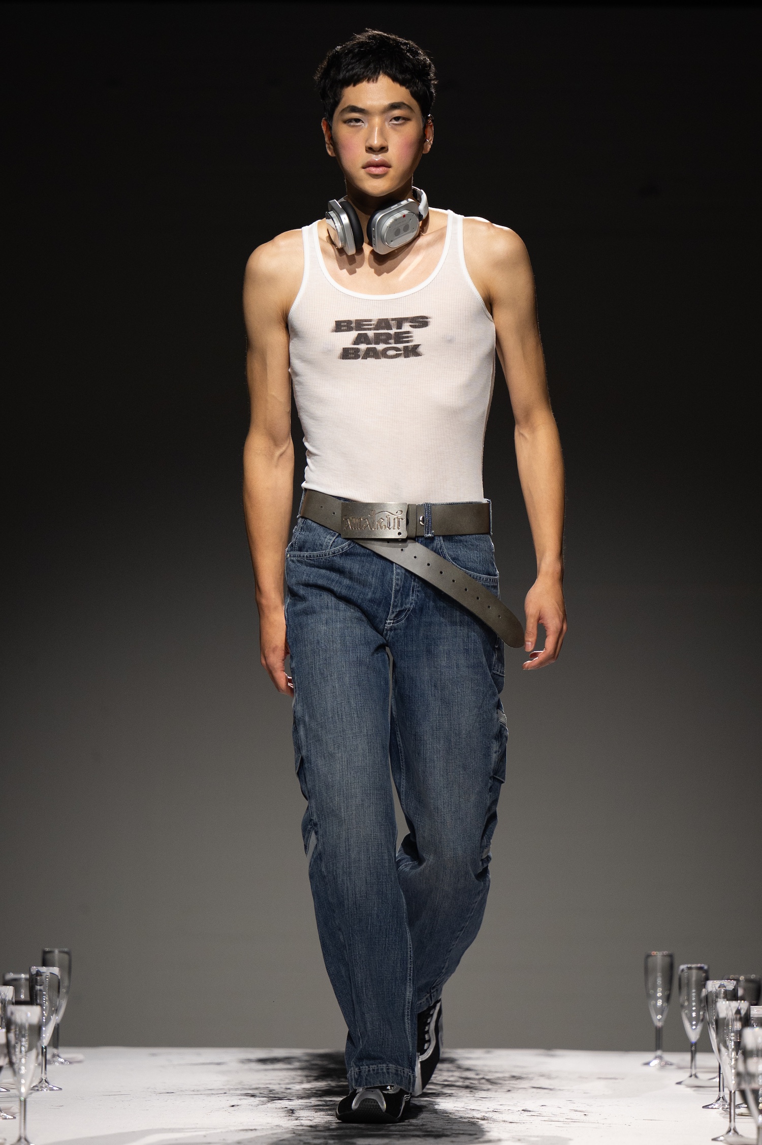 然而,这不仅仅停留在幻想层面,它也标志着 Lueder 设计风格的明显转变,更加注重可穿性。比如,一款黑色长袖图形 T 恤,上面写着「unraveling」(解开),搭配牛仔裤和带扣腰带,展现出具有街头风格的实用设计。同样设计感十足的「Beats Are Back」字母背心也表明,吕德正在走向更加贴近街头潮流的方向。