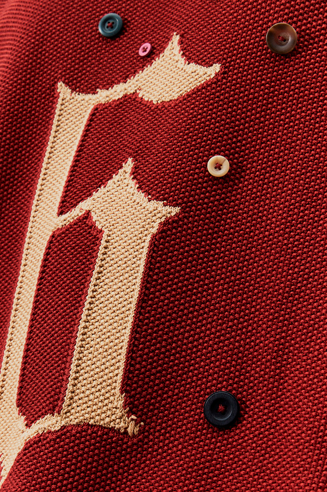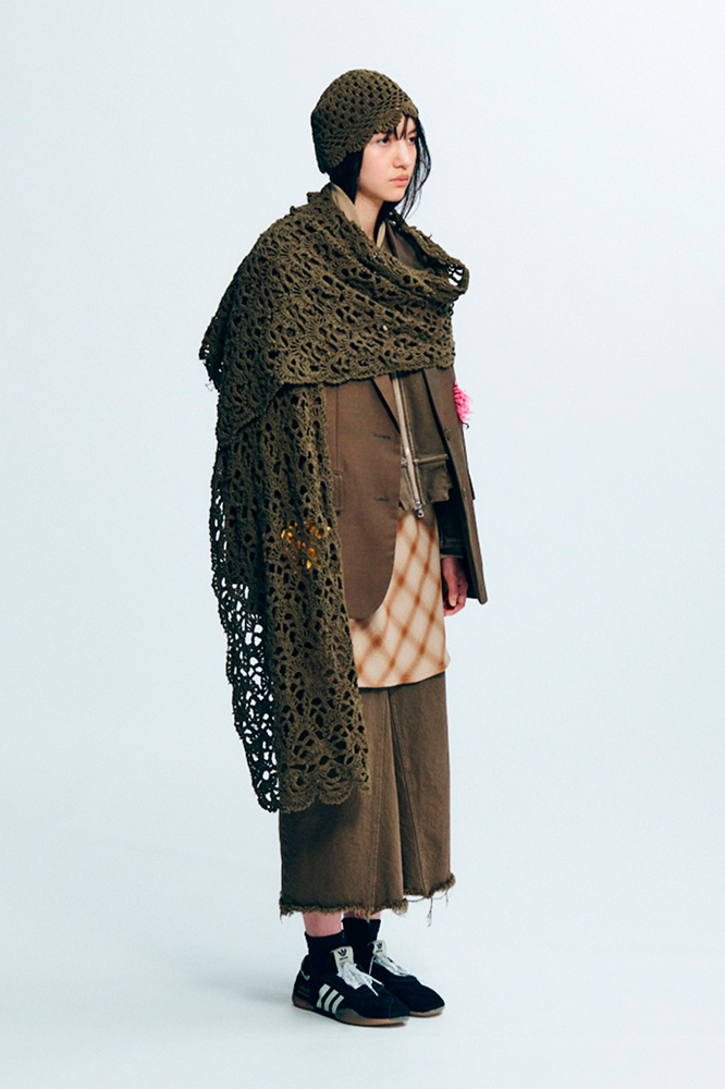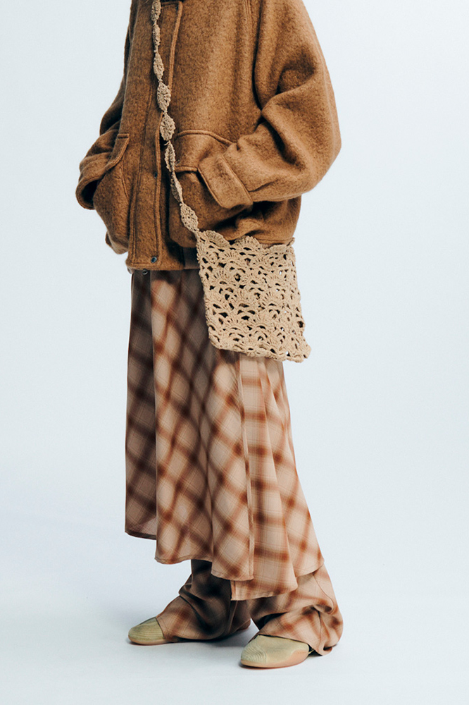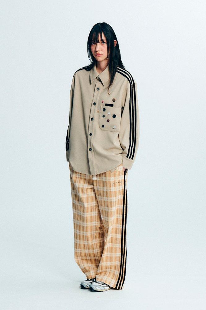 配套服饰延续了这种重新思考的精神。天鹅绒运动夹克、超大华达呢外套和水洗格纹长裤等单品融合了多种元素,展现出对运动传统的重新诠释。色彩在温暖的中性色、漂白芥末黄和水洗黑色之间变换,营造出褪色的复古效果。簇拥的纽扣和别针增添了更多细节感。一件铁锈红色超大针织衫上织有数字「6」——标志着此次合作的篇章。