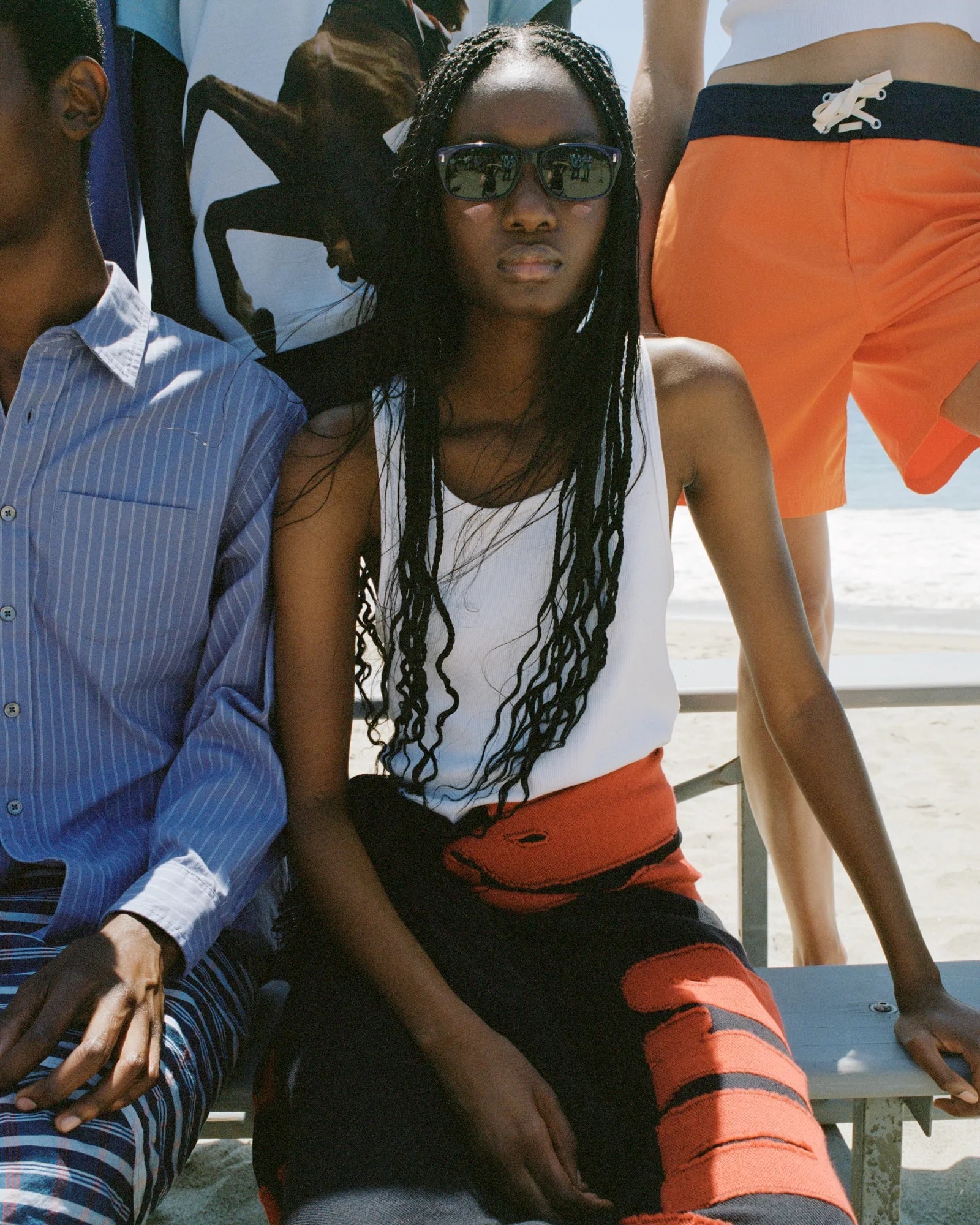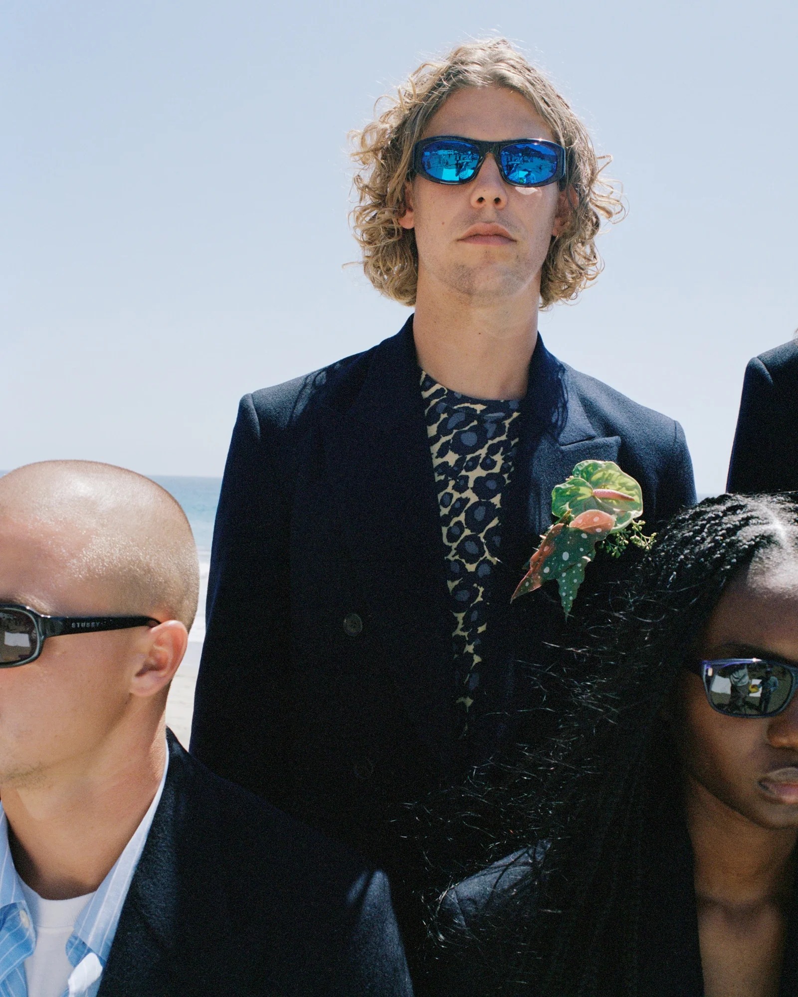 整体造型在「披头族」搭配的框架下融入了 Wales Bonner 钟爱的野性元素,因此流苏短裤、铆钉水洗牛仔裤、豹纹针织衫,深棕色皮革棒球夹克与印花真丝 Polo 衫等单品应运而生,同时还呈现采用 Loro Piana 深蓝色羊毛材质打造的双排扣西装外套。此外,该系列还包括双拉链氯丁连帽衫、品牌刺绣冲浪短裤,以及由艺术家 Peter Miles 合作设计的沙滩围裹。既保有加州阳光下的自由气息,又融入来自非洲与加勒比的文化叙事,正如品牌所言「跨越水域,祝福随潮汐而来」。据悉,该系列单品将于当地时间的 9 月 26 日登陆线上线下渠道,感兴趣的朋友不容错过。