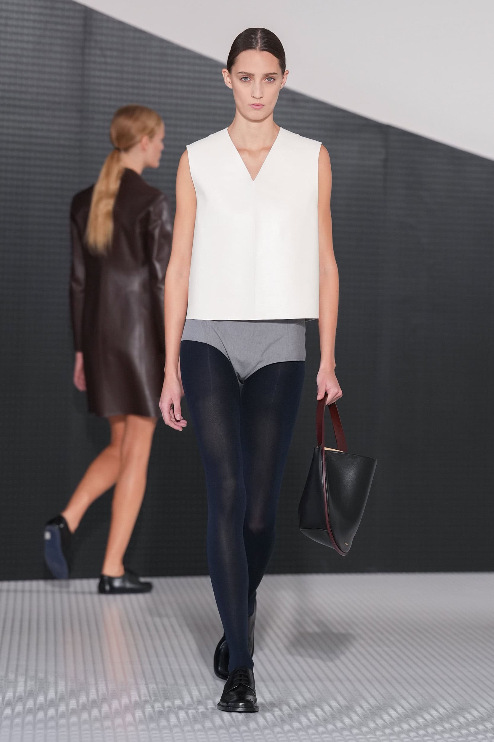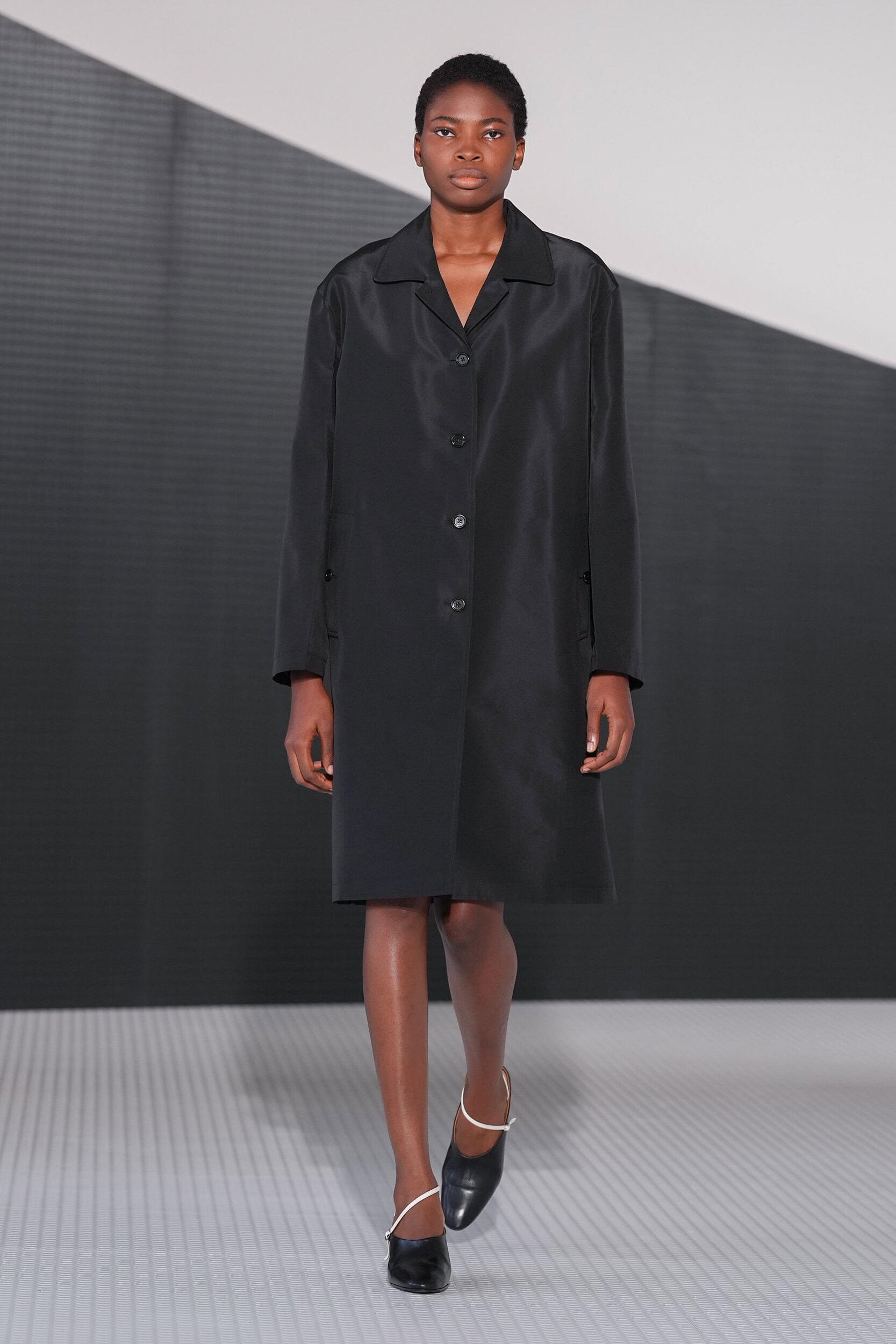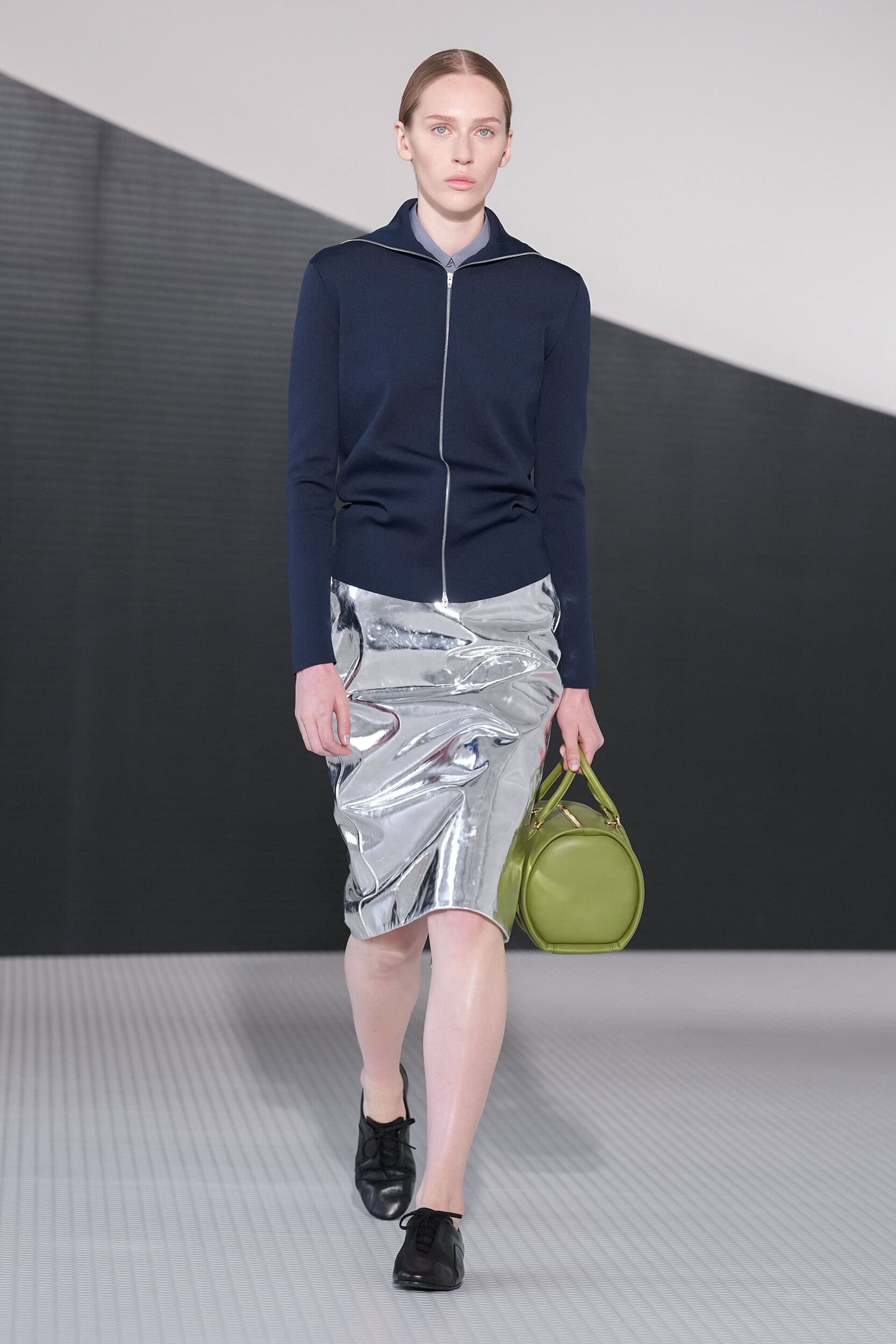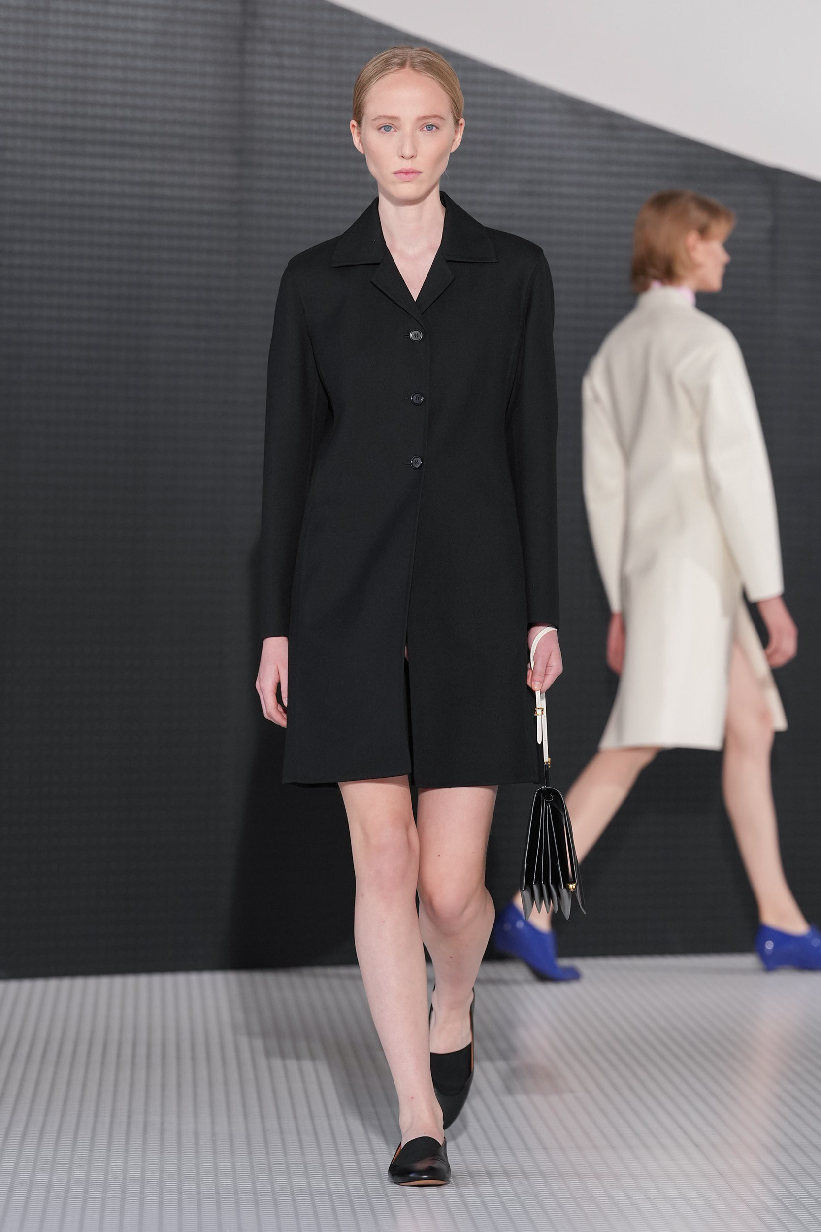 这一系列的皮革西装外套和大衣尤为出色,修身的剪裁与盒形轮廓相结合,展现了高扣设计的精致感。而几何突起的设计元素,则通过裙子、衬衫和鞋头等单品展现了Bellotti对细节的关注,灵感来源于 Wolfgang Tillmans 的弯曲纸张艺术。整体来看,尽管系列中保留了品牌一贯的极简主义精神,但 Simone Bellotti 巧妙地加入了些许趣味与实验性,让这些经典单品焕发出新的生命力。