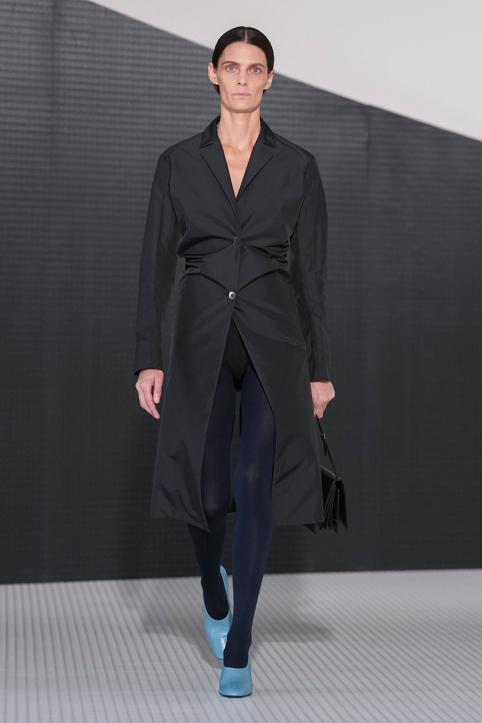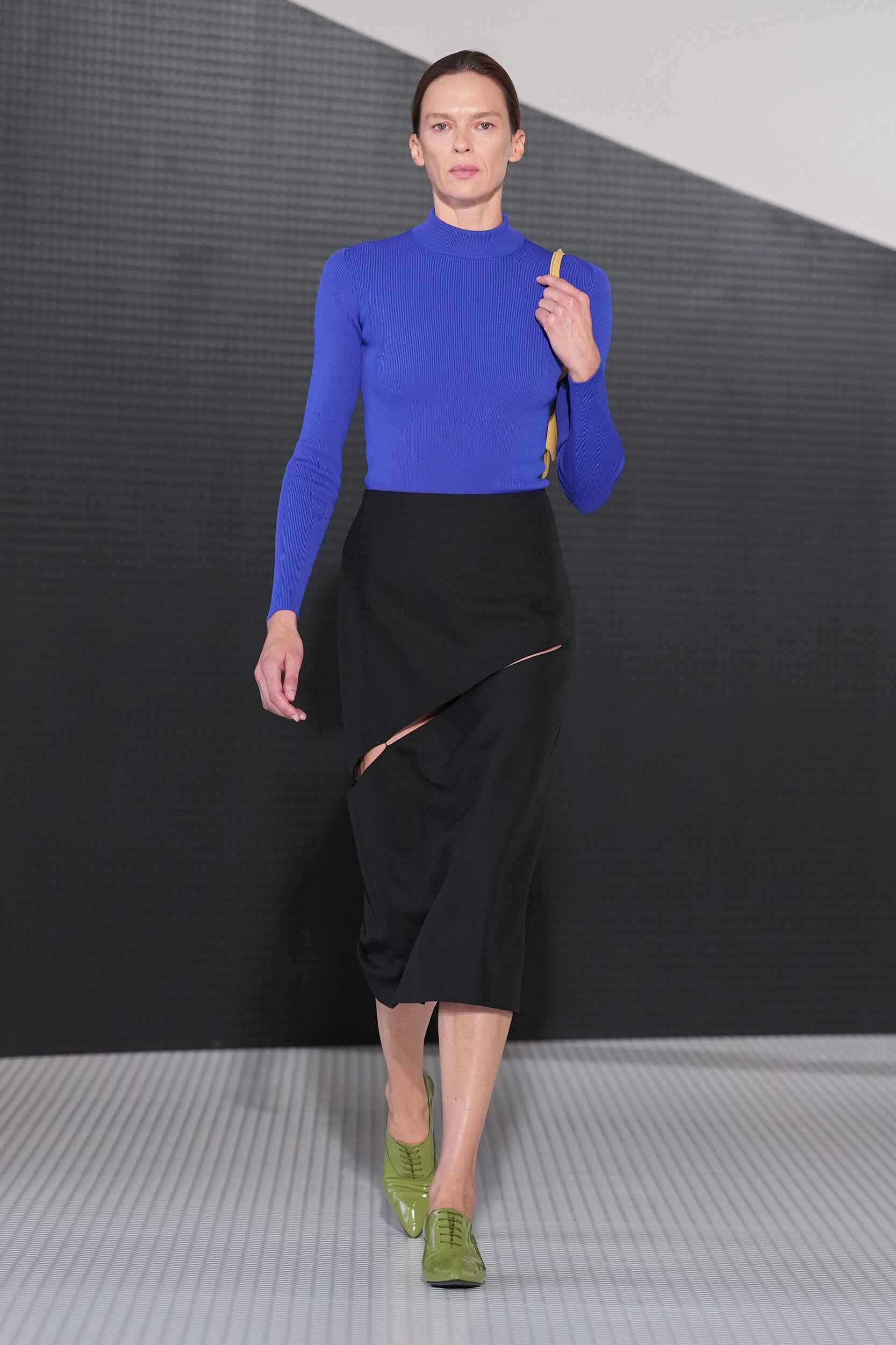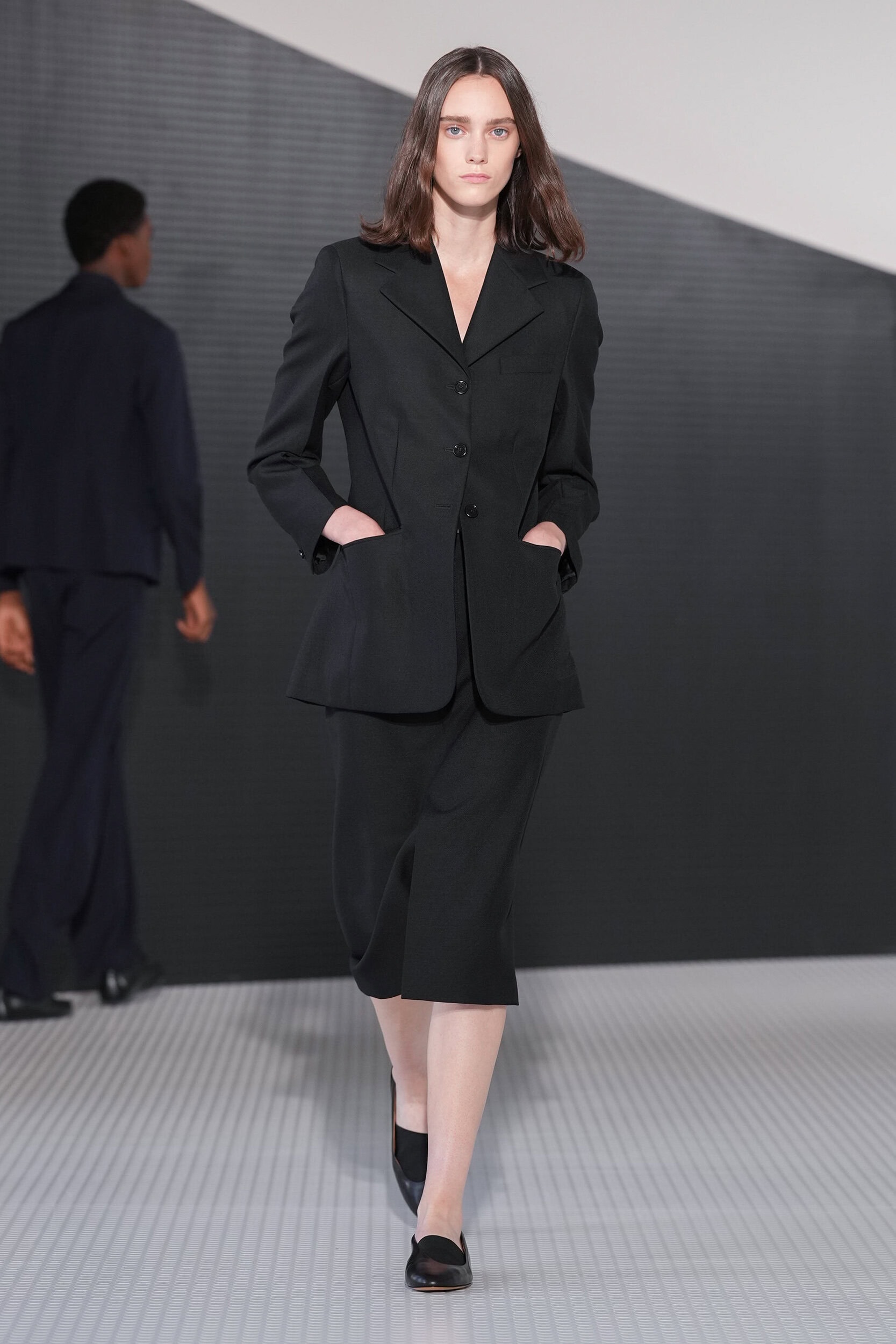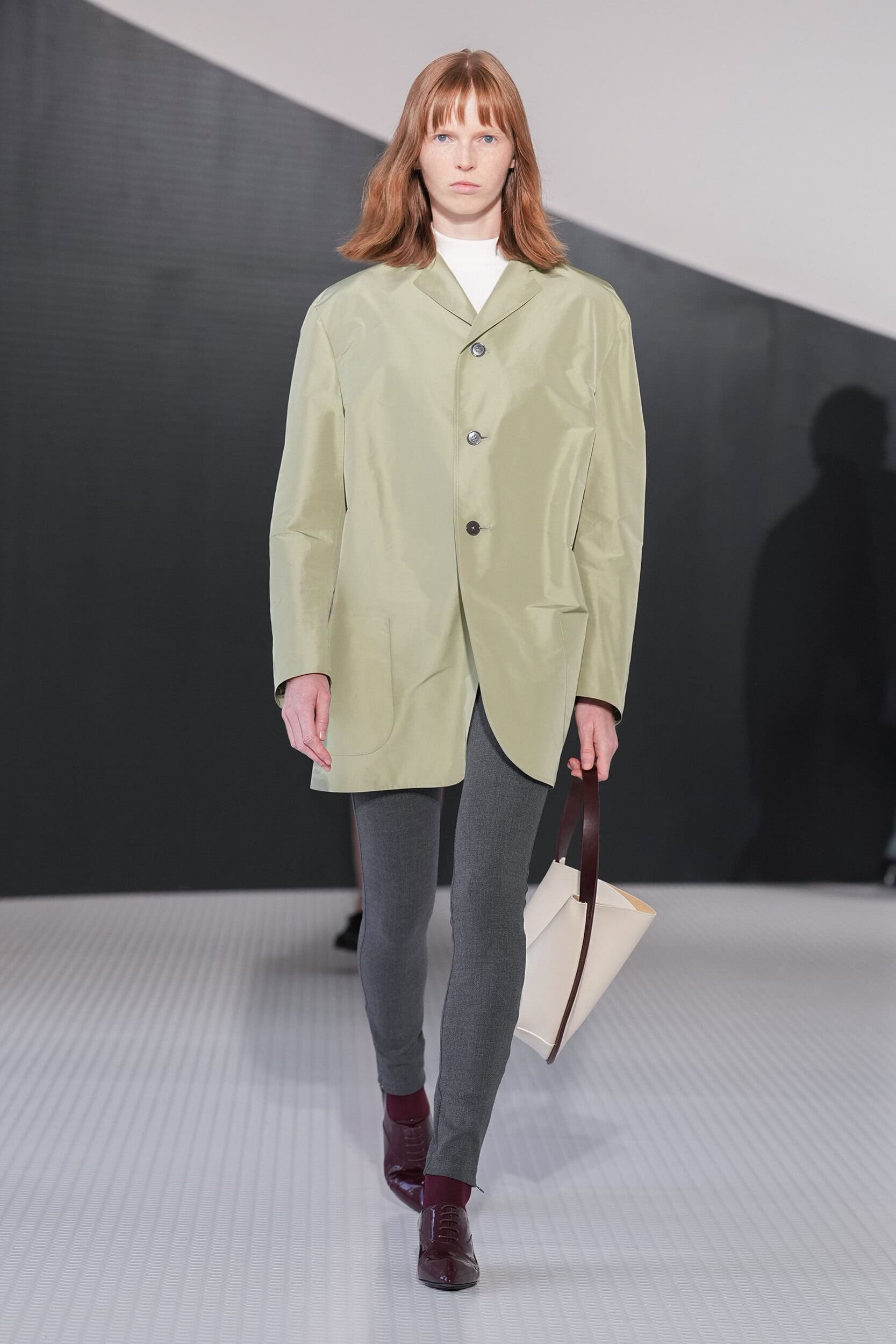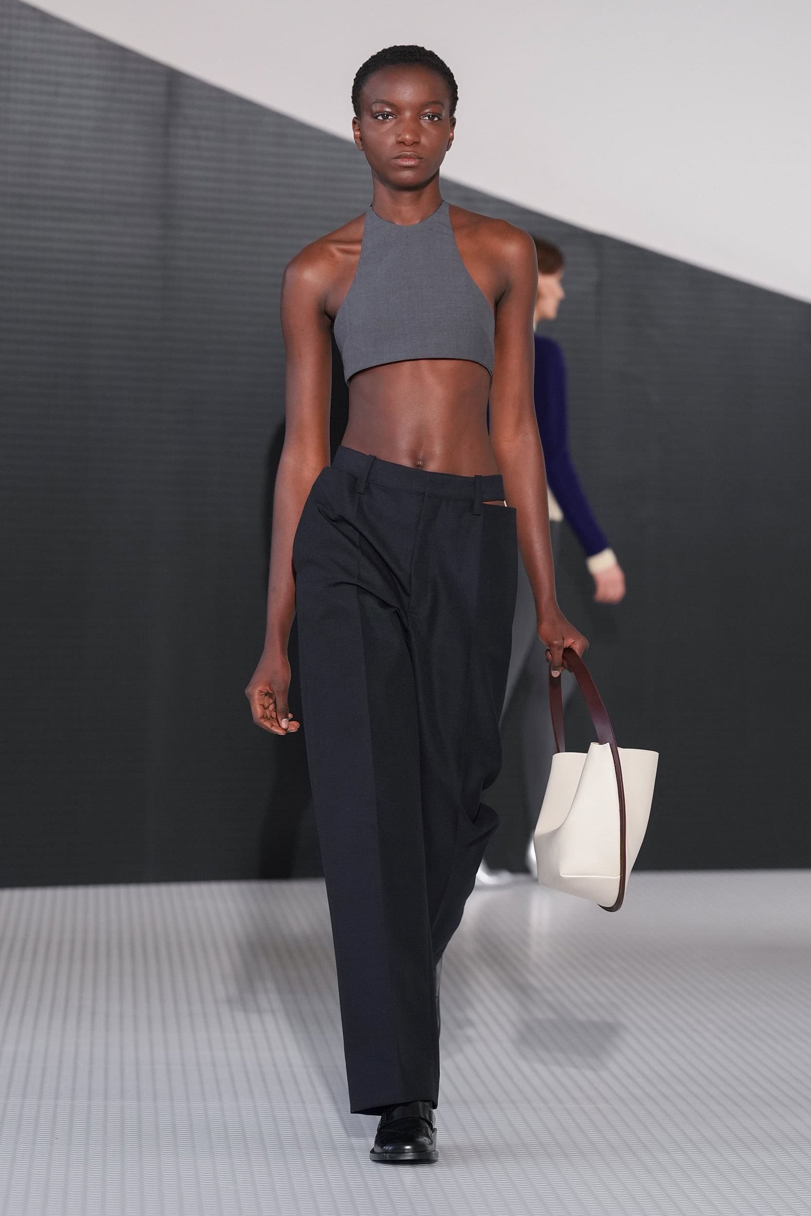 这一系列的皮革西装外套和大衣尤为出色,修身的剪裁与盒形轮廓相结合,展现了高扣设计的精致感。而几何突起的设计元素,则通过裙子、衬衫和鞋头等单品展现了Bellotti对细节的关注,灵感来源于 Wolfgang Tillmans 的弯曲纸张艺术。整体来看,尽管系列中保留了品牌一贯的极简主义精神,但 Simone Bellotti 巧妙地加入了些许趣味与实验性,让这些经典单品焕发出新的生命力。