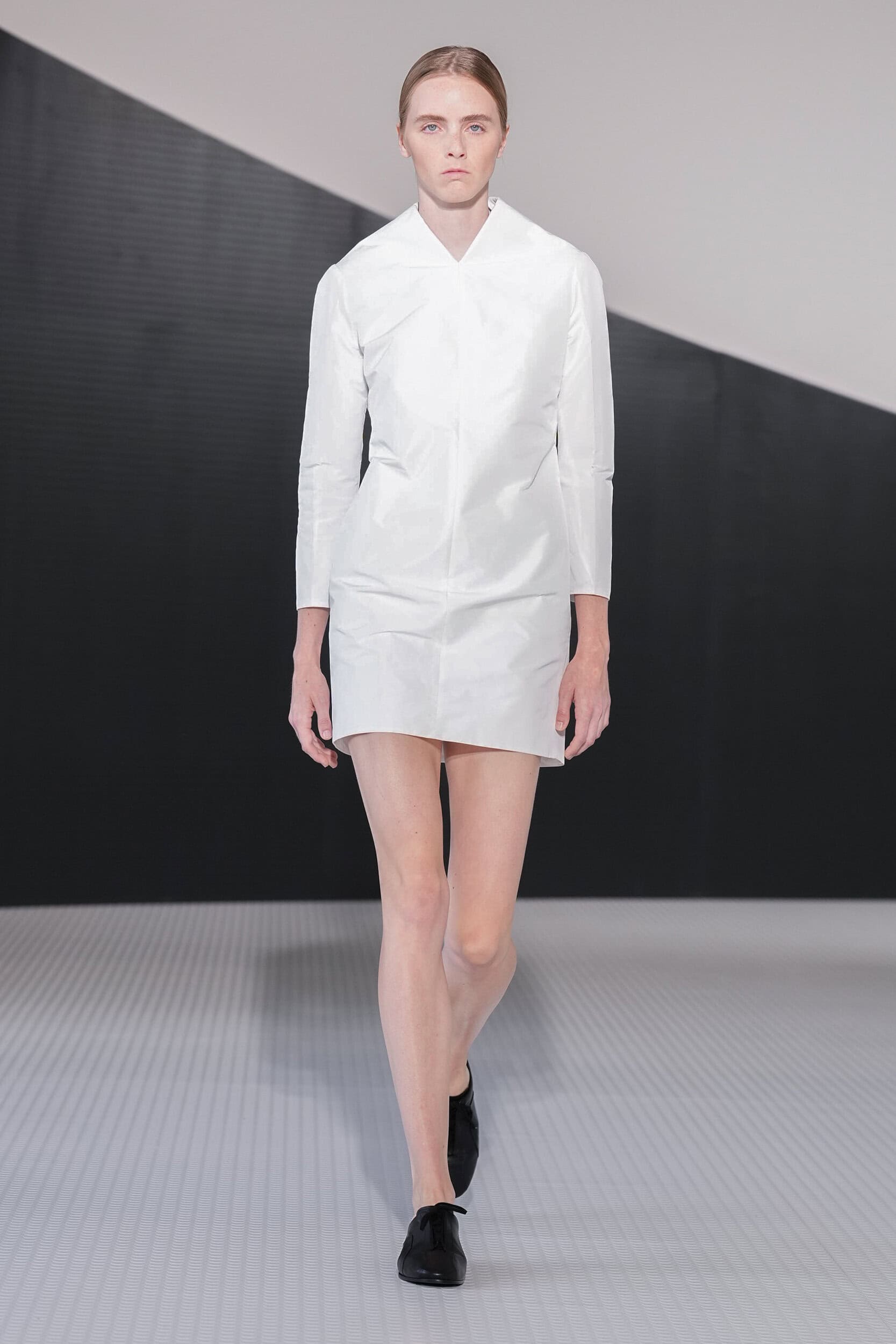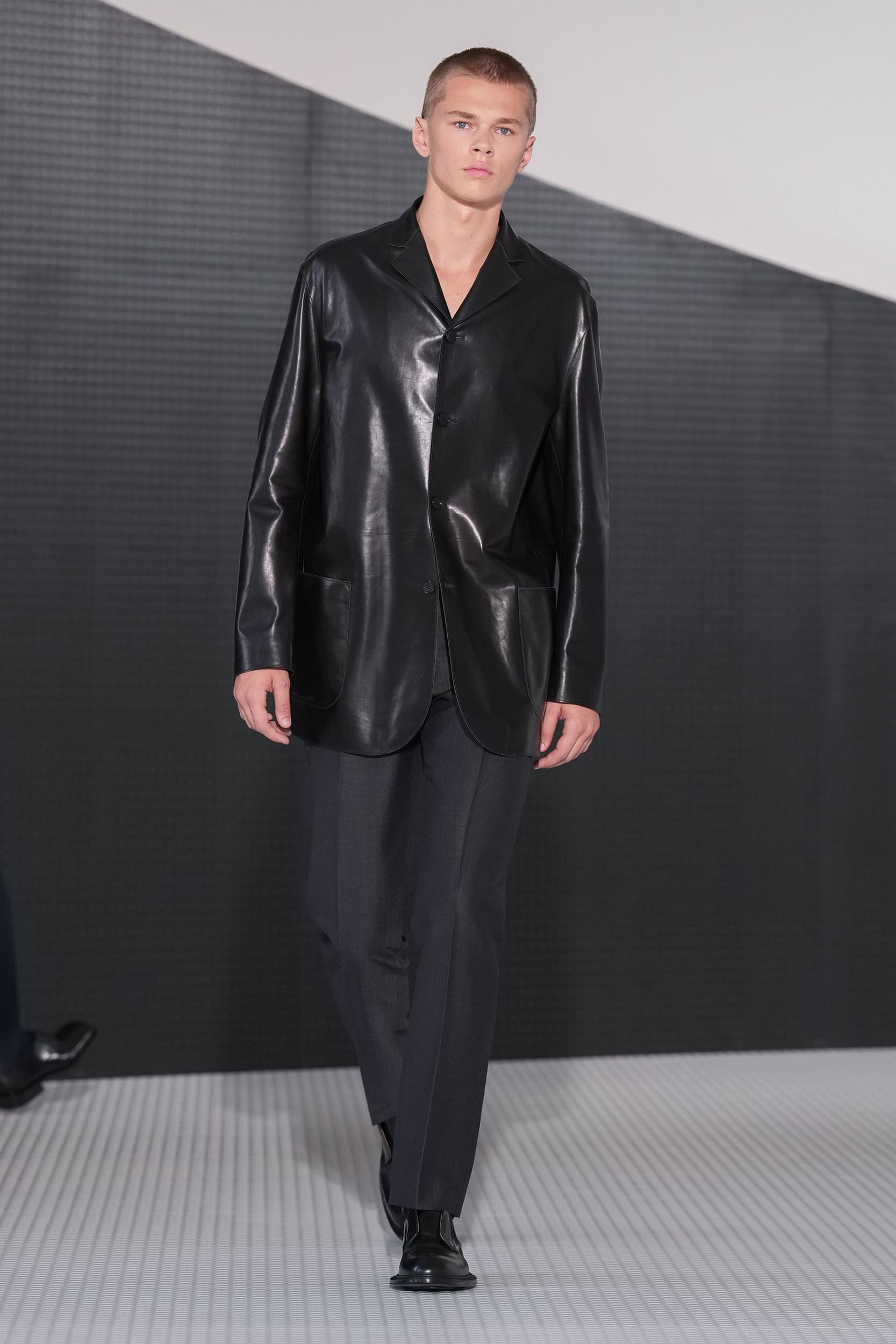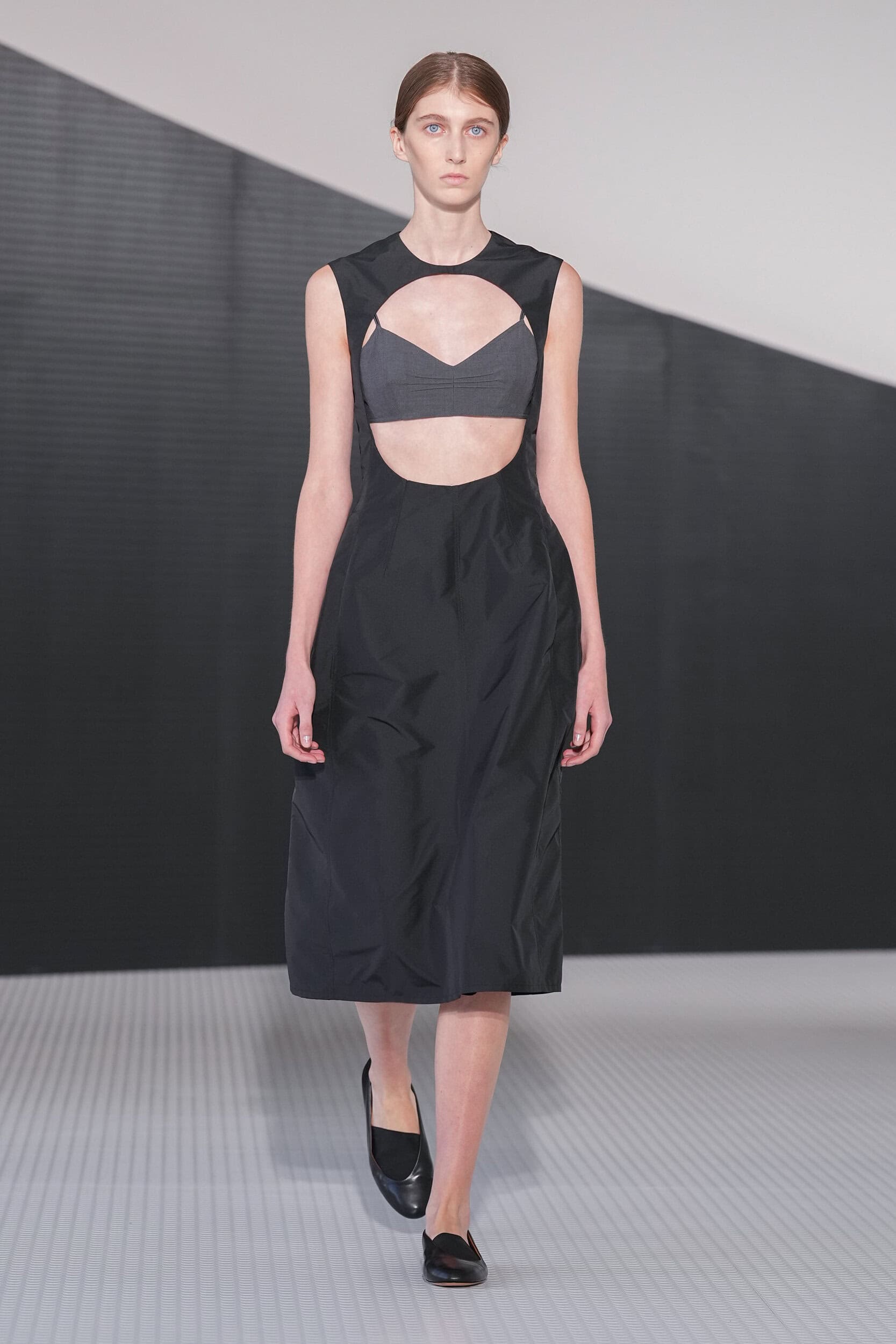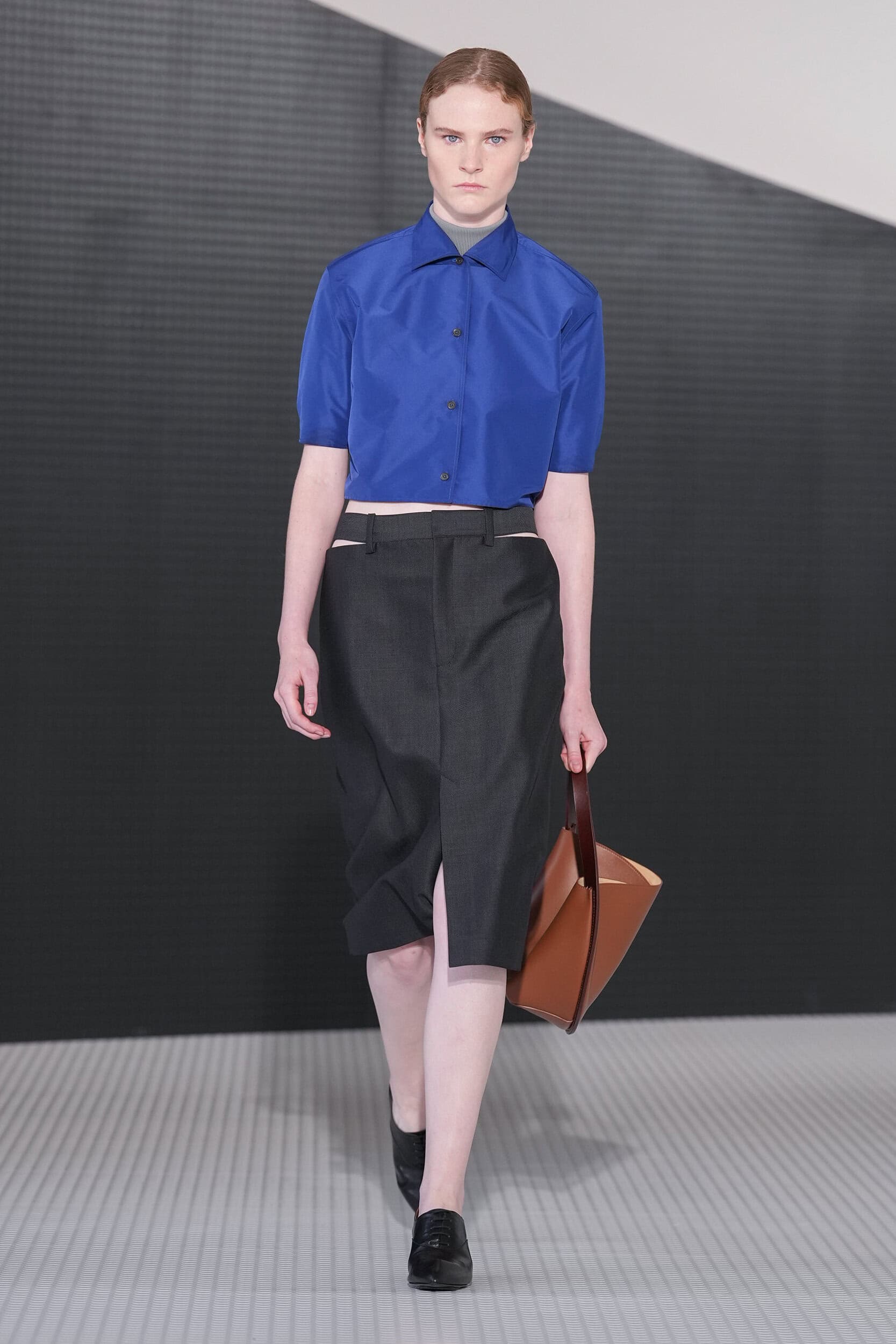 这一系列的皮革西装外套和大衣尤为出色,修身的剪裁与盒形轮廓相结合,展现了高扣设计的精致感。而几何突起的设计元素,则通过裙子、衬衫和鞋头等单品展现了Bellotti对细节的关注,灵感来源于 Wolfgang Tillmans 的弯曲纸张艺术。整体来看,尽管系列中保留了品牌一贯的极简主义精神,但 Simone Bellotti 巧妙地加入了些许趣味与实验性,让这些经典单品焕发出新的生命力。