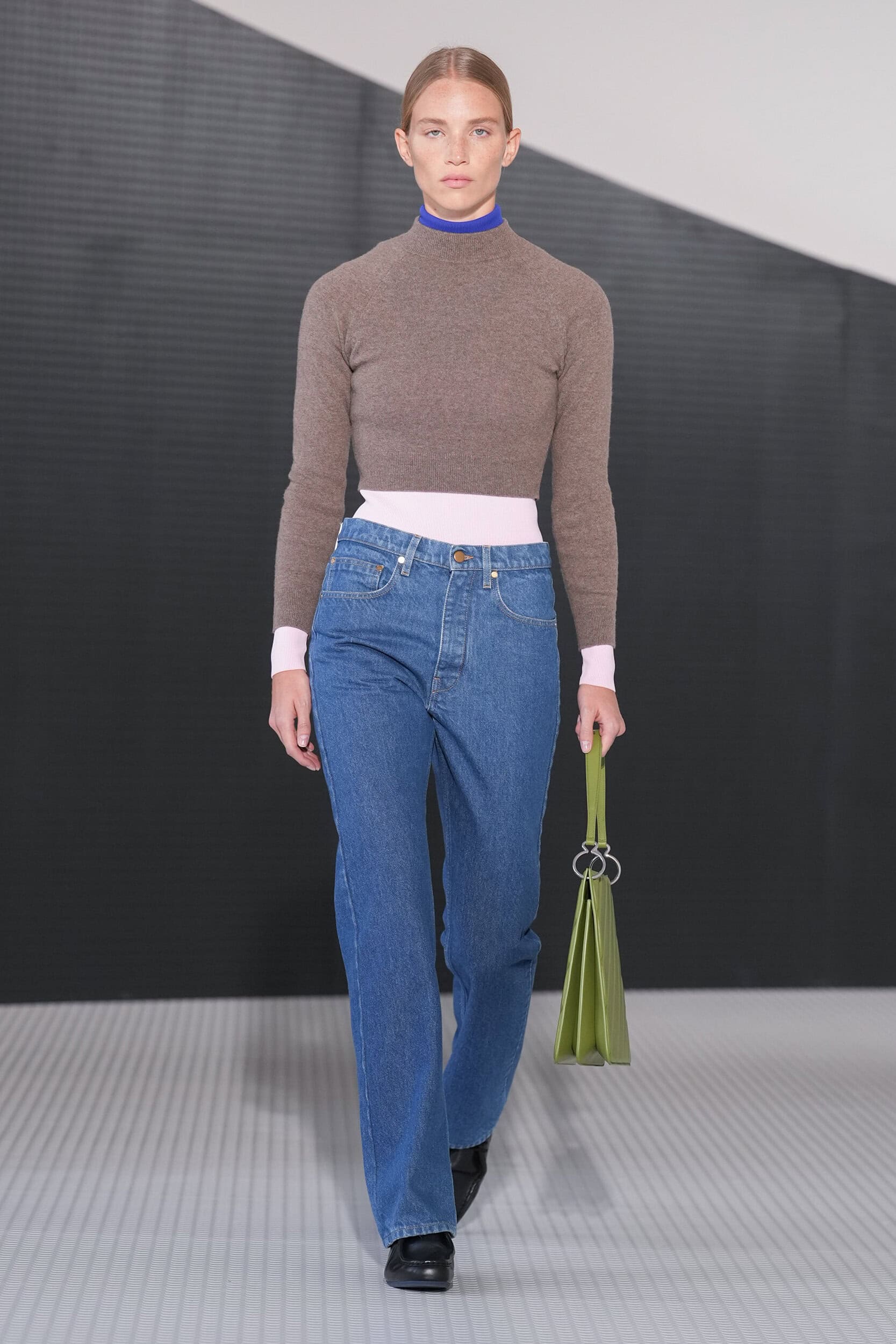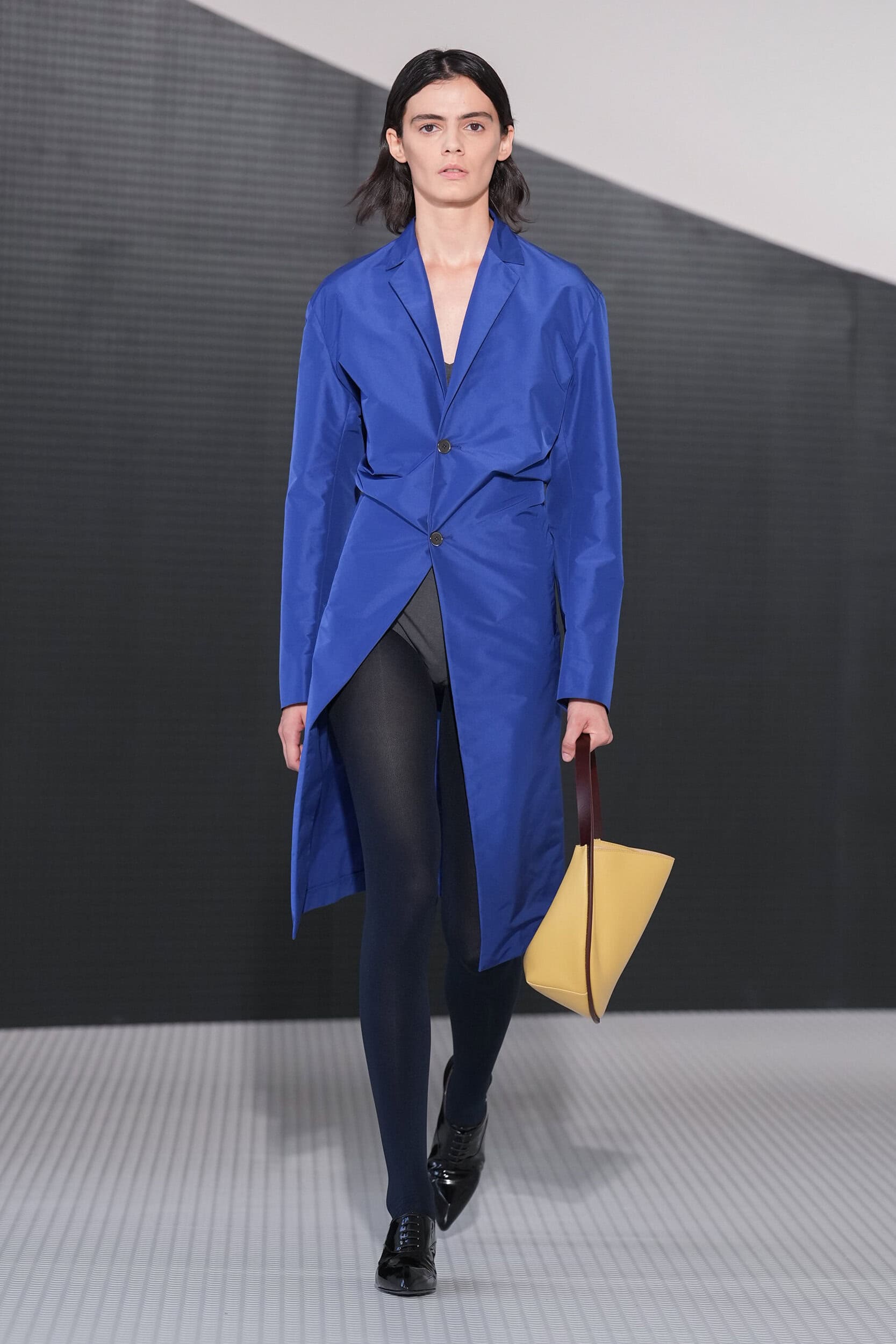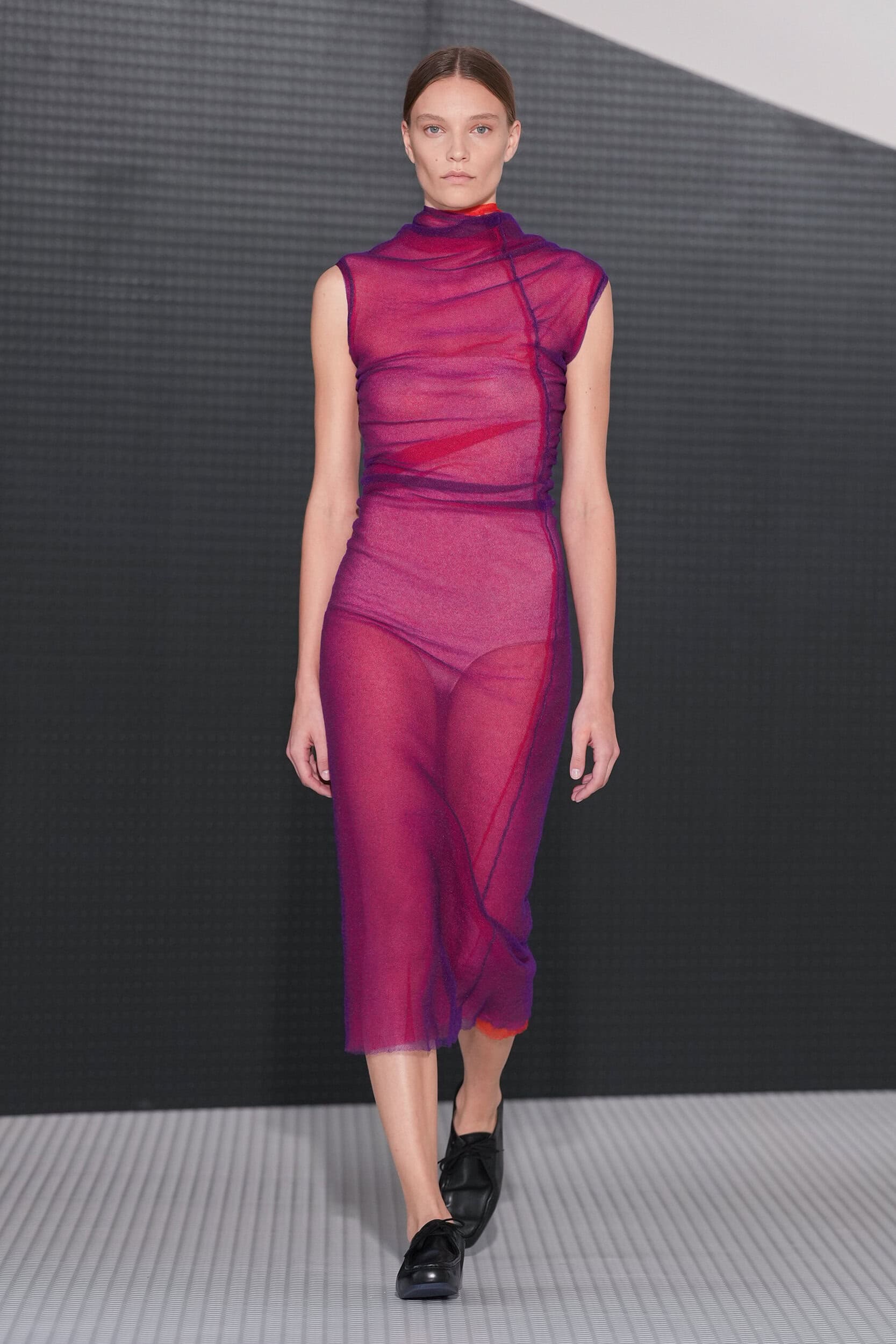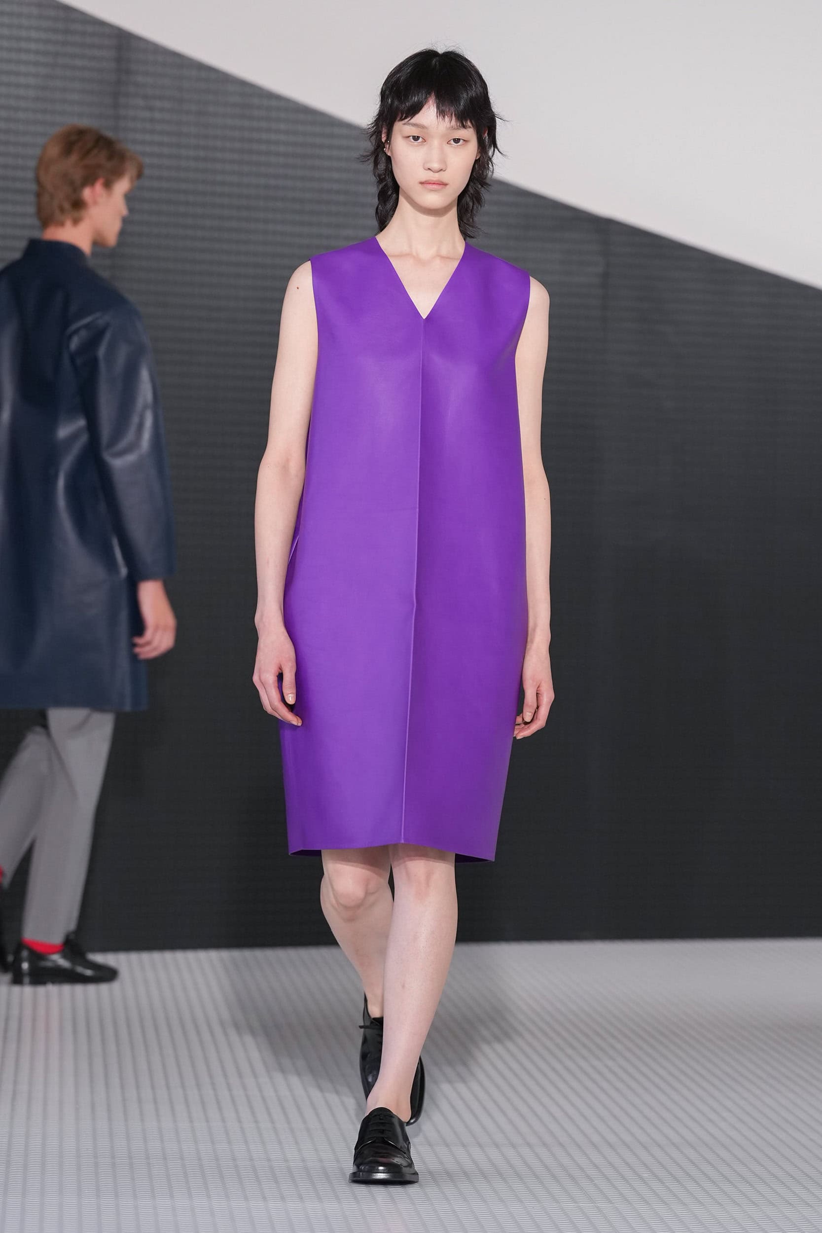 在色彩运用方面,Simone Bellotti 延续了 JIL SANDER 的经典风格,红色和蓝色交叠在一起,鲜艳的紫色连衣裙在中央的折痕设计上极具张力,完美搭配巧克力色大衣。透视红紫色连衣裙巧妙地创造了动画般的干扰效果,即使在系列末尾的中性色部分,Simone Bellotti 也对现代工作服进行了一番全新的演绎,柔和的鼠尾草色、粉贝色和可穿戴的深海蓝给人带来了耳目一新的感觉。