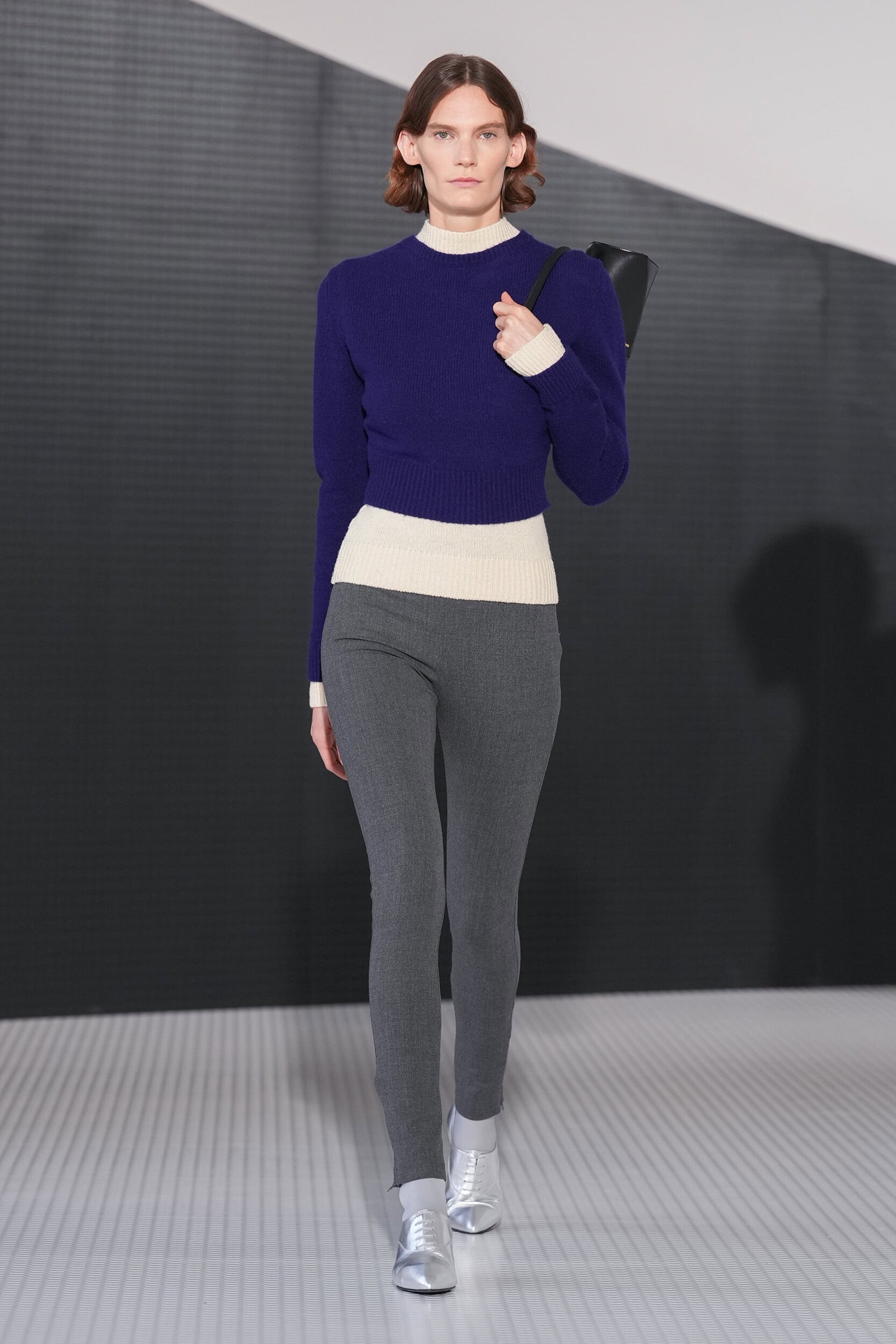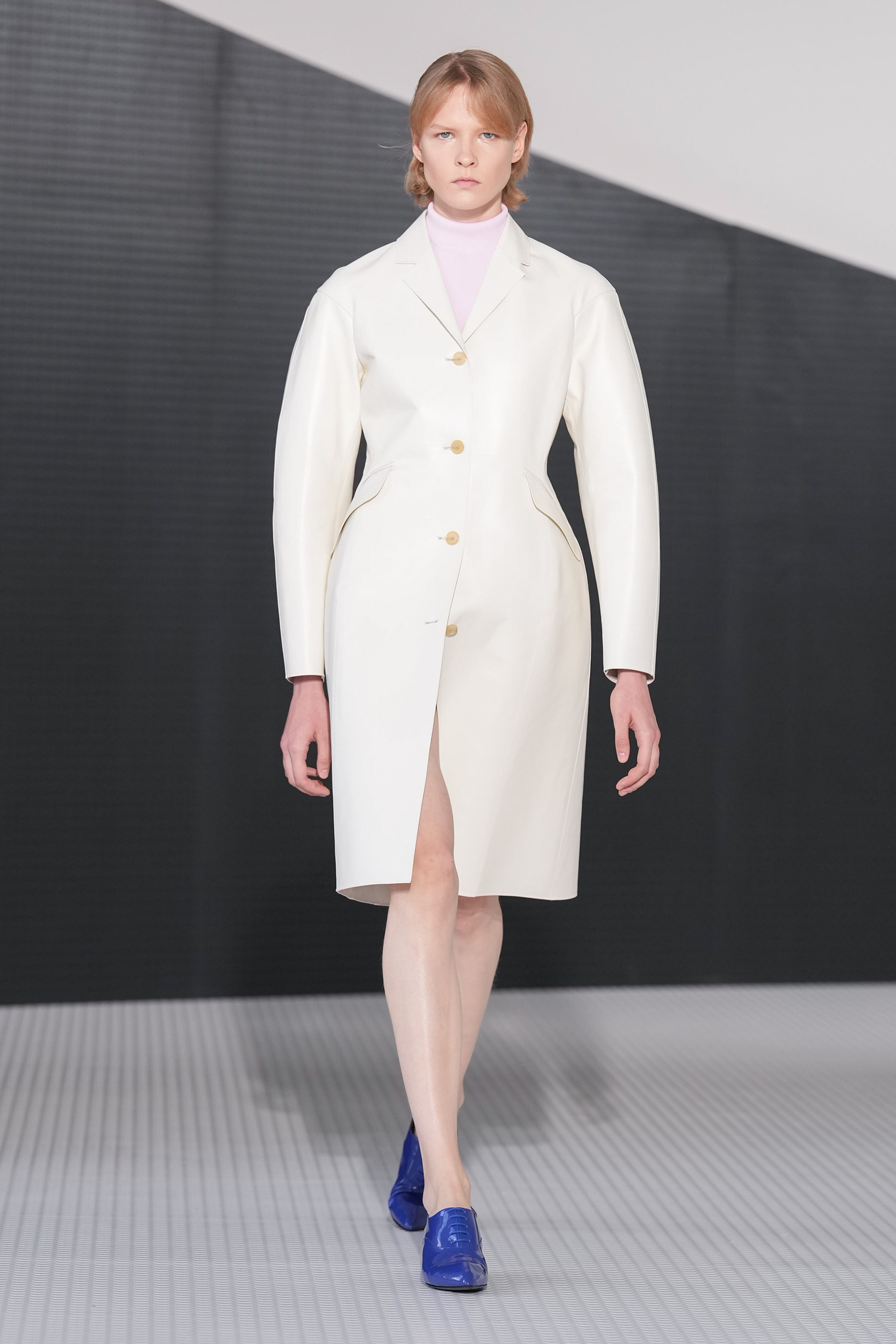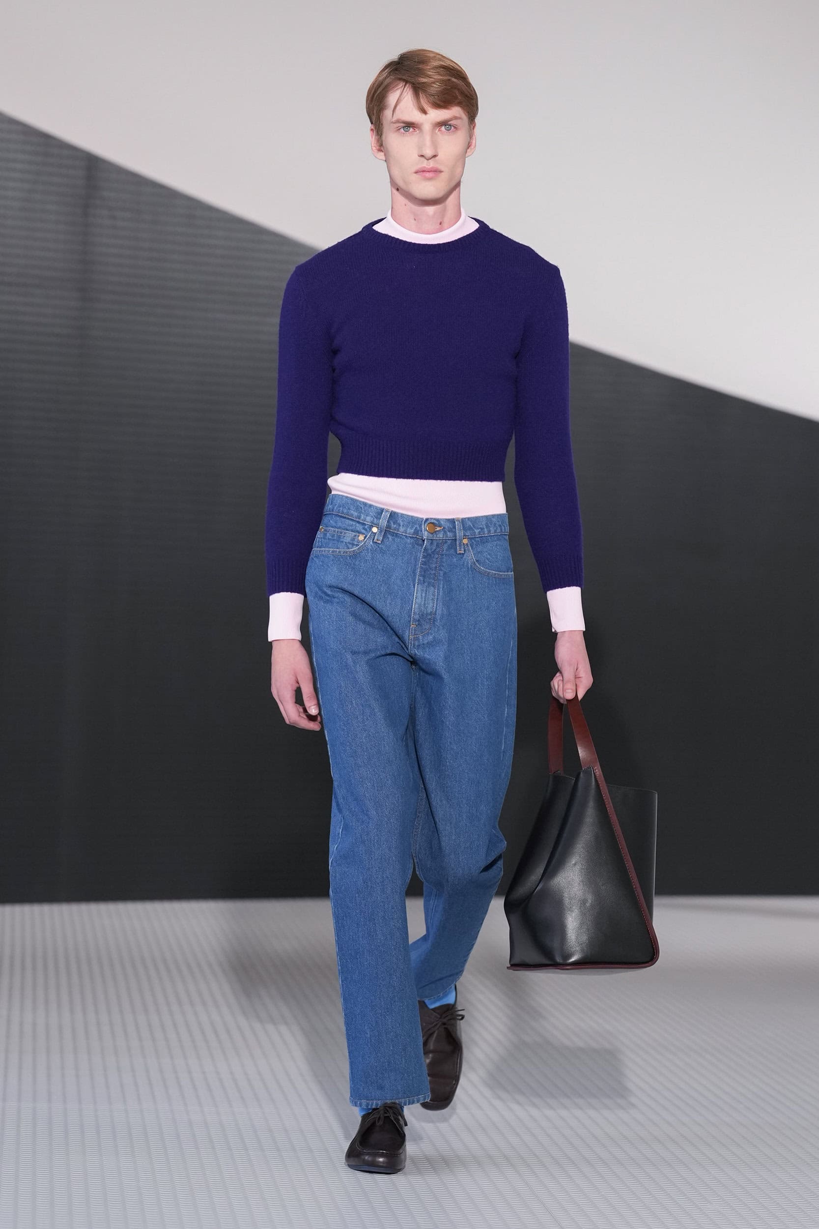 在色彩运用方面,Simone Bellotti 延续了 JIL SANDER 的经典风格,红色和蓝色交叠在一起,鲜艳的紫色连衣裙在中央的折痕设计上极具张力,完美搭配巧克力色大衣。透视红紫色连衣裙巧妙地创造了动画般的干扰效果,即使在系列末尾的中性色部分,Simone Bellotti 也对现代工作服进行了一番全新的演绎,柔和的鼠尾草色、粉贝色和可穿戴的深海蓝给人带来了耳目一新的感觉。