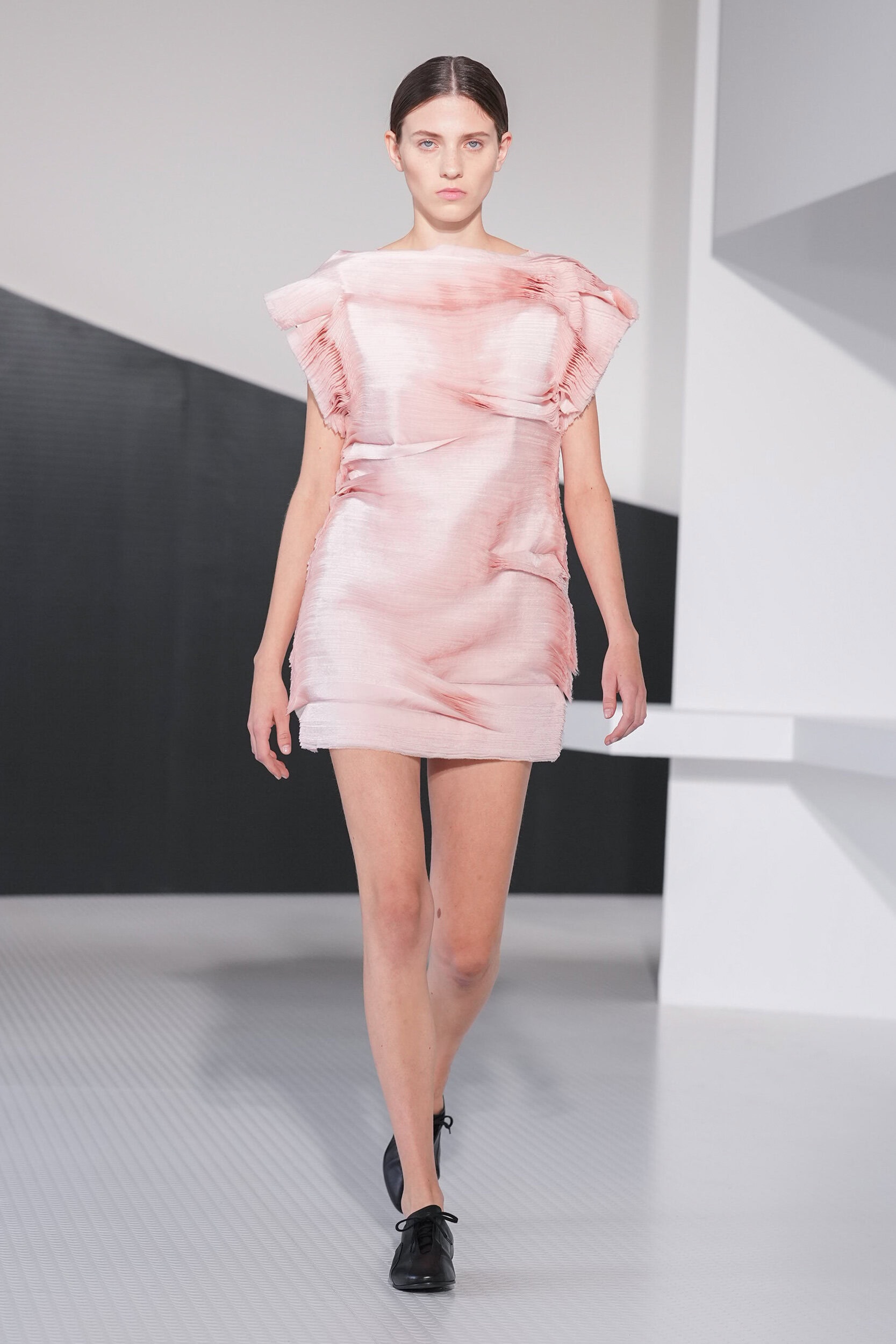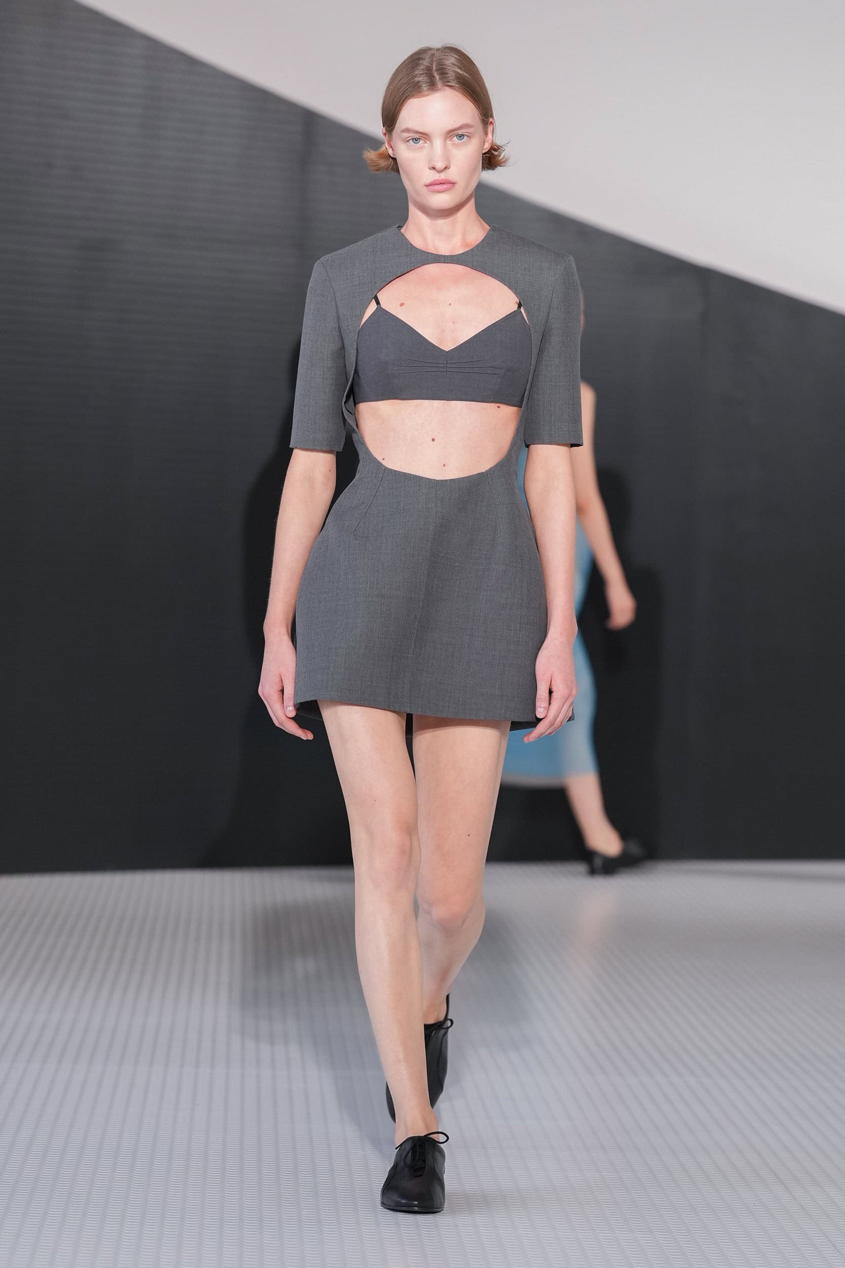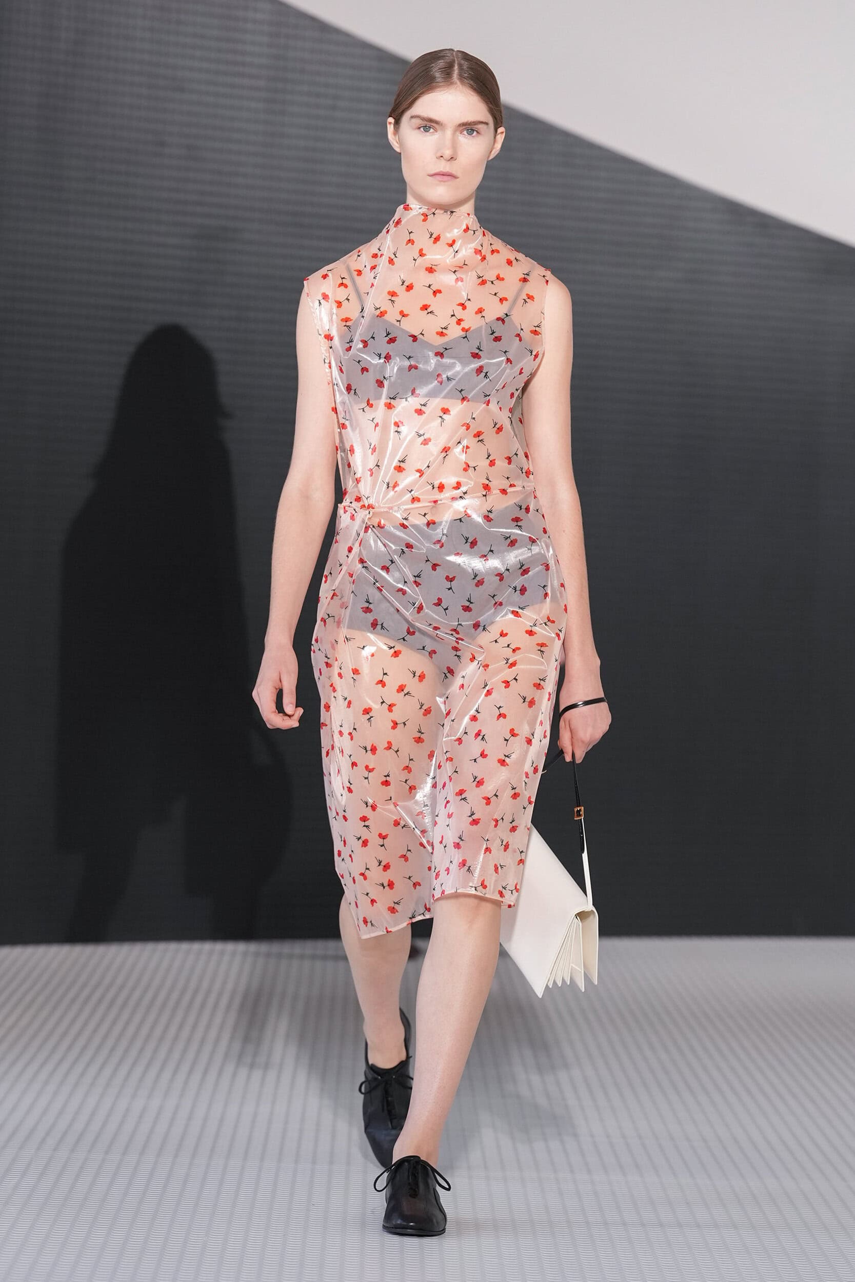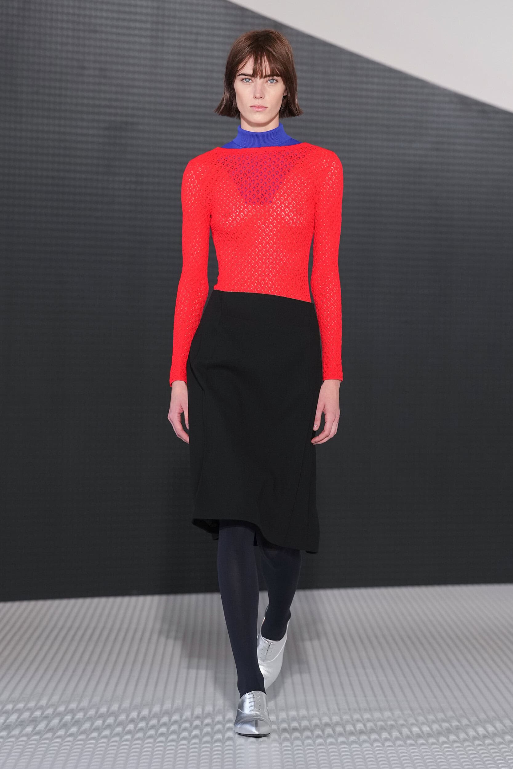 在色彩运用方面,Simone Bellotti 延续了 JIL SANDER 的经典风格,红色和蓝色交叠在一起,鲜艳的紫色连衣裙在中央的折痕设计上极具张力,完美搭配巧克力色大衣。透视红紫色连衣裙巧妙地创造了动画般的干扰效果,即使在系列末尾的中性色部分,Simone Bellotti 也对现代工作服进行了一番全新的演绎,柔和的鼠尾草色、粉贝色和可穿戴的深海蓝给人带来了耳目一新的感觉。
