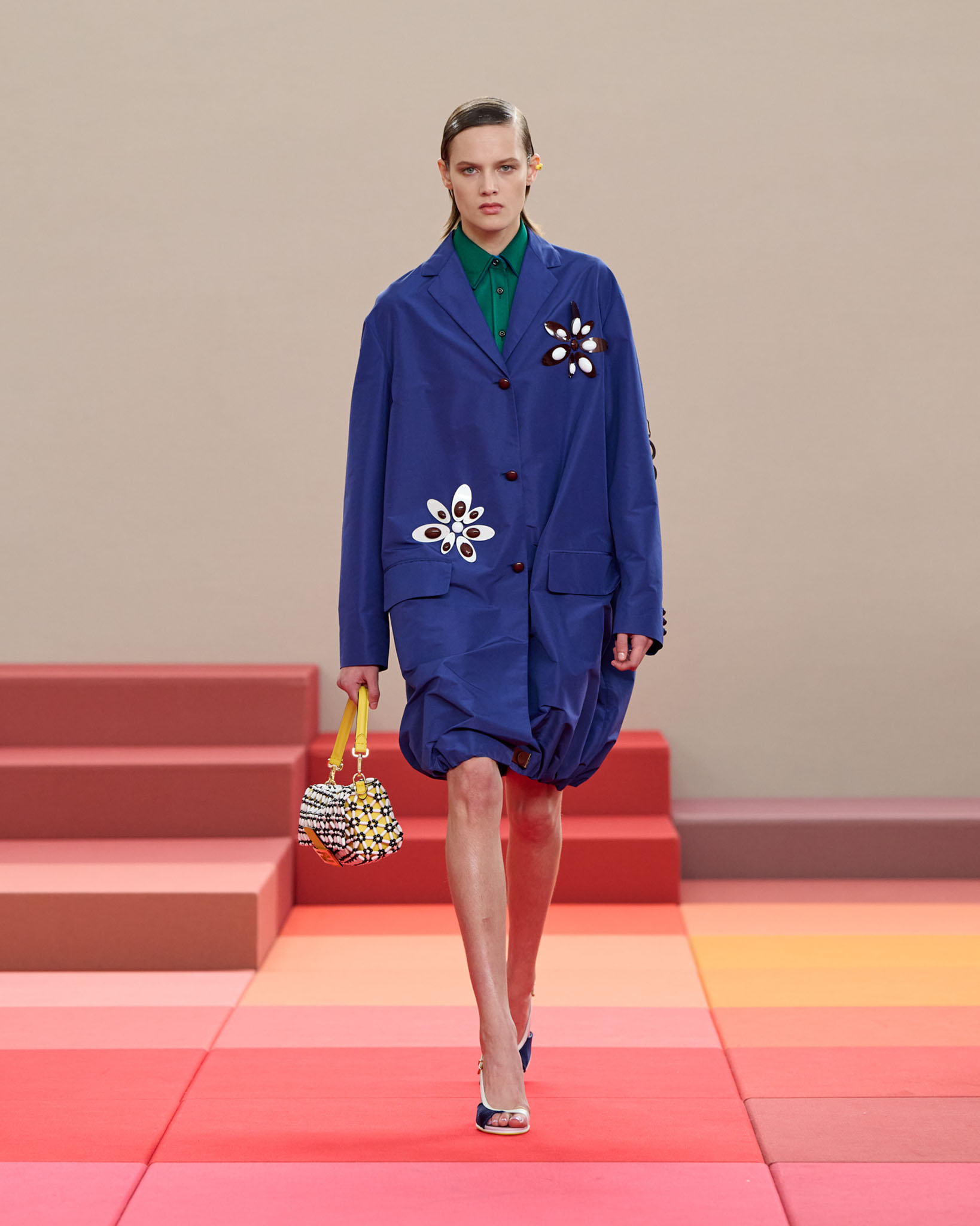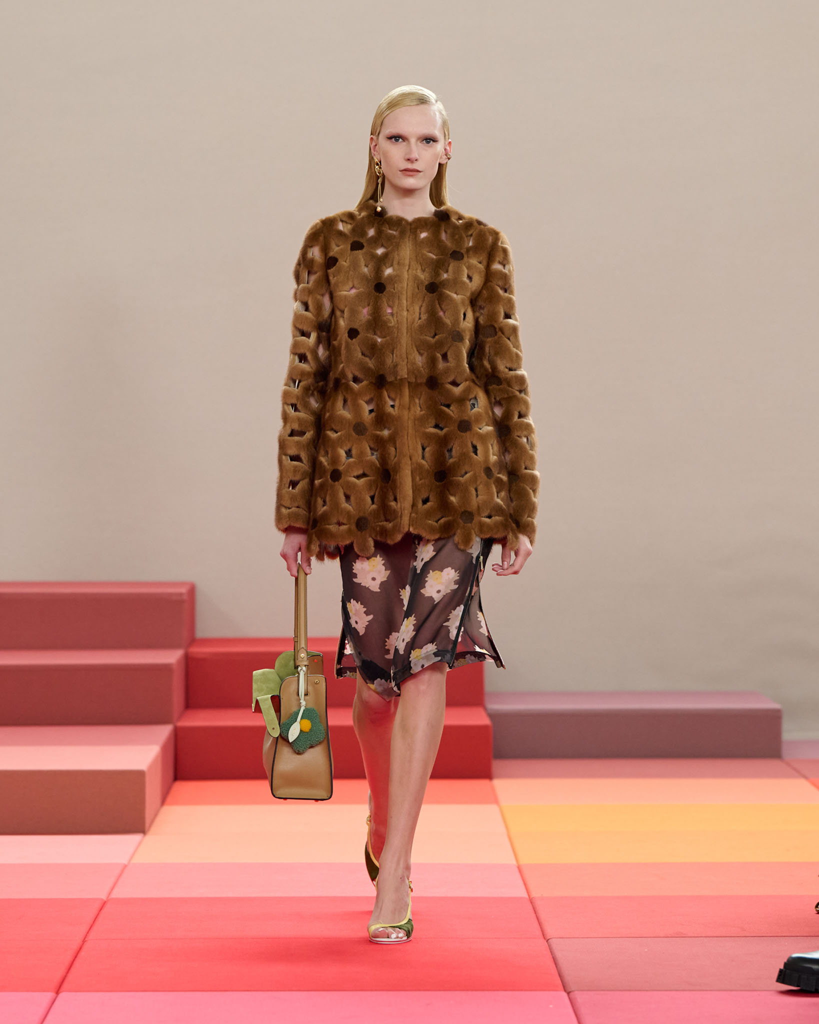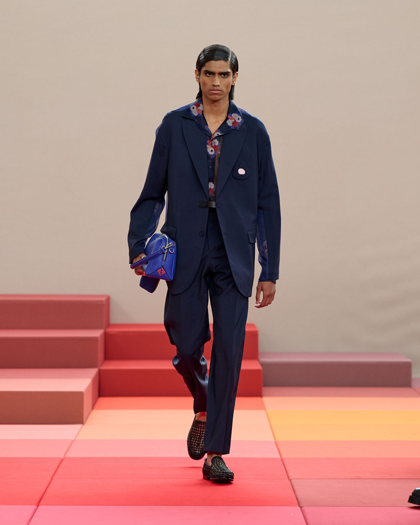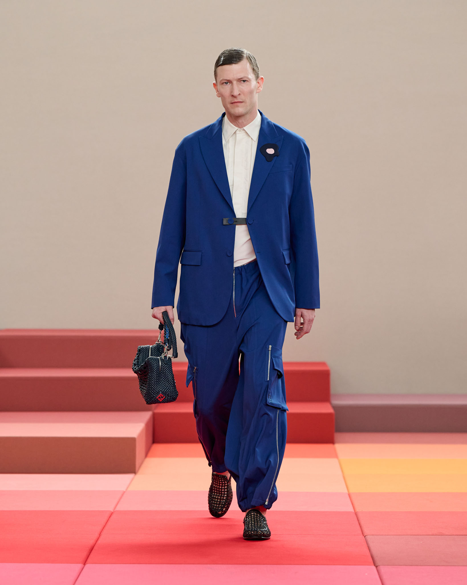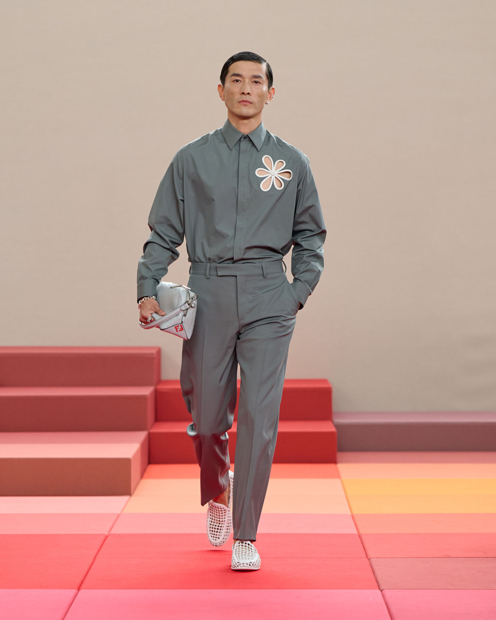 在每套服装中,Silvia Venturini Fendi 都优先考虑以折衷主义风格为基础的轻盈感——让轻盈的面料在微风中飘扬,其鲜艳的连续色块则带来令人愉悦的厚重感。波点印花半身裙,或者花朵镂空拼接的人造皮草夹克让忙碌匆忙的都市女性增添俏皮活泼的轻松气息。这种青春活力也延续到了男装系列当中,西装翻领上别着充满创意的花朵别针,一些套装则以宽松的工装裤进行搭配,更显轻松写意。