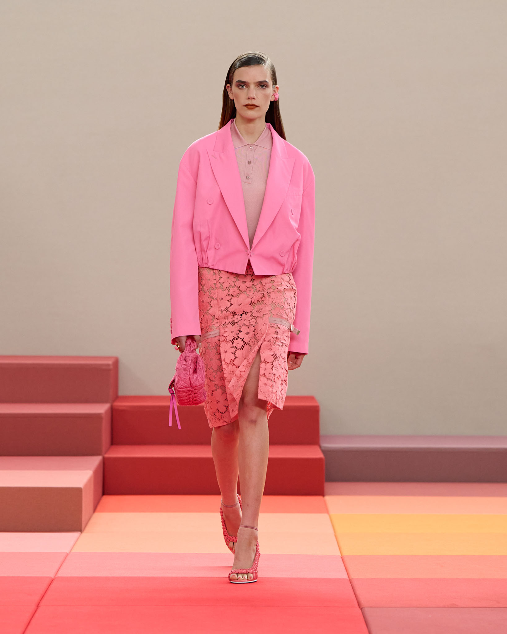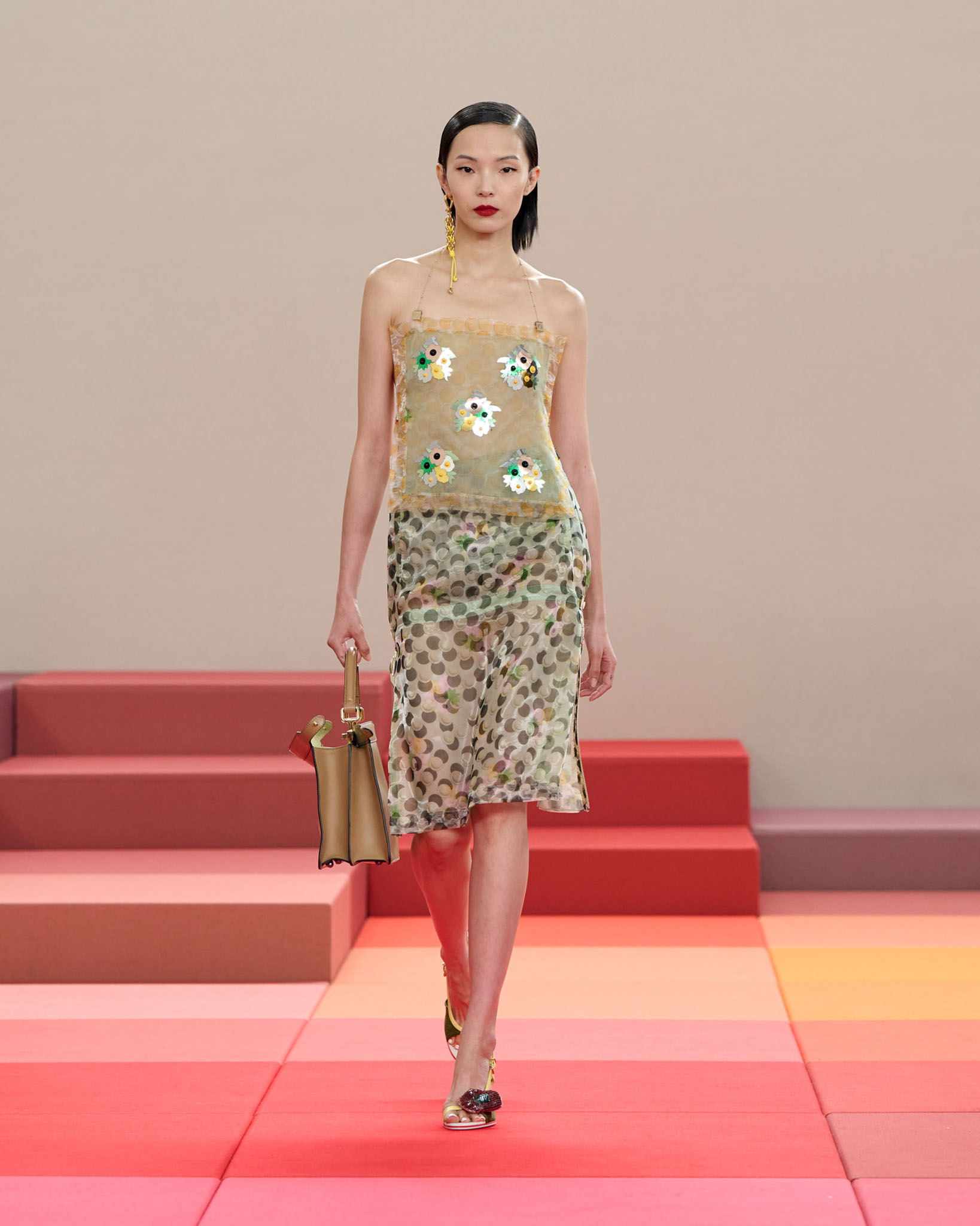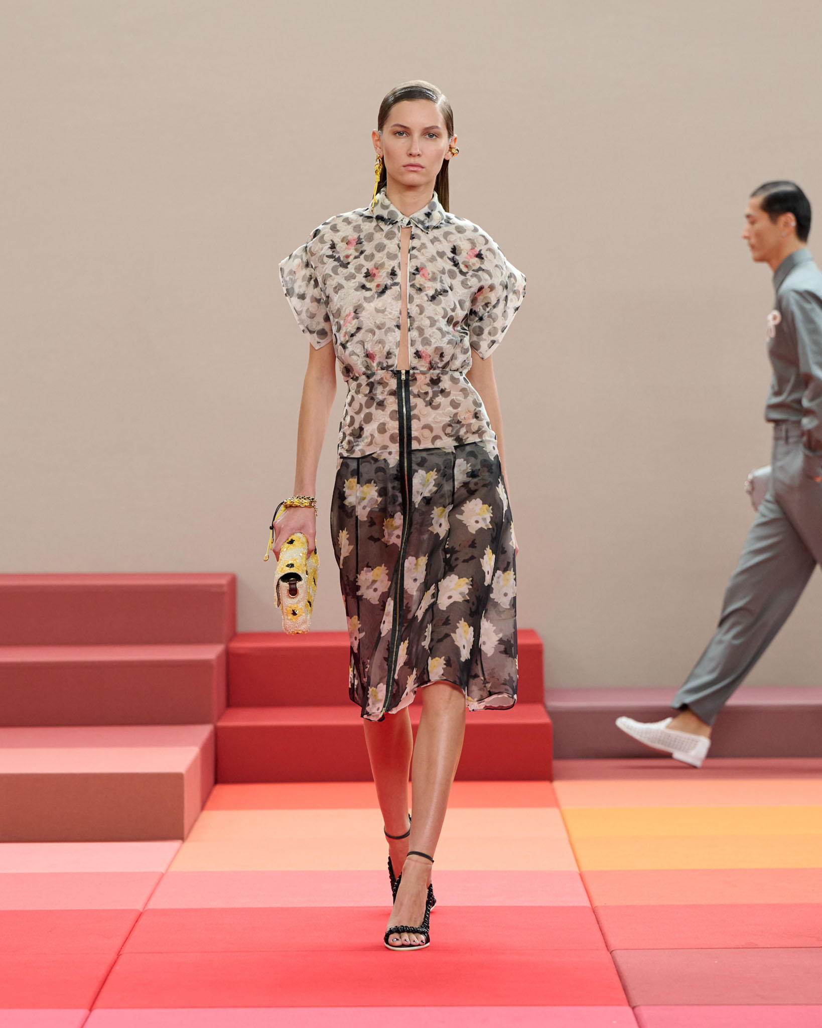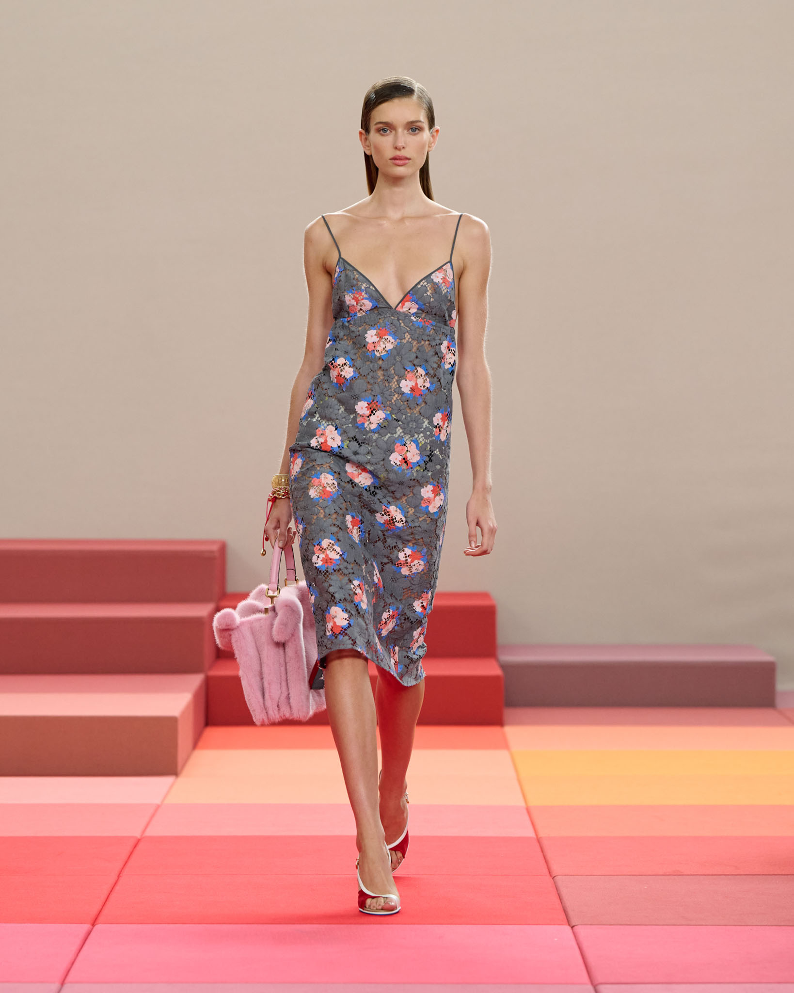 在每套服装中,Silvia Venturini Fendi 都优先考虑以折衷主义风格为基础的轻盈感——让轻盈的面料在微风中飘扬,其鲜艳的连续色块则带来令人愉悦的厚重感。波点印花半身裙,或者花朵镂空拼接的人造皮草夹克让忙碌匆忙的都市女性增添俏皮活泼的轻松气息。这种青春活力也延续到了男装系列当中,西装翻领上别着充满创意的花朵别针,一些套装则以宽松的工装裤进行搭配,更显轻松写意。