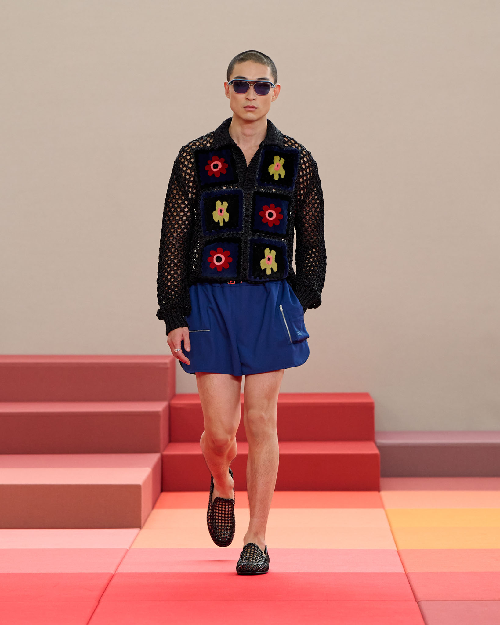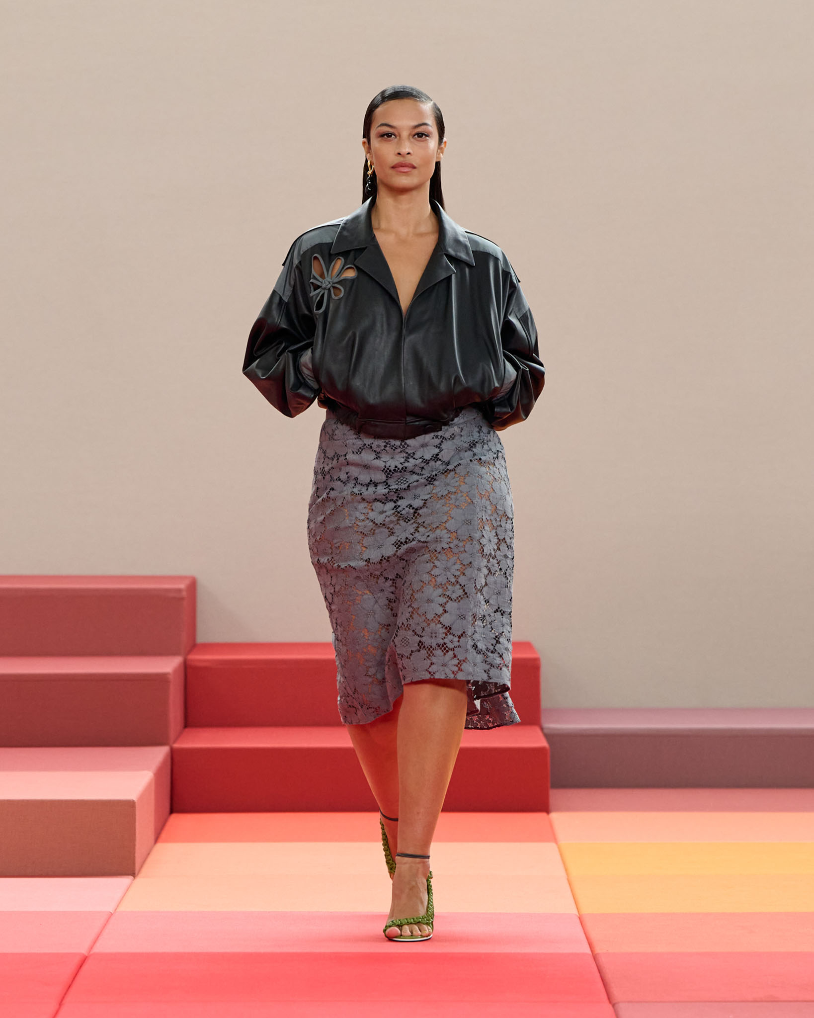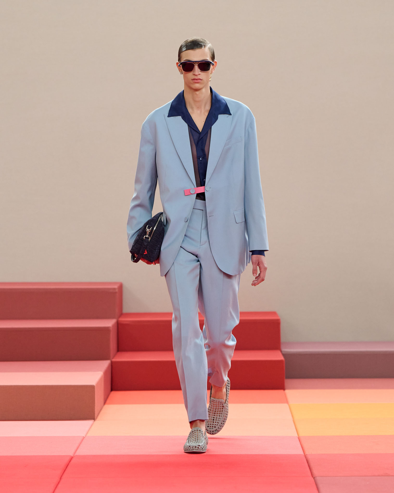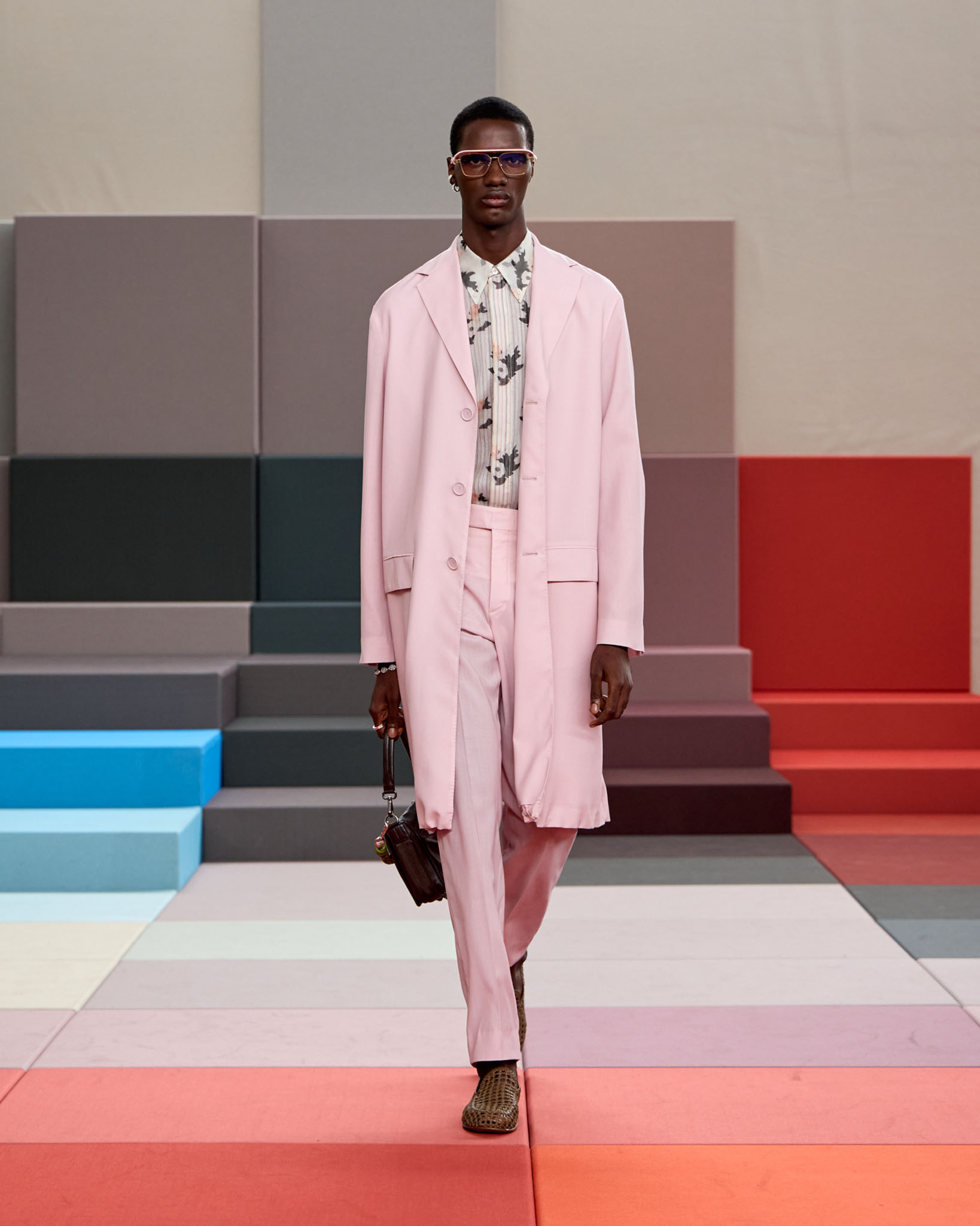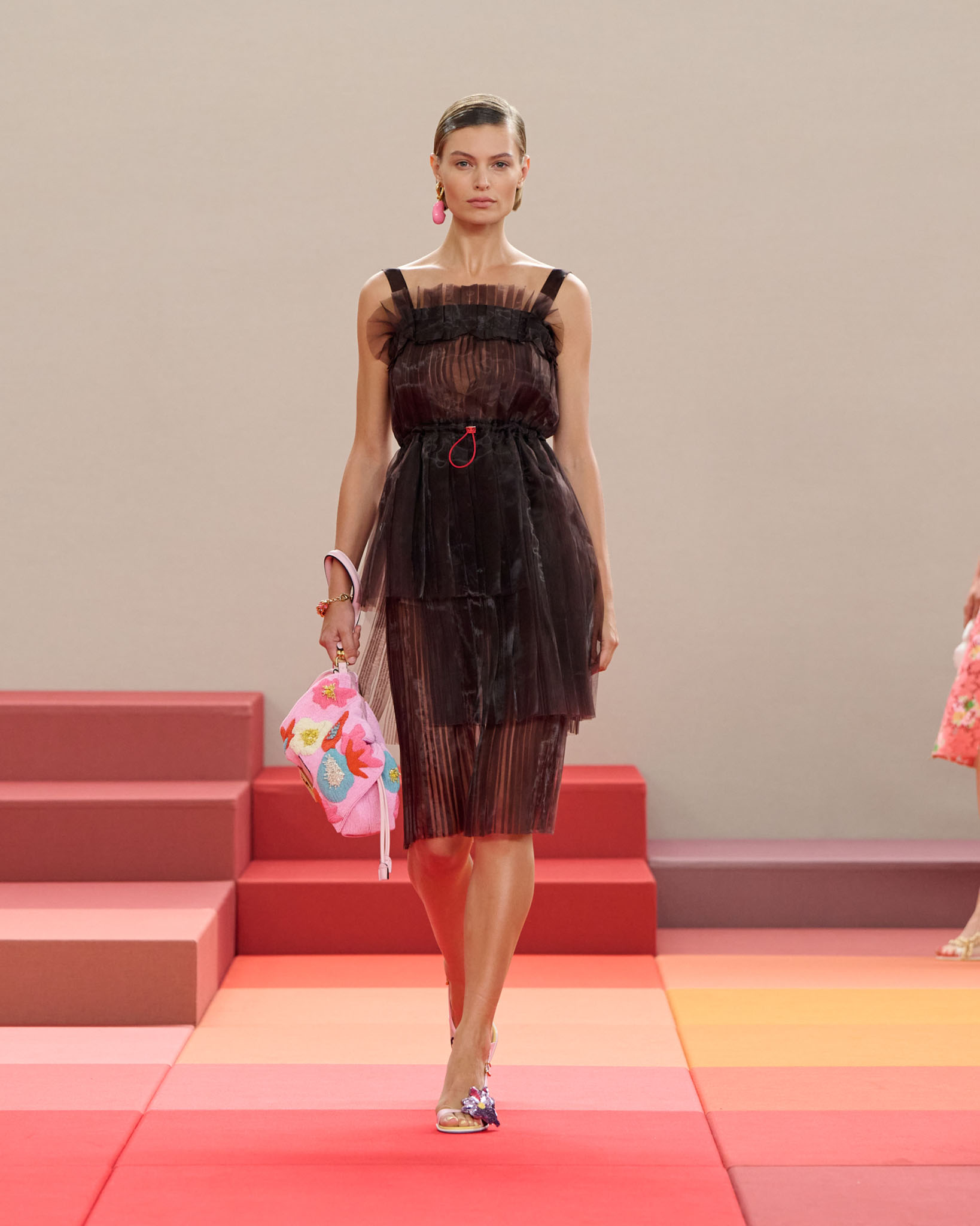 在每套服装中,Silvia Venturini Fendi 都优先考虑以折衷主义风格为基础的轻盈感——让轻盈的面料在微风中飘扬,其鲜艳的连续色块则带来令人愉悦的厚重感。波点印花半身裙,或者花朵镂空拼接的人造皮草夹克让忙碌匆忙的都市女性增添俏皮活泼的轻松气息。这种青春活力也延续到了男装系列当中,西装翻领上别着充满创意的花朵别针,一些套装则以宽松的工装裤进行搭配,更显轻松写意。